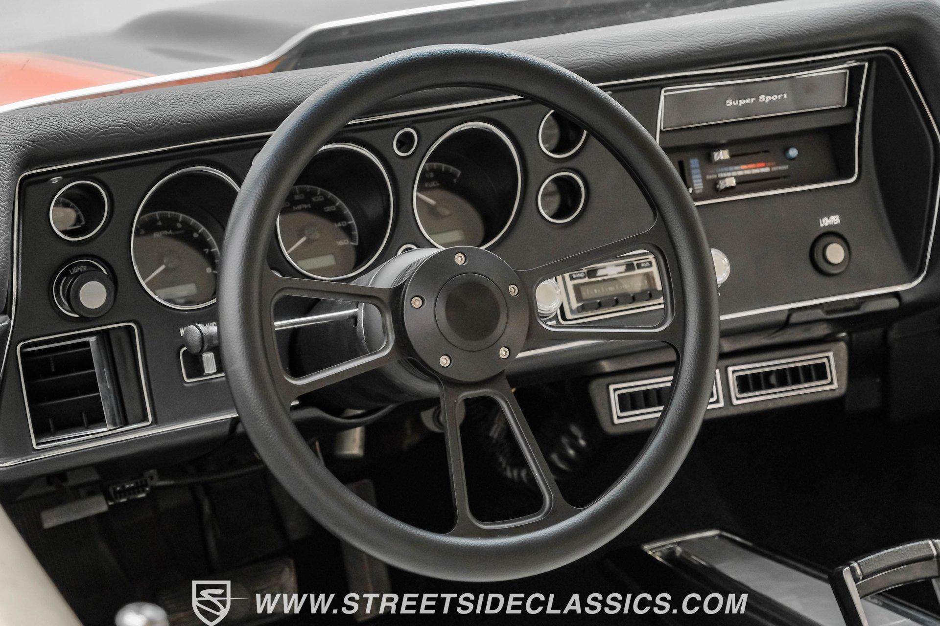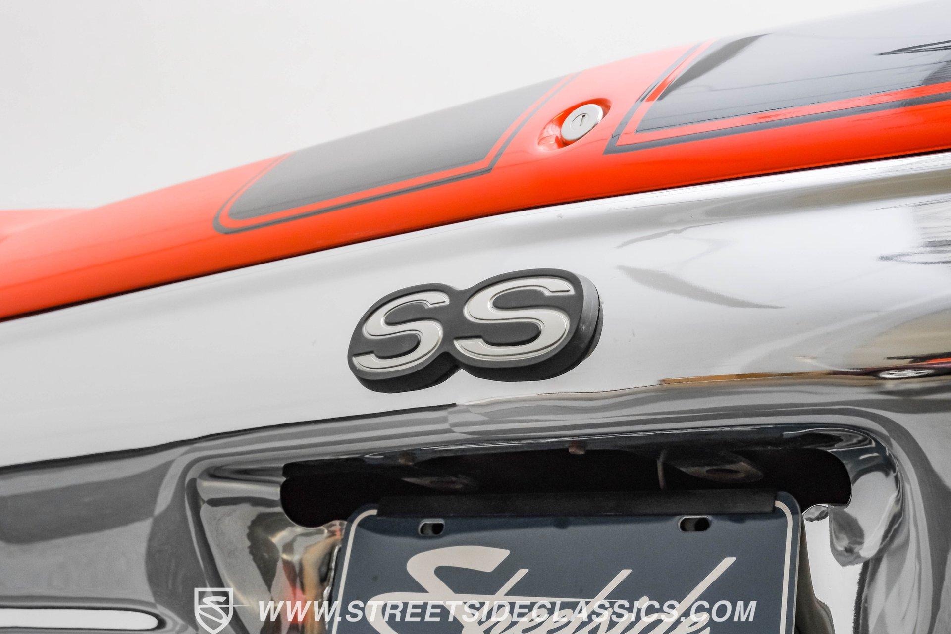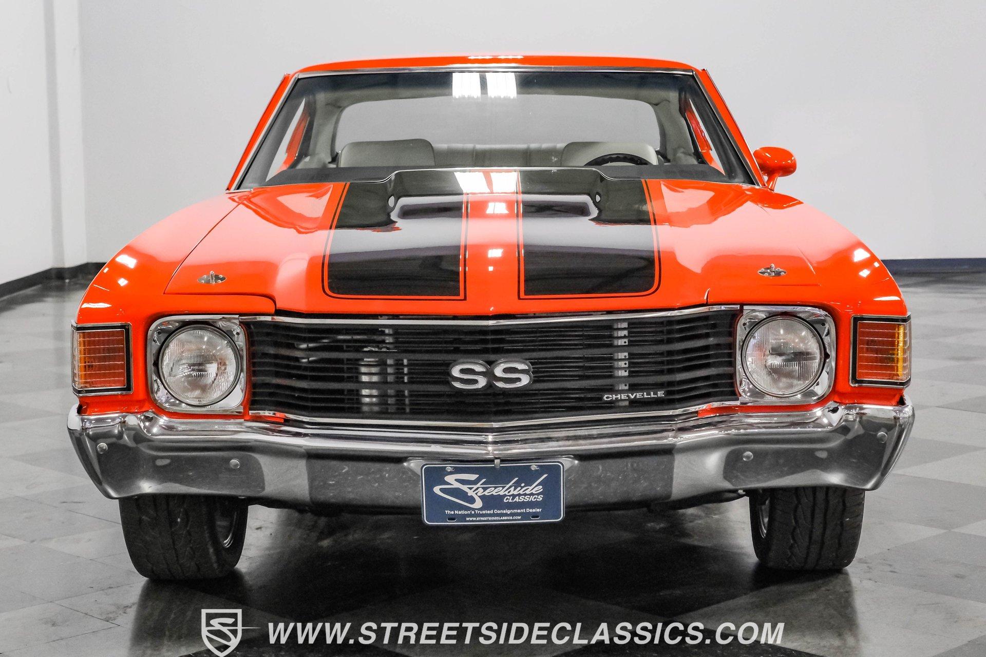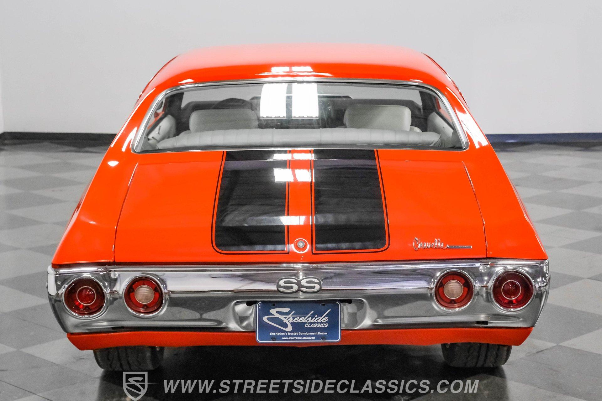 Few names from the Golden Age of muscle cars inspire more intimidation and respect than the Chevelle. In fact, the only way to make one of GM's baddest cars even meaner is to use modern technology to improve its performance. That thinking is why this 1972 Chevrolet Chevelle Malibu SS Restomod is the perfect choice for anyone looking for a powerful old-school-meets-new-school vehicle that turns heads everywhere it goes. Fully repainted in its original Orange Flame exterior paint, a 1972-only option, this car also sports dual full-length black racing stripes to give it an even more imposing presence. Inside, we find a well-appointed, correct-looking interior that has been subtly upgraded. A custom three-spoke leather-wrapped steering wheel sits before a three-pod digital/analog hybrid gauge cluster. An AM/FM/Aux RetroRadio handles tunes while the center console and staple-style shifter add a touch of practical flair. An aftermarket air-conditioning system is the perfect addition to keep your legs from sticking to the custom white vinyl-trimmed Strato bucket seats. Under the cowl hood of this Chevelle sits a modern 5.3-liter LS Vortec V-8. With its aluminum block and 862 aluminum heads, this small block has a power-to-weight ratio better than almost originally available in 1972. Using electronic fuel injection, shorty-style headers, and a dual exhaust capped off with a sweet-sounding FlowMaster exhaust, this Chevelle has plenty of bark to back up its wicked bite. That power gets routed through a 4L60E four-speed automatic transmission before being sent out to a ten-bolt rear. HIGHLIGHTS: Full Orange Flame Repaint 5.3L Vortec LS V8 862 Aluminum Heads EFI Shorty Headers w/ FlowMaster Exhaust 4L60E Four Speed Auto Power Brakes w/ Front Disc Power Steering Custom Steering Wheel Strato Bucket Seats RetroRadio Stereo Digital Analog Gauges Aftermarket AC Staple Style Shifter Factory Buildsheet This 1972 Chevrolet Chevelle SS Restomod rides on a lowered suspension and features a set of staggered American Racing wheels. Seventeen-inch units up front and bigger eighteen-inch in back, giving this car a menacing stance from any angle. Power steering and power front disc brakes add just enough convenience to make driving fun without being work. If you've always loved and wanted a classic Chevelle but also enjoy the perks of modern engineering, this car combines the best of both worlds and is just the one you've been waiting for. Call today!