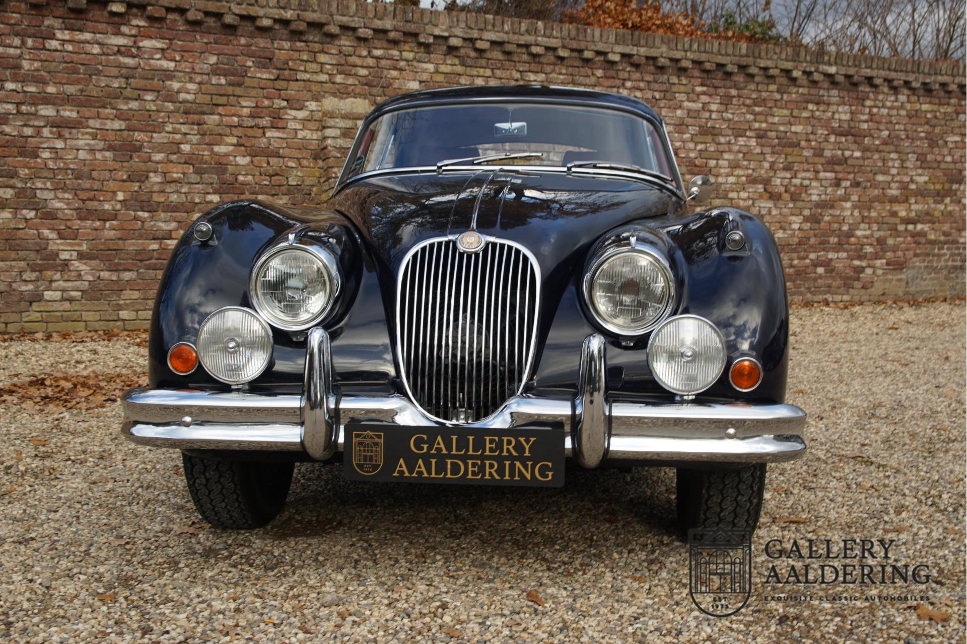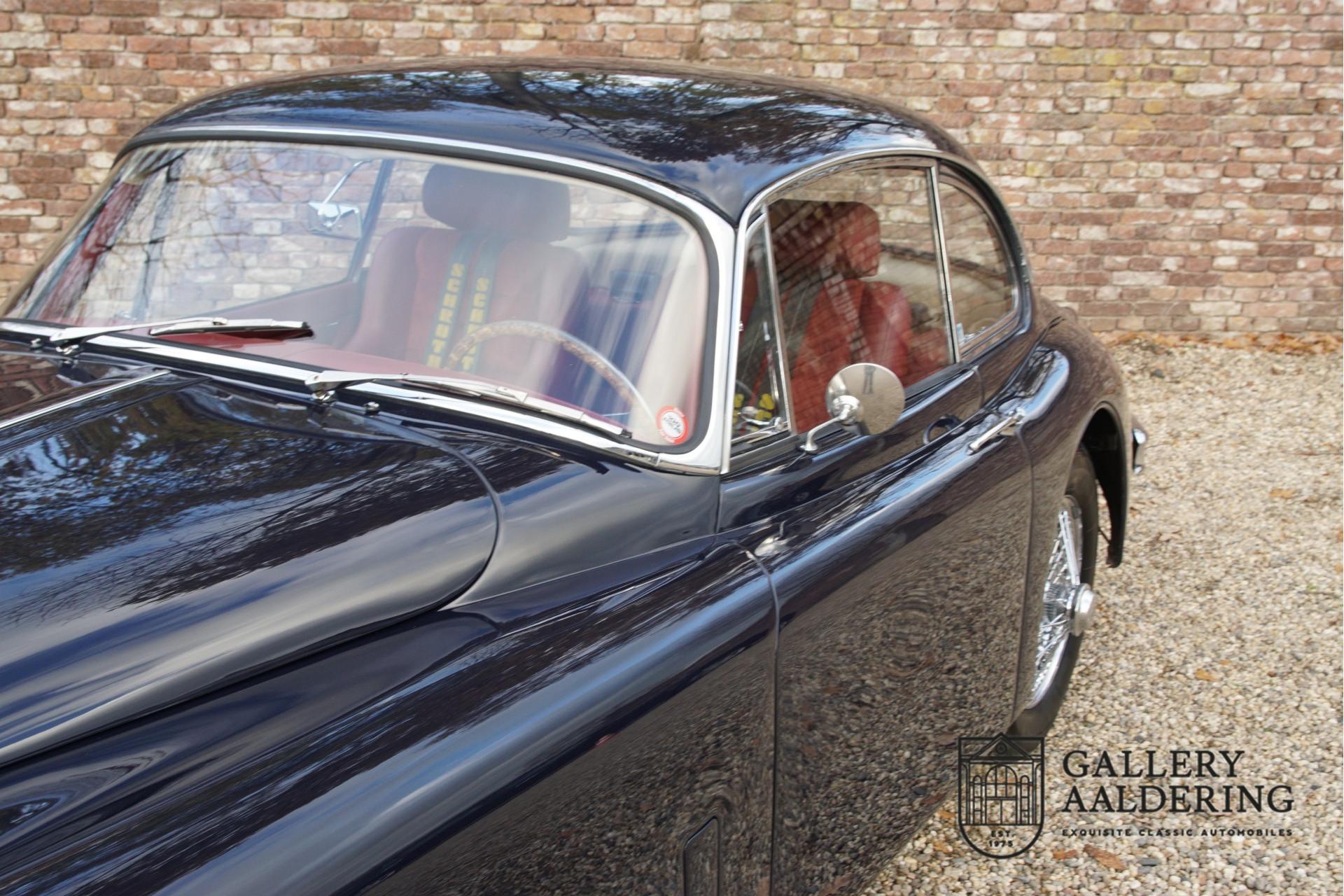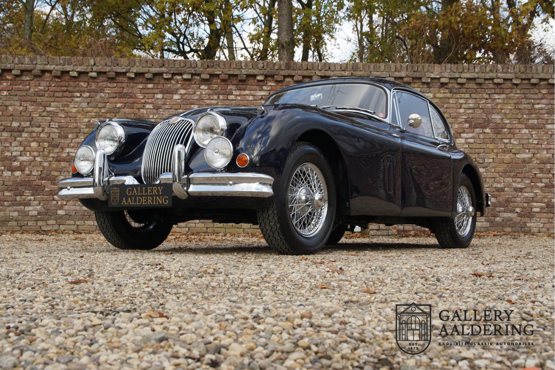 This particular Jaguar XK150 Fixed Head Coupe Special Equipment from 1959 was originally delivered on January 29, 1959, to Jaguar New York in the United States. This example, an original Special Equipment version, was factory-fitted with a range of high-quality options, including chrome wire wheels, fog lamps, dual exhausts, overdrive, and the sought-after B-type cylinder head, which adds 20 extra horsepower to the XK's power. The car is matching numbers, meaning it still has the original engine.