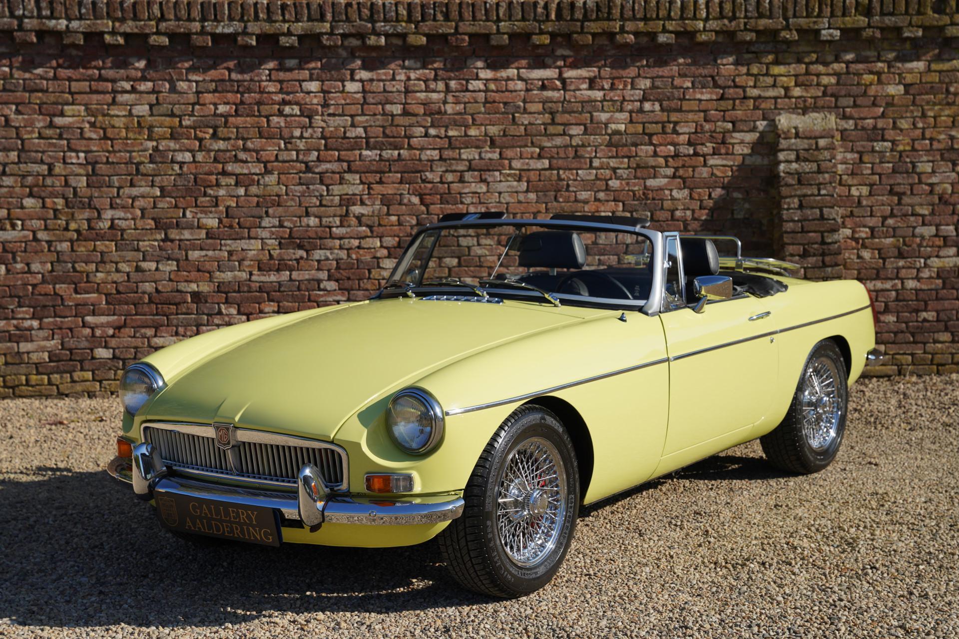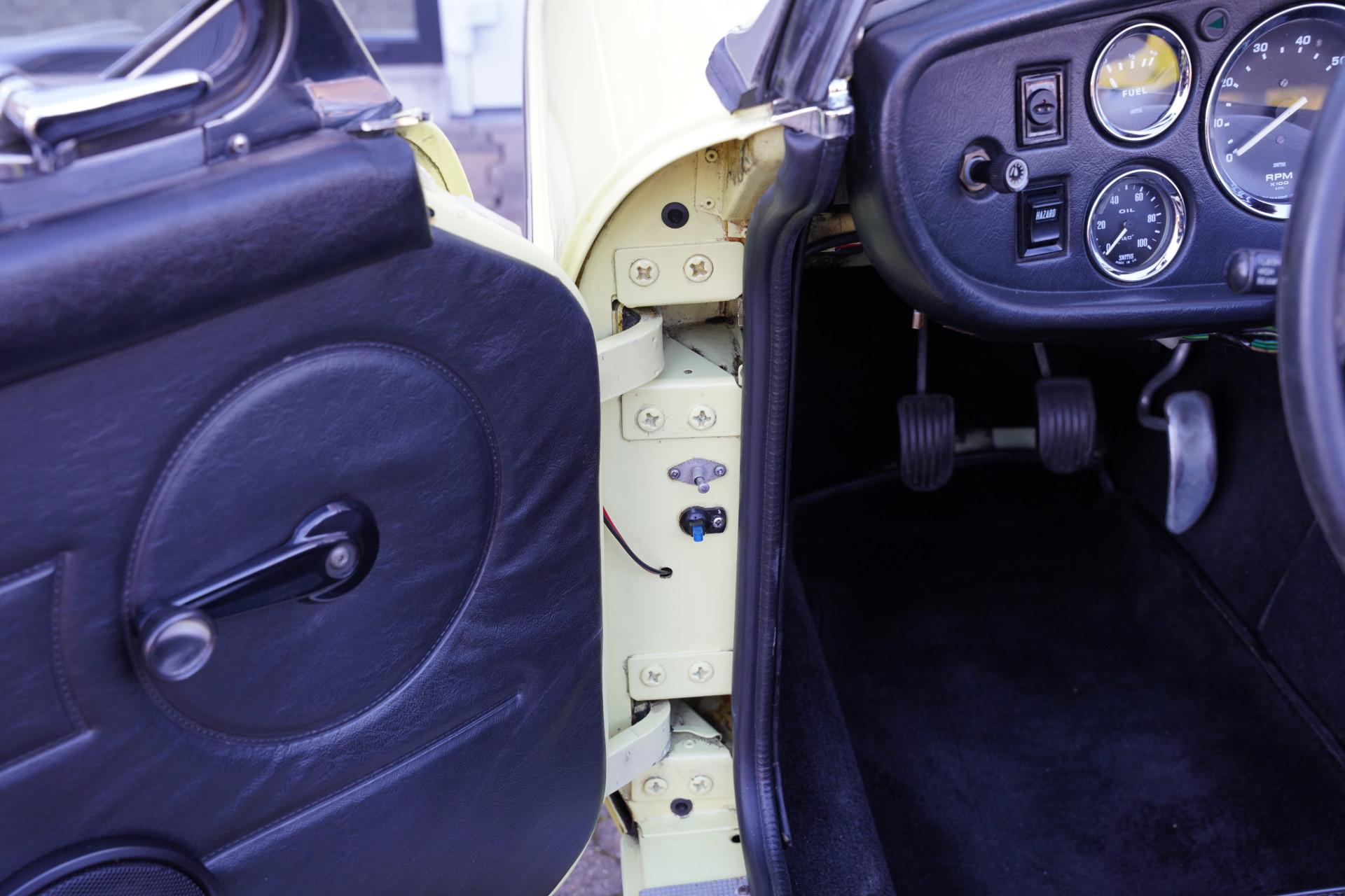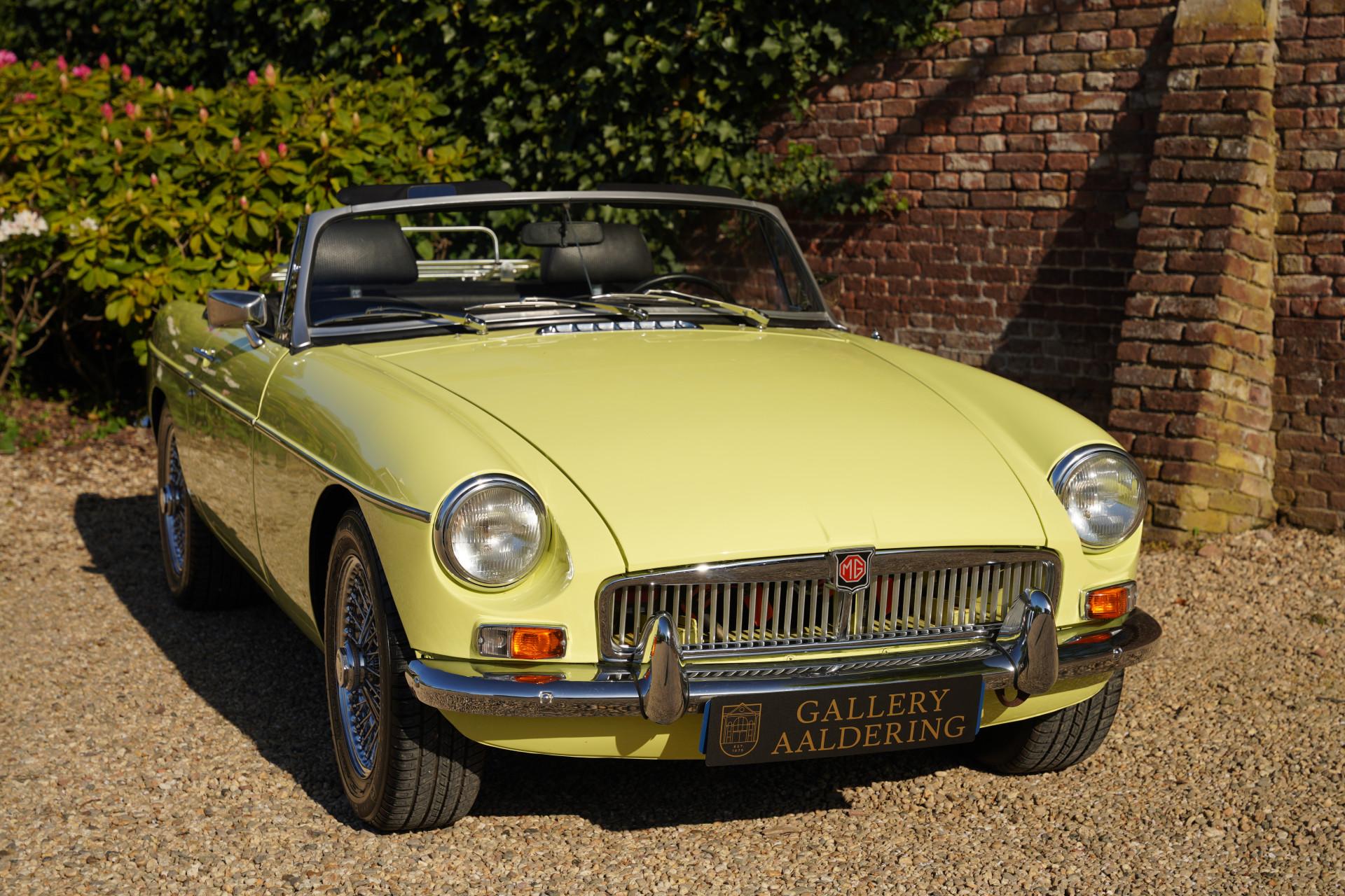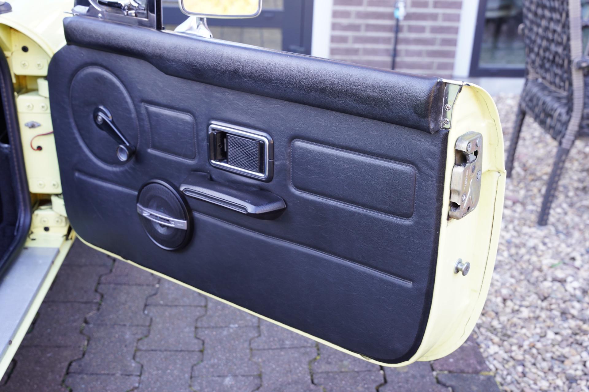 Experts will immediately notice that the production year of this particular model conflicts with the chrome bumpers is sports. However, there will be few people who see this as a drawback. The '77 B you see here was delivered new in the Netherlands and was sold to the owner after four years, who kept hold of it until now. The proud gentleman drove his soft yellow English convertible for over 40 years, during which the car underwent a complete restoration about halfway through that period. No half-measures and certainly not rushed: the two-seater was completely overhauled, and there is an enormous stack of invoices documenting the restoration. From the chrome bumpers and grille to the beautiful wire wheels and the tiniest bolt, everything that was replaced or restored during the restoration (and that list is almost endless) has been documented.