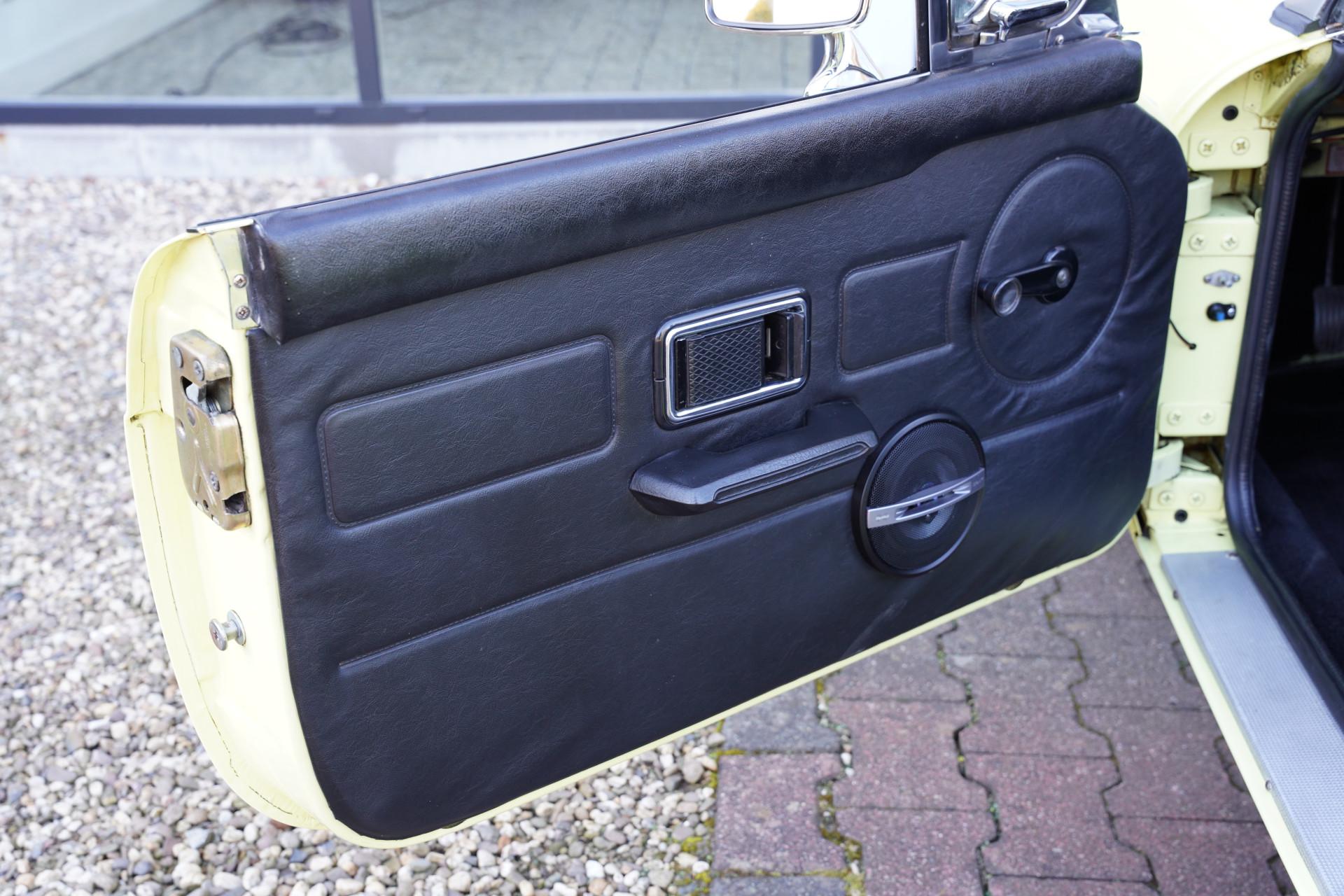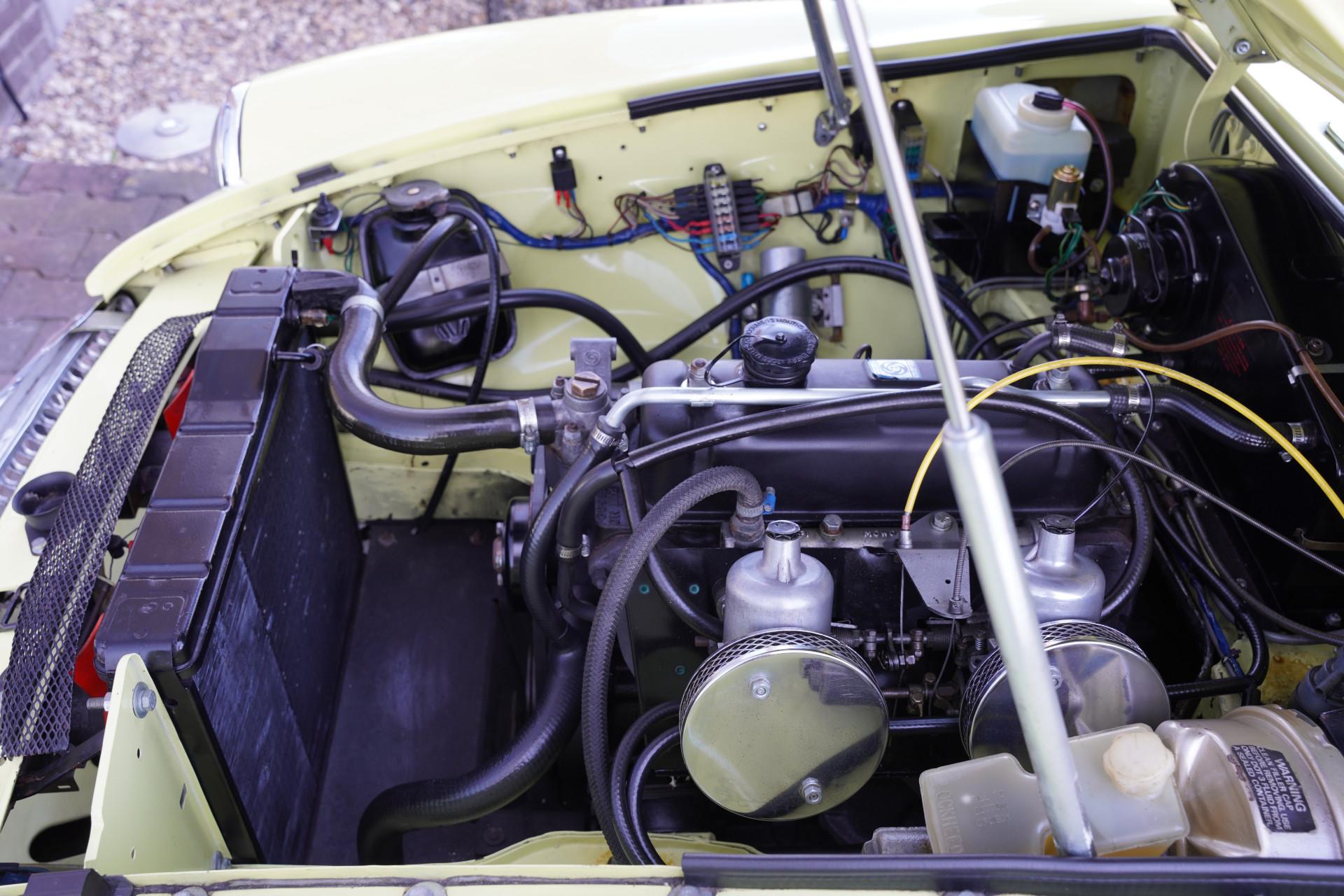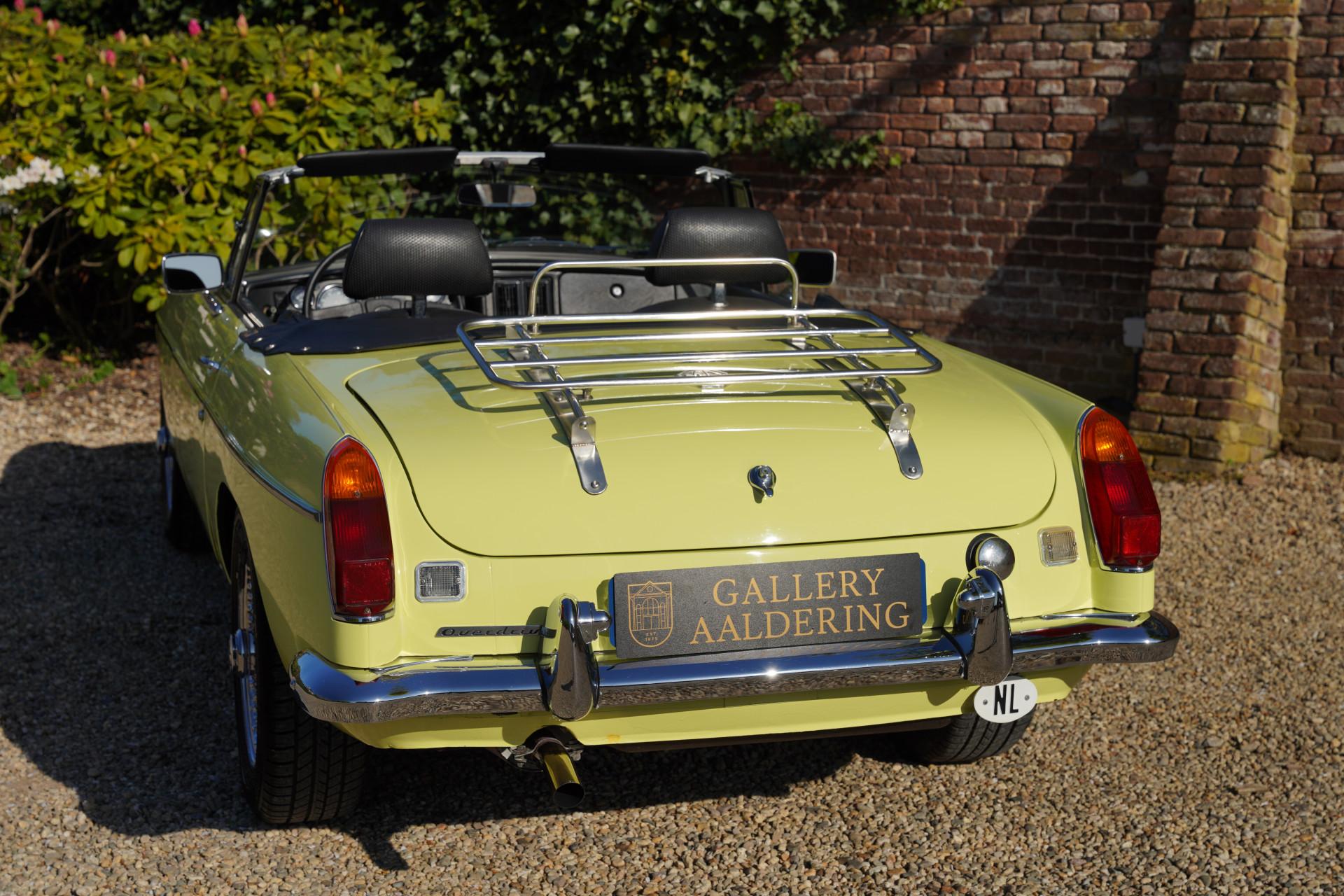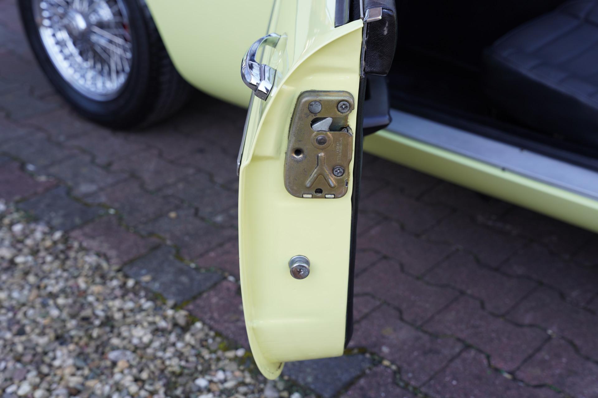 Experts will immediately notice that the production year of this particular model conflicts with the chrome bumpers is sports. However, there will be few people who see this as a drawback. The '77 B you see here was delivered new in the Netherlands and was sold to the owner after four years, who kept hold of it until now. The proud gentleman drove his soft yellow English convertible for over 40 years, during which the car underwent a complete restoration about halfway through that period. No half-measures and certainly not rushed: the two-seater was completely overhauled, and there is an enormous stack of invoices documenting the restoration. From the chrome bumpers and grille to the beautiful wire wheels and the tiniest bolt, everything that was replaced or restored during the restoration (and that list is almost endless) has been documented.