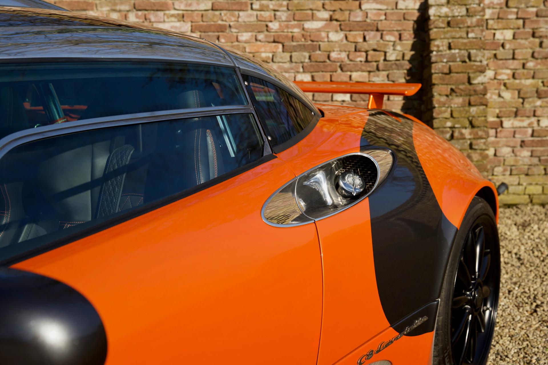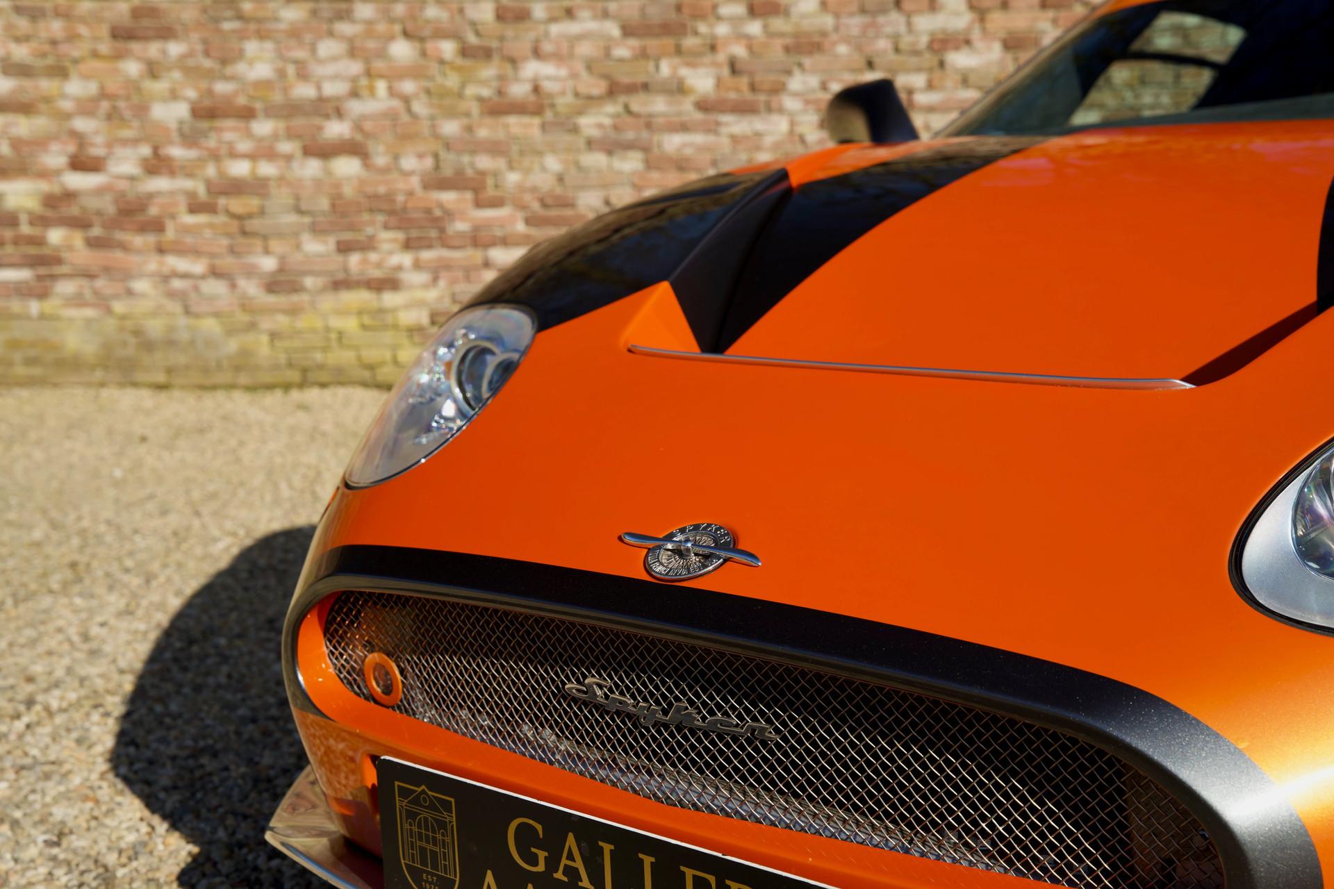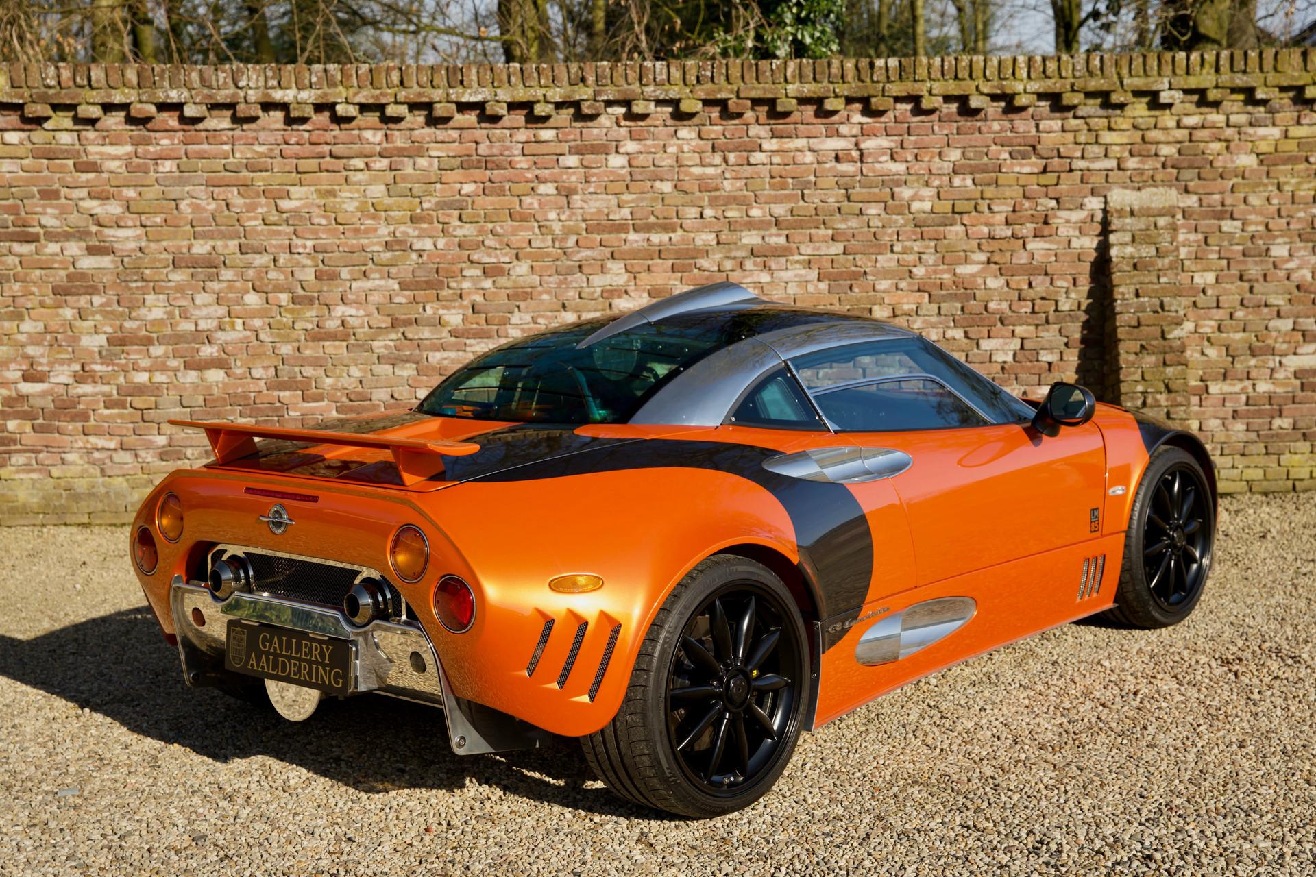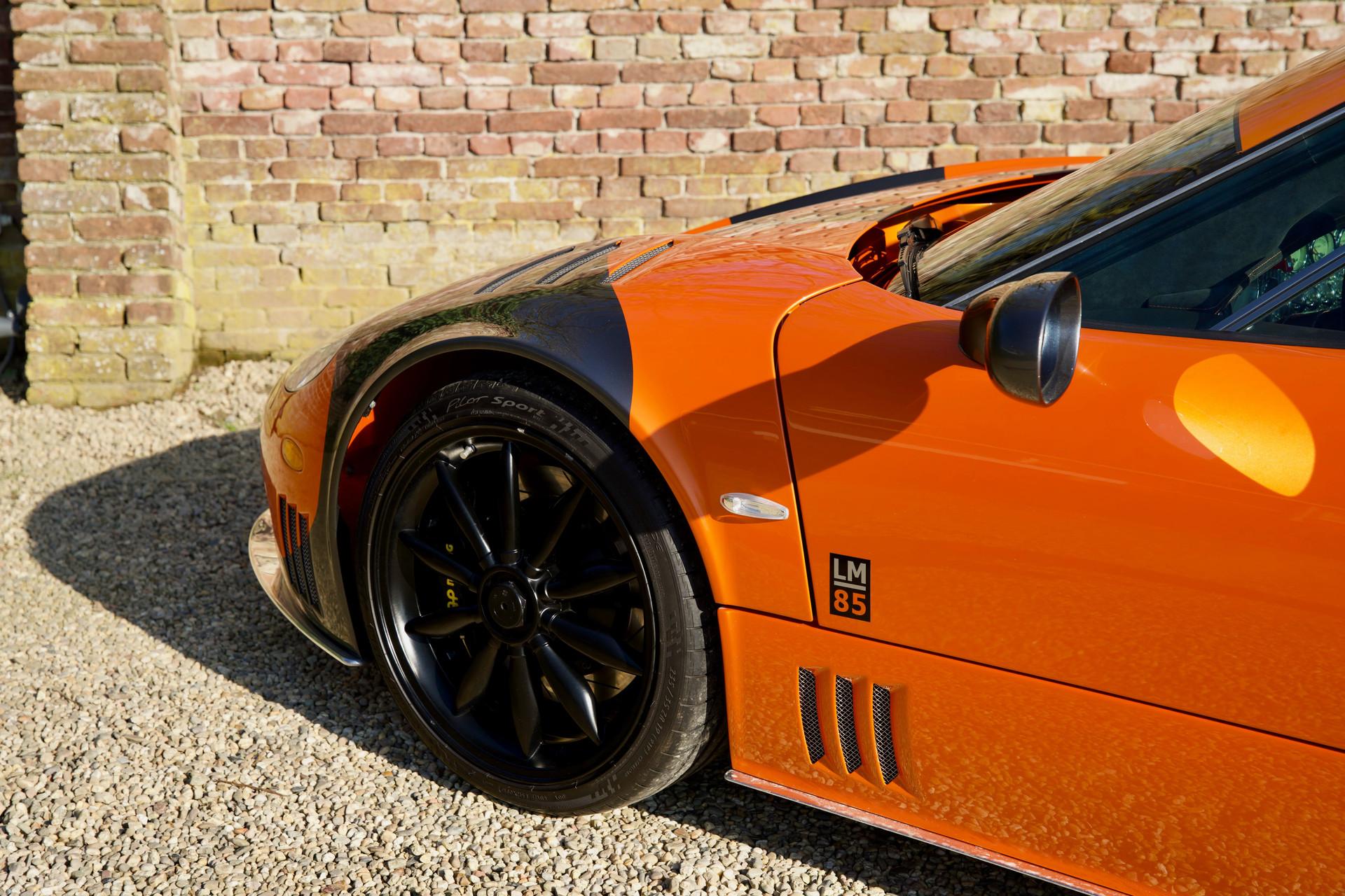 Naturally this Spyker C8 Laviolette LM85 is totally undamaged. Since 2009 the car has only travelled 7,651 kilometres. The car's condition reflects the low usage, it is nothing less than immaculate. As expected the car has remained totally in an original state, including its paintwork. When opening one of its scissor doors it becomes apparent the Spyker was built to an exacting standard. The doors scissor up precisely with minimal effort. The hood easily pivots forward to reveal a lovely aluminium front suspension housing many add-ons from the Audi stable. The Spyker LM 85 stands proudly on its 19-inch “Aeroblade” wheels with centre-lock. The wheels are beautifully filled in by a pair of extremely powerful AP brakes with 6 front pistons and 4 rear wheel ones. The suspension has fully adjustable Koni's attached to the double wishbones. The finish sports the wonderful name “Burned Almond Orange” accentuated with Gunmetal elements. The car also has a roof air inlet made of polished aluminium. The polished aluminium is a recurring theme contrasting the orange paintwork. The exhaust is embellished with adapted ends distinguishing it from the “normal” Spykers. The LM 85 is further recognisable by its small rear spoiler, orange window surround, large diffuser and a frontend splitter.