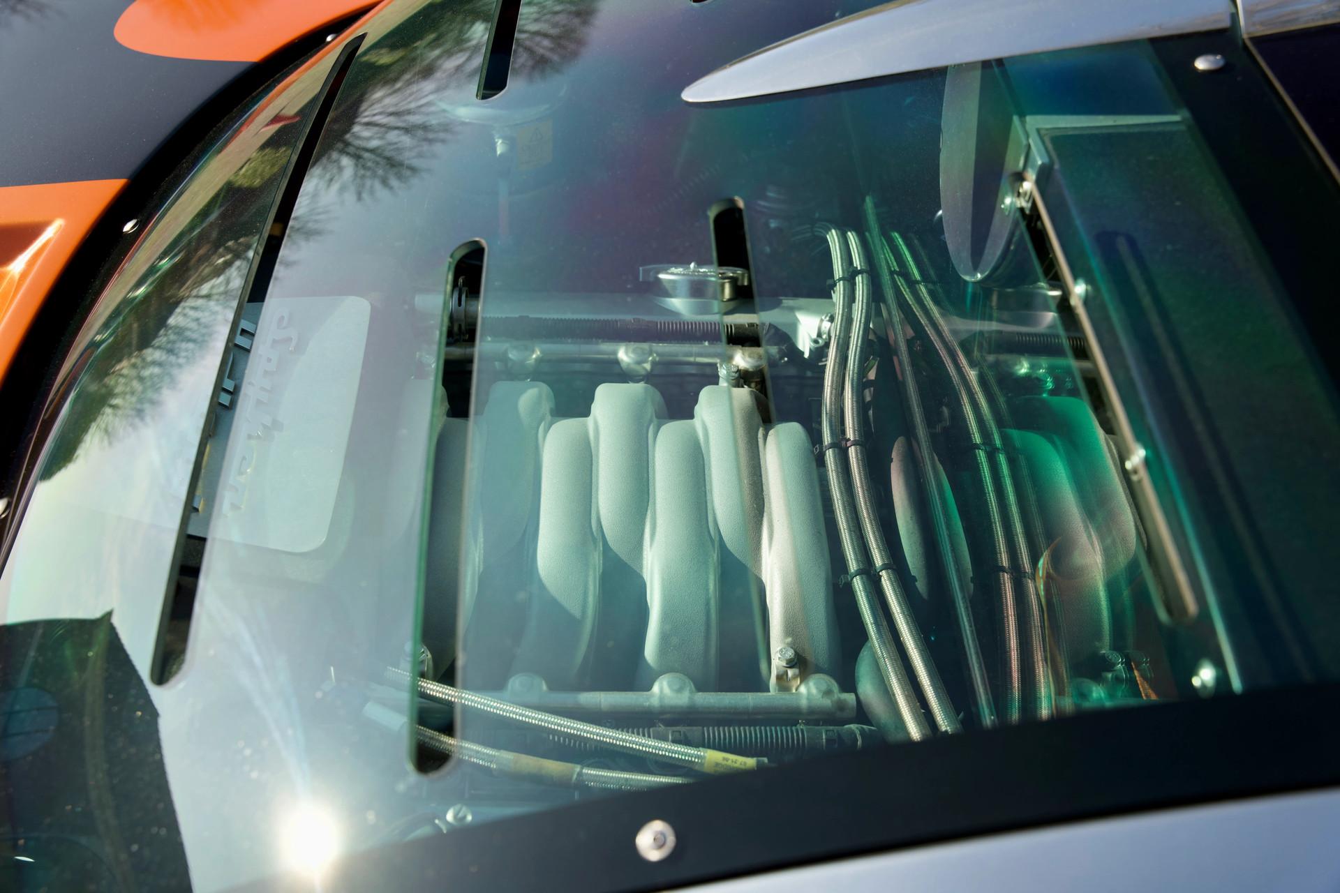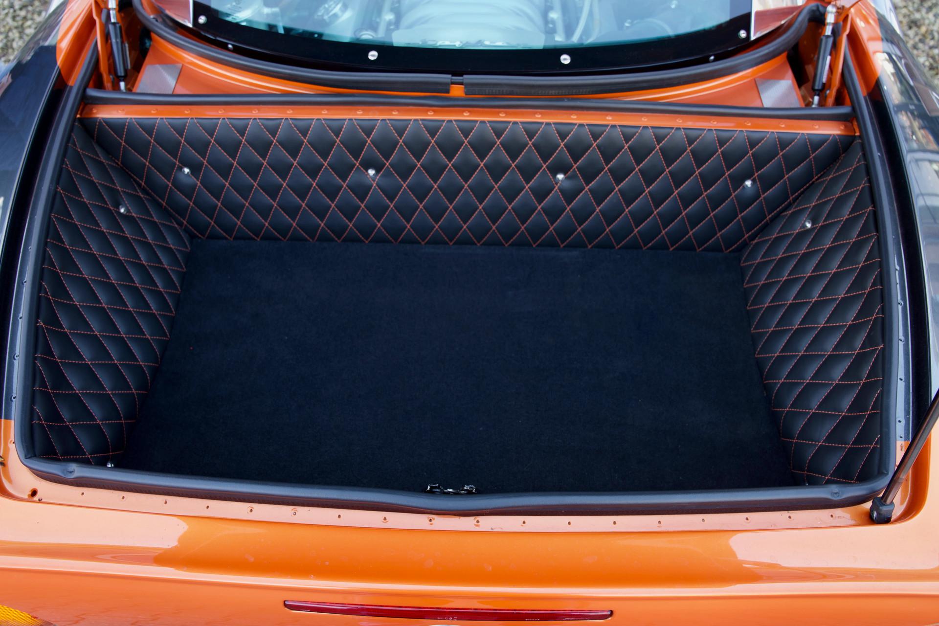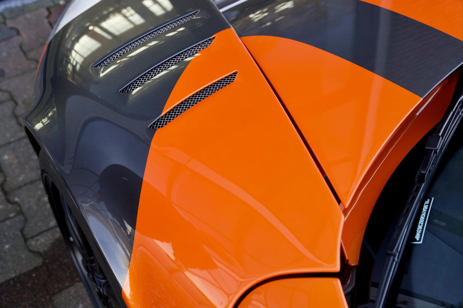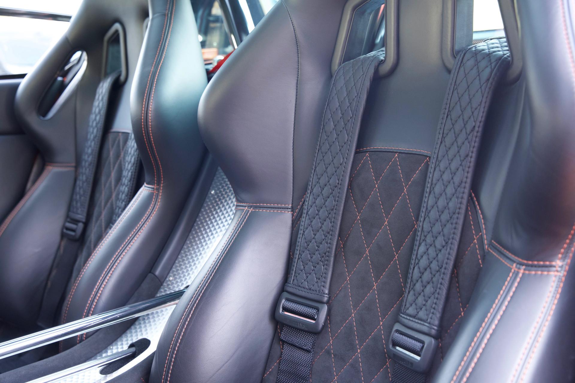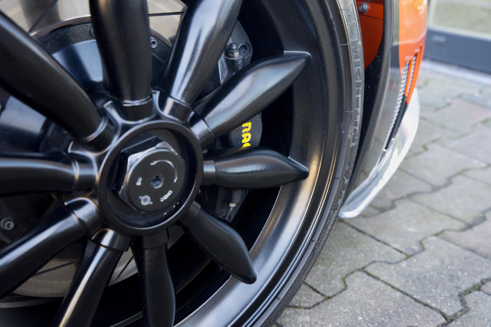 Naturally this Spyker C8 Laviolette LM85 is totally undamaged. Since 2009 the car has only travelled 7,651 kilometres. The car's condition reflects the low usage, it is nothing less than immaculate. As expected the car has remained totally in an original state, including its paintwork. When opening one of its scissor doors it becomes apparent the Spyker was built to an exacting standard. The doors scissor up precisely with minimal effort. The hood easily pivots forward to reveal a lovely aluminium front suspension housing many add-ons from the Audi stable. The Spyker LM 85 stands proudly on its 19-inch “Aeroblade” wheels with centre-lock. The wheels are beautifully filled in by a pair of extremely powerful AP brakes with 6 front pistons and 4 rear wheel ones. The suspension has fully adjustable Koni's attached to the double wishbones. The finish sports the wonderful name “Burned Almond Orange” accentuated with Gunmetal elements. The car also has a roof air inlet made of polished aluminium. The polished aluminium is a recurring theme contrasting the orange paintwork. The exhaust is embellished with adapted ends distinguishing it from the “normal” Spykers. The LM 85 is further recognisable by its small rear spoiler, orange window surround, large diffuser and a frontend splitter.