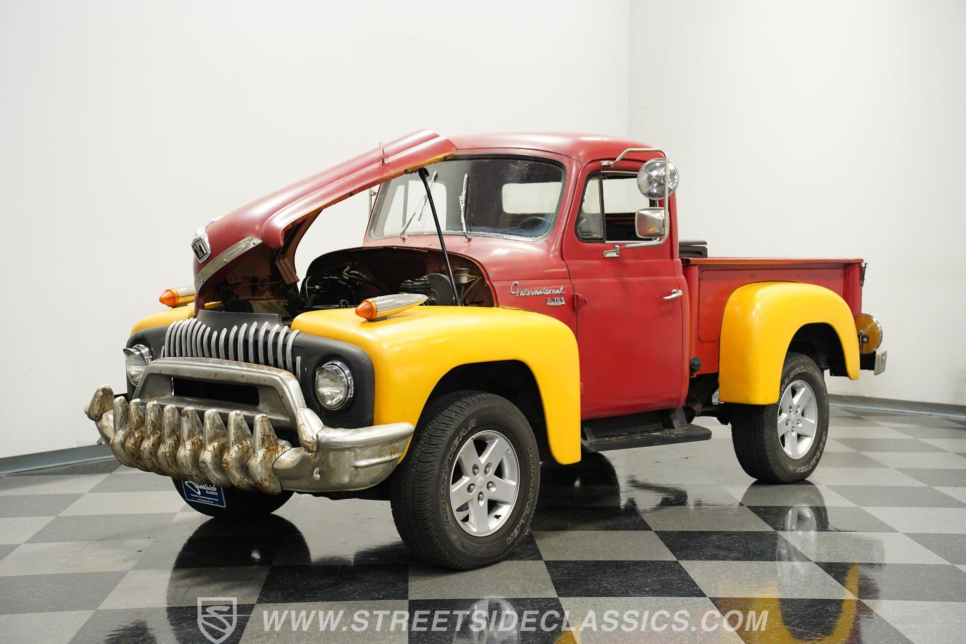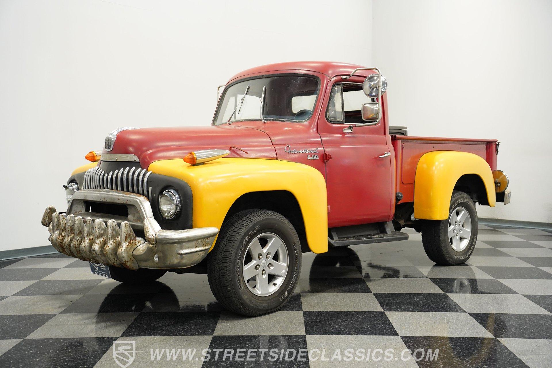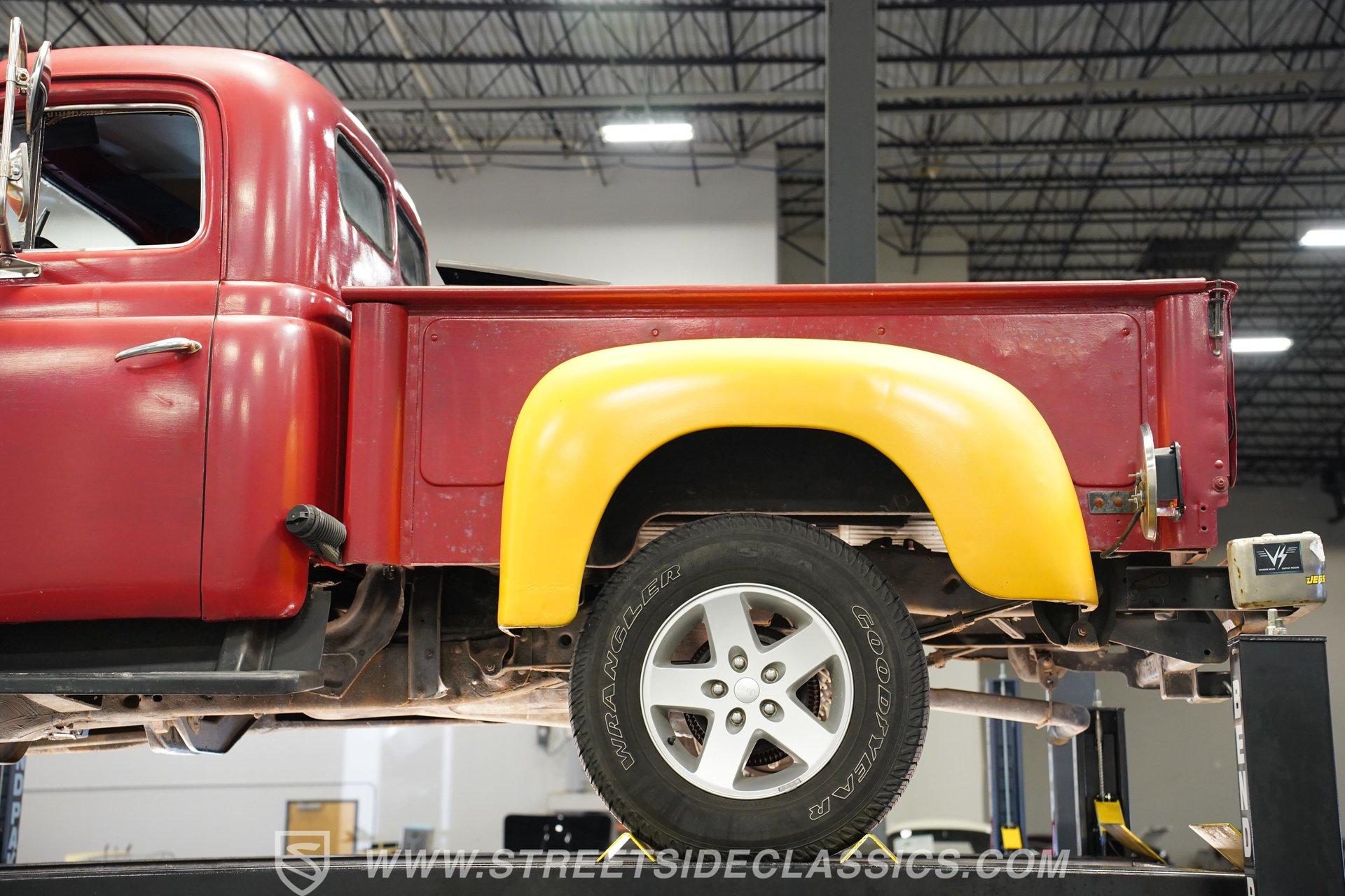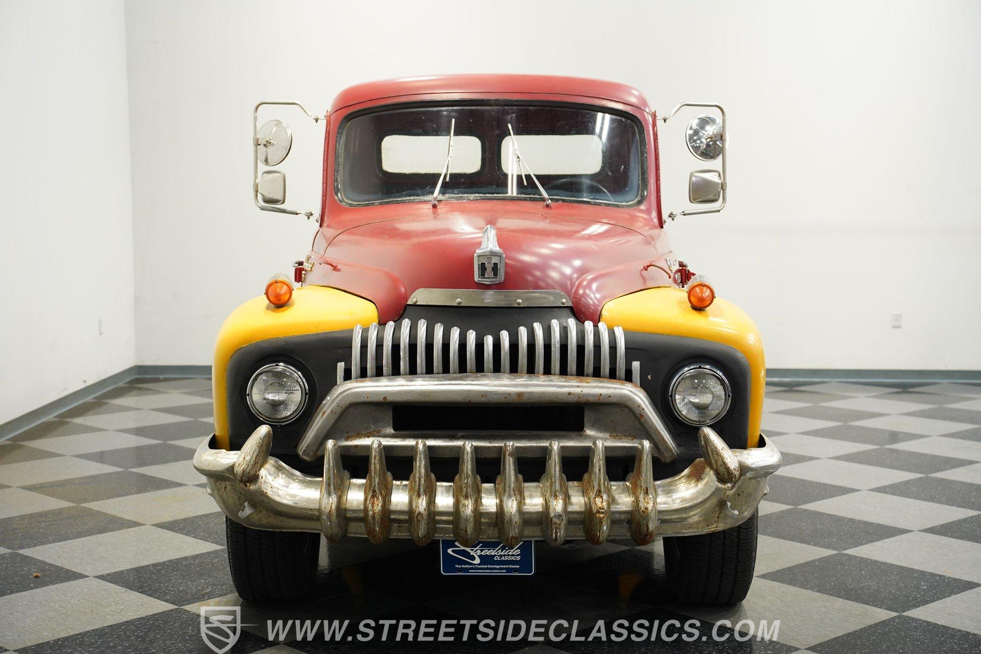 Looking for a classic that's sure to stand out in any setting? Then you'll want to check out this 1952 International Harvest Pickup 4x4. It's got an awesome, post-apocalyptic "Beyond Thunderdome" sensibility that pairs with its unexpectedly good road manners, and with its distinctive appearance and attention-grabbing paint scheme, you won't have much concern that someone else will pull up behind the wheel of anything like it. Some of the modifications made to this '50s workhorse could use a little further attention, but a significant amount of the heavy lifting has already been done, and in the right hands, this could be a seriously compelling project that will yield a stellar result. And just look at that front end! With its bulldog-like underbite, this classic pickup appears like it's about to tear into anything foolish enough to venture in front of it. Inside the doors is an interior that represents a nearly blank slate for your future restoration ambitions, but is also serviceable in its present state. The vinyl-covered bench seat is surprisingly comfortable, and you'll find no jutting springs to hamper your driving experience. The door panels to each side are well-fitted and harbor a pair of added speakers to bring tunes from the added Bluetooth receiver into the cabin. Just in front of the steering wheel that - like several other components - began life on a mid-'80s Dodge Dakota, a collection of accompanying gauges from the same era is in place, and while their fit could use a bit of refinement, both the speedometer and tachometer work as intended, the heater blower is functional and the windows roll up and down with no issue. The rear bed looks straight and solid, as well. Climb inside, fire up the engine, and you'll likely be pleasantly surprised by the result. There's a 3.9-liter Magnum V6 now residing beneath the hood, and it's running nicely, fed by electronic fuel injection and pairing with a 5-speed manual transmission to make up a drivetrain that provides a good driving experience, even at freeway speeds. This singular-classic pickup is built on a 1980s Dodge Dakota 4x4 platform, and while the adaptation work could use a closer inspection, and possibly even a bit of additional work, the upgrade pays real-life dividends in the form of a more refined ride, fully functional 4-wheel drive, power steering and power brakes that position discs up front. HIGHLIGHTS 3.9-LITER MAGNUM V6 ENGINE ELECTRONIC FUEL INJECTION 5-SPEED MANUAL TRANSMISSION POWER STEERING POWER BRAKES, WITH DISCS IN FRONT 4-WHEEL DRIVE UPDATED CHASSIS FROM AN '80s DODGE DAKOTA 17" WRANGLER WHEELS STANDOUT RED AND YELLOW EXTERIOR BLUETOOTH RADIO TILT COLUMN SPARE DOOR AND 2 SPARE TIRES INCLUDED So, if you're searching for a ruggedly distinctive ride that's visually off the beaten track and is fully capable of navigating the same, this 1952 International Harvester Pickup 4x4 may be just what you're looking for. Call today!