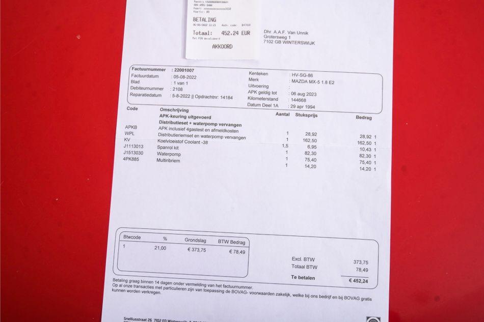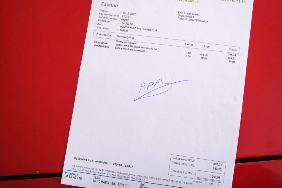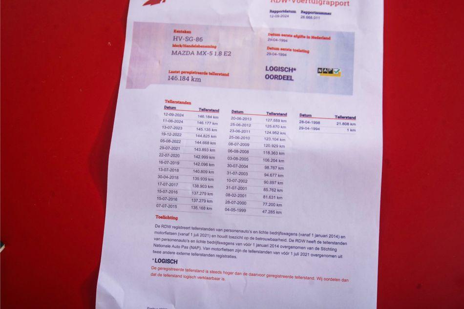 Original Dutch car , with service history and NAP. Original and beautiful. Recently fitted with a new roof. Leading car for the nineties and definitely a young-timer of note: Mazda MX5 from 1994 in sublime condition. The car offered here was built for the European market, these versions were called MX-5 , for the American market they were called Miata . The bodywork is in neat, clean and very good condition. Absolutely a feast for the eyes! The still original interior excels in simplicity and only the most necessary things were included in the design. The odometer shows only 146000 kilometres. The flip-up headlights are characteristic for the Miata/MX-5 of the first series as well as its sky-high reliability and fantastic road handling. For enthusiasts and collectors an extremely suitable example and without doubt the classic of the future!