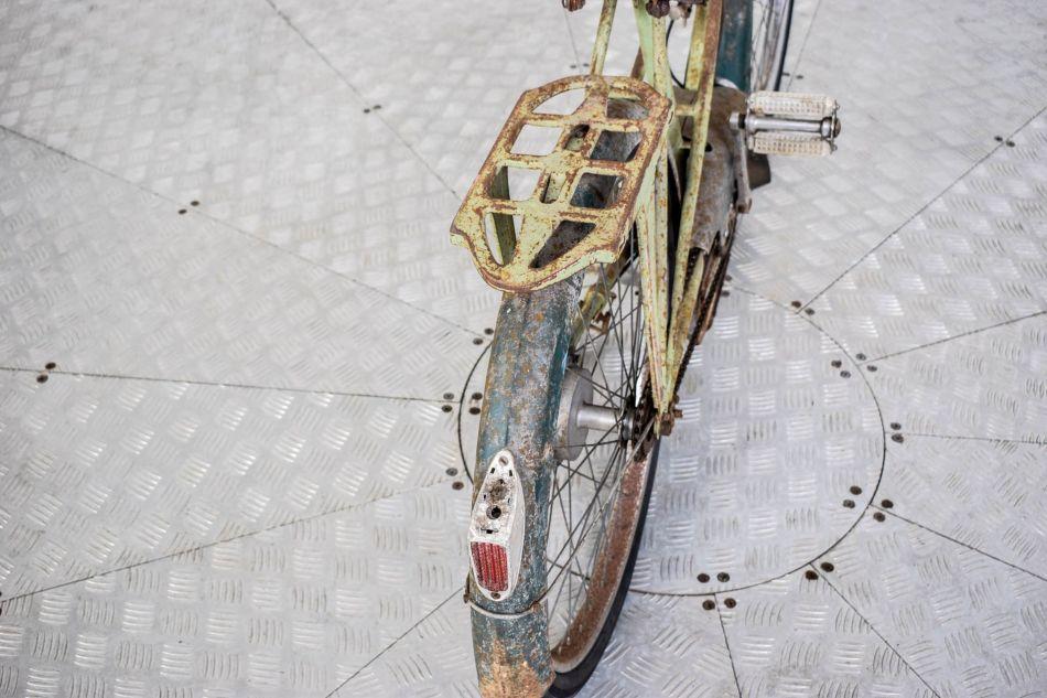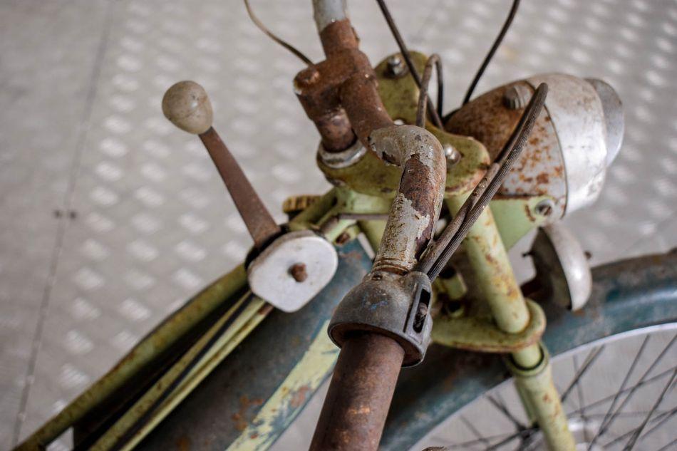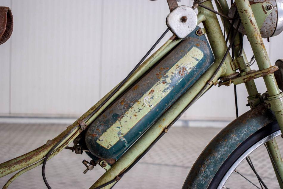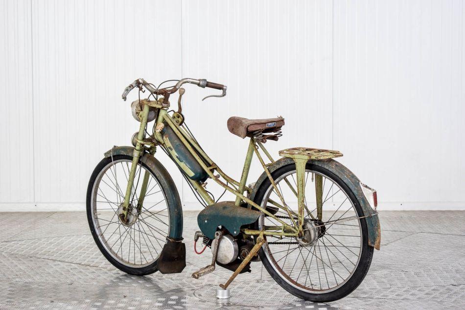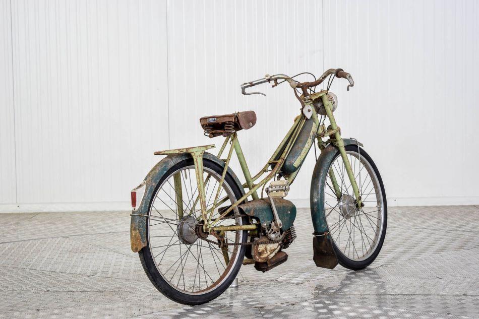 Mobylette from France with lots of patina, no papers, 1 of the first models with roller drive on the rear tyre. Mobylette,bicycle with auxiliary motor introduced at the Utrecht Autumn Fair of 1949, which was a world first! The motorbike press of the time described the Mobylette as follows: "This Mobylette has a 50cc engine in a specially made frame. The two-stroke engine is capable of propelling the bike at a speed of 30 km/h, and that the little engine does this effortlessly is evident from the low speed of 2800 rpm developed in the process. Fuel consumption is 1 litre every 70 to 80 km, with an oil to petrol mixture ratio of 1 to 16, while the tank is neatly tucked away between saddle frame tube and rear mudguard and can hold two litres of fuel. The weight of the single frame is 18 kg and that of the little motorbike 7 kg, matching that of its peers. What in motorbikes we call the short or primary chain is here implemented as a V-belt hidden from view (and the trouser leg) by a screen. The secondary transmission is done by a chain. The throttle is controlled from the handlebars by a rotating handle and should the bike unexpectedly give up the ghost temporarily, you can pull out the three pins on the left side and the bike is free, allowing you to move around pedalling. Hidden in the headlight is another battery that can run the lamp, otherwise powered by the current generated by the flywheel magnet. The little engine itself was not a new construction, but was largely a continuation of a type that - with 60cc displacement and in combination with a separate two-speed gearbox - had been used in the Poney, a light motorbike. However, the engine characteristics had changed considerably. The emphasis was now on high pulling power at low revs. High power had been traded for pulling power and long life. What immediately stands out when looking at the Mobylette - because that's what this moped is still called in the walk - is its practical and purposeful construction. A chassis with low entry, thus also suitable for ladies, and the motor mounted in front of the bottom bracket, which achieves a low centre of gravity and minimises the risk of soiling clothes. The tank is cleverly hidden in an otherwise empty space between seat tube and rear mudguard.Mobylette uit Frankrijk met veel patina, geen papieren, 1 van de eerste modellen met rolaandrijving op de achterband. Mobylette,rijwiel met hulpmotor geintroduceerd op de Utrechtse Najaarsbeurs van 1949, hetgeen een wereldprimeur was! De motorpers van die tijd beschreef de Mobylette als volgt: "Deze Mobylette heeft een motortje van 50 cc in een speciaal voor dit doel gemaakt frame. De tweetakt motor is in staat de fiets met een snelheid van 30 km/u voort te bewegen en dat het motortje dit zonder moeite doet blijkt wel uit het hierbij ontwikkeld lage toerental van 2800 toeren per minuut. Het brandstofverbruik bedraagt 1 liter op 70 a 80 km, met een mengverhouding van olie op benzine van 1 op 16, terwijl het tankje keurig tussen zadelframebuis en achterspatscherm weggewerkt is en twee liter brandstof kan bevatten. Het gewicht van het enkele frame is 18 kg en dat van het motortje 7 kg, wat overeenkomt met dat van zijn soortgenoten. Wat wij bij de motorfietsen de korte of primaire ketting noemen is hier uitgevoerd als een V-snaar die door een scherm aan het oog (en de broekspijp) onttrokken wordt. De secundaire overbrenging gebeurt door een ketting. Het gas wordt vanaf het stuur bediend door een draaibaar handle en mocht de motor onverhoopt tijdelijk de geest geven dan kan men de drie pennetjes aan de linkerzijde uittrekken en de motor staat vrij, zodat men zich trappend kan verplaatsen. In de koplamp zit nog een batterij verscholen die de lamp kan laten branden, die anders door de opgewekte stroom van de vliegwielmagneet gevoed wordt. Het motortje zelf was geen nieuwe constructie, maar in grote trekken een voortzetting van een type dat - met 60 cc cylinderinhoud en in combinatie met een losse tweeversnellingsbak - in de Poney, een licht motorfietsje, was gebruikt. Echter de motorkarakteristiek was danig gewijzigd. Het accent was nu gelegd op een grote trekkracht bij een laag toerental. Hoog vermogen was ingeruild voor trekkracht en een lange levensduur. Wat meteen opvalt bij het bekijken van de Mobylette - want zo wordt deze bromfiets toch altijd nog in de wandeling genoemd - is de practische en doelgerichte bouw. Een rijwielgedeelte met lage instap, ook geschikt dus voor dames, en het motortje gemonteerd voor de trapas, waardoor een laag zwaartepunt bereikt wordt en de kans op vervuiling van de kleding gering is. Het tankje is slim weggewerkt in een anders loze ruimte tussen zadelbuis en achterspatbord.