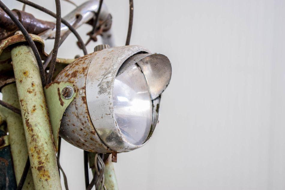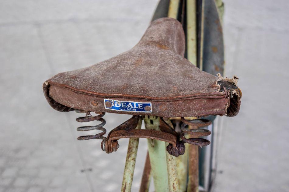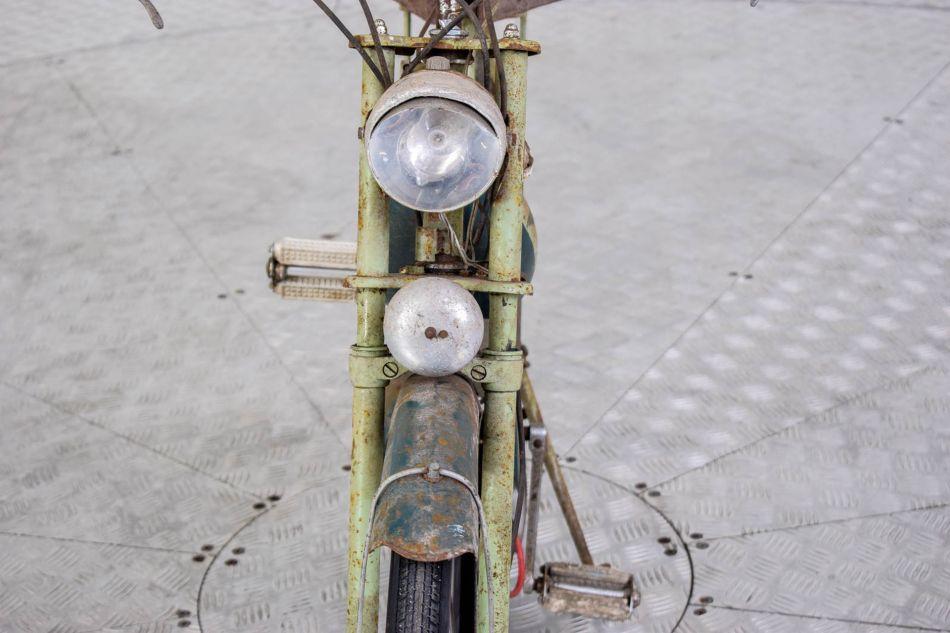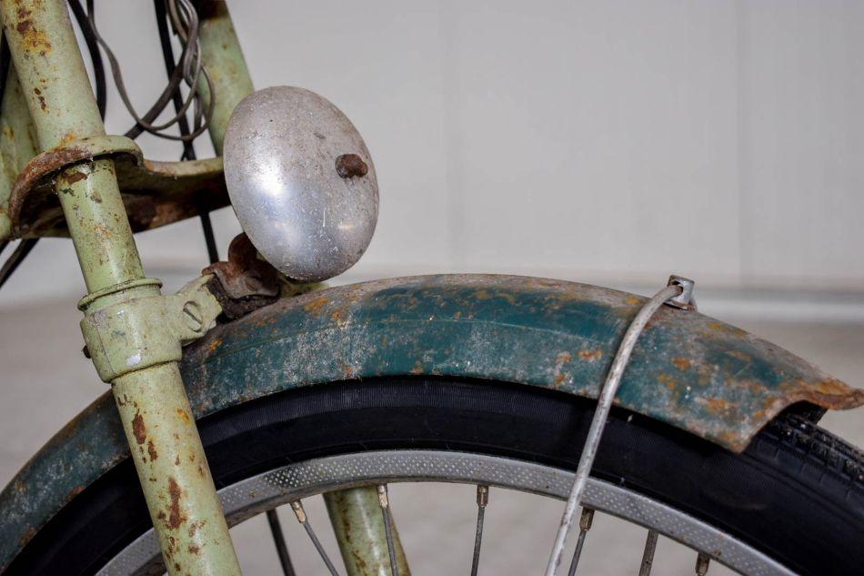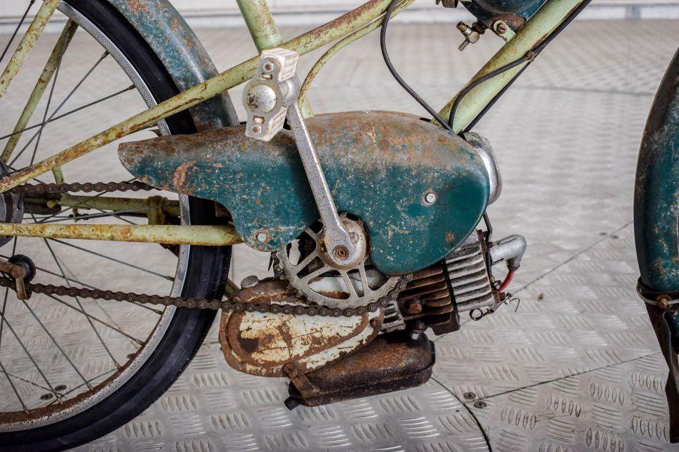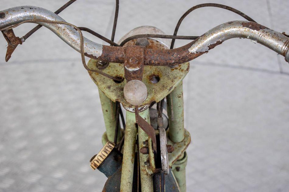 Mobylette from France with lots of patina, no papers, 1 of the first models with roller drive on the rear tyre. Mobylette,bicycle with auxiliary motor introduced at the Utrecht Autumn Fair of 1949, which was a world first! The motorbike press of the time described the Mobylette as follows: "This Mobylette has a 50cc engine in a specially made frame. The two-stroke engine is capable of propelling the bike at a speed of 30 km/h, and that the little engine does this effortlessly is evident from the low speed of 2800 rpm developed in the process. Fuel consumption is 1 litre every 70 to 80 km, with an oil to petrol mixture ratio of 1 to 16, while the tank is neatly tucked away between saddle frame tube and rear mudguard and can hold two litres of fuel. The weight of the single frame is 18 kg and that of the little motorbike 7 kg, matching that of its peers. What in motorbikes we call the short or primary chain is here implemented as a V-belt hidden from view (and the trouser leg) by a screen. The secondary transmission is done by a chain. The throttle is controlled from the handlebars by a rotating handle and should the bike unexpectedly give up the ghost temporarily, you can pull out the three pins on the left side and the bike is free, allowing you to move around pedalling. Hidden in the headlight is another battery that can run the lamp, otherwise powered by the current generated by the flywheel magnet. The little engine itself was not a new construction, but was largely a continuation of a type that - with 60cc displacement and in combination with a separate two-speed gearbox - had been used in the Poney, a light motorbike. However, the engine characteristics had changed considerably. The emphasis was now on high pulling power at low revs. High power had been traded for pulling power and long life. What immediately stands out when looking at the Mobylette - because that's what this moped is still called in the walk - is its practical and purposeful construction. A chassis with low entry, thus also suitable for ladies, and the motor mounted in front of the bottom bracket, which achieves a low centre of gravity and minimises the risk of soiling clothes. The tank is cleverly hidden in an otherwise empty space between seat tube and rear mudguard.Mobylette uit Frankrijk met veel patina, geen papieren, 1 van de eerste modellen met rolaandrijving op de achterband. Mobylette,rijwiel met hulpmotor geintroduceerd op de Utrechtse Najaarsbeurs van 1949, hetgeen een wereldprimeur was! De motorpers van die tijd beschreef de Mobylette als volgt: "Deze Mobylette heeft een motortje van 50 cc in een speciaal voor dit doel gemaakt frame. De tweetakt motor is in staat de fiets met een snelheid van 30 km/u voort te bewegen en dat het motortje dit zonder moeite doet blijkt wel uit het hierbij ontwikkeld lage toerental van 2800 toeren per minuut. Het brandstofverbruik bedraagt 1 liter op 70 a 80 km, met een mengverhouding van olie op benzine van 1 op 16, terwijl het tankje keurig tussen zadelframebuis en achterspatscherm weggewerkt is en twee liter brandstof kan bevatten. Het gewicht van het enkele frame is 18 kg en dat van het motortje 7 kg, wat overeenkomt met dat van zijn soortgenoten. Wat wij bij de motorfietsen de korte of primaire ketting noemen is hier uitgevoerd als een V-snaar die door een scherm aan het oog (en de broekspijp) onttrokken wordt. De secundaire overbrenging gebeurt door een ketting. Het gas wordt vanaf het stuur bediend door een draaibaar handle en mocht de motor onverhoopt tijdelijk de geest geven dan kan men de drie pennetjes aan de linkerzijde uittrekken en de motor staat vrij, zodat men zich trappend kan verplaatsen. In de koplamp zit nog een batterij verscholen die de lamp kan laten branden, die anders door de opgewekte stroom van de vliegwielmagneet gevoed wordt. Het motortje zelf was geen nieuwe constructie, maar in grote trekken een voortzetting van een type dat - met 60 cc cylinderinhoud en in combinatie met een losse tweeversnellingsbak - in de Poney, een licht motorfietsje, was gebruikt. Echter de motorkarakteristiek was danig gewijzigd. Het accent was nu gelegd op een grote trekkracht bij een laag toerental. Hoog vermogen was ingeruild voor trekkracht en een lange levensduur. Wat meteen opvalt bij het bekijken van de Mobylette - want zo wordt deze bromfiets toch altijd nog in de wandeling genoemd - is de practische en doelgerichte bouw. Een rijwielgedeelte met lage instap, ook geschikt dus voor dames, en het motortje gemonteerd voor de trapas, waardoor een laag zwaartepunt bereikt wordt en de kans op vervuiling van de kleding gering is. Het tankje is slim weggewerkt in een anders loze ruimte tussen zadelbuis en achterspatbord.
