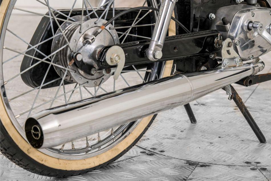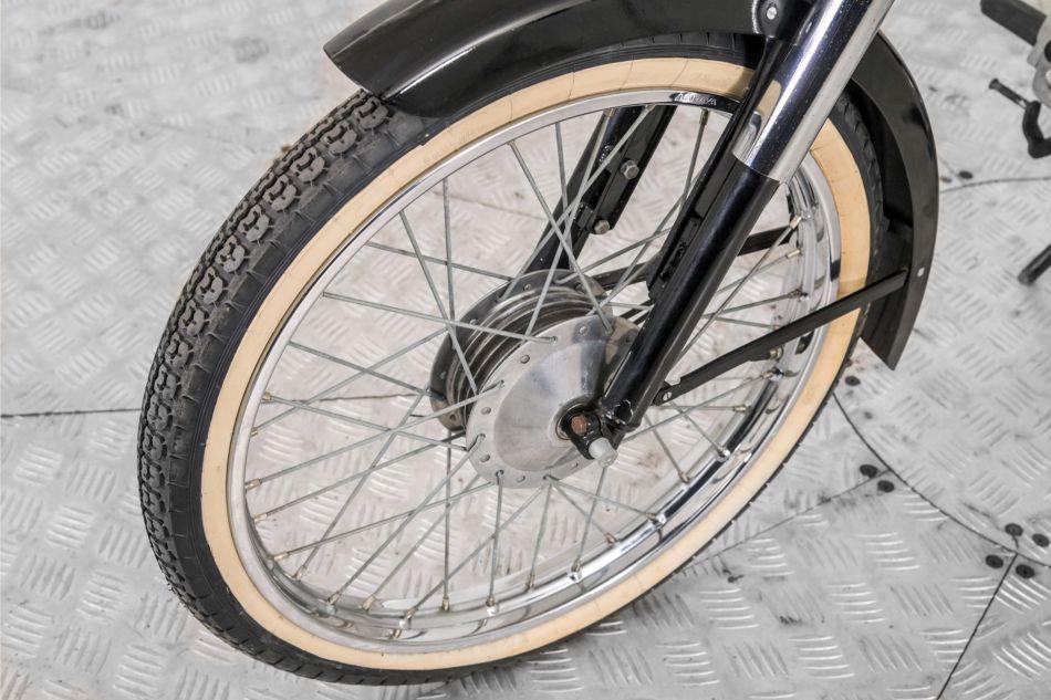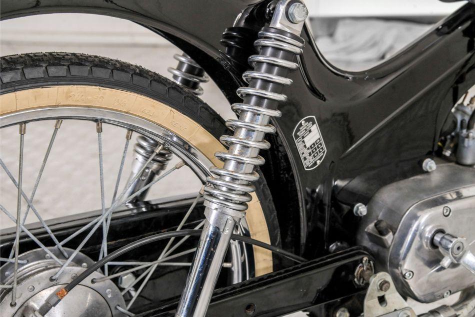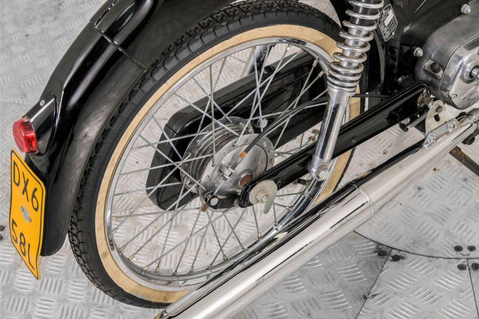 In the Netherlands, the Tomos 4L is introduced with a completely new chassis section and the aforementioned engine in 4-speed version. There is a strong resemblance to the old Tomos models, real the frame is wider in base.Whereas the prototypes probably still used the old 19-inch rims, they soon switched to 18-inch. The 4L further differs by the use of new hubs without the hollow shafts, a different swingarm, with different shock absorbers and detachable chain guards.The 4L still has the aluminium Hella rear light , the rear shock absorbers with closed chrome bushings, a fully painted block, but most importantly still has the original trial handlebars with embossed logo. The front mudguard was still painted in the colour of the frame. The old round cylinder with its smaller spool ports is replaced by the new square cylinder with wider spool ports. This necessitates a modification to the crankcase, here too we see larger spool ports. A full chrome front mudguard, polished cooling housing parts of the engine and a polished clutch cover also follow towards the end of 72. During this period, a 50cc motorbike is also temporarily offered in the Netherlands, better known in Slovenia as Kolibri 15, in the Netherlands as ST50. This belly slider has the same engine as the 4L but now with 5 gears which delivered about 5hp. When the motorbike proved to be unsaleable in the Netherlands, the remaining models were converted to mopeds.