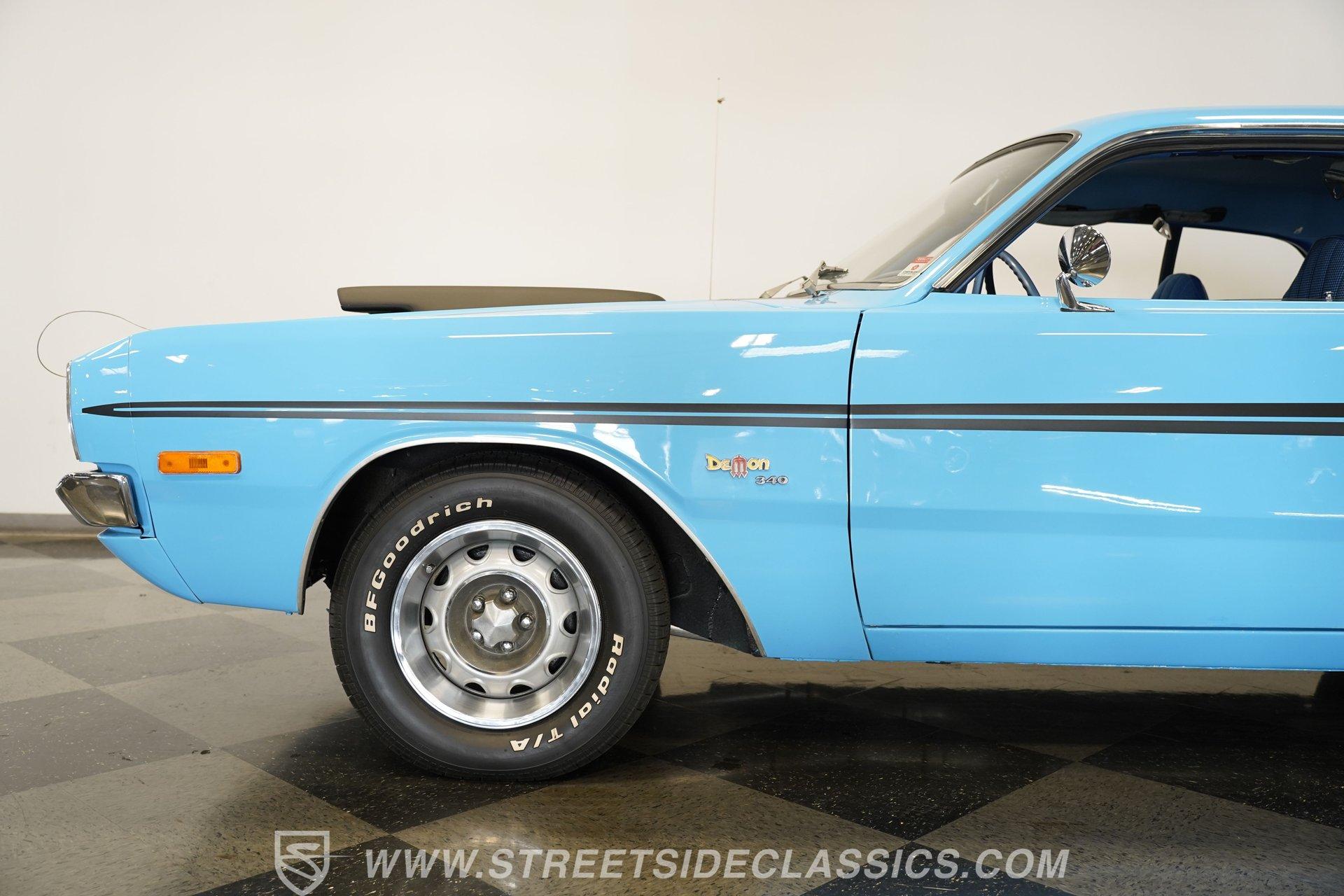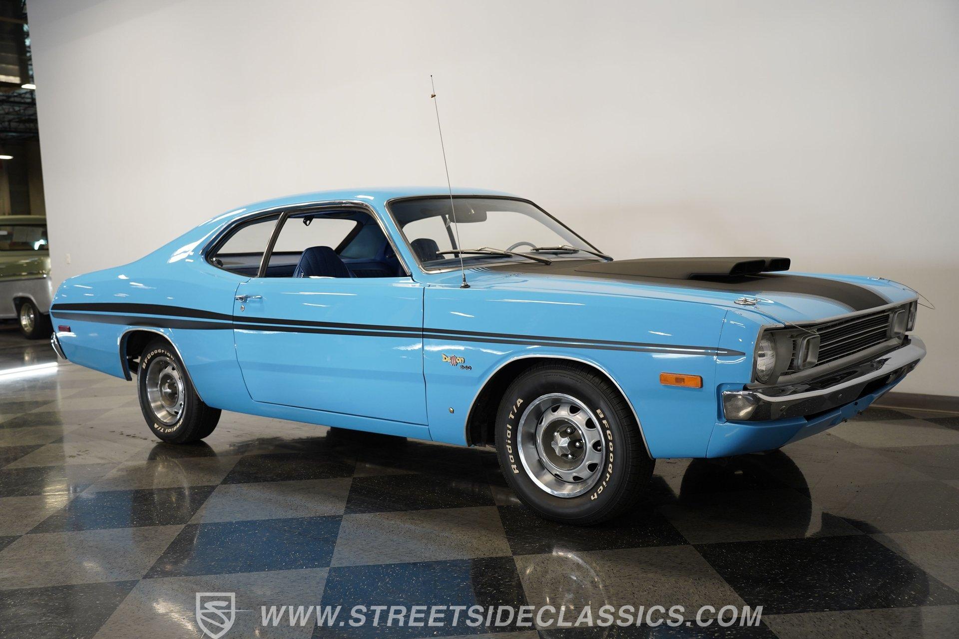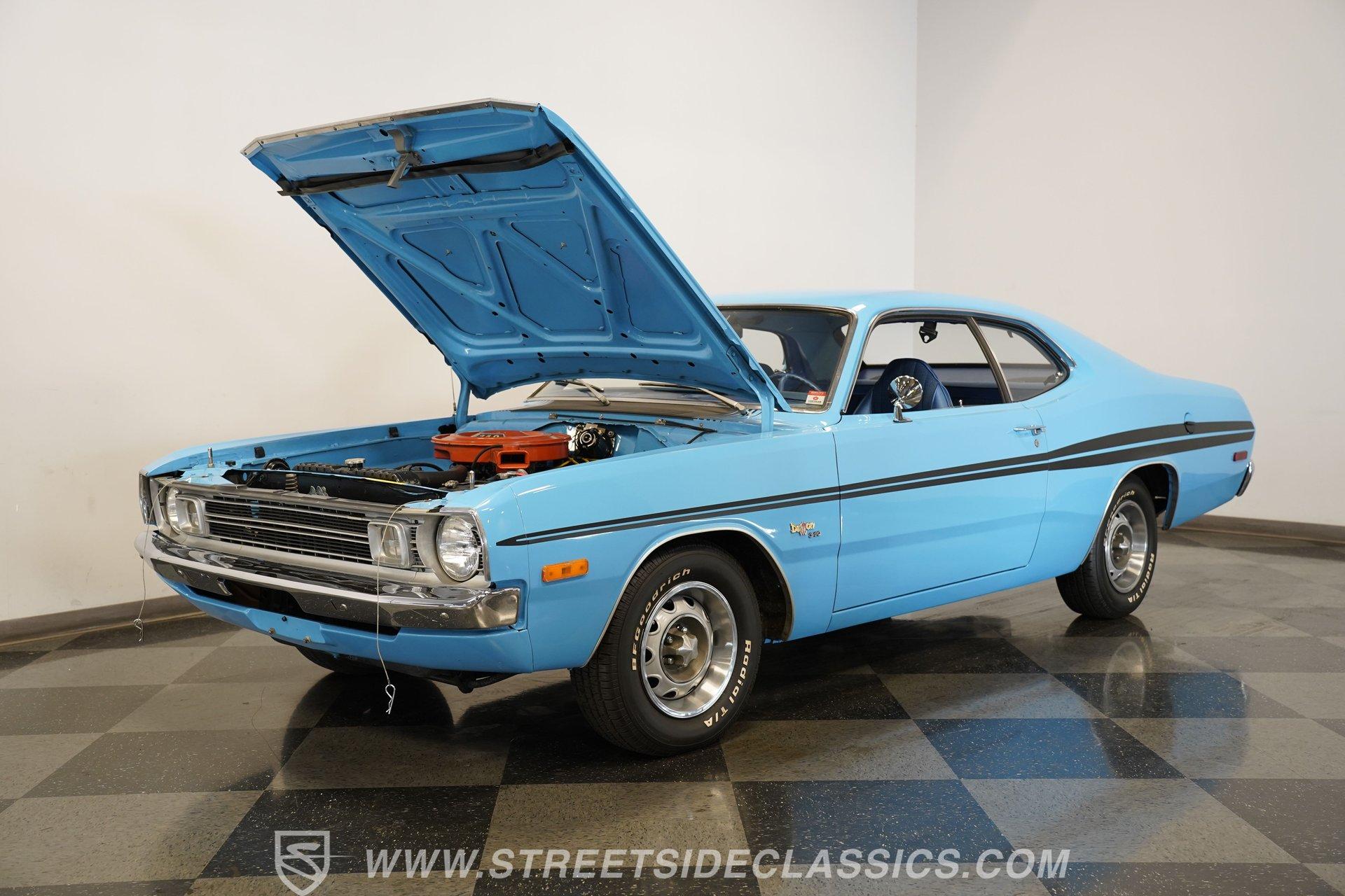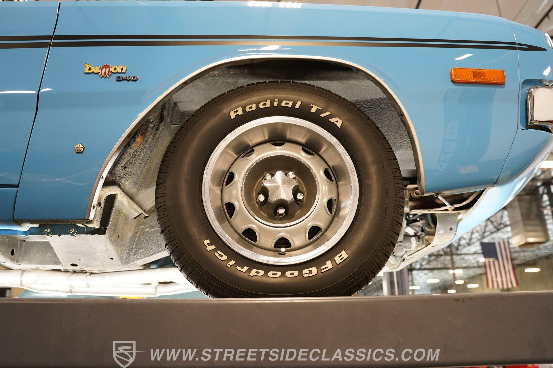 If you've ever wanted to own a true classic car, here's your chance. This 1972 Dodge Dart Demon 340 is an excellent example of a real muscle car. It's in great condition inside and out and has been restored to its original muscle car appearance. The emblems, decals, wheels, and hood are all correct. Both bumpers shine along with all the other shiny accents. Its stance is just the way it's supposed to be, and the blue paint job is an original Dodge color. The hood pins are correct, and the headlights and taillights are clear. This is a great restoration. The interior continues the blue theme. The door panels, front bucket seats, rear seats, and carpet are all in great shape. There's the correct 4-speed shifter in the center of the floor, making this muscle car real fun to drive. The steering wheel, dashboard, gauges, radio, and heat controls have all been restored properly. The gauges are clear and easy to read. The trunk is very clean with plenty of space. This interior has been restored just as nicely as the exterior. There's more blue under the hood, aside from the famous orange air cleaner. The engine bay is clean and looks just the way it should. Between the fenders is what's believed to be a numbers-matching 340 cubic-inch V8. Also believed to be numbers-matching is the 4-speed manual transmission that connects to an 8 ¾ rear axle. The front suspension is simple, equipped with torsion bars and a sway bar attached to a K-frame. The rear suspension is equally straightforward, with leaf springs and shocks. The Dart rides on OEM 14-inch wheels wrapped in 205/70R14 BFG Radial T/A tires. Behind those are drum brakes at all four corners. The Dart also has stock-style dual exhaust with chambered mufflers. Highlights: 340 Cubic-Inch V8 (Believed To Be Numbers-Matching) 4-Speed Transmission (Believed To Be Numbers-Matching) 8-3/4 Rear Axle Front Torsion Bars And A Sway Bar Attached To The K-frame Rear Leaf Springs With Shocks Four Wheel Drum Brakes 14-Inch OEM Wheels 205/70R14 BFG Radial T/A Tires Original Exhaust With Chamber Mufflers Power Steering AM/FM Radio Heat Owner's Manual Here is a beautiful 1972 Dodge Dart Demon 340 that has been restored to its fully classic muscle car potential. It looks great, runs great, and is simply a fun car to drive. The original blue color is eye-catching, and the attention to detail in the restoration is amazing. Call today!