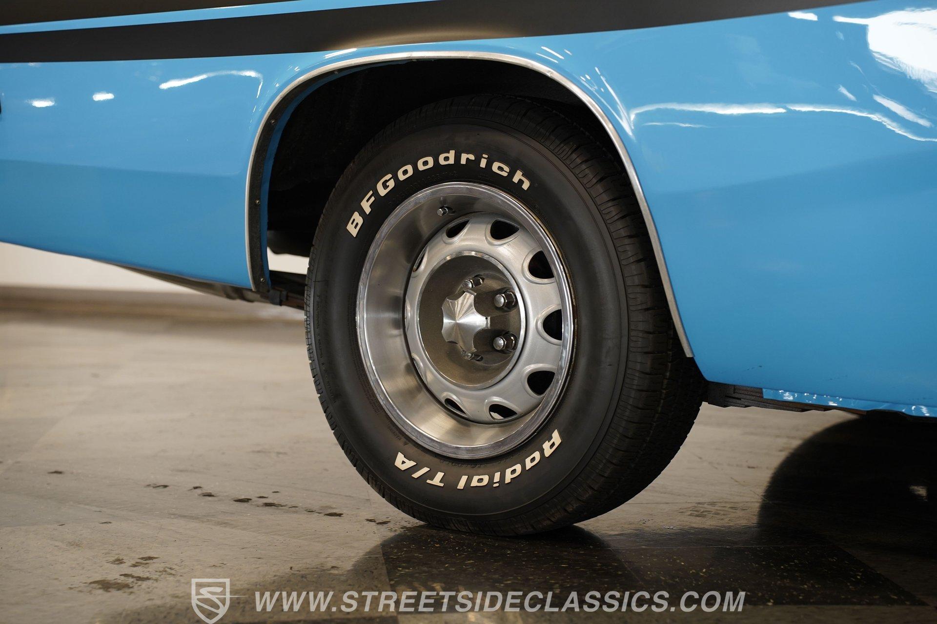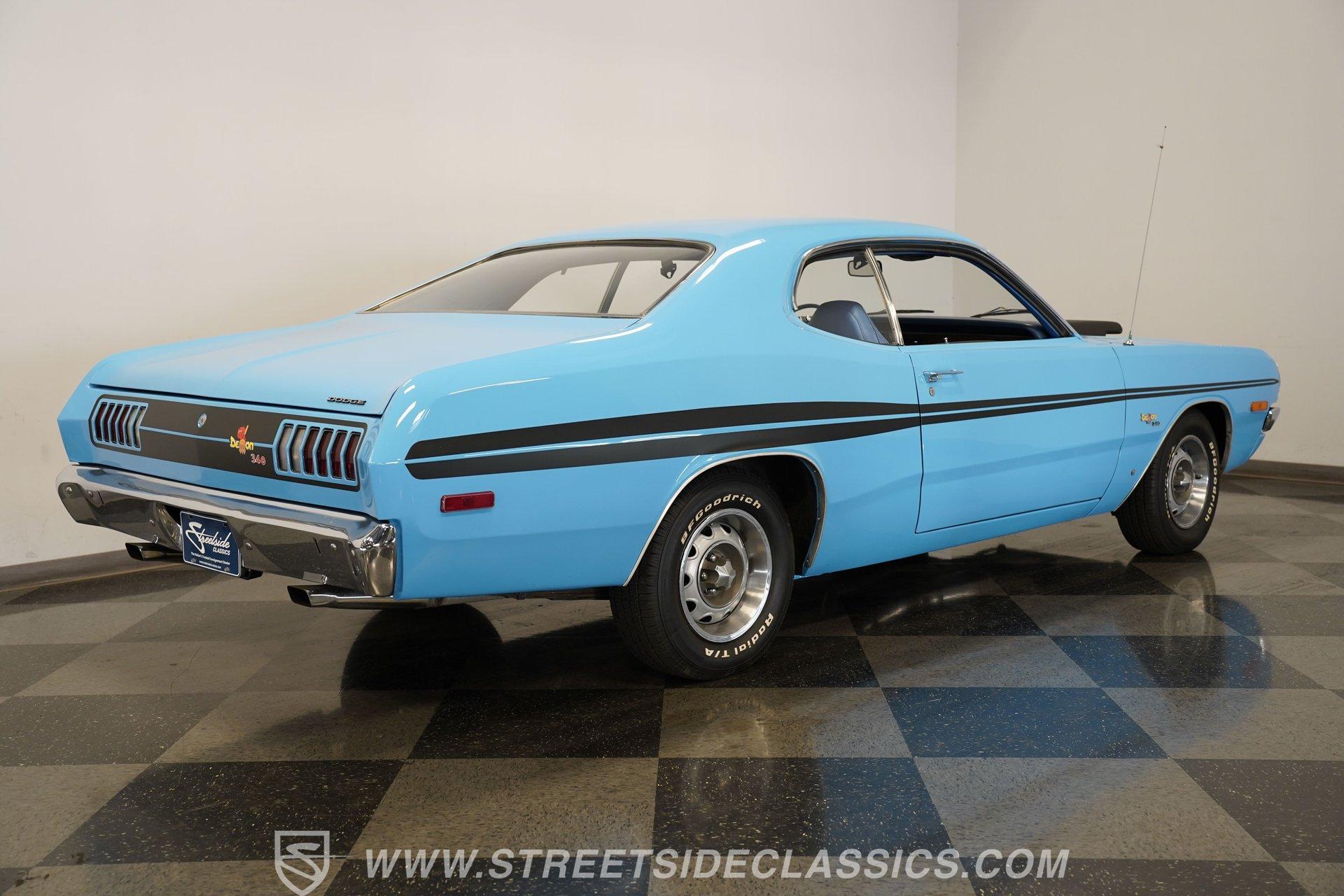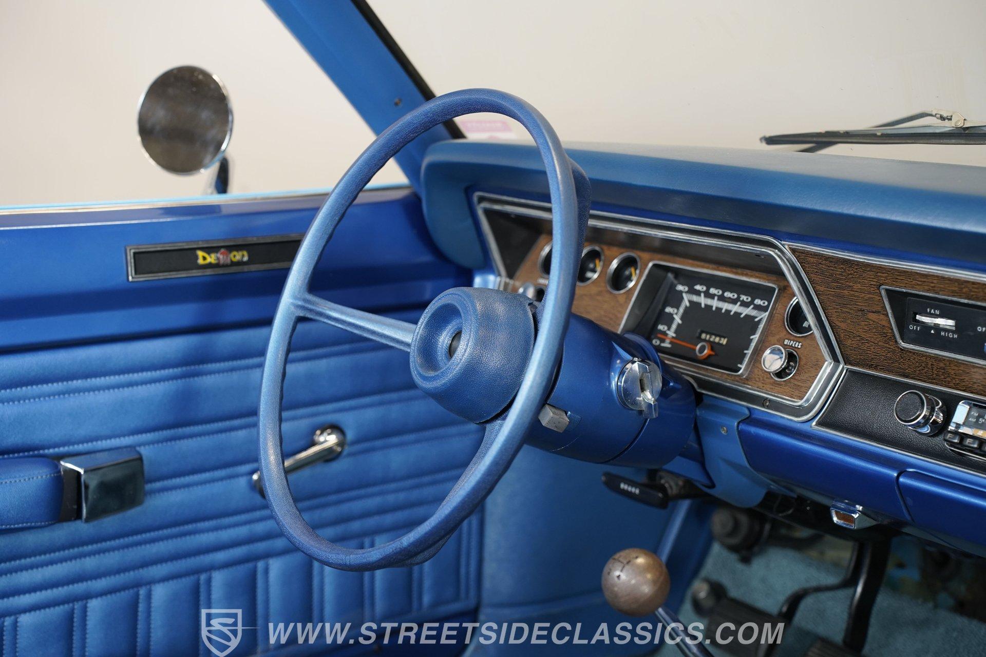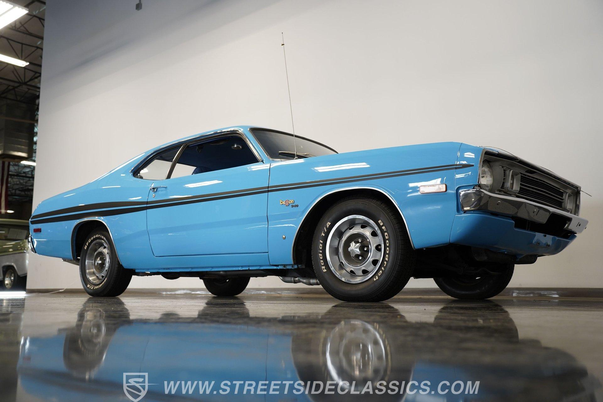 If you've ever wanted to own a true classic car, here's your chance. This 1972 Dodge Dart Demon 340 is an excellent example of a real muscle car. It's in great condition inside and out and has been restored to its original muscle car appearance. The emblems, decals, wheels, and hood are all correct. Both bumpers shine along with all the other shiny accents. Its stance is just the way it's supposed to be, and the blue paint job is an original Dodge color. The hood pins are correct, and the headlights and taillights are clear. This is a great restoration. The interior continues the blue theme. The door panels, front bucket seats, rear seats, and carpet are all in great shape. There's the correct 4-speed shifter in the center of the floor, making this muscle car real fun to drive. The steering wheel, dashboard, gauges, radio, and heat controls have all been restored properly. The gauges are clear and easy to read. The trunk is very clean with plenty of space. This interior has been restored just as nicely as the exterior. There's more blue under the hood, aside from the famous orange air cleaner. The engine bay is clean and looks just the way it should. Between the fenders is what's believed to be a numbers-matching 340 cubic-inch V8. Also believed to be numbers-matching is the 4-speed manual transmission that connects to an 8 ¾ rear axle. The front suspension is simple, equipped with torsion bars and a sway bar attached to a K-frame. The rear suspension is equally straightforward, with leaf springs and shocks. The Dart rides on OEM 14-inch wheels wrapped in 205/70R14 BFG Radial T/A tires. Behind those are drum brakes at all four corners. The Dart also has stock-style dual exhaust with chambered mufflers. Highlights: 340 Cubic-Inch V8 (Believed To Be Numbers-Matching) 4-Speed Transmission (Believed To Be Numbers-Matching) 8-3/4 Rear Axle Front Torsion Bars And A Sway Bar Attached To The K-frame Rear Leaf Springs With Shocks Four Wheel Drum Brakes 14-Inch OEM Wheels 205/70R14 BFG Radial T/A Tires Original Exhaust With Chamber Mufflers Power Steering AM/FM Radio Heat Owner's Manual Here is a beautiful 1972 Dodge Dart Demon 340 that has been restored to its fully classic muscle car potential. It looks great, runs great, and is simply a fun car to drive. The original blue color is eye-catching, and the attention to detail in the restoration is amazing. Call today!