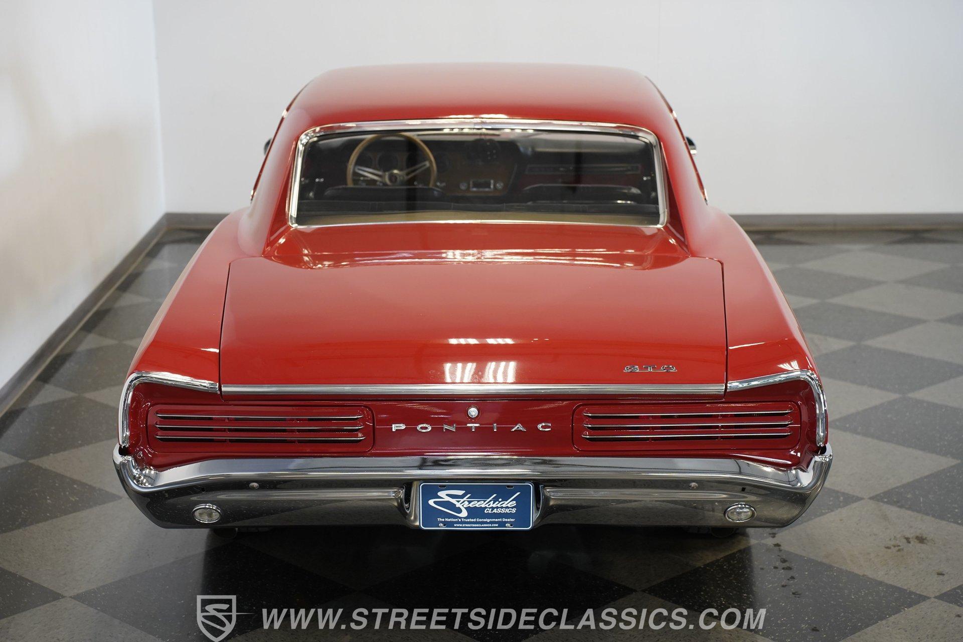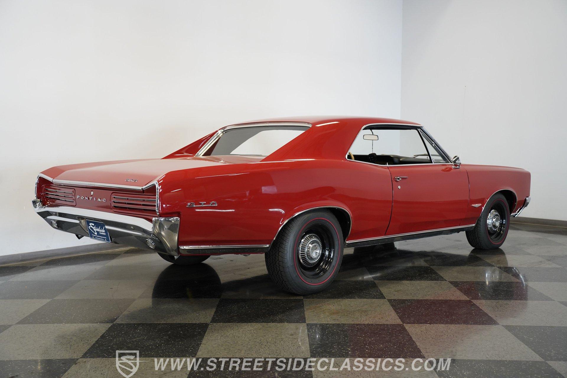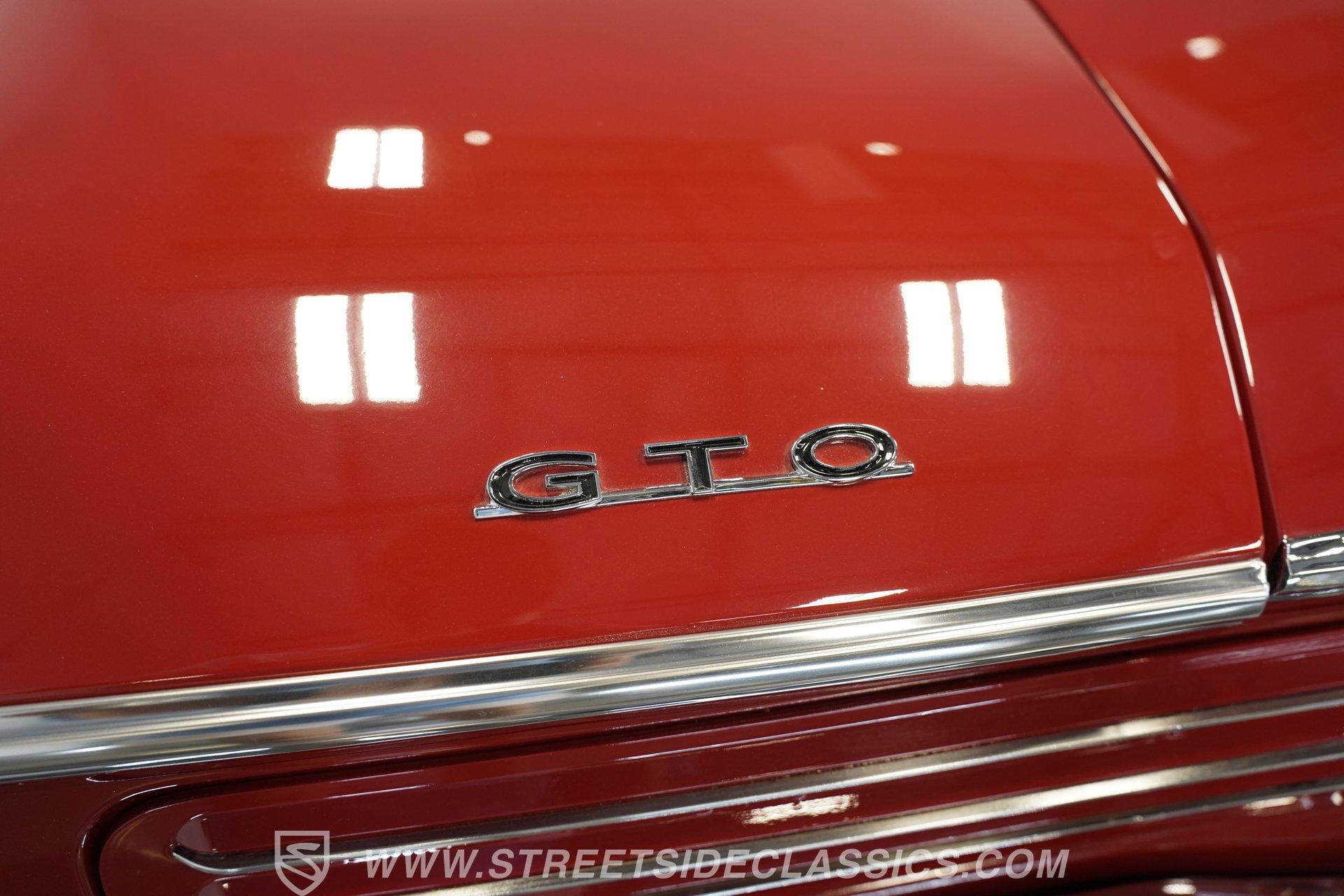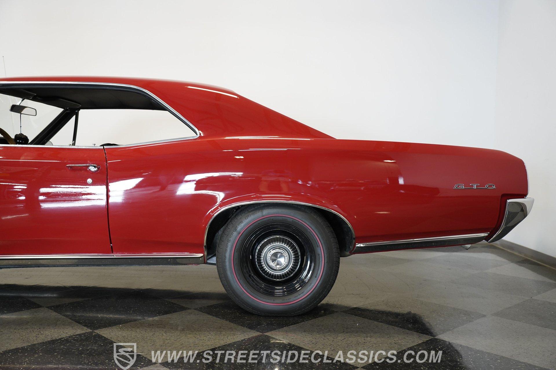 This 1966 Pontiac GTO showcases a Montero Red exterior, highlighting its muscular body. The iconic split grille and stacked headlights define its aggressive front end, while the hardtop profile emphasizes the GTO's sleek lines. Chrome bumpers add a touch of brilliance to both ends, and dual exhaust tips peek out from beneath the rear. Rolling on 15-inch black steel wheels with "dog dish" hubcaps and BF Goodrich radial redline tires staggered 215/70R15 front and 235/70R15 rear, this Pontiac exemplifies classic muscle car design. Black vinyl bucket seats anchor the performance-oriented interior. The factory console houses the shifter for the TH400 4-speed automatic transmission. A modern retro AM/FM/AUX radio provides audio, while under-dash mounted Bosh instrumentation monitors engine vitals. Power steering allows for easy maneuvering, complementing the car's performance setup. A Pontiac 400 cubic inch V8 dominates the engine compartment, topped with an Edelbrock Intake and Edelbrock 4-barrel carburetor. Chrome valve covers and air cleaner add visual appeal to the powerful motor. A set of long-tube headers flow back through a dual exhaust system with rumbling Thrush mufflers producing the signature GTO sound. Power front disc brakes provide confidant stopping power. HIGHLIGHTS: 400 V8 Engine TH400 3-Speed Automatic Transmission Edelbrock 4-Barrel carburetor Edelbrock Intake Manifold Power Front Disc Brakes Steel Wheels with "Dog Dish" Hubcaps 10-Bolt Rear Axle Montero Red Paint Bosh Instrumentation BF Goodrich Radial 15" Redline Tires Chrome Bumpers Wood-Rimed Steering Wheel Black Vinyl Interior Bucket Seats Factory Console Modern Retro AM/FM Radio Power Steering Build Photos Restoration and Maintenance Receipts Owner's Manual This 1966 Pontiac GTO represents the peak of muscle car engineering with its powerful 400 V8, distinctive Montero Red exterior, and driver-focused black interior. Build photos and receipts are included with the car. From the iconic split grille to the rumbling exhaust, this GTO delivers authentic performance. Call today!