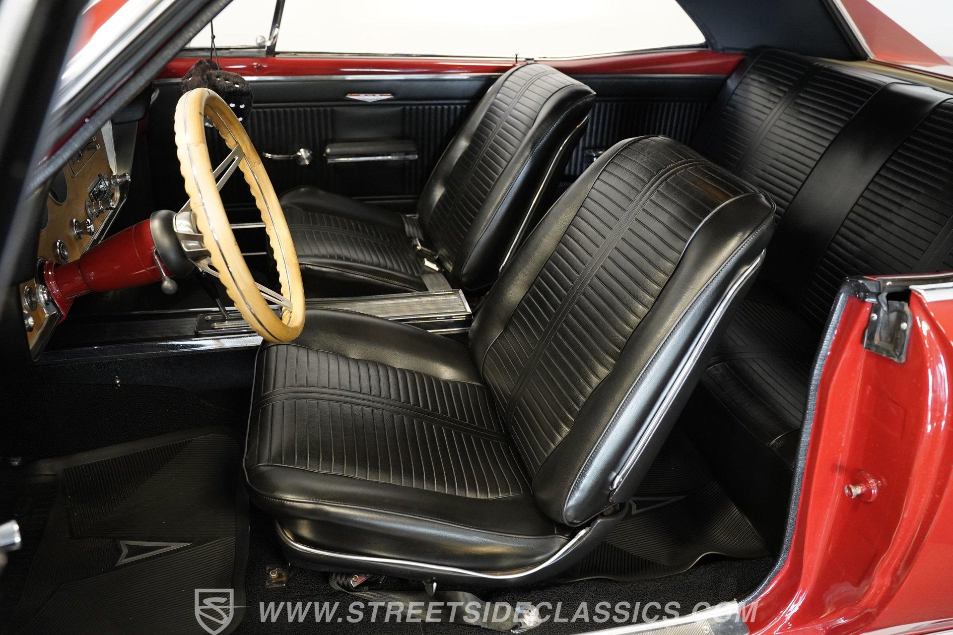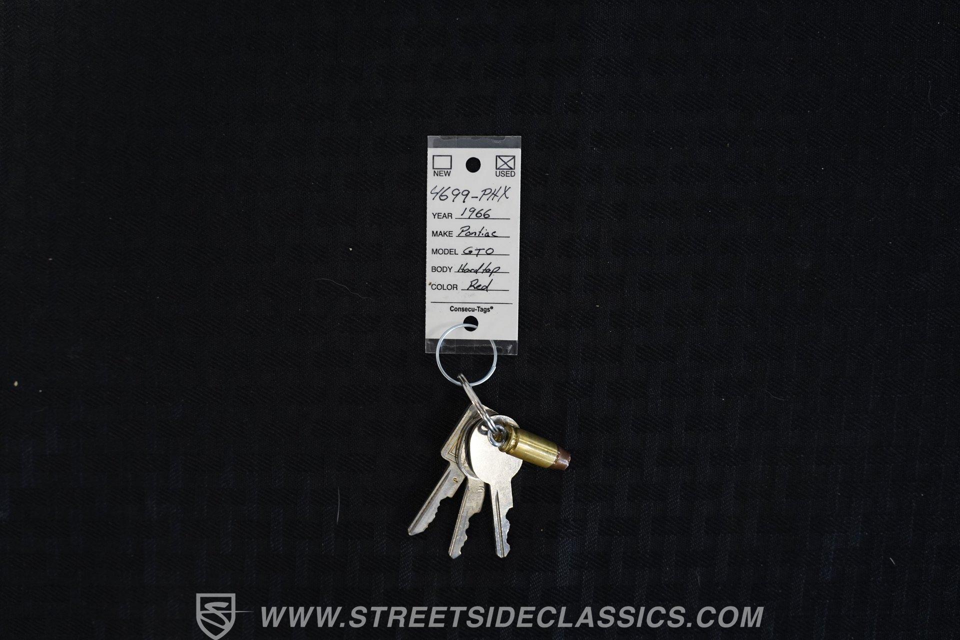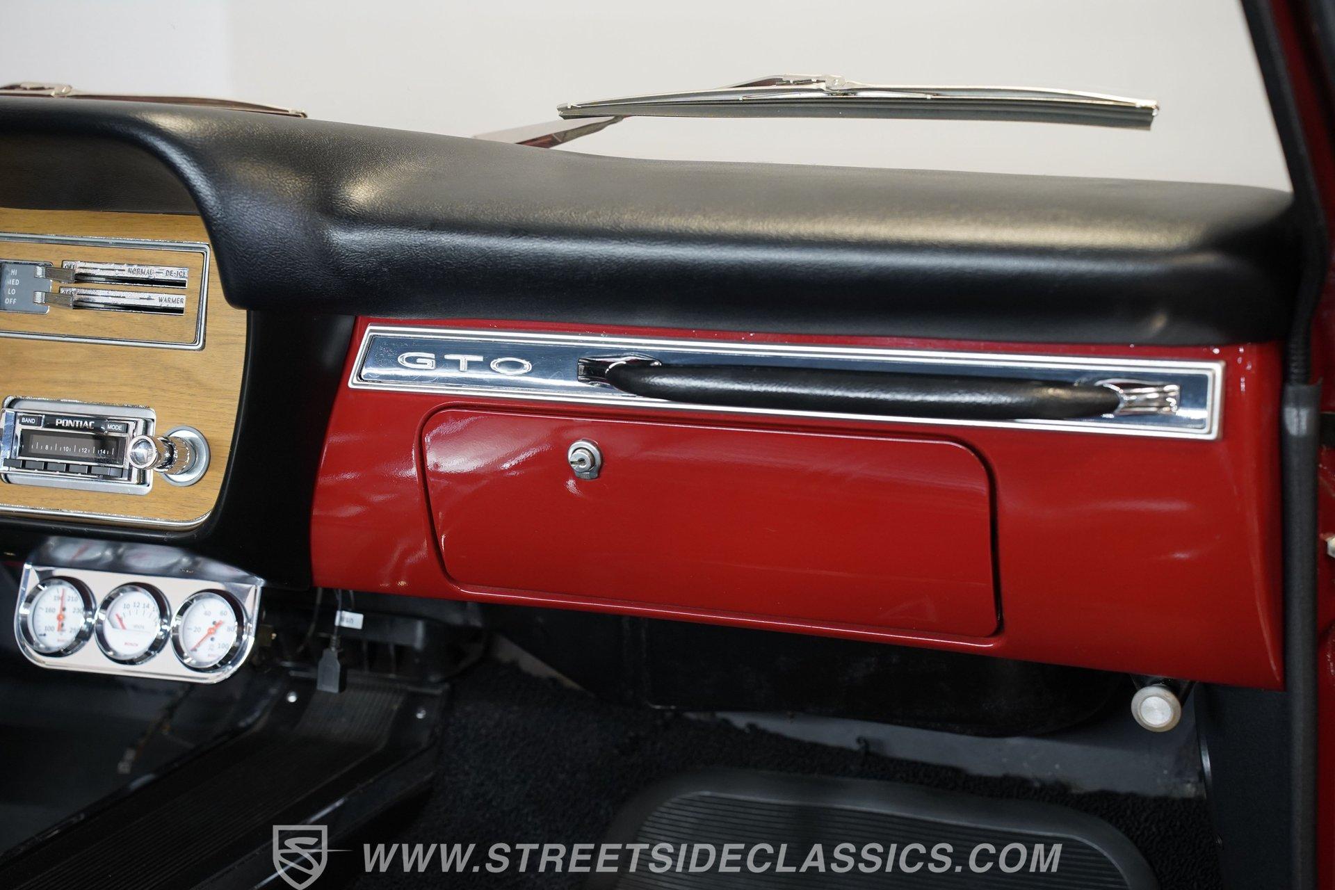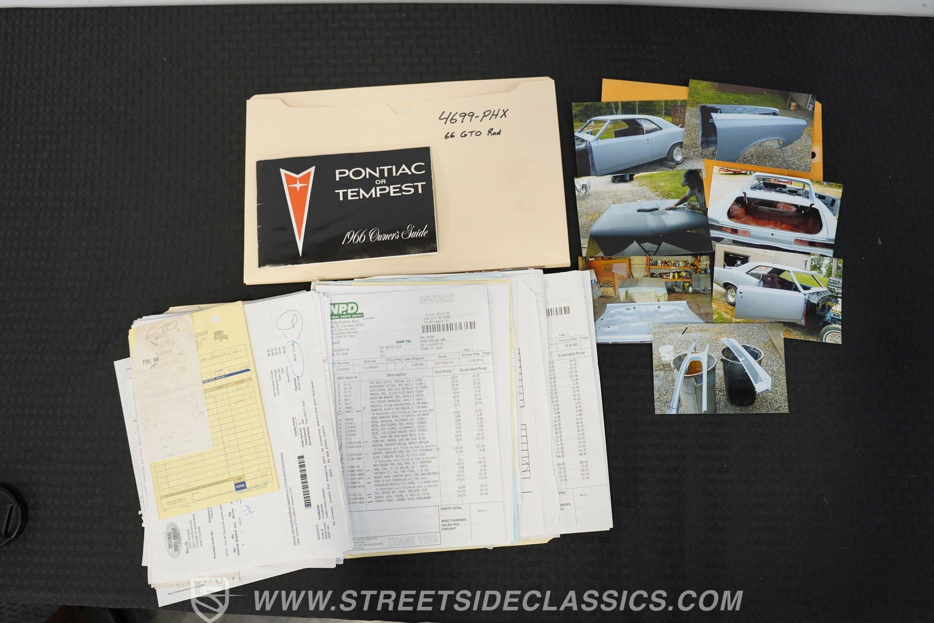 This 1966 Pontiac GTO showcases a Montero Red exterior, highlighting its muscular body. The iconic split grille and stacked headlights define its aggressive front end, while the hardtop profile emphasizes the GTO's sleek lines. Chrome bumpers add a touch of brilliance to both ends, and dual exhaust tips peek out from beneath the rear. Rolling on 15-inch black steel wheels with "dog dish" hubcaps and BF Goodrich radial redline tires staggered 215/70R15 front and 235/70R15 rear, this Pontiac exemplifies classic muscle car design. Black vinyl bucket seats anchor the performance-oriented interior. The factory console houses the shifter for the TH400 4-speed automatic transmission. A modern retro AM/FM/AUX radio provides audio, while under-dash mounted Bosh instrumentation monitors engine vitals. Power steering allows for easy maneuvering, complementing the car's performance setup. A Pontiac 400 cubic inch V8 dominates the engine compartment, topped with an Edelbrock Intake and Edelbrock 4-barrel carburetor. Chrome valve covers and air cleaner add visual appeal to the powerful motor. A set of long-tube headers flow back through a dual exhaust system with rumbling Thrush mufflers producing the signature GTO sound. Power front disc brakes provide confidant stopping power. HIGHLIGHTS: 400 V8 Engine TH400 3-Speed Automatic Transmission Edelbrock 4-Barrel carburetor Edelbrock Intake Manifold Power Front Disc Brakes Steel Wheels with "Dog Dish" Hubcaps 10-Bolt Rear Axle Montero Red Paint Bosh Instrumentation BF Goodrich Radial 15" Redline Tires Chrome Bumpers Wood-Rimed Steering Wheel Black Vinyl Interior Bucket Seats Factory Console Modern Retro AM/FM Radio Power Steering Build Photos Restoration and Maintenance Receipts Owner's Manual This 1966 Pontiac GTO represents the peak of muscle car engineering with its powerful 400 V8, distinctive Montero Red exterior, and driver-focused black interior. Build photos and receipts are included with the car. From the iconic split grille to the rumbling exhaust, this GTO delivers authentic performance. Call today!