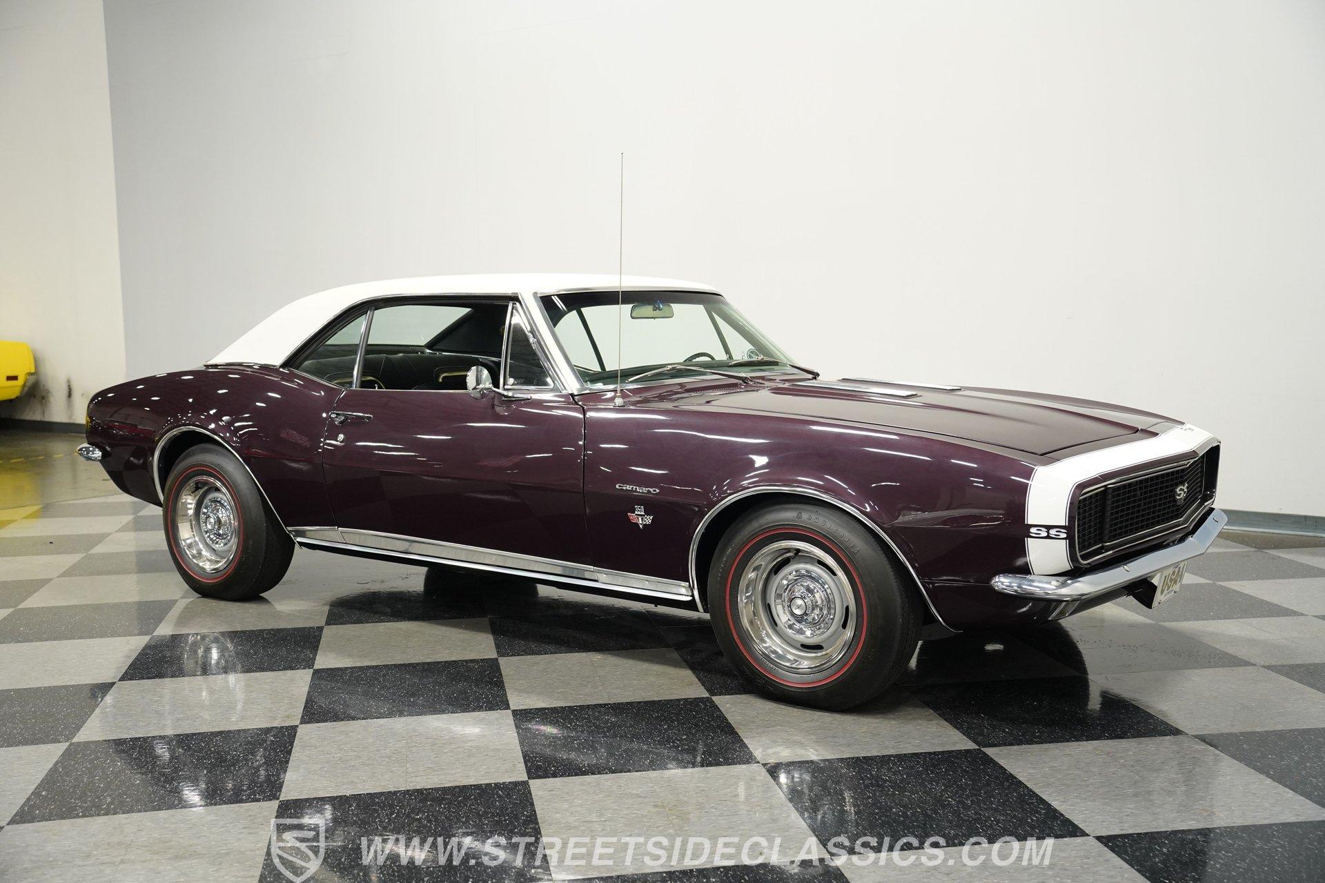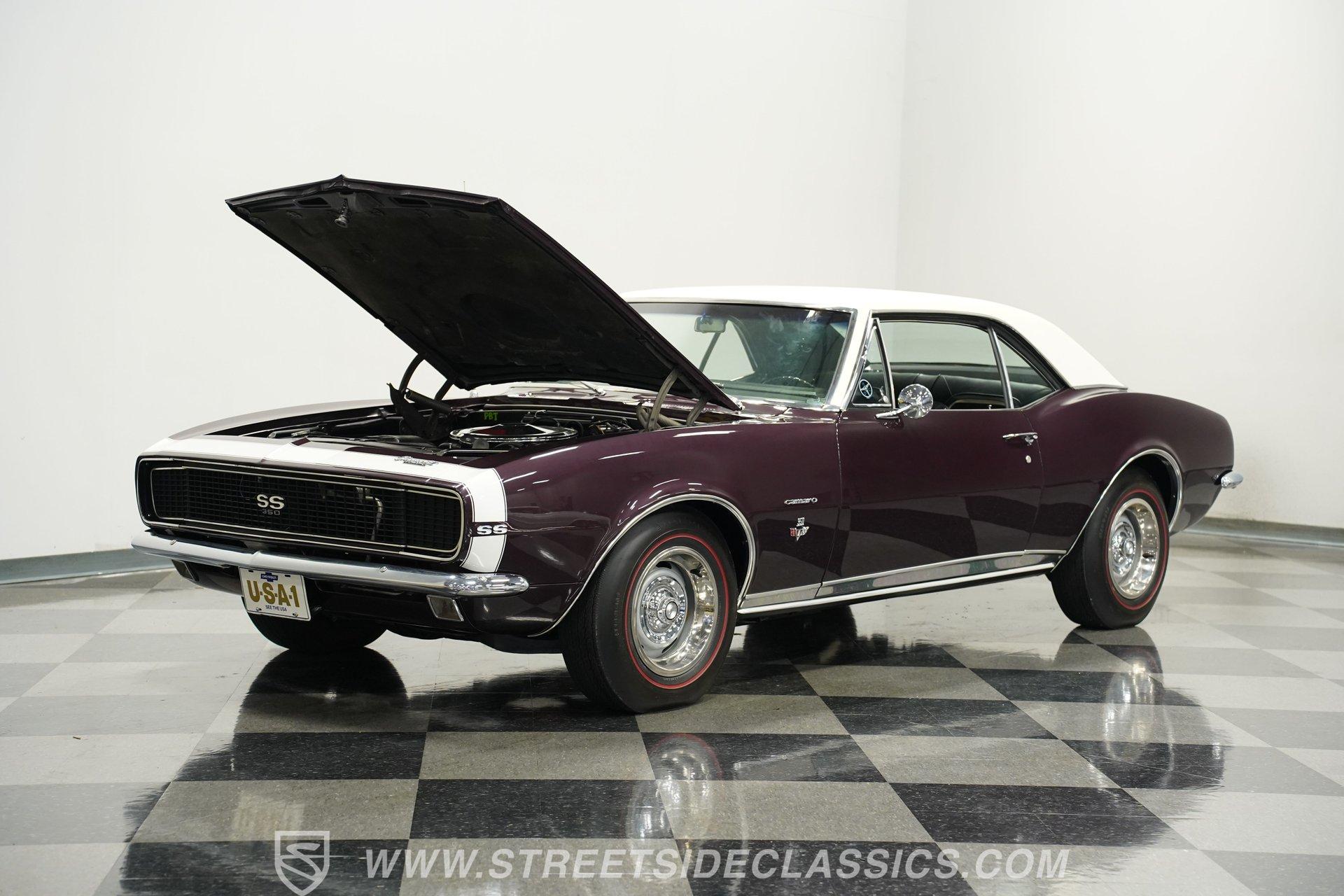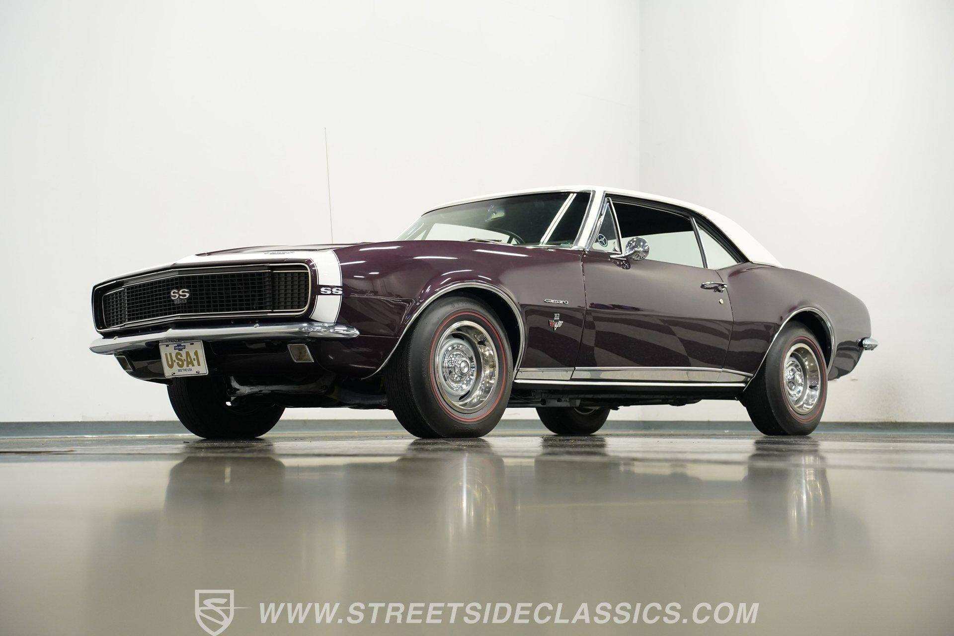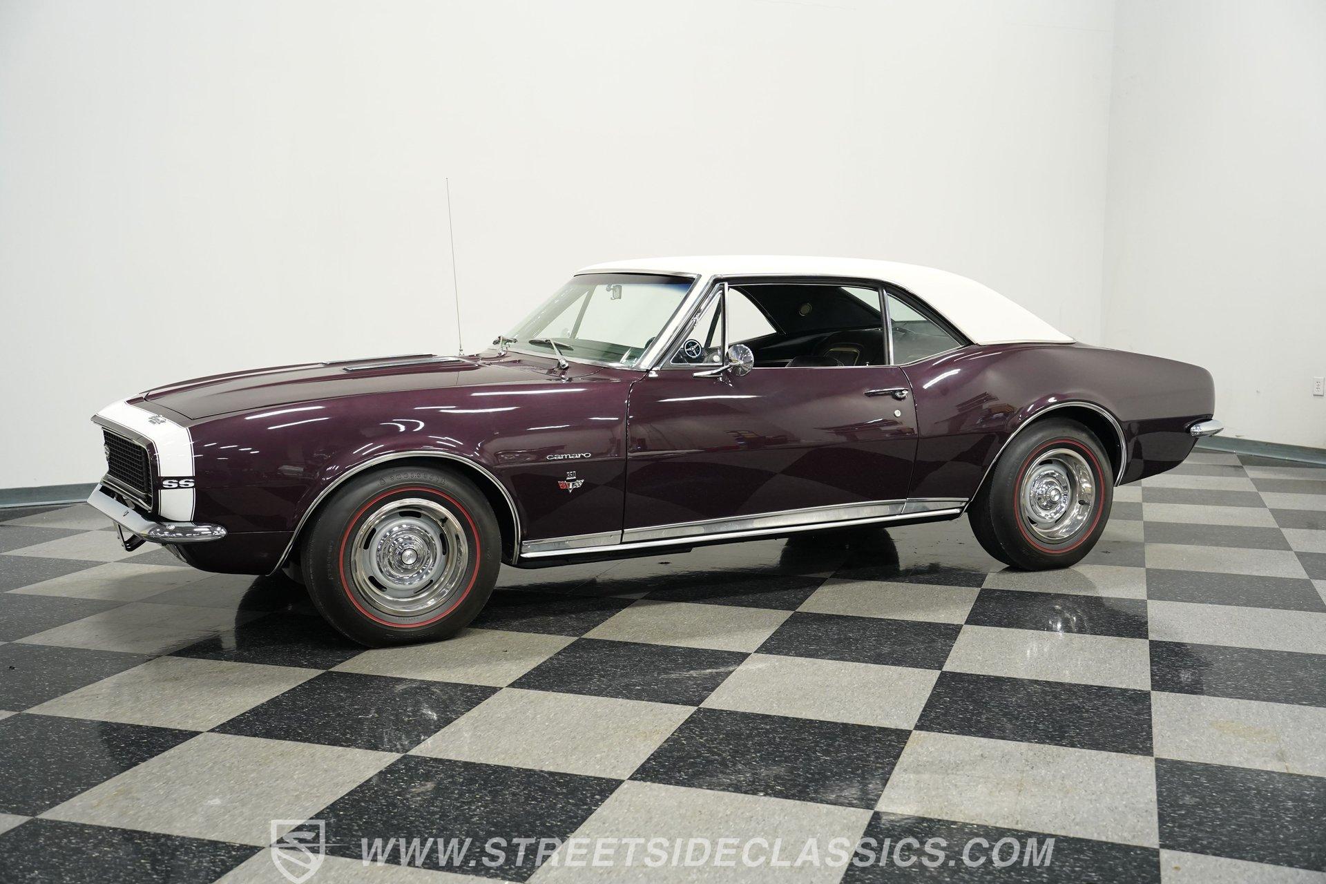 Not all that many classic Camaros rolled off the assembly line bearing the dual distinctions worn by this 1967 Chevrolet Camaro RS/SS 350, and most of them have long since fallen by the wayside. And, not only does this vintage Chevy combine the hidden headlights, a special front grille, and other appearance upgrades with enhanced power and a more action-oriented suspension that come via its elevated status, but it also features a level of factory-correctness that's truly hard to come by. As if this didn't set it apart enough, its Royal Plum paint represents an original Chevy color offering that was only available the year it rolled out, so this is one singular ride we have right here. It arrives at the present looking thoroughly refreshed, with its paint holding a deep shine, accented by razor-sharp accent stripes and vibrant bright work, with a contrasting white vinyl top that's in matching condition. The interior has undergone a full restoration while keeping its factory configuration well intact, with black, vinyl-clad front bucket seats that are in impressive shape, wearing white accenting stripes that still look as fresh as they did when the covers were first installed. The buckets straddle a very clean center console that features a T-handle shifter and the trio of gauges that came to be a coveted factory design element when this Camaro first rolled out. The overall functionality inside the doors is impressive. The instrument gauges work as intended, the interior lighting illuminates on cue, and the windows roll up and down without incident. As you raise the hood, don't let the stock configuration of the engine compartment lead you to the conclusion that this Chevy hasn't seen the attention needed to keep it running in top mechanical form. Its 350-cubic-inch V8 is fed by a 4-barrel Quadrajet carburetor and is running smooth and strong, sending a nice, rich note out of the dual exhaust and combining with a 2-speed automatic Powerglide transmission to provide an outstanding experience behind the wheel. Power steering makes this vintage muscle car easy to maneuver, and the upgraded suspension that comes via its elevated Super Sport status yields strong cornering ability. HIGHLIGHTS A RARE COMBO OF THE RS APPEARANCE AND SS PERFORMANCE PACKAGES ORIGINAL 350-CUBIC-INCH V8 4-BARREL QUADRAJET CARBURETOR 2-SPEED AUTOMATIC POWERGLIDE TRANSMISSION DUAL EXHAUST POWER STEERING FACTORY-CORRECT ROYAL PLUM EXTERIOR WITH WHITE ACCENT STRIPES WHITE VINYL TOP FACTORY-CORRECT BLACK VINYL UPHOLSTER BUCKET SEATS CENTER CONSOLE OWNER'S MANUAL AND REPRODUCTION WINDOW STICKER INCLUDED Cruising on a set of 14" factory wheels with dog dish hub caps, this 1967 Chevrolet Camaro RS/SS 350 would be a great fit for the collector who is looking for an exceedingly high level of factory originality but doesn't want to sacrifice drivability in the process. Call today!