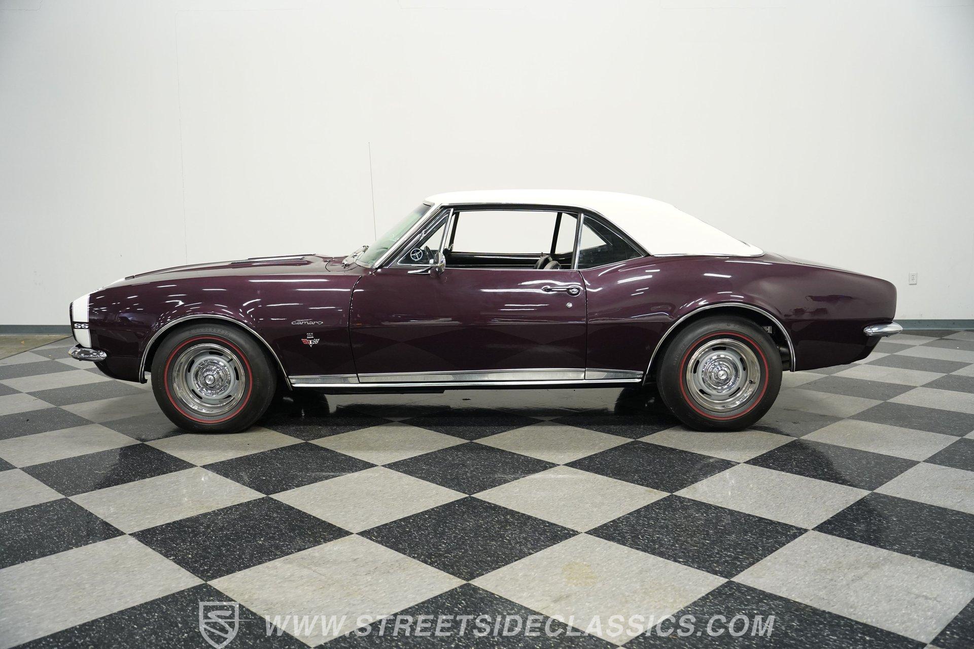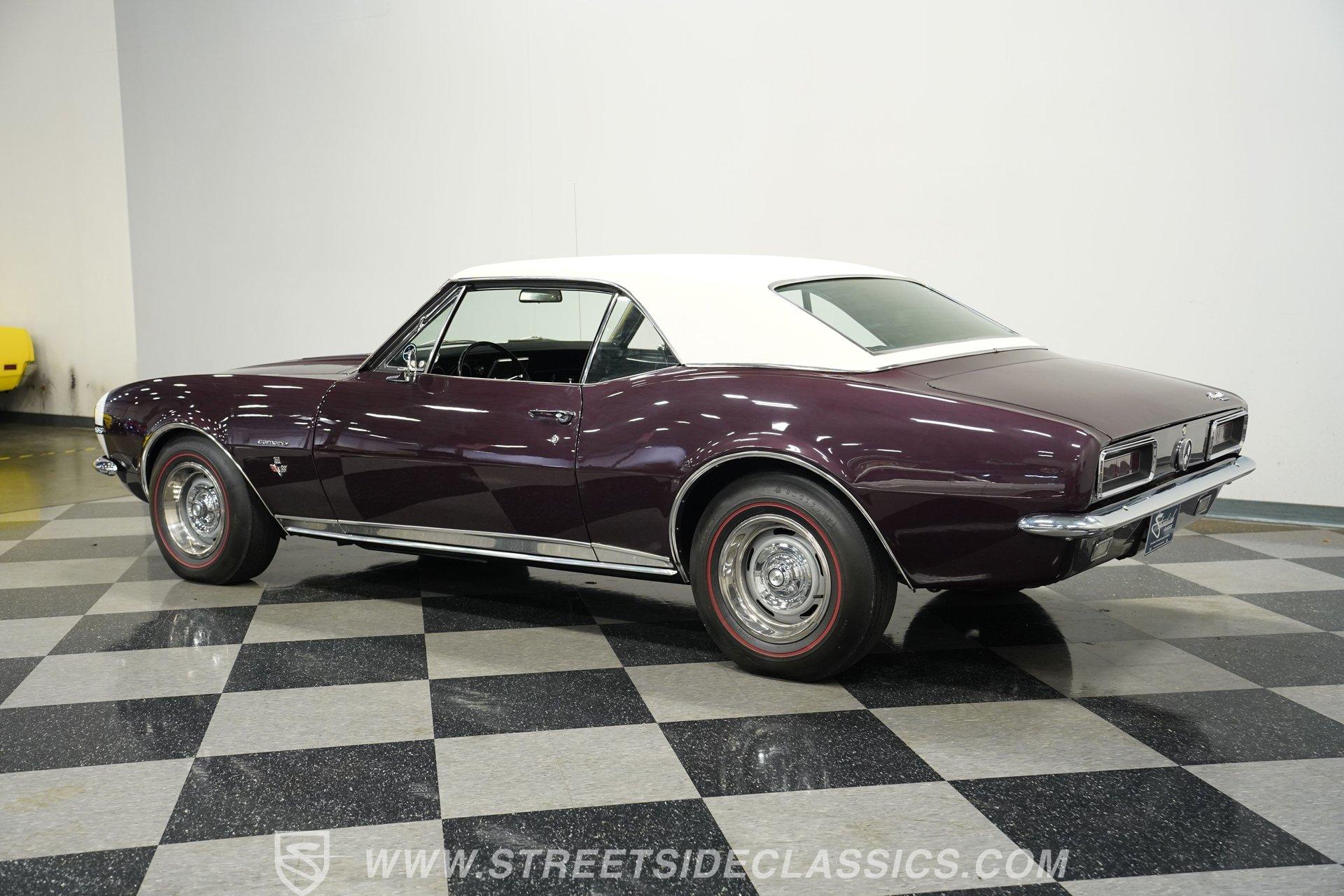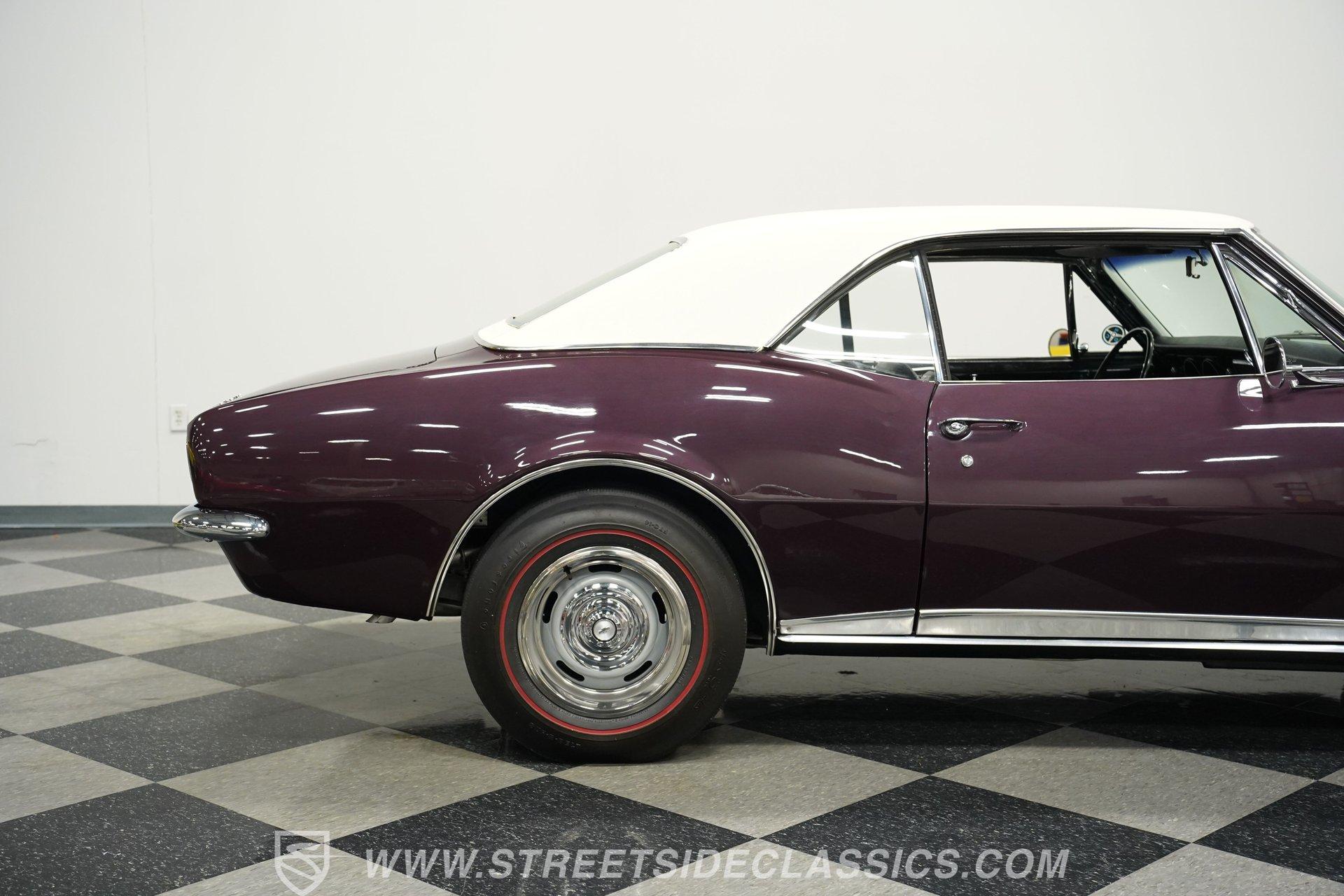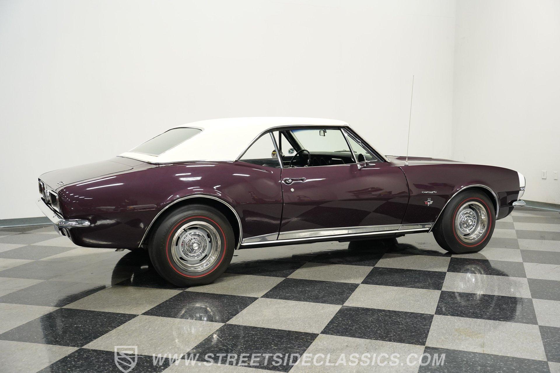 Not all that many classic Camaros rolled off the assembly line bearing the dual distinctions worn by this 1967 Chevrolet Camaro RS/SS 350, and most of them have long since fallen by the wayside. And, not only does this vintage Chevy combine the hidden headlights, a special front grille, and other appearance upgrades with enhanced power and a more action-oriented suspension that come via its elevated status, but it also features a level of factory-correctness that's truly hard to come by. As if this didn't set it apart enough, its Royal Plum paint represents an original Chevy color offering that was only available the year it rolled out, so this is one singular ride we have right here. It arrives at the present looking thoroughly refreshed, with its paint holding a deep shine, accented by razor-sharp accent stripes and vibrant bright work, with a contrasting white vinyl top that's in matching condition. The interior has undergone a full restoration while keeping its factory configuration well intact, with black, vinyl-clad front bucket seats that are in impressive shape, wearing white accenting stripes that still look as fresh as they did when the covers were first installed. The buckets straddle a very clean center console that features a T-handle shifter and the trio of gauges that came to be a coveted factory design element when this Camaro first rolled out. The overall functionality inside the doors is impressive. The instrument gauges work as intended, the interior lighting illuminates on cue, and the windows roll up and down without incident. As you raise the hood, don't let the stock configuration of the engine compartment lead you to the conclusion that this Chevy hasn't seen the attention needed to keep it running in top mechanical form. Its 350-cubic-inch V8 is fed by a 4-barrel Quadrajet carburetor and is running smooth and strong, sending a nice, rich note out of the dual exhaust and combining with a 2-speed automatic Powerglide transmission to provide an outstanding experience behind the wheel. Power steering makes this vintage muscle car easy to maneuver, and the upgraded suspension that comes via its elevated Super Sport status yields strong cornering ability. HIGHLIGHTS A RARE COMBO OF THE RS APPEARANCE AND SS PERFORMANCE PACKAGES ORIGINAL 350-CUBIC-INCH V8 4-BARREL QUADRAJET CARBURETOR 2-SPEED AUTOMATIC POWERGLIDE TRANSMISSION DUAL EXHAUST POWER STEERING FACTORY-CORRECT ROYAL PLUM EXTERIOR WITH WHITE ACCENT STRIPES WHITE VINYL TOP FACTORY-CORRECT BLACK VINYL UPHOLSTER BUCKET SEATS CENTER CONSOLE OWNER'S MANUAL AND REPRODUCTION WINDOW STICKER INCLUDED Cruising on a set of 14" factory wheels with dog dish hub caps, this 1967 Chevrolet Camaro RS/SS 350 would be a great fit for the collector who is looking for an exceedingly high level of factory originality but doesn't want to sacrifice drivability in the process. Call today!