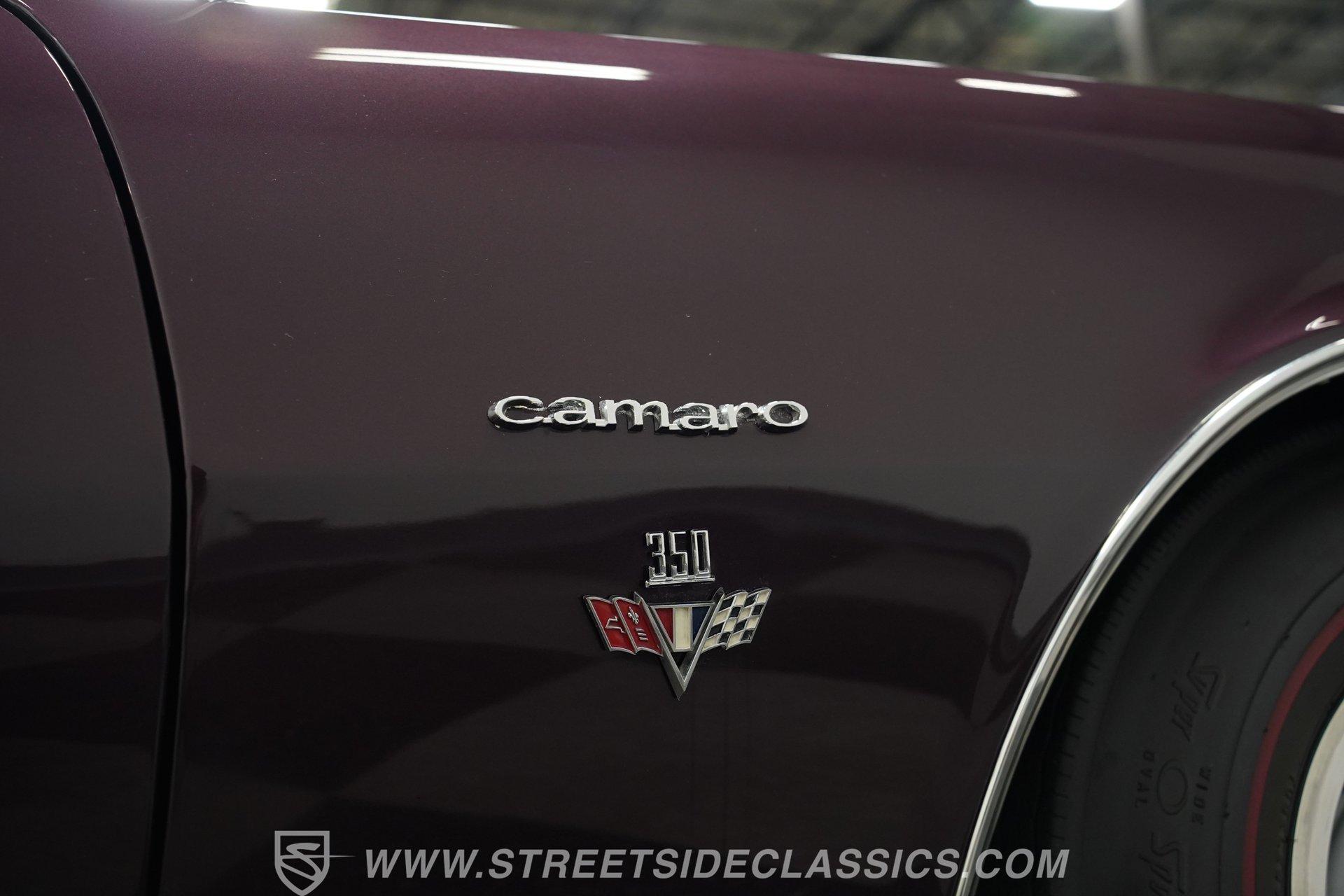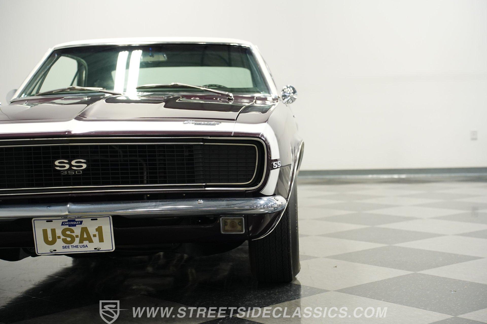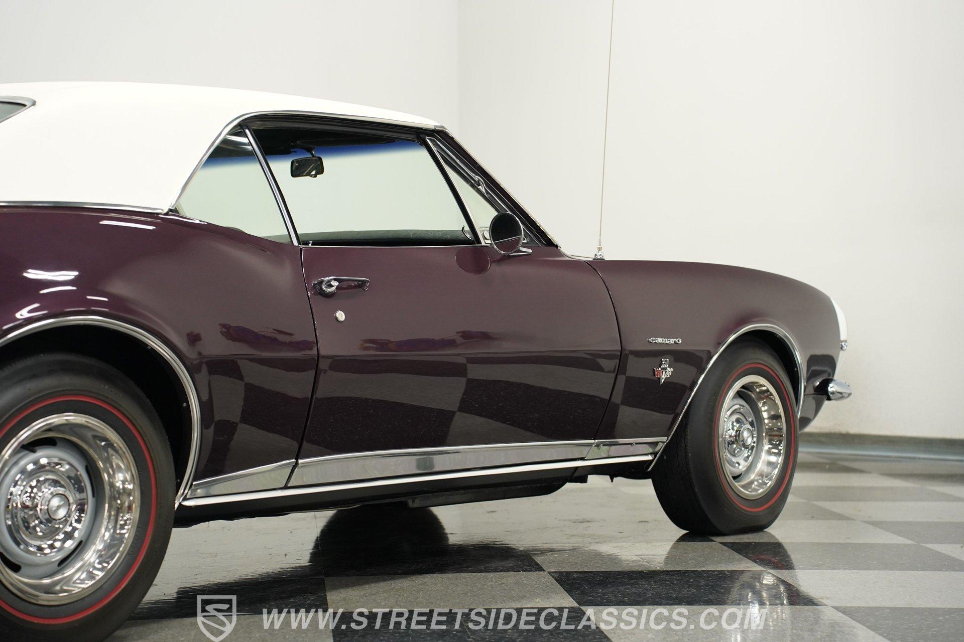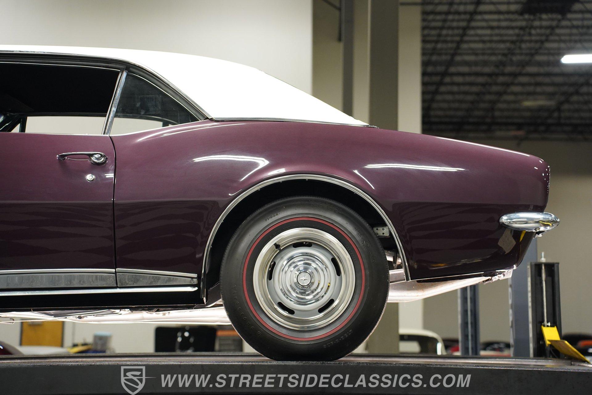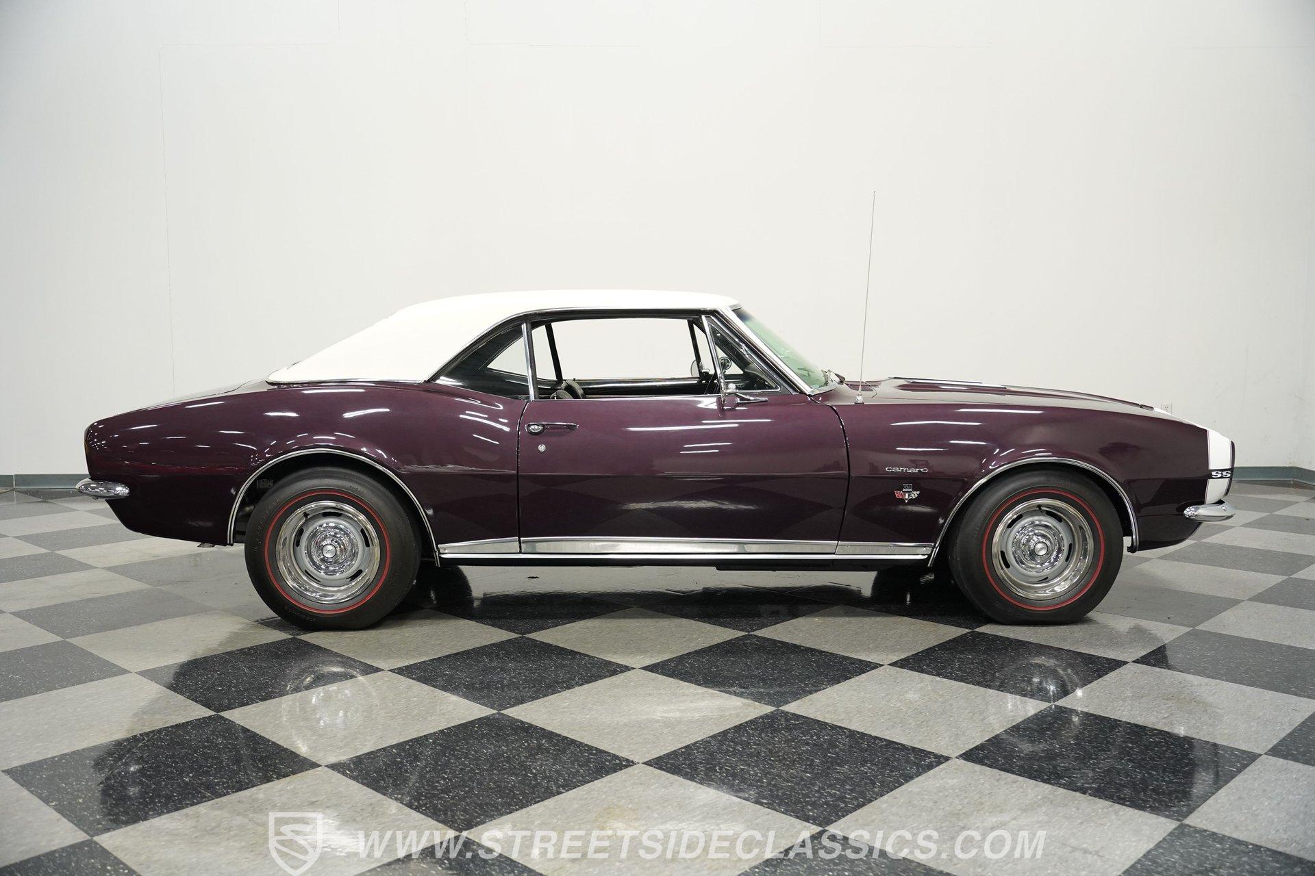 Not all that many classic Camaros rolled off the assembly line bearing the dual distinctions worn by this 1967 Chevrolet Camaro RS/SS 350, and most of them have long since fallen by the wayside. And, not only does this vintage Chevy combine the hidden headlights, a special front grille, and other appearance upgrades with enhanced power and a more action-oriented suspension that come via its elevated status, but it also features a level of factory-correctness that's truly hard to come by. As if this didn't set it apart enough, its Royal Plum paint represents an original Chevy color offering that was only available the year it rolled out, so this is one singular ride we have right here. It arrives at the present looking thoroughly refreshed, with its paint holding a deep shine, accented by razor-sharp accent stripes and vibrant bright work, with a contrasting white vinyl top that's in matching condition. The interior has undergone a full restoration while keeping its factory configuration well intact, with black, vinyl-clad front bucket seats that are in impressive shape, wearing white accenting stripes that still look as fresh as they did when the covers were first installed. The buckets straddle a very clean center console that features a T-handle shifter and the trio of gauges that came to be a coveted factory design element when this Camaro first rolled out. The overall functionality inside the doors is impressive. The instrument gauges work as intended, the interior lighting illuminates on cue, and the windows roll up and down without incident. As you raise the hood, don't let the stock configuration of the engine compartment lead you to the conclusion that this Chevy hasn't seen the attention needed to keep it running in top mechanical form. Its 350-cubic-inch V8 is fed by a 4-barrel Quadrajet carburetor and is running smooth and strong, sending a nice, rich note out of the dual exhaust and combining with a 2-speed automatic Powerglide transmission to provide an outstanding experience behind the wheel. Power steering makes this vintage muscle car easy to maneuver, and the upgraded suspension that comes via its elevated Super Sport status yields strong cornering ability. HIGHLIGHTS A RARE COMBO OF THE RS APPEARANCE AND SS PERFORMANCE PACKAGES ORIGINAL 350-CUBIC-INCH V8 4-BARREL QUADRAJET CARBURETOR 2-SPEED AUTOMATIC POWERGLIDE TRANSMISSION DUAL EXHAUST POWER STEERING FACTORY-CORRECT ROYAL PLUM EXTERIOR WITH WHITE ACCENT STRIPES WHITE VINYL TOP FACTORY-CORRECT BLACK VINYL UPHOLSTER BUCKET SEATS CENTER CONSOLE OWNER'S MANUAL AND REPRODUCTION WINDOW STICKER INCLUDED Cruising on a set of 14" factory wheels with dog dish hub caps, this 1967 Chevrolet Camaro RS/SS 350 would be a great fit for the collector who is looking for an exceedingly high level of factory originality but doesn't want to sacrifice drivability in the process. Call today!