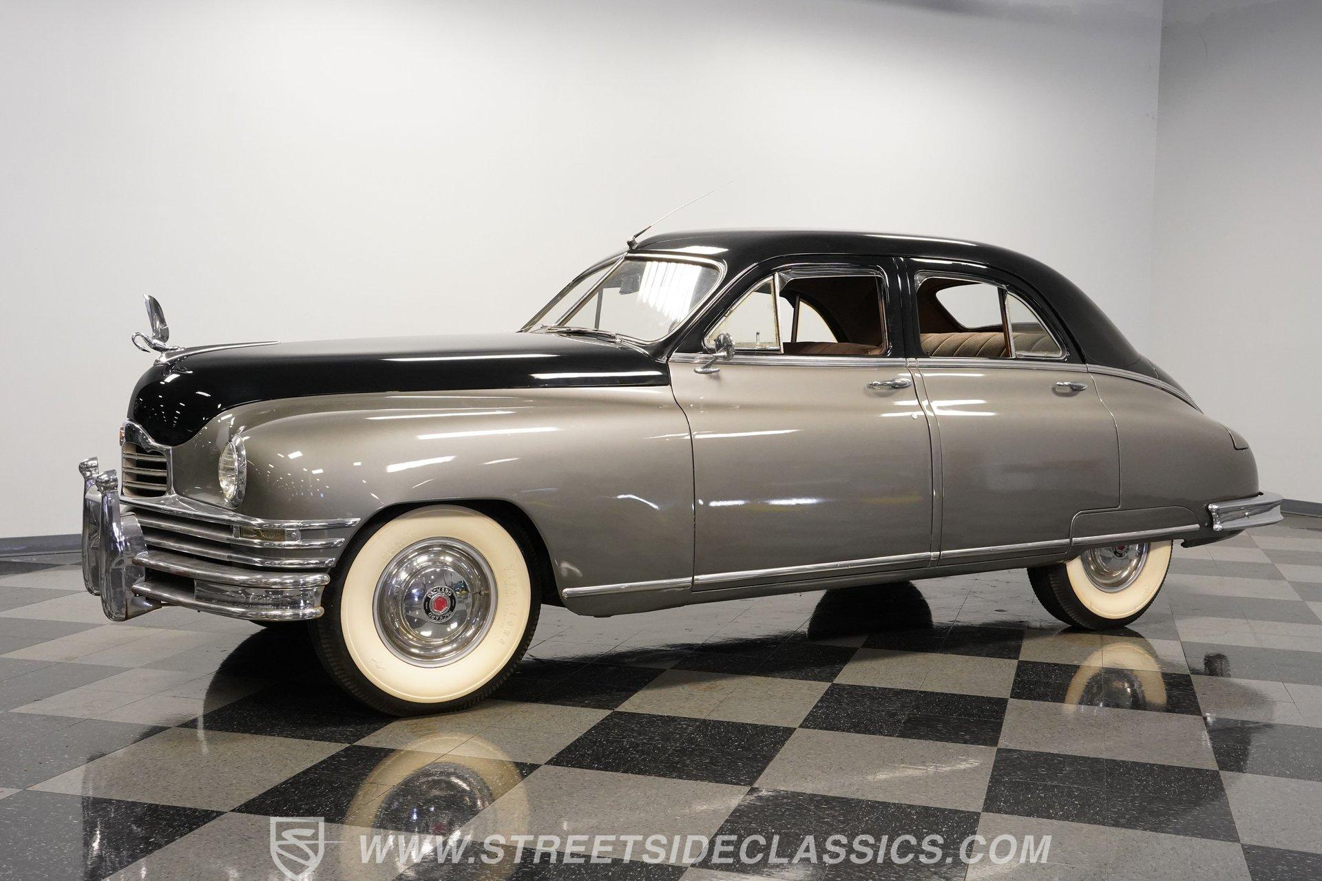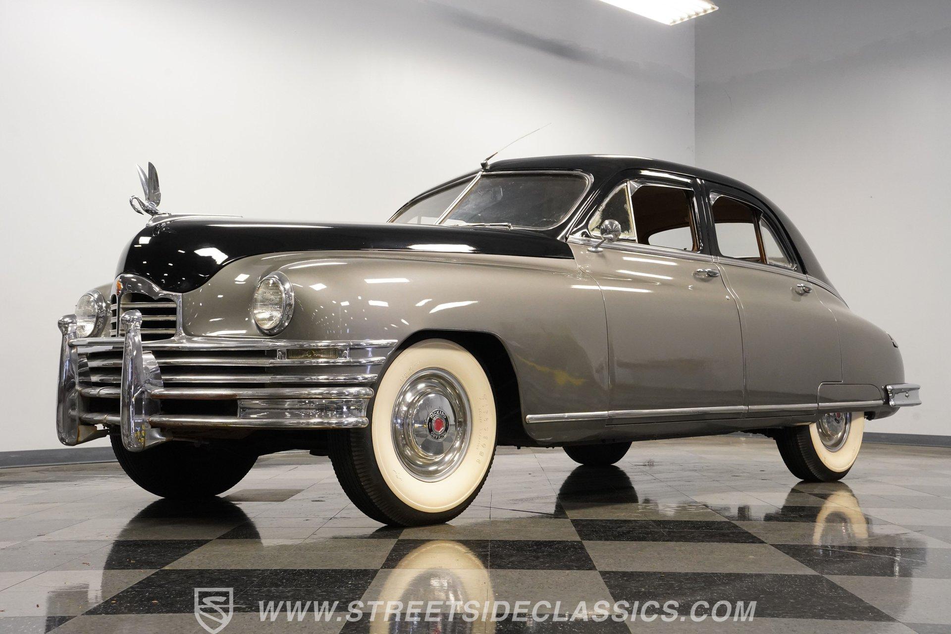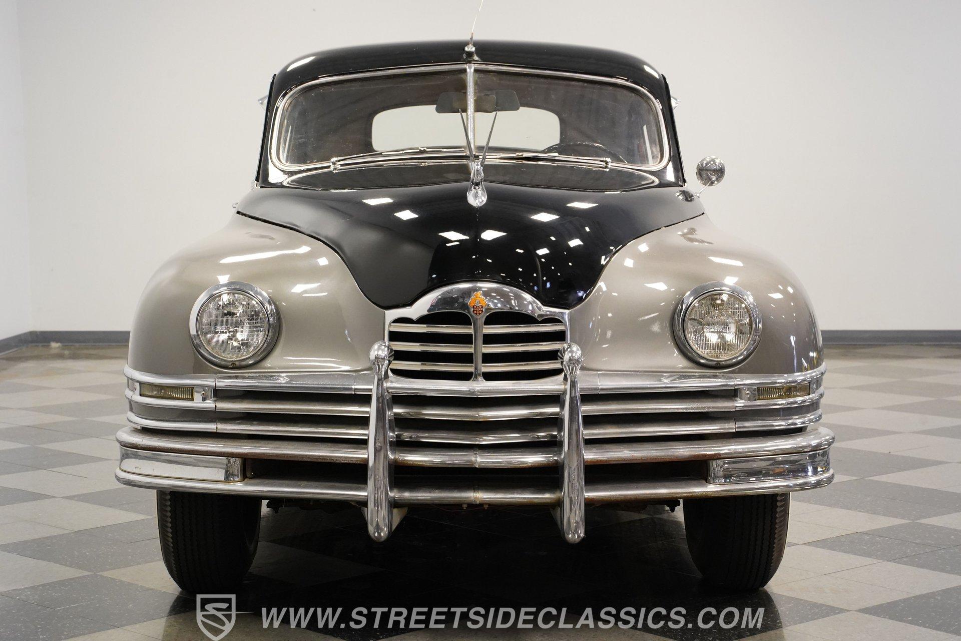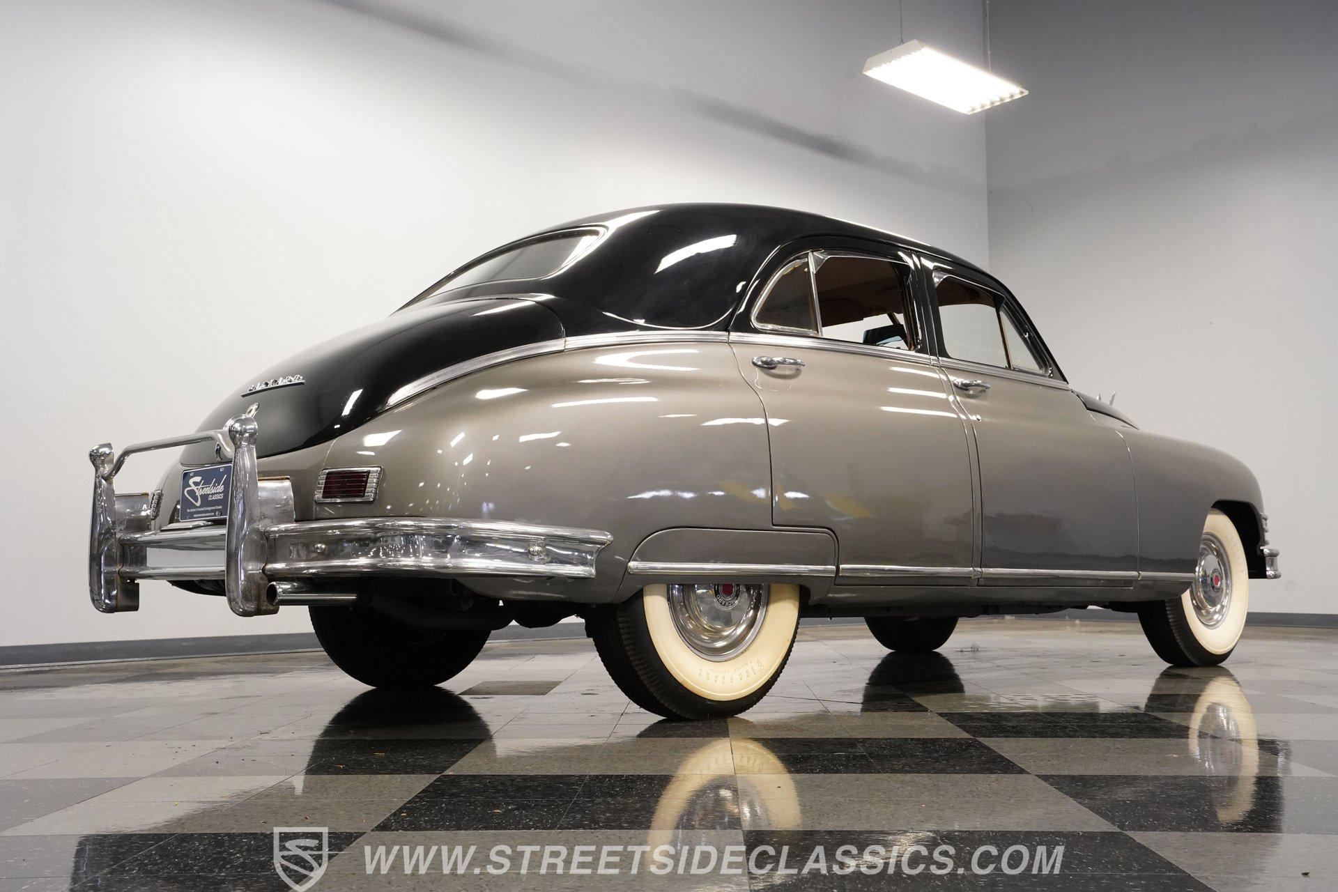 With its two-tone silver and black paint and attention-commanding presence, this 1949 Packard Standard 8 is an effortlessly cool classic. A closer inspection will reveal that it bears little resemblance to virtually any other car from its era. As the 1940's arrived, Packard had already started a trend of minimizing the once-prominent rear fenders on its offerings to give them a more streamlined appearance, and by the time this sedan rolled out, they were literally gone altogether. Even now, more than 75 years after it first rolled off the assembly line, it looks downright futuristic in many respects and has come through the years in strong fashion. That paint scheme highlights its distinctive lines to perfection, and this Packard is still structurally sound and showing nice, even body panel gaps from front to back. The interior underwent a restoration a while back and remains in very good condition, with bench seating in both front and back that shows only minor wear and sits over an expanse of carpeting that fits nicely. The dash area has been kept in its original configuration and features wood trim that was once a hallmark of automotive styling. While it could use a little refinishing to regain top form, it's totally intact and encircles an instrument panel that sports clear, easily readable gauges. This is a spacious, driving environment, with plenty of shoulder and leg room and well-padded seating accommodations, so you can be sure that your passengers will ride in plenty of comfort. The running condition of this great-looking classic will likely come as a welcome surprise. Its factory-correct 288-cubic-inch inline V8 is in fine form, starting up promptly and pulling smoothly as it pairs with a 3-speed manual transmission that runs through its gears with no issues at all via a column-mounted shifter. While the engine compartment could use a steam cleaning to be at its best, all the factory components appear to be in good shape. And, owing largely to this Packard's substantial wheelbase, its ride quality is downright impressive. It feels like you're floating down the asphalt, making it perfectly suited for leisurely weekend excursions. HIGHLIGHTS 288-CUBIC-INCH INLINE 8 CYLINDER ENGINE 2-BARREL CARBURETOR 3-SPEED MANUAL TRANSMISSION FACTORY-CORRECT DRUM BRAKES FACTORY-CORRECT MANUAL STEERING COLUMN SHIFTER 15" FACTORY WHEELS WITH WHITEWALL TIRES CLASSIC TWO-TONE, SILVER AND BLACK EXTERIOR TAN CLOTH INTERIOR BENCH SEATING OWNER'S MANUAL INCLUDED Sporting an unabashedly opulent look and a confidence-inspiring running condition, this 1949 Packard Standard 8 cruises on a set of factory-correct 15" wheels wrapped with whitewall tires and would be a perfect match for the collector who appreciates its substantial significance in the evolution of automotive styling. Call today!