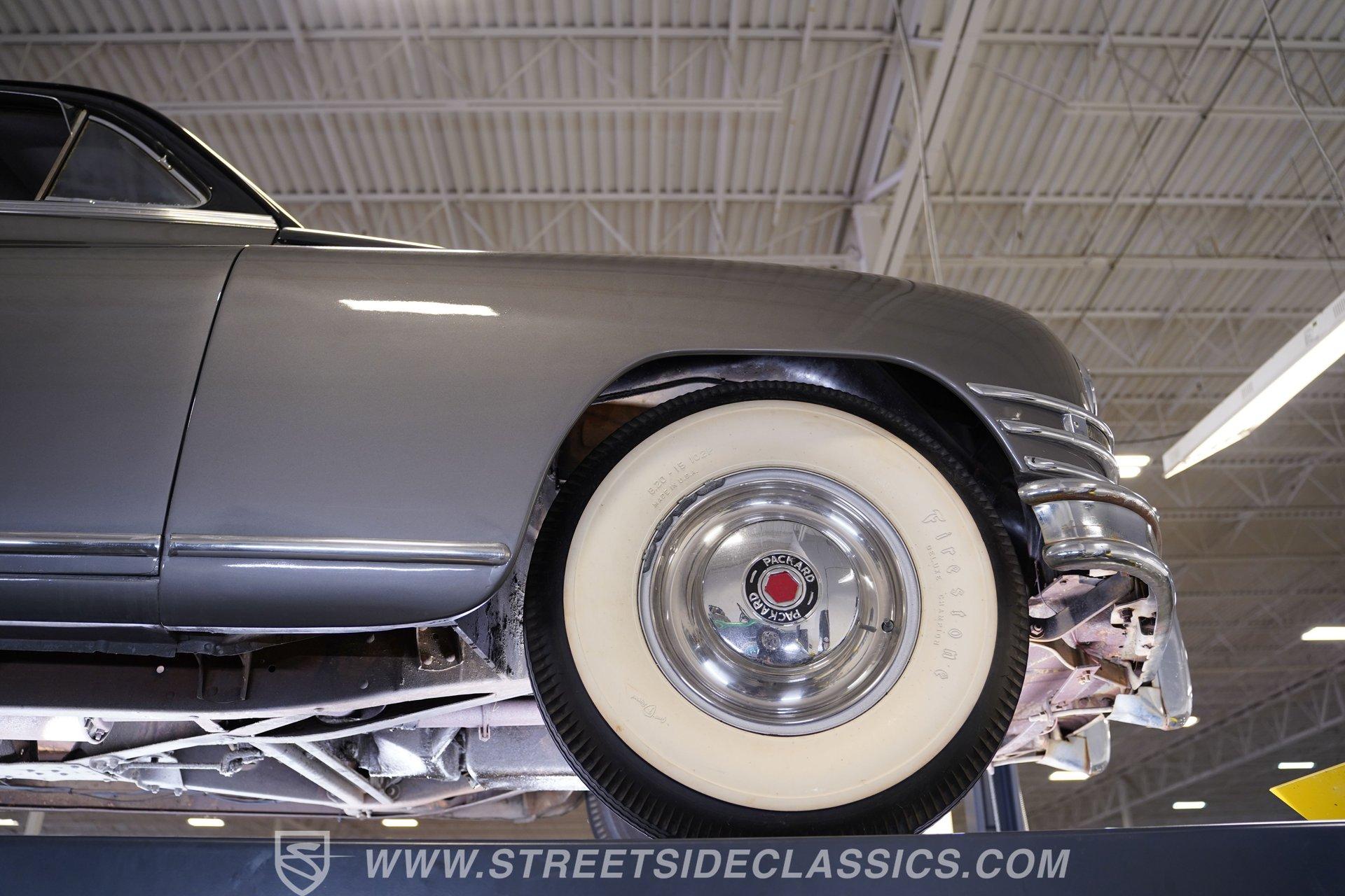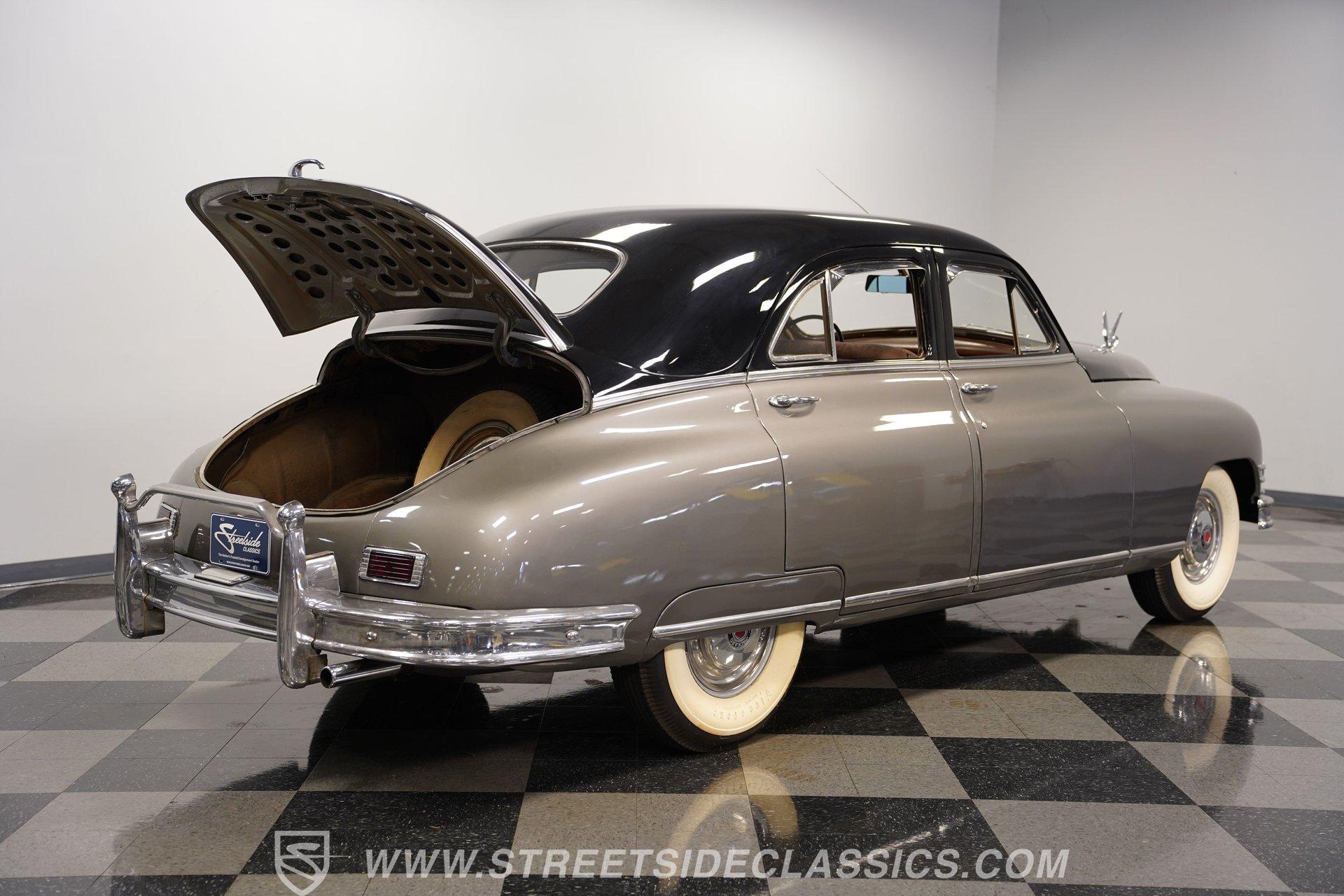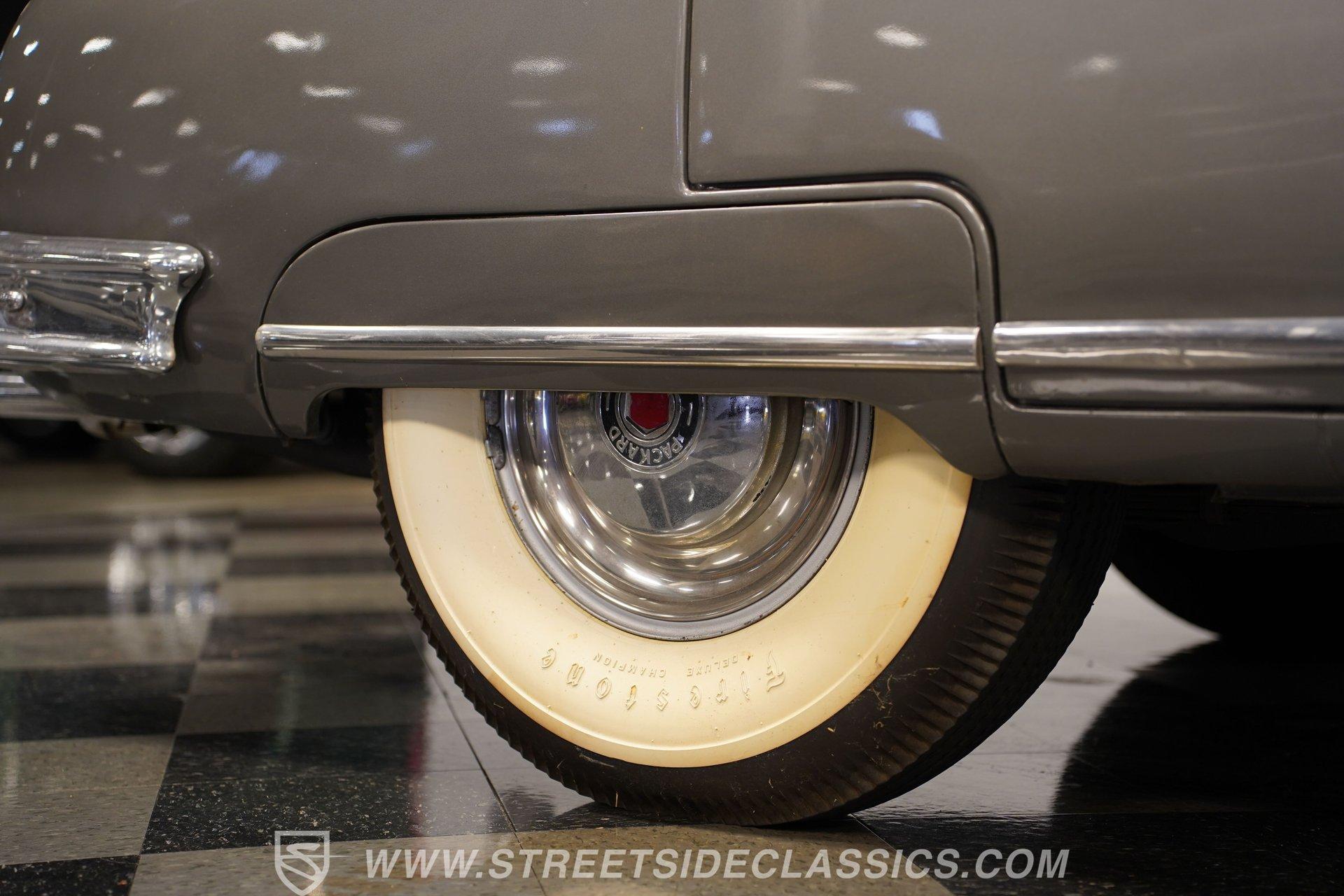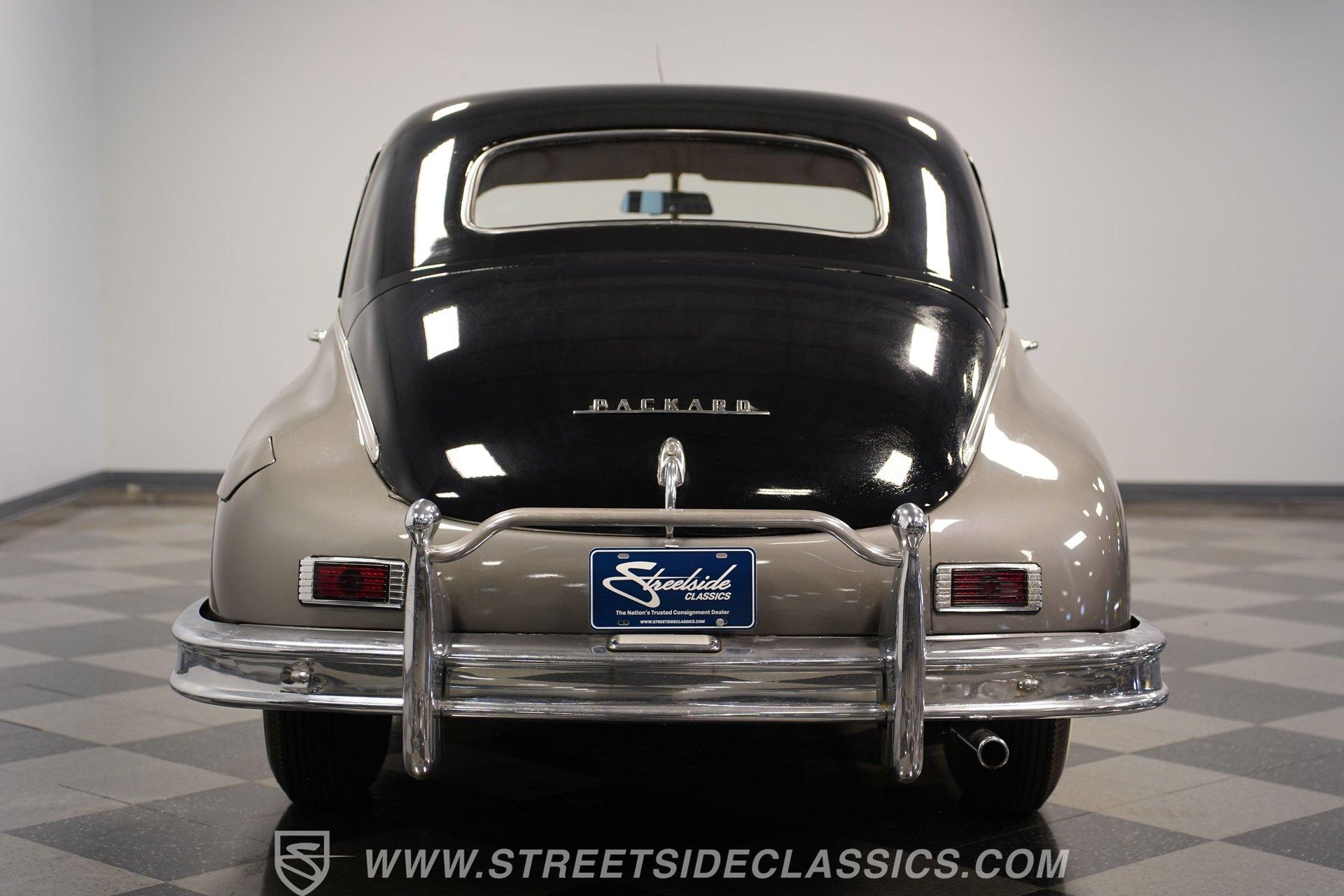 With its two-tone silver and black paint and attention-commanding presence, this 1949 Packard Standard 8 is an effortlessly cool classic. A closer inspection will reveal that it bears little resemblance to virtually any other car from its era. As the 1940's arrived, Packard had already started a trend of minimizing the once-prominent rear fenders on its offerings to give them a more streamlined appearance, and by the time this sedan rolled out, they were literally gone altogether. Even now, more than 75 years after it first rolled off the assembly line, it looks downright futuristic in many respects and has come through the years in strong fashion. That paint scheme highlights its distinctive lines to perfection, and this Packard is still structurally sound and showing nice, even body panel gaps from front to back. The interior underwent a restoration a while back and remains in very good condition, with bench seating in both front and back that shows only minor wear and sits over an expanse of carpeting that fits nicely. The dash area has been kept in its original configuration and features wood trim that was once a hallmark of automotive styling. While it could use a little refinishing to regain top form, it's totally intact and encircles an instrument panel that sports clear, easily readable gauges. This is a spacious, driving environment, with plenty of shoulder and leg room and well-padded seating accommodations, so you can be sure that your passengers will ride in plenty of comfort. The running condition of this great-looking classic will likely come as a welcome surprise. Its factory-correct 288-cubic-inch inline V8 is in fine form, starting up promptly and pulling smoothly as it pairs with a 3-speed manual transmission that runs through its gears with no issues at all via a column-mounted shifter. While the engine compartment could use a steam cleaning to be at its best, all the factory components appear to be in good shape. And, owing largely to this Packard's substantial wheelbase, its ride quality is downright impressive. It feels like you're floating down the asphalt, making it perfectly suited for leisurely weekend excursions. HIGHLIGHTS 288-CUBIC-INCH INLINE 8 CYLINDER ENGINE 2-BARREL CARBURETOR 3-SPEED MANUAL TRANSMISSION FACTORY-CORRECT DRUM BRAKES FACTORY-CORRECT MANUAL STEERING COLUMN SHIFTER 15" FACTORY WHEELS WITH WHITEWALL TIRES CLASSIC TWO-TONE, SILVER AND BLACK EXTERIOR TAN CLOTH INTERIOR BENCH SEATING OWNER'S MANUAL INCLUDED Sporting an unabashedly opulent look and a confidence-inspiring running condition, this 1949 Packard Standard 8 cruises on a set of factory-correct 15" wheels wrapped with whitewall tires and would be a perfect match for the collector who appreciates its substantial significance in the evolution of automotive styling. Call today!