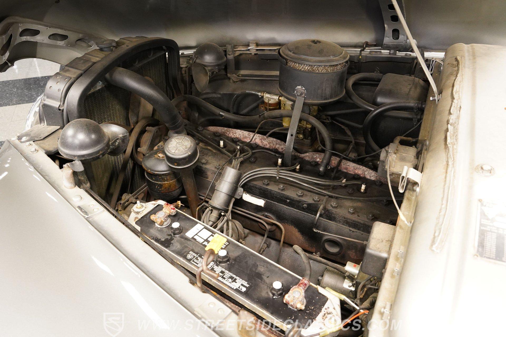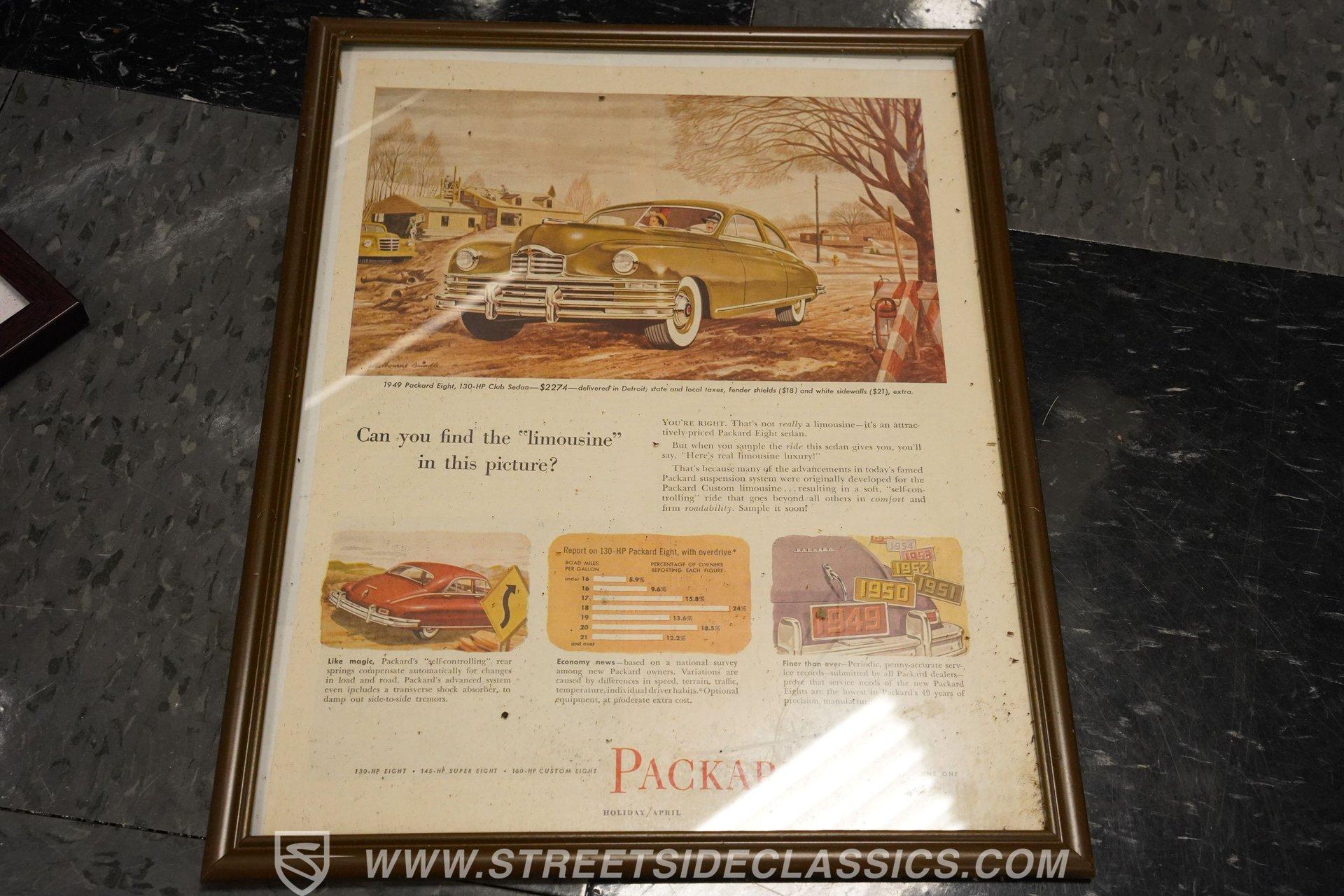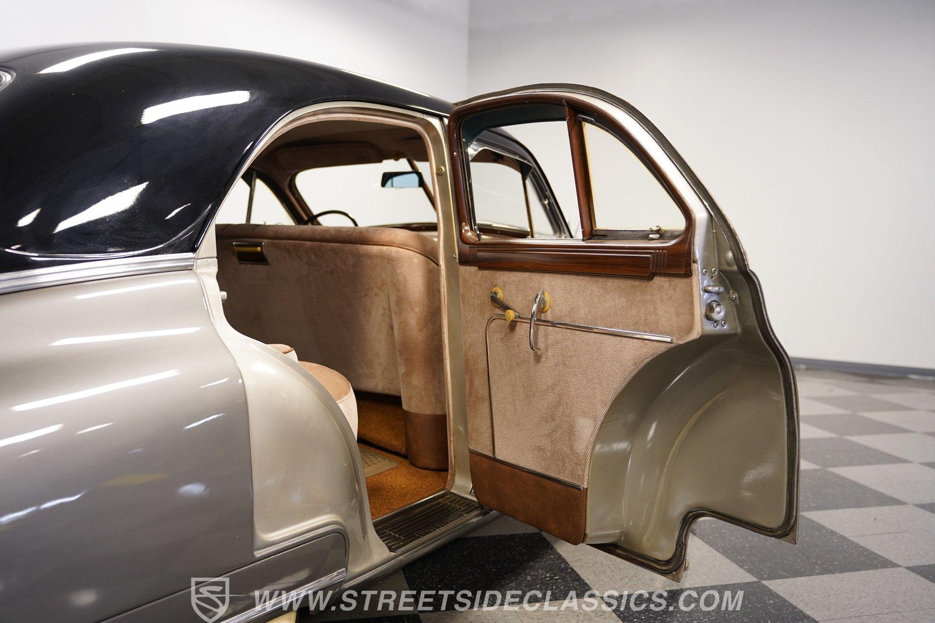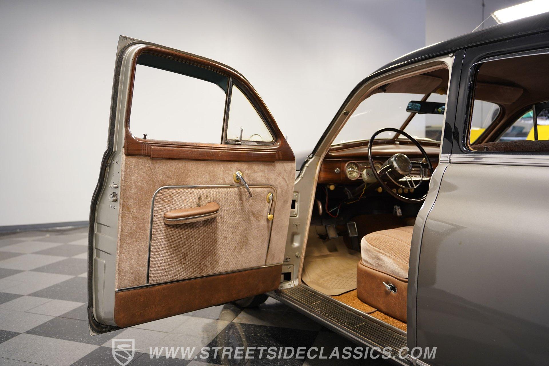 With its two-tone silver and black paint and attention-commanding presence, this 1949 Packard Standard 8 is an effortlessly cool classic. A closer inspection will reveal that it bears little resemblance to virtually any other car from its era. As the 1940's arrived, Packard had already started a trend of minimizing the once-prominent rear fenders on its offerings to give them a more streamlined appearance, and by the time this sedan rolled out, they were literally gone altogether. Even now, more than 75 years after it first rolled off the assembly line, it looks downright futuristic in many respects and has come through the years in strong fashion. That paint scheme highlights its distinctive lines to perfection, and this Packard is still structurally sound and showing nice, even body panel gaps from front to back. The interior underwent a restoration a while back and remains in very good condition, with bench seating in both front and back that shows only minor wear and sits over an expanse of carpeting that fits nicely. The dash area has been kept in its original configuration and features wood trim that was once a hallmark of automotive styling. While it could use a little refinishing to regain top form, it's totally intact and encircles an instrument panel that sports clear, easily readable gauges. This is a spacious, driving environment, with plenty of shoulder and leg room and well-padded seating accommodations, so you can be sure that your passengers will ride in plenty of comfort. The running condition of this great-looking classic will likely come as a welcome surprise. Its factory-correct 288-cubic-inch inline V8 is in fine form, starting up promptly and pulling smoothly as it pairs with a 3-speed manual transmission that runs through its gears with no issues at all via a column-mounted shifter. While the engine compartment could use a steam cleaning to be at its best, all the factory components appear to be in good shape. And, owing largely to this Packard's substantial wheelbase, its ride quality is downright impressive. It feels like you're floating down the asphalt, making it perfectly suited for leisurely weekend excursions. HIGHLIGHTS 288-CUBIC-INCH INLINE 8 CYLINDER ENGINE 2-BARREL CARBURETOR 3-SPEED MANUAL TRANSMISSION FACTORY-CORRECT DRUM BRAKES FACTORY-CORRECT MANUAL STEERING COLUMN SHIFTER 15" FACTORY WHEELS WITH WHITEWALL TIRES CLASSIC TWO-TONE, SILVER AND BLACK EXTERIOR TAN CLOTH INTERIOR BENCH SEATING OWNER'S MANUAL INCLUDED Sporting an unabashedly opulent look and a confidence-inspiring running condition, this 1949 Packard Standard 8 cruises on a set of factory-correct 15" wheels wrapped with whitewall tires and would be a perfect match for the collector who appreciates its substantial significance in the evolution of automotive styling. Call today!