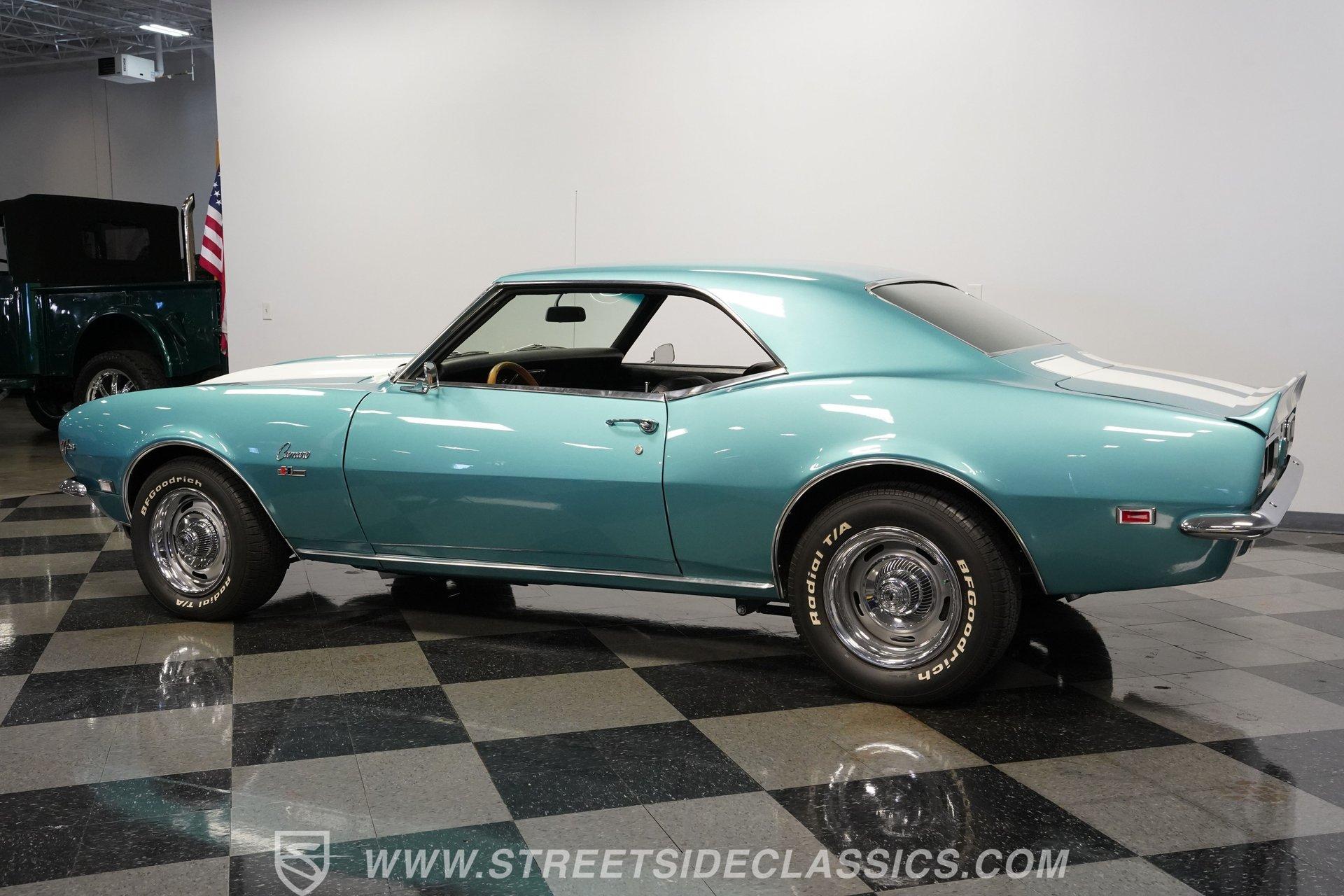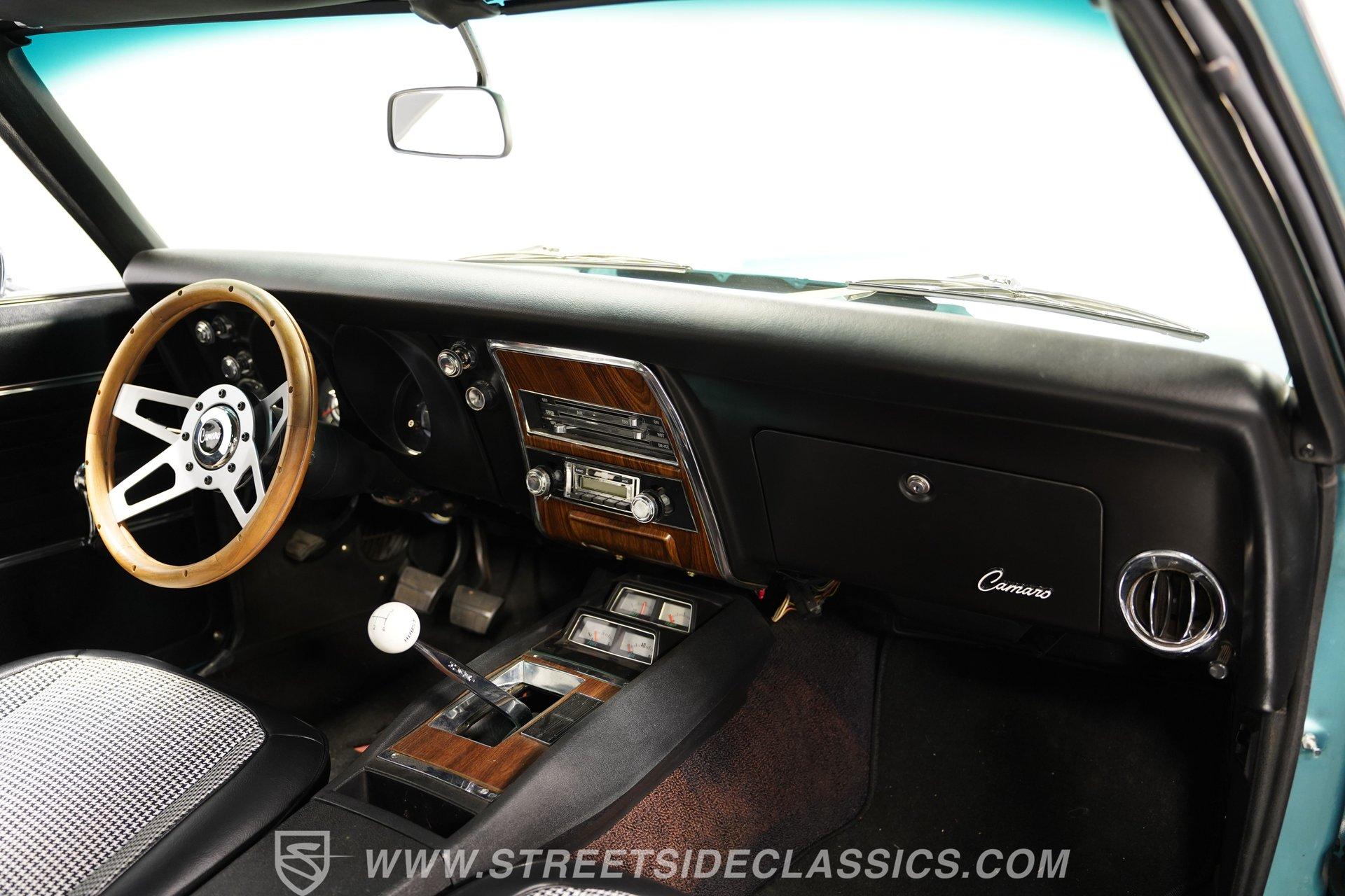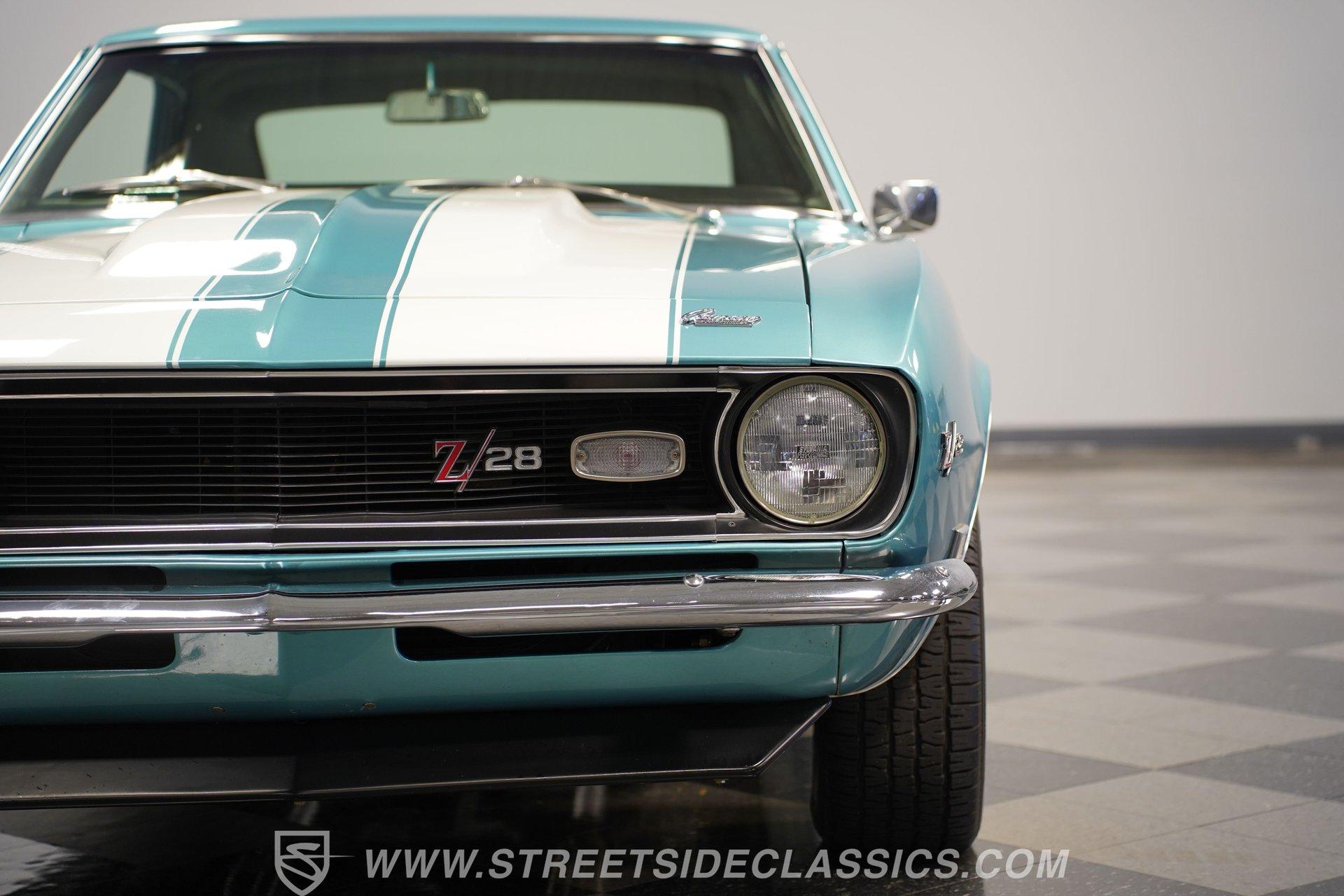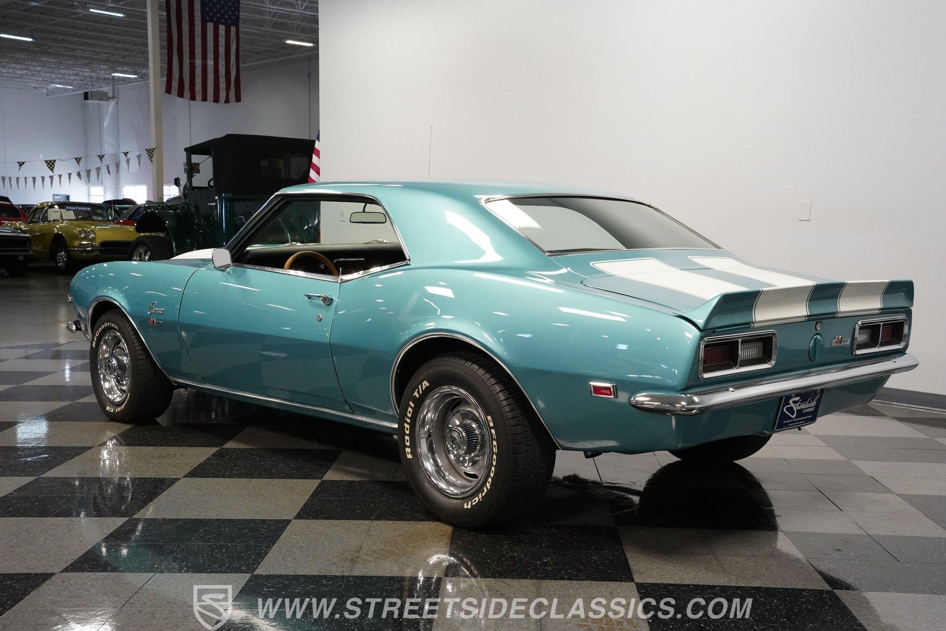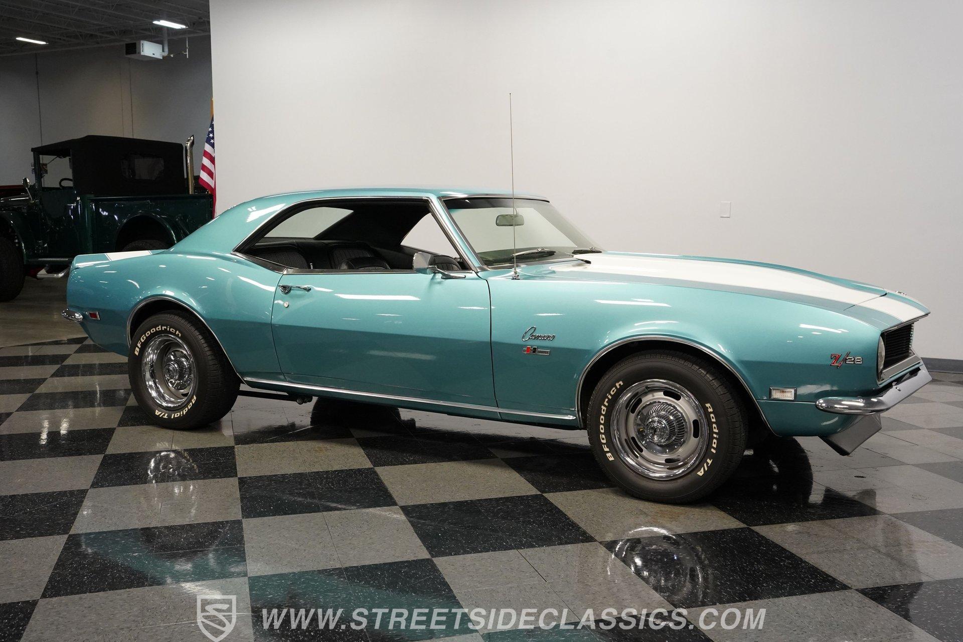 This 1968 Chevrolet Camaro Z/28 Tribute wears Island Teal paint accented by white striping running down its iconic cowl hood. Classic 15-inch rally wheels are wrapped in 225/60R15 and 245/60R15 BF Goodrich Radial T/A rubber for the perfect muscle car stance. Clean glass flows across all windows, while a rear spoiler caps off the back end. Black vinyl bucket seats with deluxe houndstooth inserts anchor the cockpit, separated by a center console housing factory-style gauges and Hurst floor-mounted shifter. The steering column accepts a custom wood-rimmed wheel, while a retro-styled AM/FM radio provides sound. Factory-style door panels and headliner maintain the first-generation aesthetic. An Edelbrock Victor Jr intake and Holley Brawler carburetor feed the healthy 327 small-block, backed by a Munice 4-speed manual transmission that sends power back to a 9-inch Ford rear end. Long-tube headers lead to dual exhaust and rumbling FlowMaster mufflers. Power steering and front power disc brakes handle control. Moroso chrome valve covers and a chrome open-element air cleaner dress the clean engine bay, while rear Traction bars strengthen the chassis. HIGHLIGHTS: 327 V8 Engine 4-Speed Manual Transmission Edelbrock Intake Holley Brawler Carburetor 9-Inch Ford Rear End Long Tube Headers Dual Exhaust FlowMaster Mufflers Front Power Disc Brakes Traction Bars Island Teal Paint With White Stripes 15-Inch Rally Wheels 225/60R15 Front, 245/60R15 Rear BF Goodrich Radial T/A Tires Black Vinyl Interior With Bucket Seats Center Console with Factory Style Gauges Cowl Induction Hood Custom Wood Rimmed Steering Wheel Power Steering AM/FM Radio Rear Spoiler and Chin Spoiler With classic muscle car looks, quality upgrades and thrilling performance, this 1968 Chevrolet Camaro Z/28 Tribute is ready to impress its next owner. Call today!