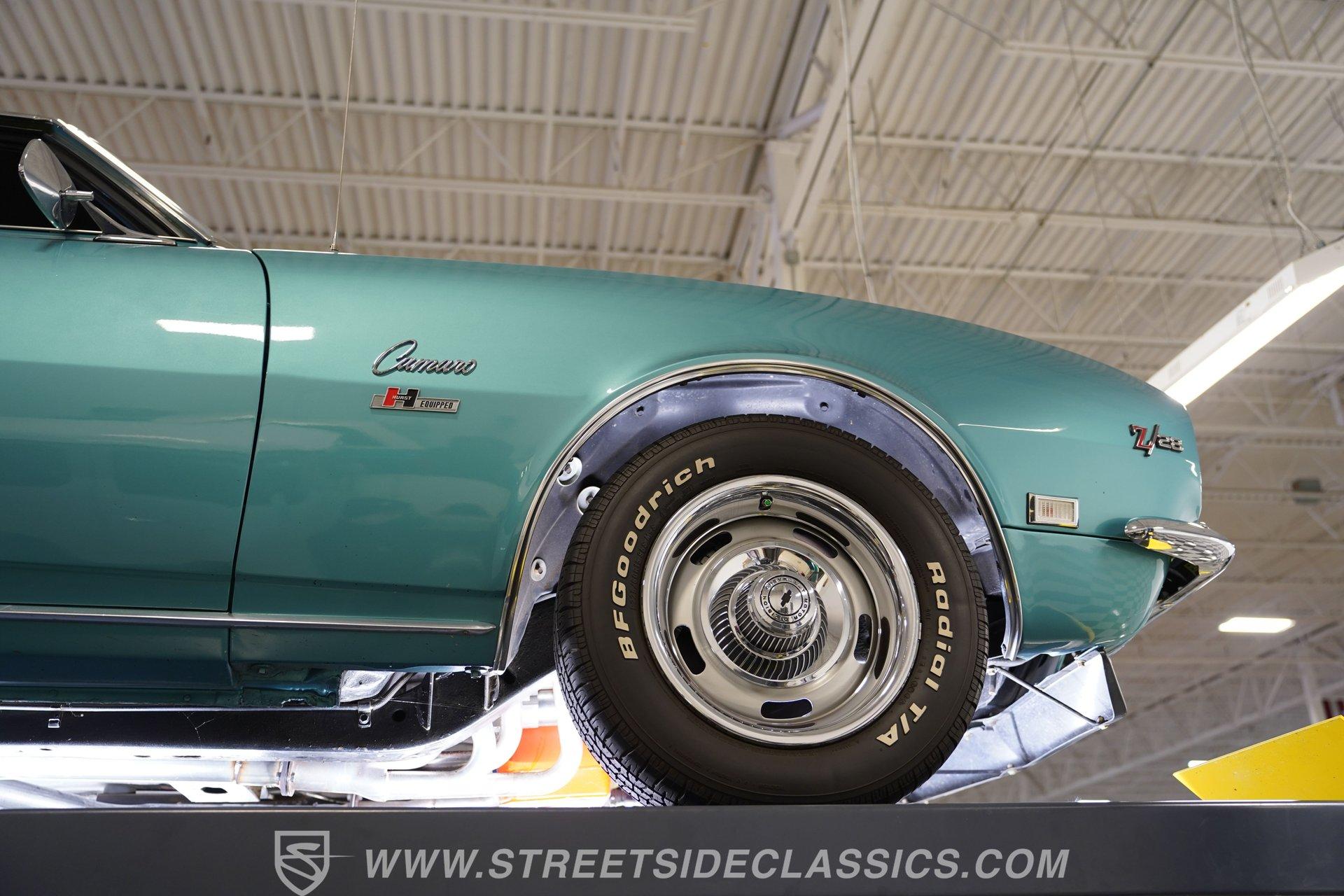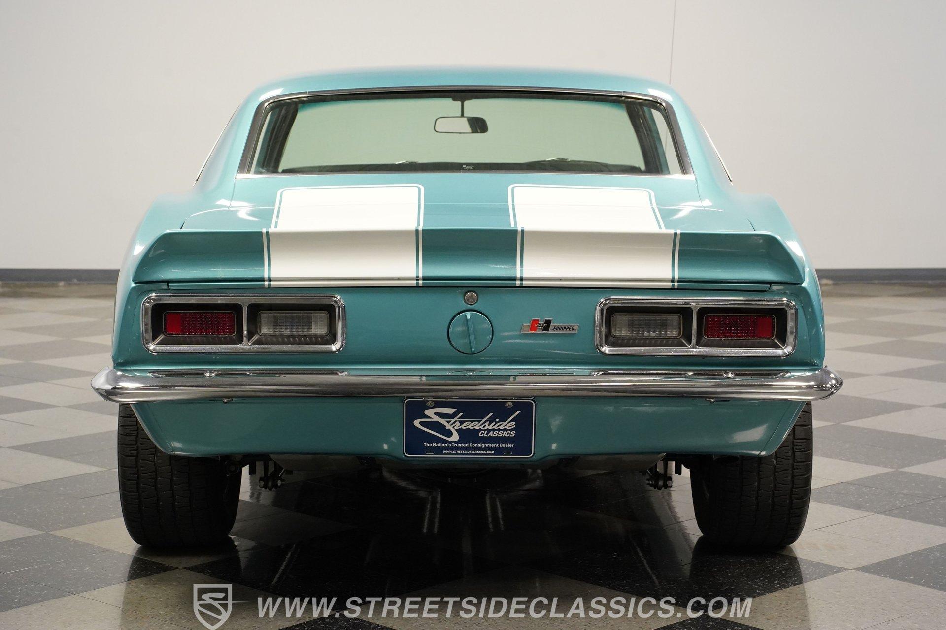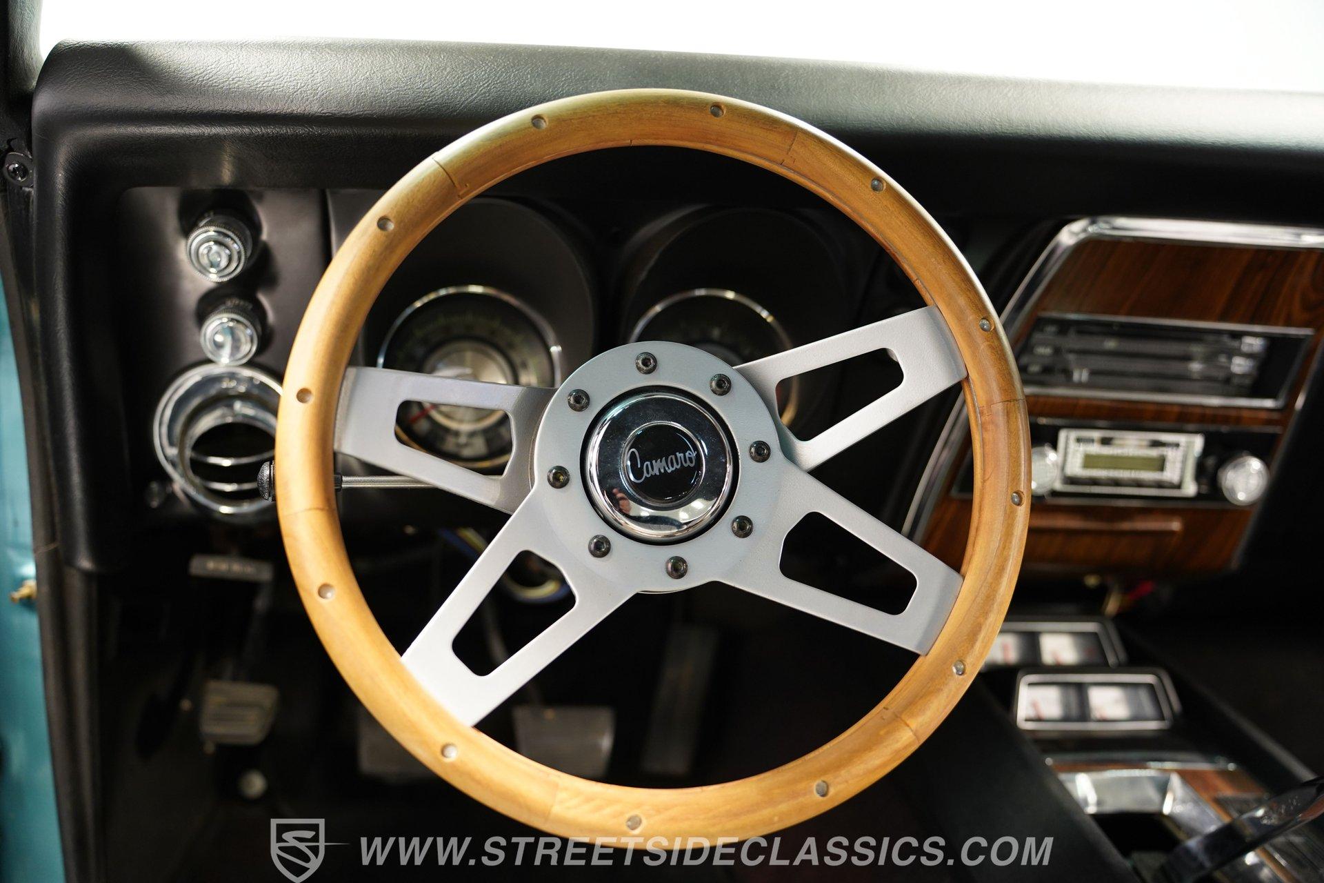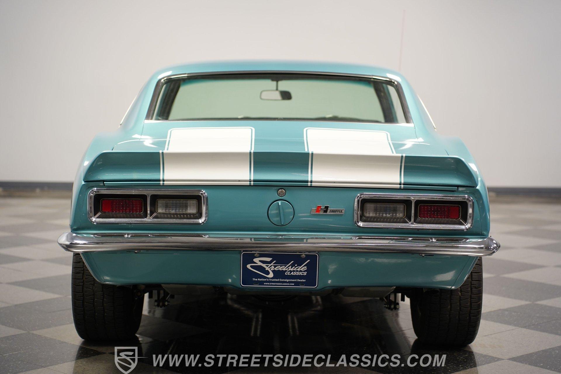 This 1968 Chevrolet Camaro Z/28 Tribute wears Island Teal paint accented by white striping running down its iconic cowl hood. Classic 15-inch rally wheels are wrapped in 225/60R15 and 245/60R15 BF Goodrich Radial T/A rubber for the perfect muscle car stance. Clean glass flows across all windows, while a rear spoiler caps off the back end. Black vinyl bucket seats with deluxe houndstooth inserts anchor the cockpit, separated by a center console housing factory-style gauges and Hurst floor-mounted shifter. The steering column accepts a custom wood-rimmed wheel, while a retro-styled AM/FM radio provides sound. Factory-style door panels and headliner maintain the first-generation aesthetic. An Edelbrock Victor Jr intake and Holley Brawler carburetor feed the healthy 327 small-block, backed by a Munice 4-speed manual transmission that sends power back to a 9-inch Ford rear end. Long-tube headers lead to dual exhaust and rumbling FlowMaster mufflers. Power steering and front power disc brakes handle control. Moroso chrome valve covers and a chrome open-element air cleaner dress the clean engine bay, while rear Traction bars strengthen the chassis. HIGHLIGHTS: 327 V8 Engine 4-Speed Manual Transmission Edelbrock Intake Holley Brawler Carburetor 9-Inch Ford Rear End Long Tube Headers Dual Exhaust FlowMaster Mufflers Front Power Disc Brakes Traction Bars Island Teal Paint With White Stripes 15-Inch Rally Wheels 225/60R15 Front, 245/60R15 Rear BF Goodrich Radial T/A Tires Black Vinyl Interior With Bucket Seats Center Console with Factory Style Gauges Cowl Induction Hood Custom Wood Rimmed Steering Wheel Power Steering AM/FM Radio Rear Spoiler and Chin Spoiler With classic muscle car looks, quality upgrades and thrilling performance, this 1968 Chevrolet Camaro Z/28 Tribute is ready to impress its next owner. Call today!