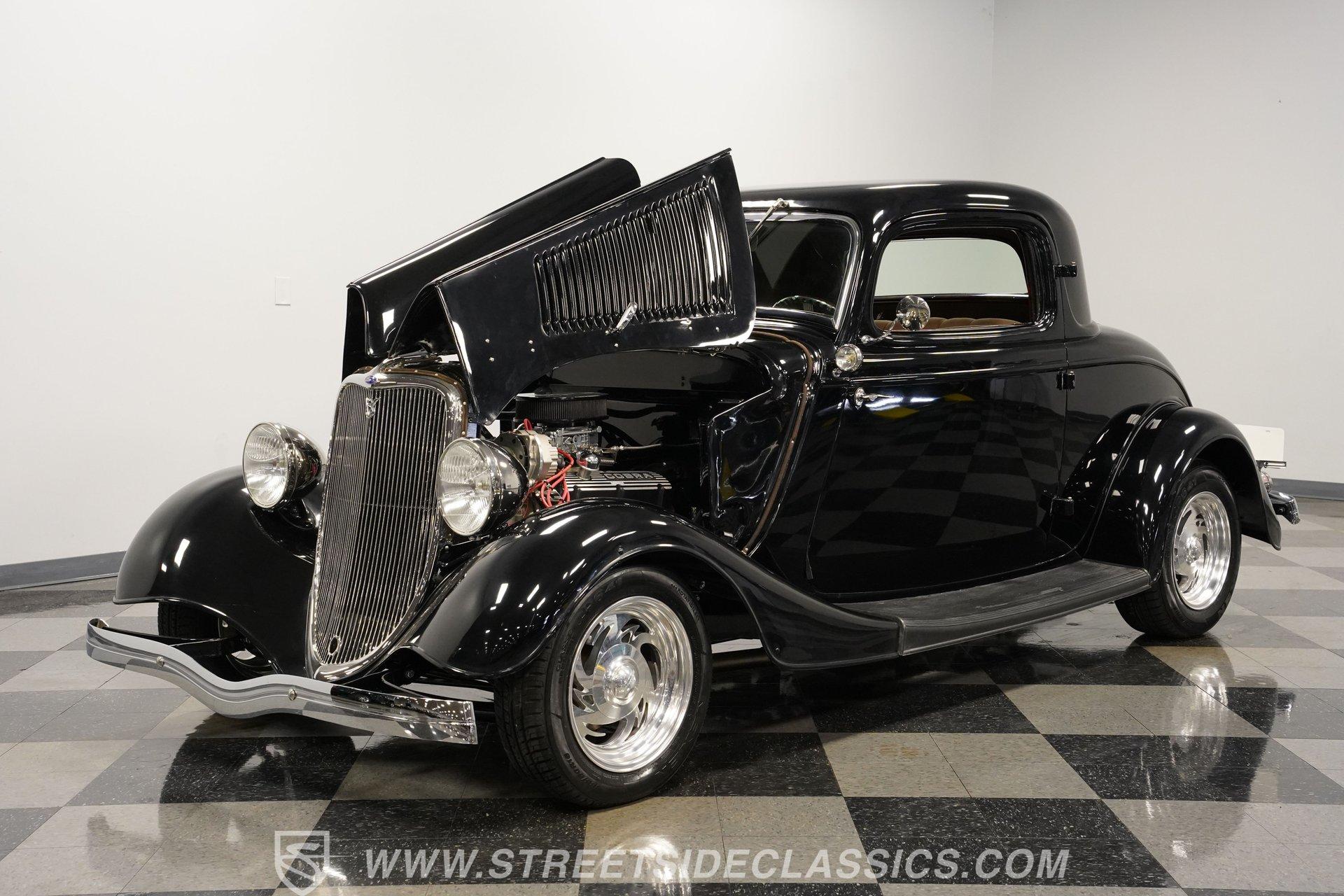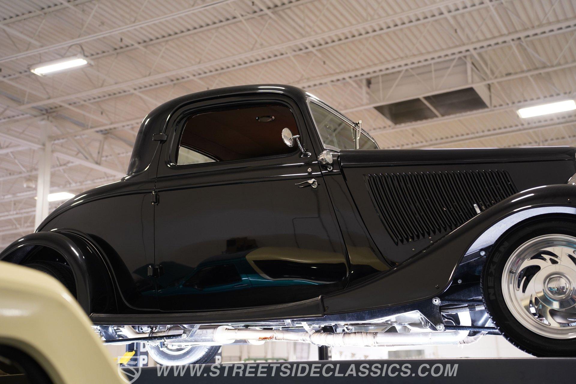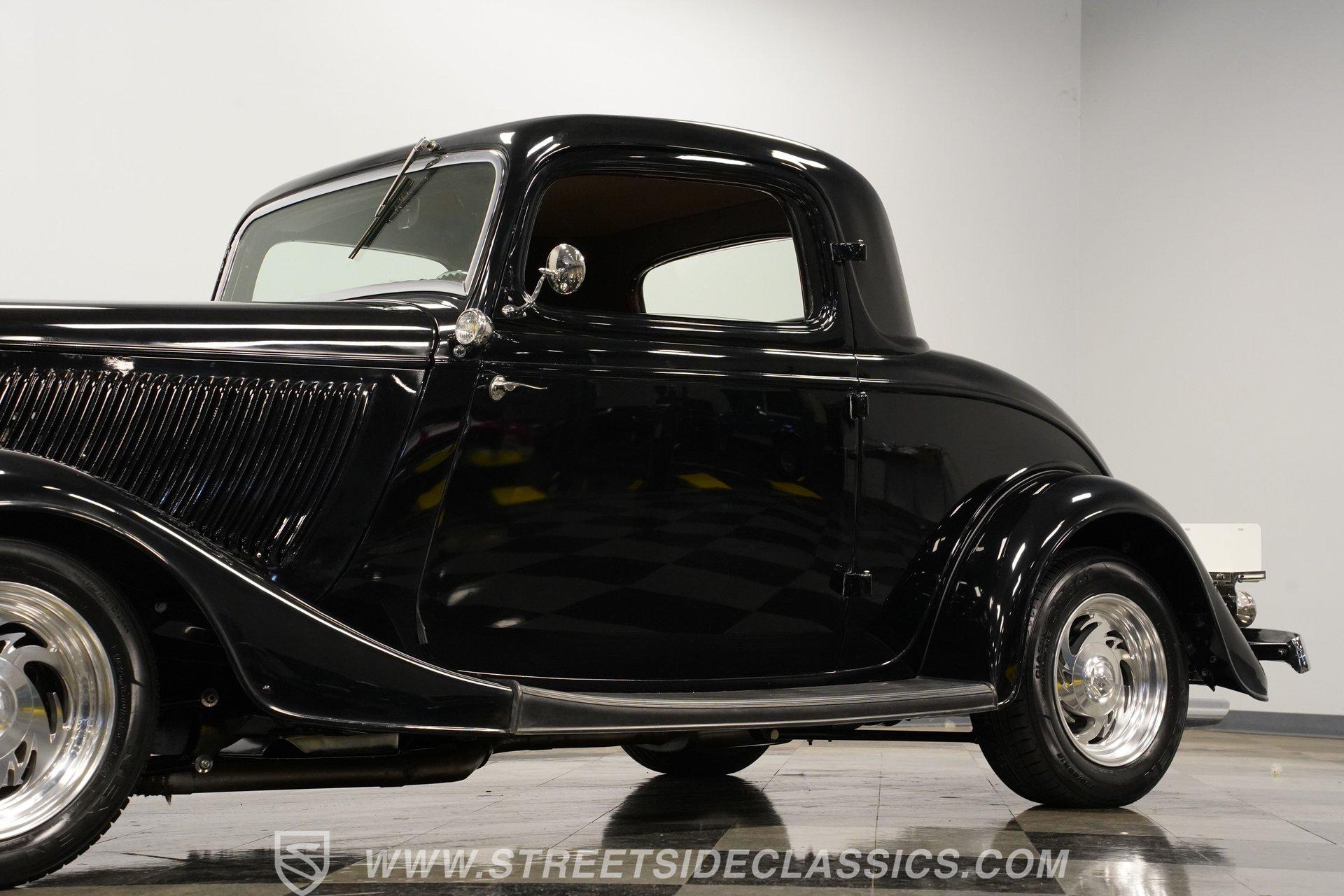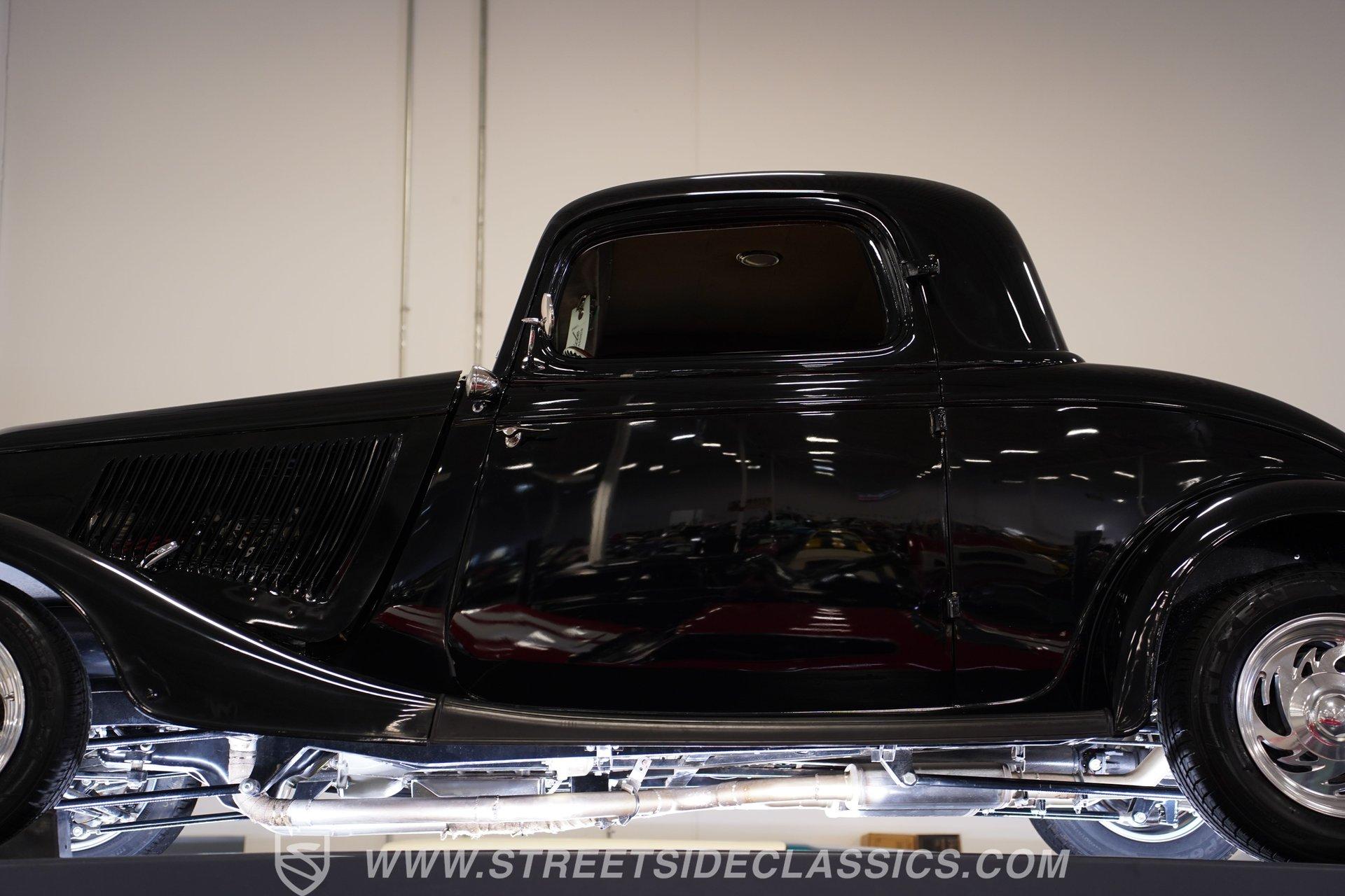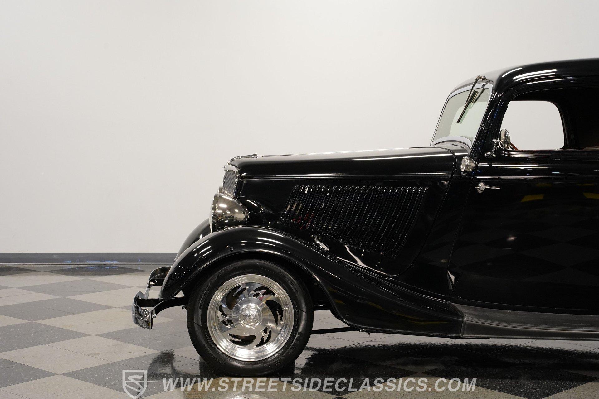 Most car enthusiasts have probably thought about scoring a sweet old-school hot rod at some point. The thing that usually holds people back is the time and effort it takes, along with all the trial-and-error that comes with it. It can definitely feel like a lot to handle, which is why when a car like this 1934 Ford 3-Window Coupe comes along, it's worth taking some time to see how much effort and time have been invested in it for you, no work required. With just two miles on its odometer since its ten-year full frame-off restoration was completed, this midnight black coupe is sure to turn heads wherever it goes. Inside those suicide doors, we find a beautifully appointed and fully custom tan interior. A beautiful woodgrain banjo-style custom steering wheel sits in front of a matching (and equally beautiful) woodgrain dashboard featuring a set of white-faced AutoMeter gauges. Power window switches, seatbelts, and an air conditioner that could use a recharge make this cockpit far superior to its original form. Out back, we find a rumble seat setup that only needs the seat itself to provide passengers with a ride unlike any other. Prop open that steel hood, and you're treated to a clean and full engine bay featuring a 302 cubic-inch naturally aspirated V-8 engine. With its Cobra valve covers, single four-barrel Brawler carburetor, shorty headers, and MagnaFlow dual exhaust, this small block sounds every bit the hot rod it is meant to be. That power is routed through a Ford C6 three-speed automatic transmission before being sent out to the nine-inch rear end, which transfers those ponies to the pavement via a set of 15-inch Billet Specialties chrome wheels. HIGHLIGHTS: Ten Year Frame Off Restoration Two Miles Since Completed Rumble Seat Ready 302 CID V8 Brawler Four BBL Carb Shorty Headers Dual Exhaust MagnaFlow Mufflers C6 Three Speed Auto Aftermarket Suspension Coilovers Power Brakes Front Disc Brakes Power Steering Custom Interior Custom Wheel Woodgrain Dash AutoMeter Gauges Power Windows AC Setup AM/FM Stereo Receipts Restoration Photos This 1934 Ford 3-Window Coupe rides on an aftermarket-laden suspension, power brakes featuring front discs make it easy to rein in speed whenever necessary, and instill a sense of confidence that this car is ready to go, no matter where the road may take you. So, if you've always wanted a true old-school hot rod, but don't have the time or patience to put one together piece by piece, then this beautifully put-together street rod is exactly what you've been waiting for. Don't wait, call today!