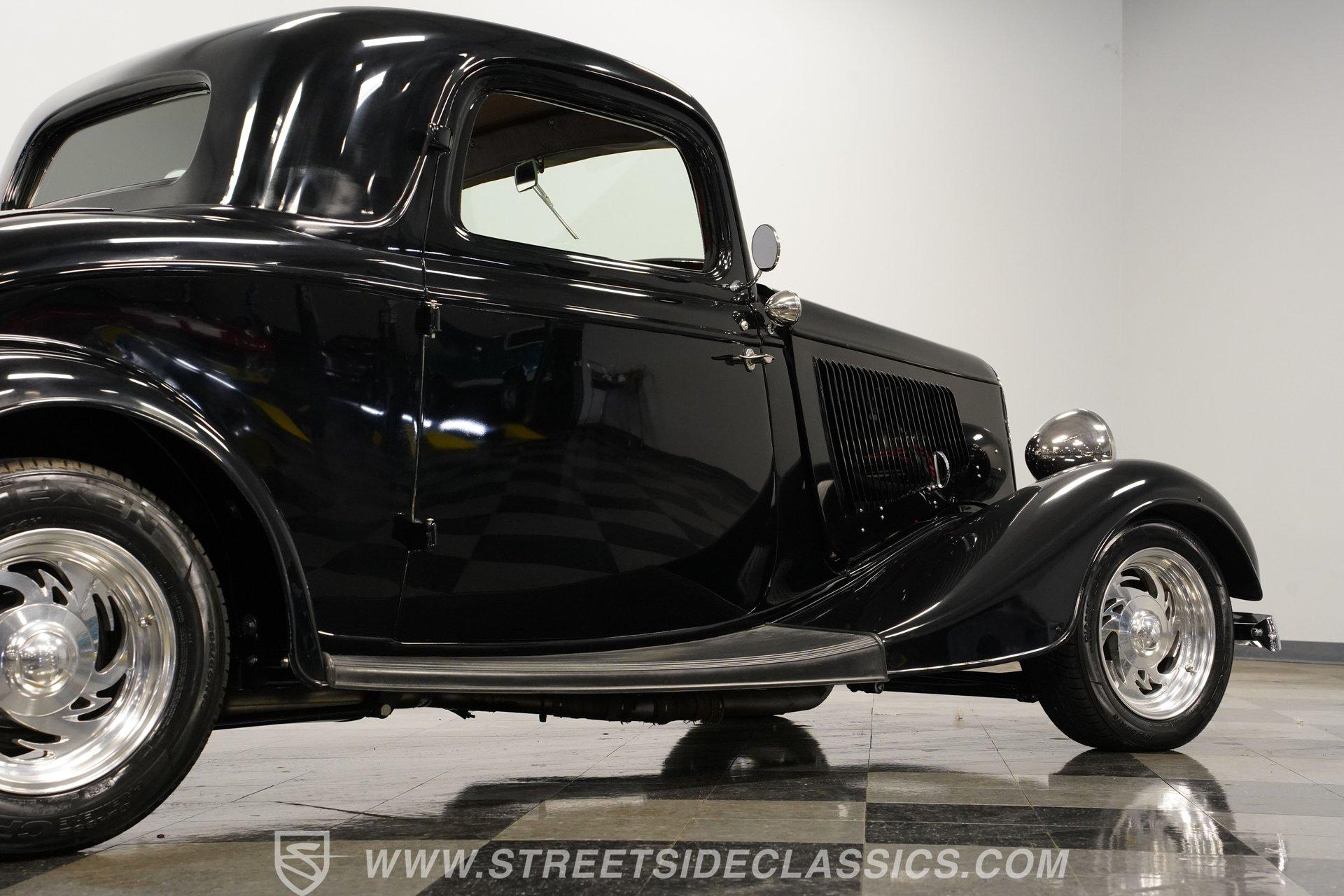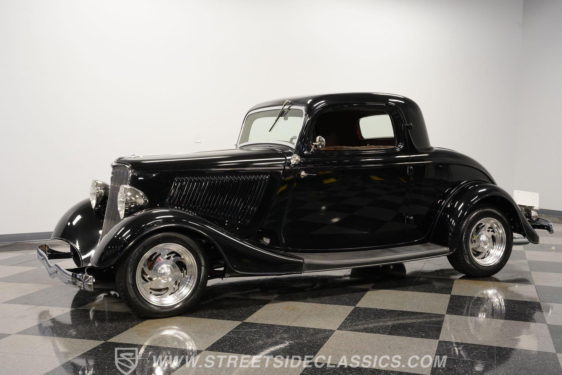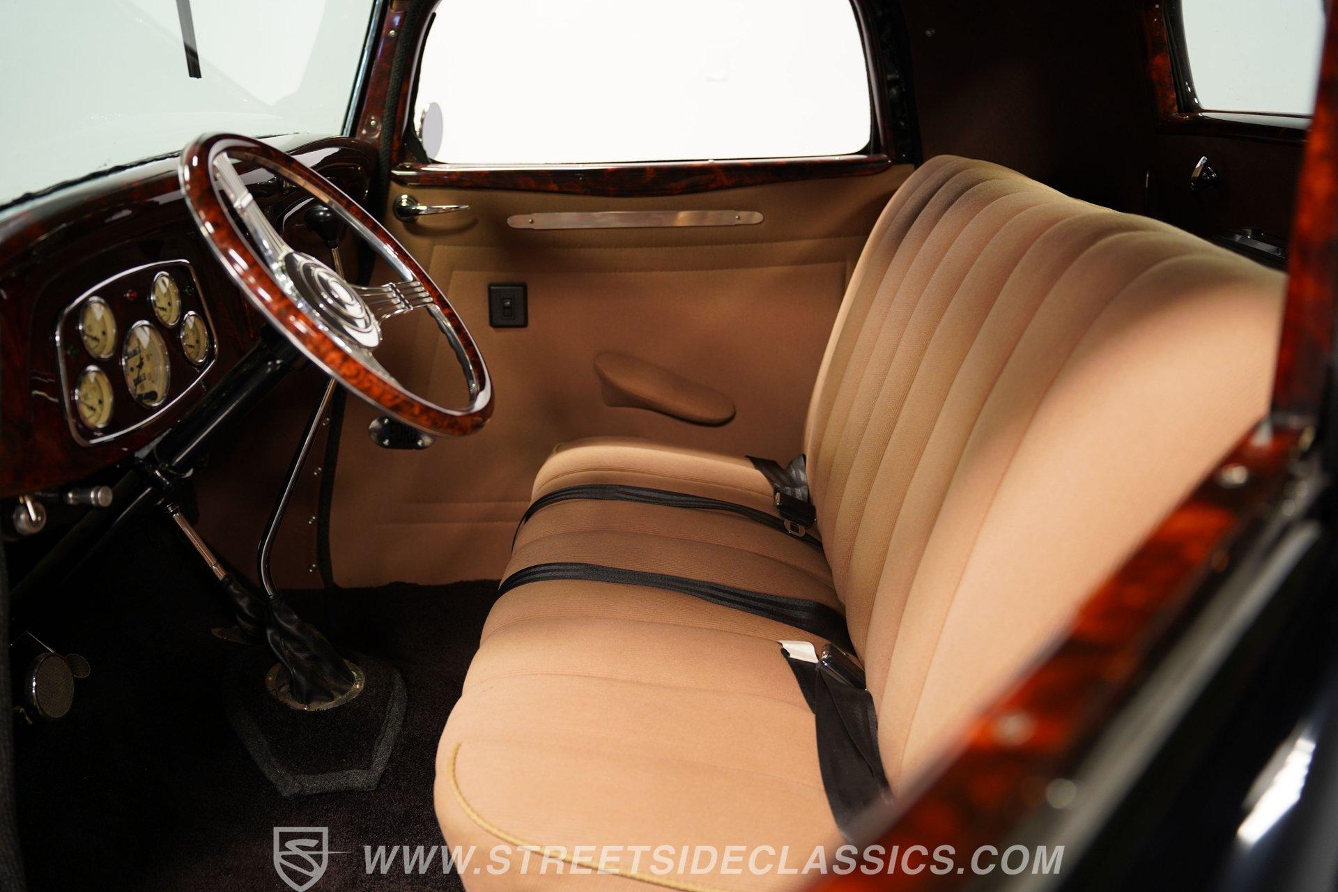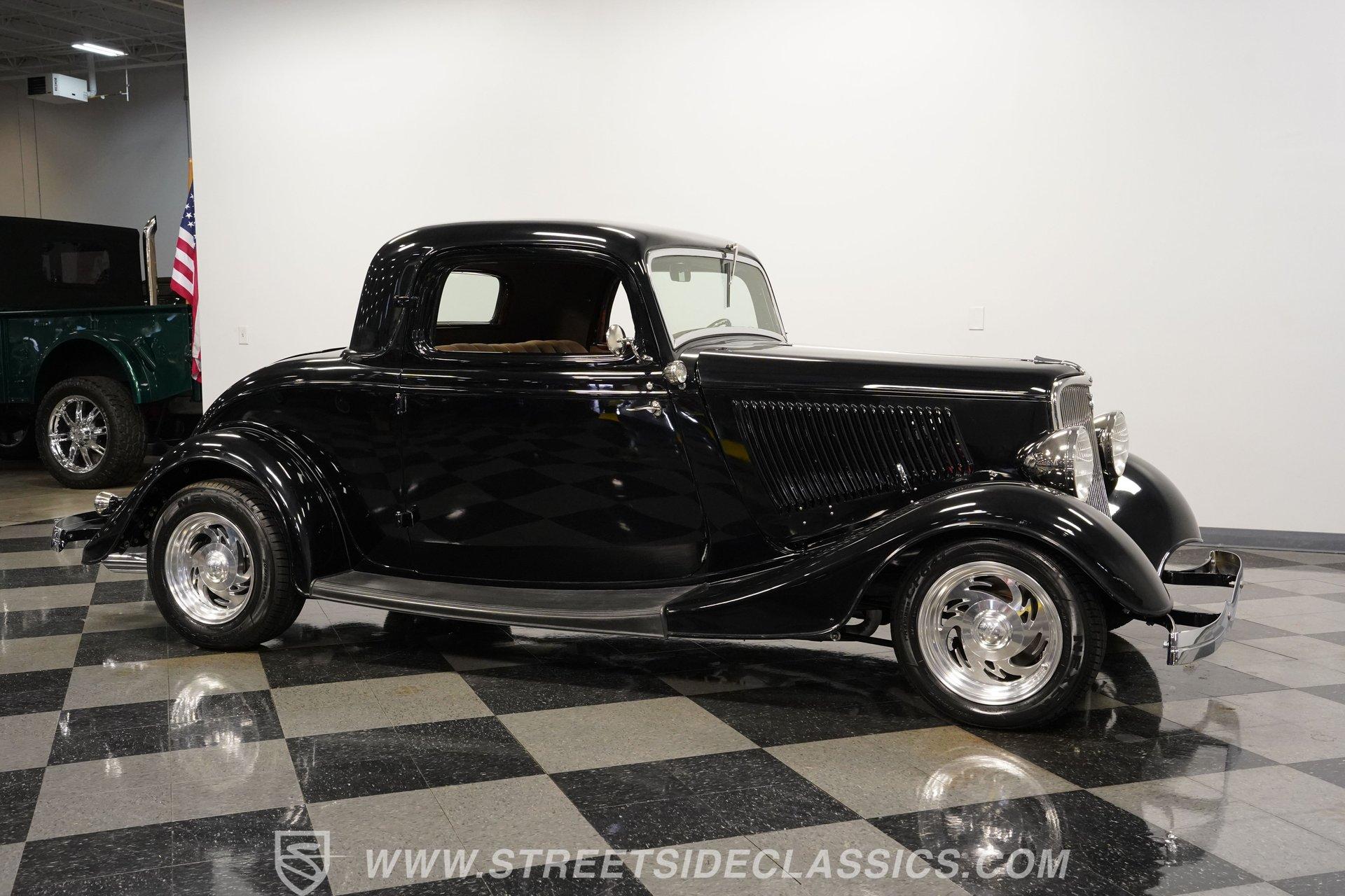 Most car enthusiasts have probably thought about scoring a sweet old-school hot rod at some point. The thing that usually holds people back is the time and effort it takes, along with all the trial-and-error that comes with it. It can definitely feel like a lot to handle, which is why when a car like this 1934 Ford 3-Window Coupe comes along, it's worth taking some time to see how much effort and time have been invested in it for you, no work required. With just two miles on its odometer since its ten-year full frame-off restoration was completed, this midnight black coupe is sure to turn heads wherever it goes. Inside those suicide doors, we find a beautifully appointed and fully custom tan interior. A beautiful woodgrain banjo-style custom steering wheel sits in front of a matching (and equally beautiful) woodgrain dashboard featuring a set of white-faced AutoMeter gauges. Power window switches, seatbelts, and an air conditioner that could use a recharge make this cockpit far superior to its original form. Out back, we find a rumble seat setup that only needs the seat itself to provide passengers with a ride unlike any other. Prop open that steel hood, and you're treated to a clean and full engine bay featuring a 302 cubic-inch naturally aspirated V-8 engine. With its Cobra valve covers, single four-barrel Brawler carburetor, shorty headers, and MagnaFlow dual exhaust, this small block sounds every bit the hot rod it is meant to be. That power is routed through a Ford C6 three-speed automatic transmission before being sent out to the nine-inch rear end, which transfers those ponies to the pavement via a set of 15-inch Billet Specialties chrome wheels. HIGHLIGHTS: Ten Year Frame Off Restoration Two Miles Since Completed Rumble Seat Ready 302 CID V8 Brawler Four BBL Carb Shorty Headers Dual Exhaust MagnaFlow Mufflers C6 Three Speed Auto Aftermarket Suspension Coilovers Power Brakes Front Disc Brakes Power Steering Custom Interior Custom Wheel Woodgrain Dash AutoMeter Gauges Power Windows AC Setup AM/FM Stereo Receipts Restoration Photos This 1934 Ford 3-Window Coupe rides on an aftermarket-laden suspension, power brakes featuring front discs make it easy to rein in speed whenever necessary, and instill a sense of confidence that this car is ready to go, no matter where the road may take you. So, if you've always wanted a true old-school hot rod, but don't have the time or patience to put one together piece by piece, then this beautifully put-together street rod is exactly what you've been waiting for. Don't wait, call today!