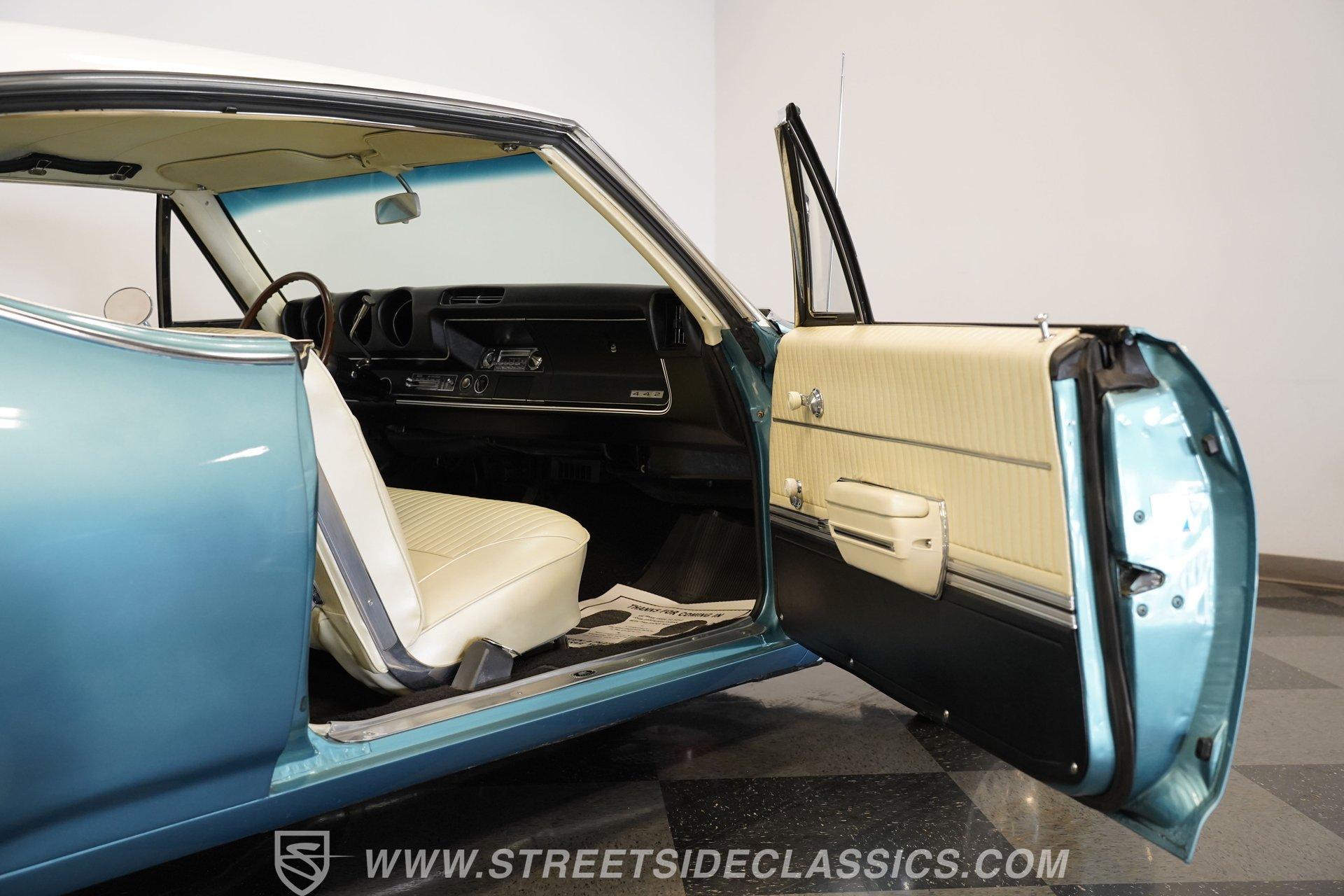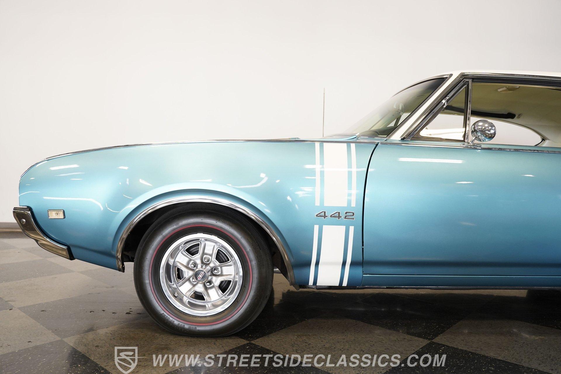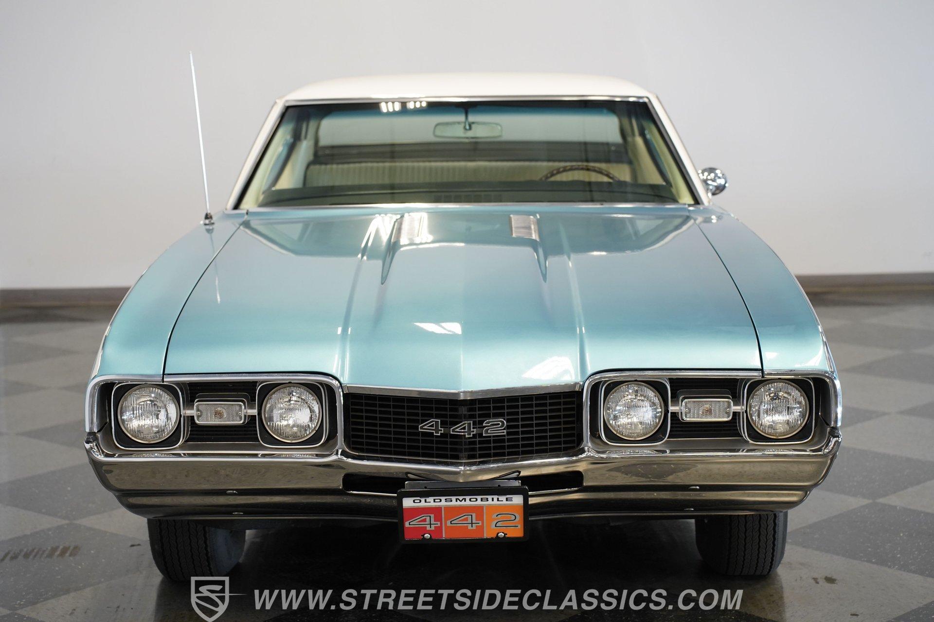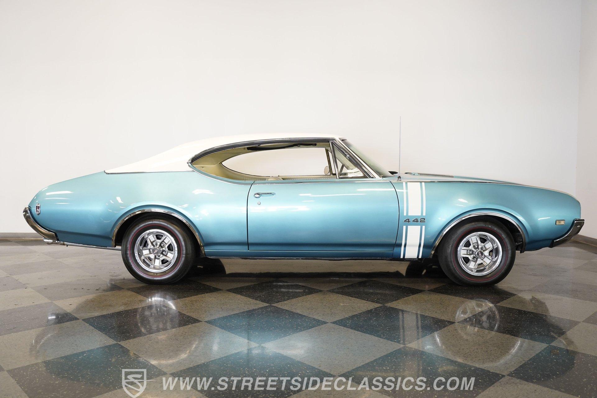 This 1968 Oldsmobile 442 hardtop has one of the most dominating widebody stances ever, and under the hood is its numbers-matching 400 V8 to back up its looks. And with a cool color combo, a great driving attitude, and factory correct restoration, it makes for an irresistible total package. 1968 was the debut of the second generation 442. No longer just an offshoot of the Cutlass, the muscle car celebrated its independence with one of the most intimidating designs of the 60s. Sure, it still carried much of the same overall appearance as its Olds A-body siblings, but the flared fenders, rounded rear, and long pillarless Holiday hardtop silhouette all look so much better in muscle car form. Plus, when you have that dark grille with the bold 442 badging in the middle of the wide dual headlight housings, it just makes for a truly sinister machine. As a true Oldsmobile, this never loses its premium touches. For example, there's a trim line that starts at the headlights and highlights the curves of the profile all the way through the door line. Finished correctly in Ocean Turquoise Metallic, this car has the proper 442 side stripes, but they are painted on and cleared over for a smooth permanence. The stripes work well with the correct Provincial White roof that looks like a vinyl top, but it's really painted for a glossy and easily maintained style. It makes for a full package that's thoughtfully detailed, right down to the shine of the form-hugging bumpers. All the white accents of the exterior get you ready for the full white interior. The clean look of the correct pleated vinyl on the seats and door panels looks great. The interior features factory air conditioning and is all done to factory specifications, right down to the working stock AM radio. An upgraded wood-rimmed sports steering wheel gives you a clear view of the sporty round gauge package. Under the hood is a numbers-matching V8 in this American muscle icon. Part of the fun of owning a '68 is getting to tell the story about how the 400 cubic-inch motor was the maximum GM would allow in its production intermediates at the time. This one looks terrific with the full cooper-colored engine and distinctive 442 air red cleaner, and an overall clean and correct setup that signals this has been given proper care. The mighty V8 inhales deeply with a four-barrel carburetor, and it exhales with a sweet sound out of the rumbling dual exhaust. As a true Oldsmobile, this is built to balance power and comfort. A stout TH400 three-speed automatic transmission, power steering, power brakes, a limited-slip rear, and sway bars front & rear add to the pleasurable driving experience. HIGHLIGHTS: Matching Number 400 Cubic Inch Engine TH400 Automatic Transmission 12-Bolt Limited-Slip Rear End Dual Exhaust Correct 14-Inch Super Stock Wheels F70-14 Firestone Super Sport Redline Tires Restored to a High Standard and to Original Specifications Original Working AM Radio Optional Fender Stripes Correct Ocean Turquoise Metallic Paint with Provincial White Painted Roof Power Brakes Power Steering Air Conditioning This classic 1968 Oldsmobile 442 hardtop has been restored to a high standard of quality and authenticity. If you appreciate these rarely found qualities in a classic muscle car, don't let this one slip away. Call today!