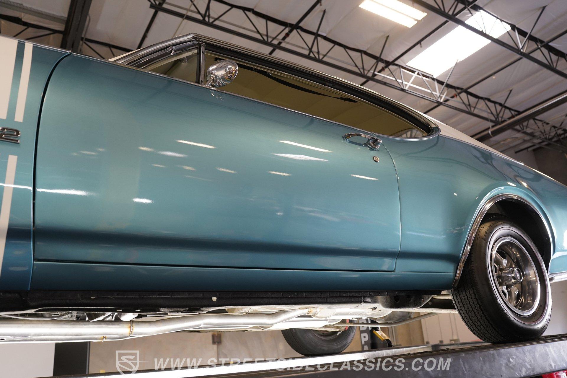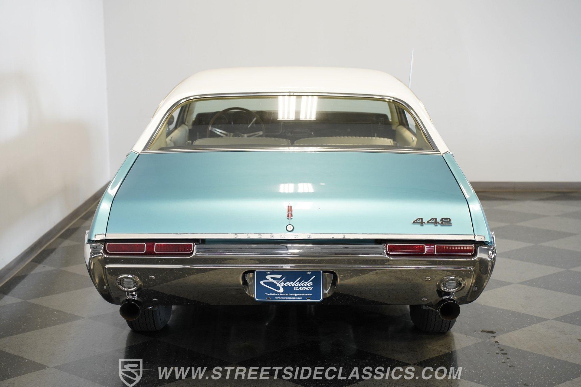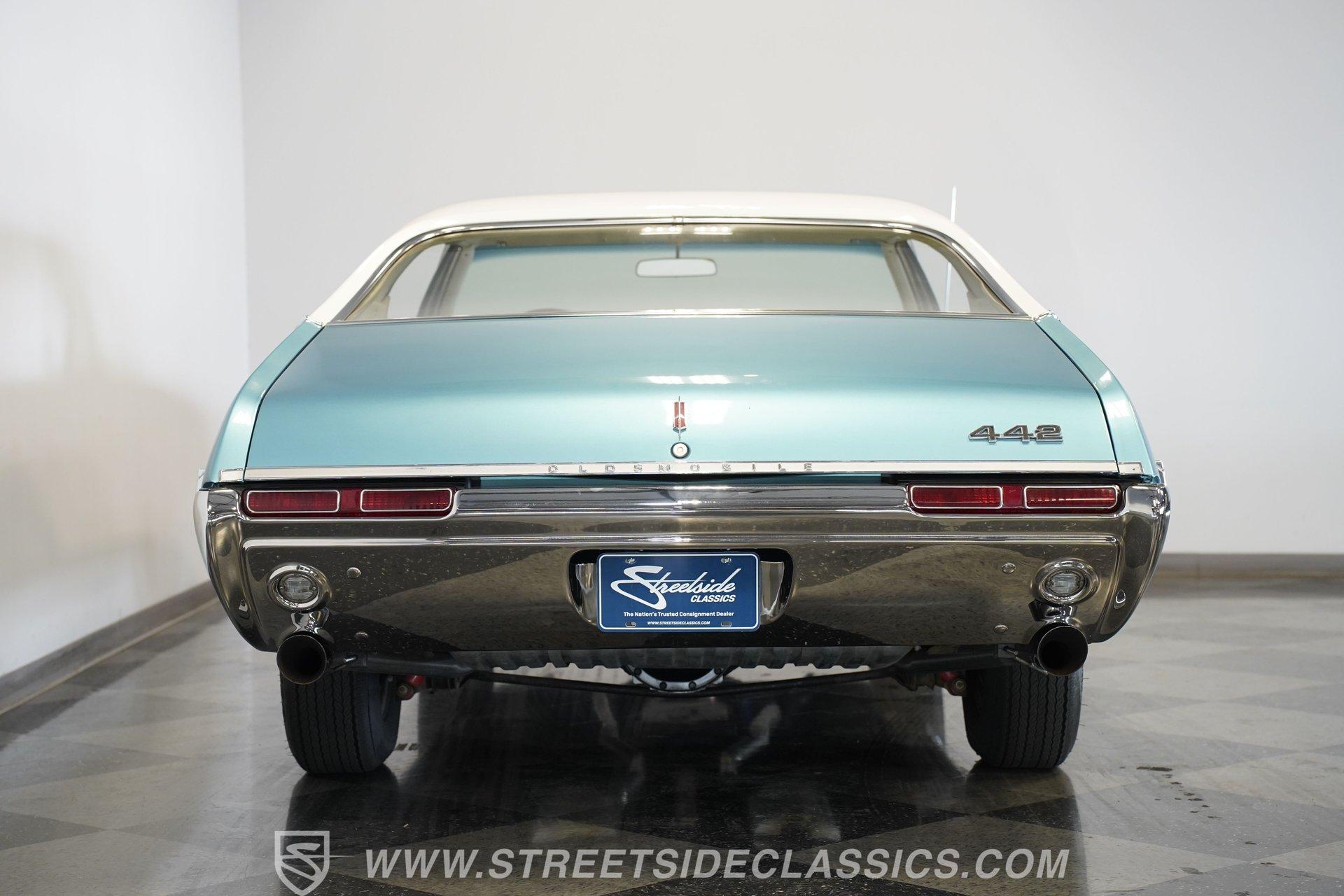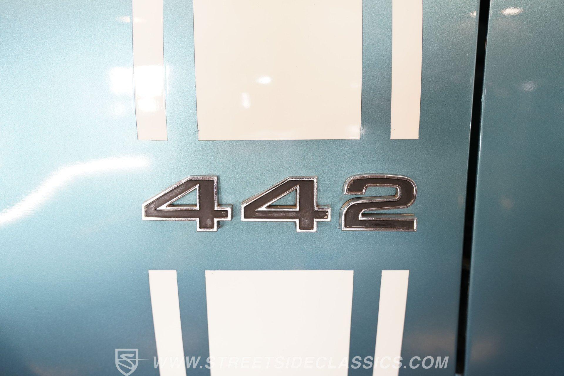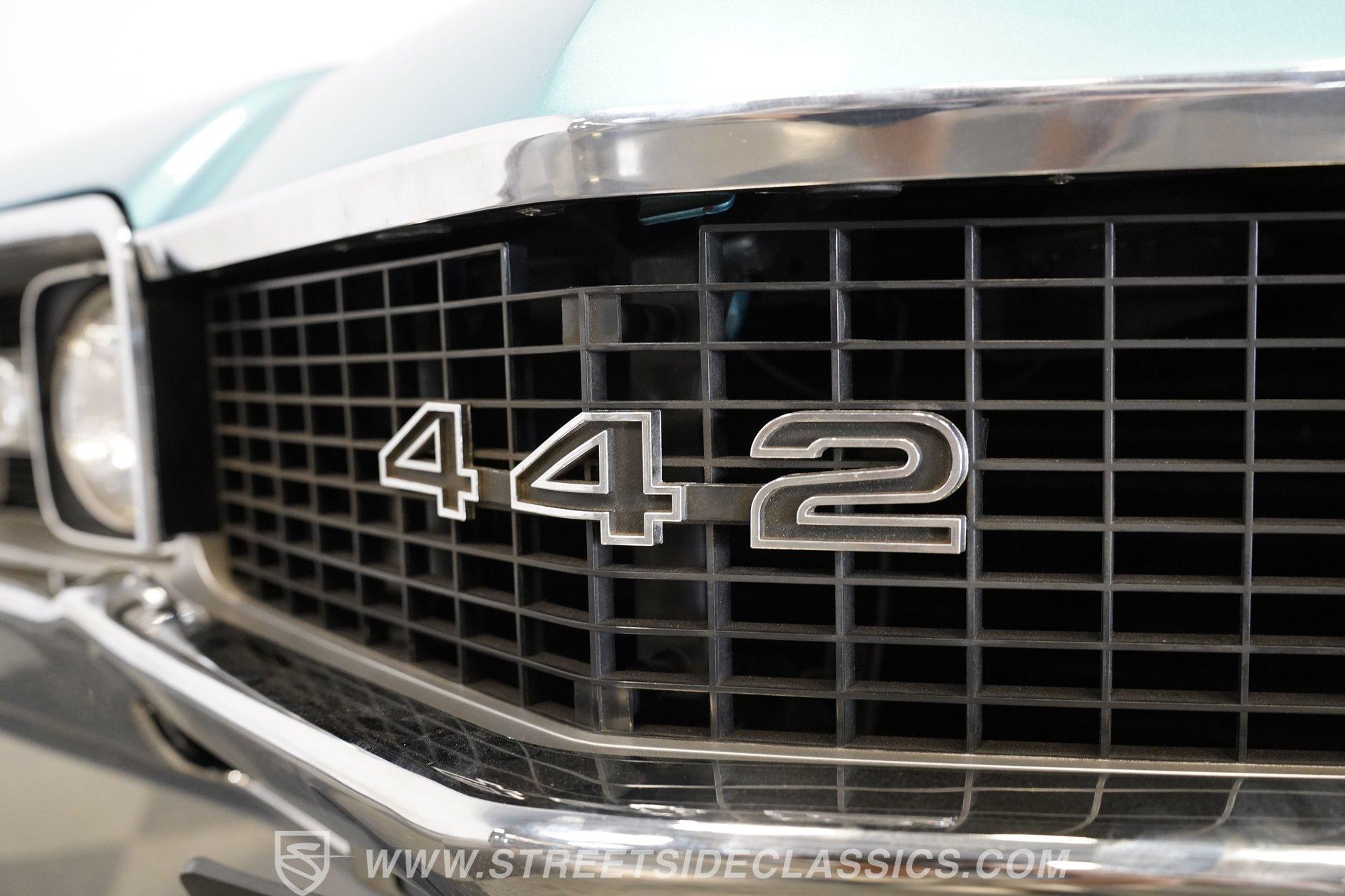 This 1968 Oldsmobile 442 hardtop has one of the most dominating widebody stances ever, and under the hood is its numbers-matching 400 V8 to back up its looks. And with a cool color combo, a great driving attitude, and factory correct restoration, it makes for an irresistible total package. 1968 was the debut of the second generation 442. No longer just an offshoot of the Cutlass, the muscle car celebrated its independence with one of the most intimidating designs of the 60s. Sure, it still carried much of the same overall appearance as its Olds A-body siblings, but the flared fenders, rounded rear, and long pillarless Holiday hardtop silhouette all look so much better in muscle car form. Plus, when you have that dark grille with the bold 442 badging in the middle of the wide dual headlight housings, it just makes for a truly sinister machine. As a true Oldsmobile, this never loses its premium touches. For example, there's a trim line that starts at the headlights and highlights the curves of the profile all the way through the door line. Finished correctly in Ocean Turquoise Metallic, this car has the proper 442 side stripes, but they are painted on and cleared over for a smooth permanence. The stripes work well with the correct Provincial White roof that looks like a vinyl top, but it's really painted for a glossy and easily maintained style. It makes for a full package that's thoughtfully detailed, right down to the shine of the form-hugging bumpers. All the white accents of the exterior get you ready for the full white interior. The clean look of the correct pleated vinyl on the seats and door panels looks great. The interior features factory air conditioning and is all done to factory specifications, right down to the working stock AM radio. An upgraded wood-rimmed sports steering wheel gives you a clear view of the sporty round gauge package. Under the hood is a numbers-matching V8 in this American muscle icon. Part of the fun of owning a '68 is getting to tell the story about how the 400 cubic-inch motor was the maximum GM would allow in its production intermediates at the time. This one looks terrific with the full cooper-colored engine and distinctive 442 air red cleaner, and an overall clean and correct setup that signals this has been given proper care. The mighty V8 inhales deeply with a four-barrel carburetor, and it exhales with a sweet sound out of the rumbling dual exhaust. As a true Oldsmobile, this is built to balance power and comfort. A stout TH400 three-speed automatic transmission, power steering, power brakes, a limited-slip rear, and sway bars front & rear add to the pleasurable driving experience. HIGHLIGHTS: Matching Number 400 Cubic Inch Engine TH400 Automatic Transmission 12-Bolt Limited-Slip Rear End Dual Exhaust Correct 14-Inch Super Stock Wheels F70-14 Firestone Super Sport Redline Tires Restored to a High Standard and to Original Specifications Original Working AM Radio Optional Fender Stripes Correct Ocean Turquoise Metallic Paint with Provincial White Painted Roof Power Brakes Power Steering Air Conditioning This classic 1968 Oldsmobile 442 hardtop has been restored to a high standard of quality and authenticity. If you appreciate these rarely found qualities in a classic muscle car, don't let this one slip away. Call today!