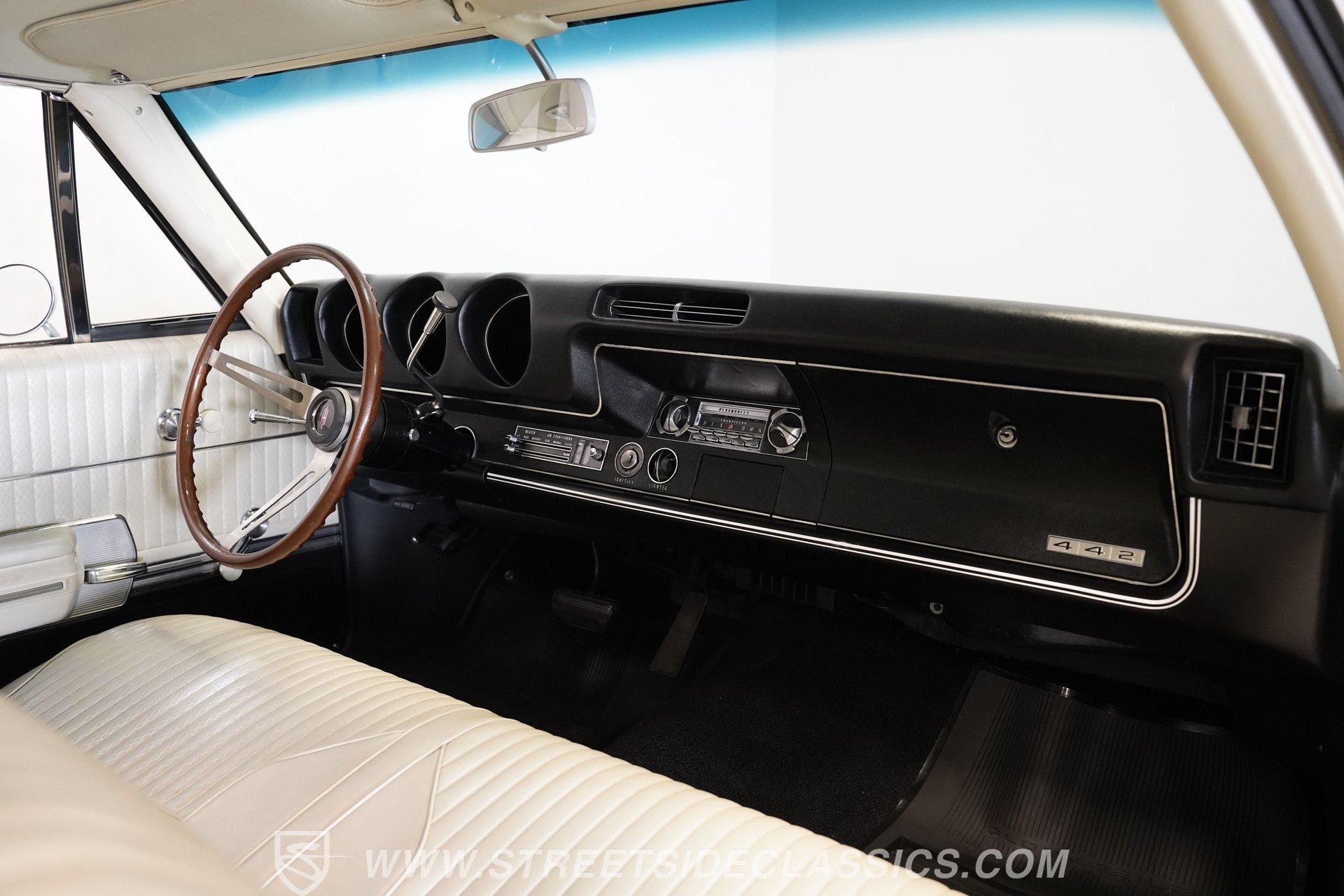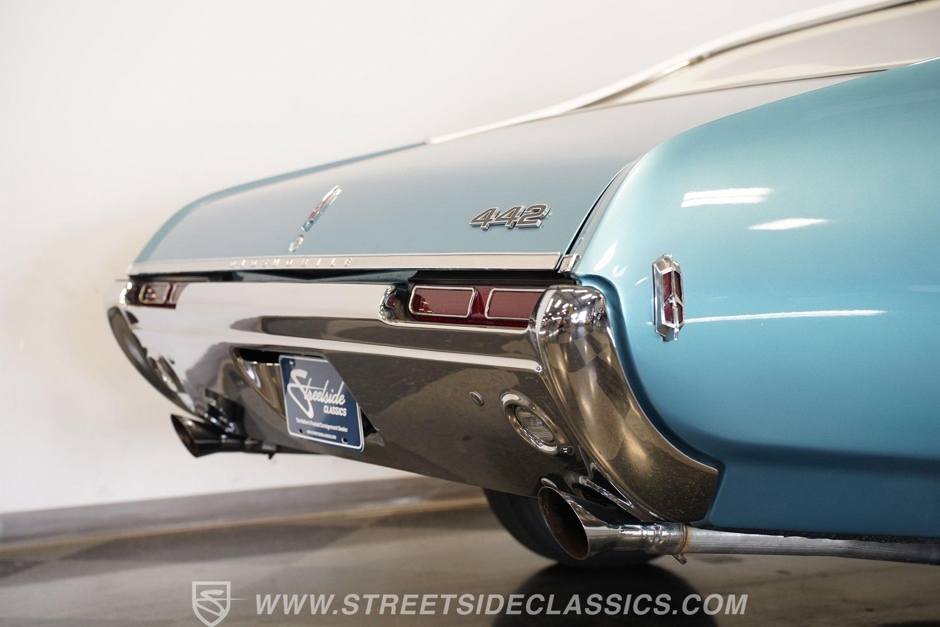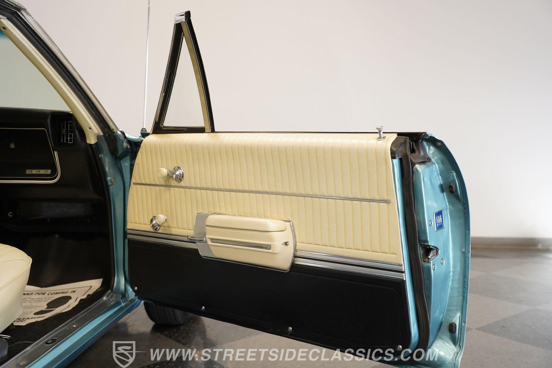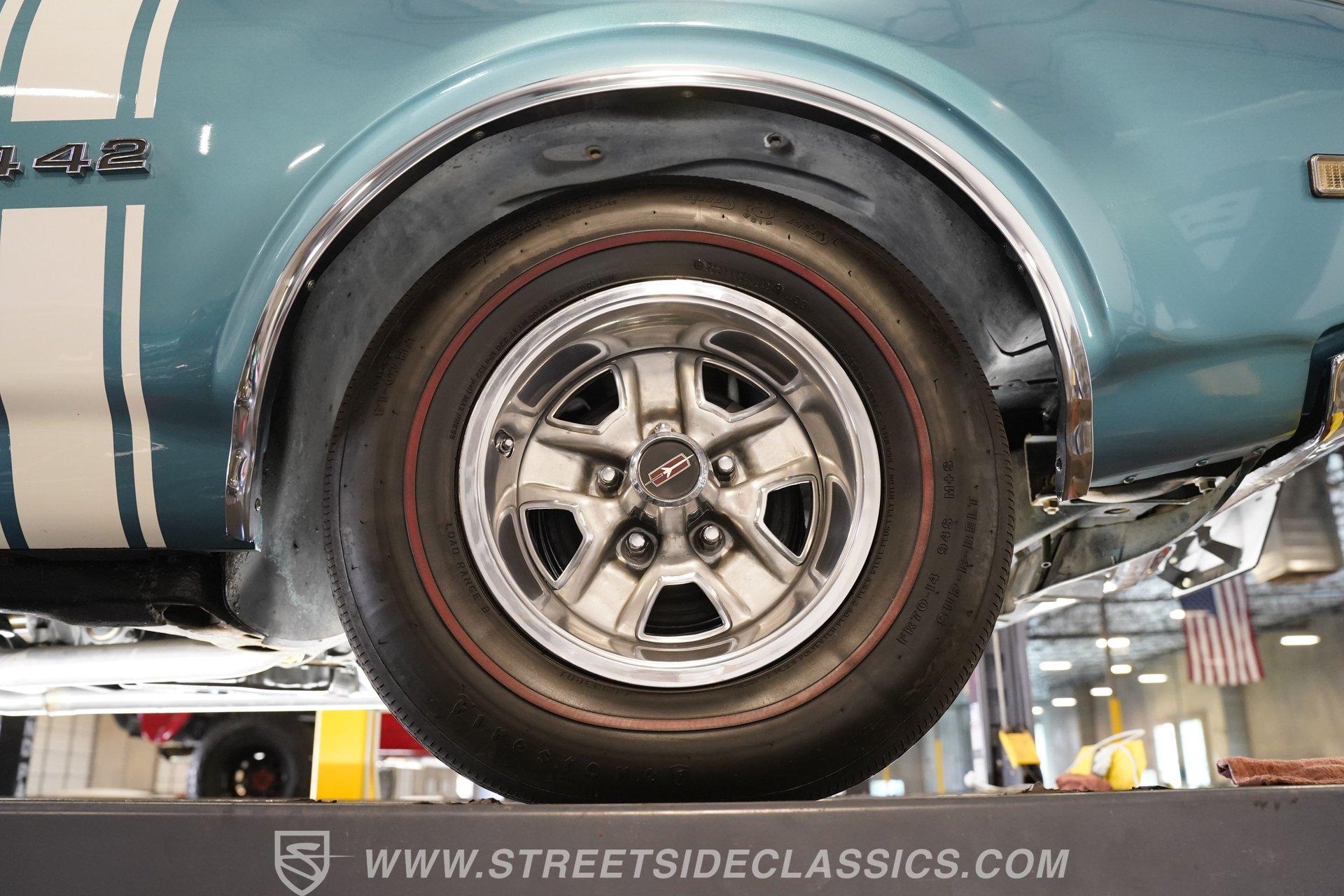 This 1968 Oldsmobile 442 hardtop has one of the most dominating widebody stances ever, and under the hood is its numbers-matching 400 V8 to back up its looks. And with a cool color combo, a great driving attitude, and factory correct restoration, it makes for an irresistible total package. 1968 was the debut of the second generation 442. No longer just an offshoot of the Cutlass, the muscle car celebrated its independence with one of the most intimidating designs of the 60s. Sure, it still carried much of the same overall appearance as its Olds A-body siblings, but the flared fenders, rounded rear, and long pillarless Holiday hardtop silhouette all look so much better in muscle car form. Plus, when you have that dark grille with the bold 442 badging in the middle of the wide dual headlight housings, it just makes for a truly sinister machine. As a true Oldsmobile, this never loses its premium touches. For example, there's a trim line that starts at the headlights and highlights the curves of the profile all the way through the door line. Finished correctly in Ocean Turquoise Metallic, this car has the proper 442 side stripes, but they are painted on and cleared over for a smooth permanence. The stripes work well with the correct Provincial White roof that looks like a vinyl top, but it's really painted for a glossy and easily maintained style. It makes for a full package that's thoughtfully detailed, right down to the shine of the form-hugging bumpers. All the white accents of the exterior get you ready for the full white interior. The clean look of the correct pleated vinyl on the seats and door panels looks great. The interior features factory air conditioning and is all done to factory specifications, right down to the working stock AM radio. An upgraded wood-rimmed sports steering wheel gives you a clear view of the sporty round gauge package. Under the hood is a numbers-matching V8 in this American muscle icon. Part of the fun of owning a '68 is getting to tell the story about how the 400 cubic-inch motor was the maximum GM would allow in its production intermediates at the time. This one looks terrific with the full cooper-colored engine and distinctive 442 air red cleaner, and an overall clean and correct setup that signals this has been given proper care. The mighty V8 inhales deeply with a four-barrel carburetor, and it exhales with a sweet sound out of the rumbling dual exhaust. As a true Oldsmobile, this is built to balance power and comfort. A stout TH400 three-speed automatic transmission, power steering, power brakes, a limited-slip rear, and sway bars front & rear add to the pleasurable driving experience. HIGHLIGHTS: Matching Number 400 Cubic Inch Engine TH400 Automatic Transmission 12-Bolt Limited-Slip Rear End Dual Exhaust Correct 14-Inch Super Stock Wheels F70-14 Firestone Super Sport Redline Tires Restored to a High Standard and to Original Specifications Original Working AM Radio Optional Fender Stripes Correct Ocean Turquoise Metallic Paint with Provincial White Painted Roof Power Brakes Power Steering Air Conditioning This classic 1968 Oldsmobile 442 hardtop has been restored to a high standard of quality and authenticity. If you appreciate these rarely found qualities in a classic muscle car, don't let this one slip away. Call today!