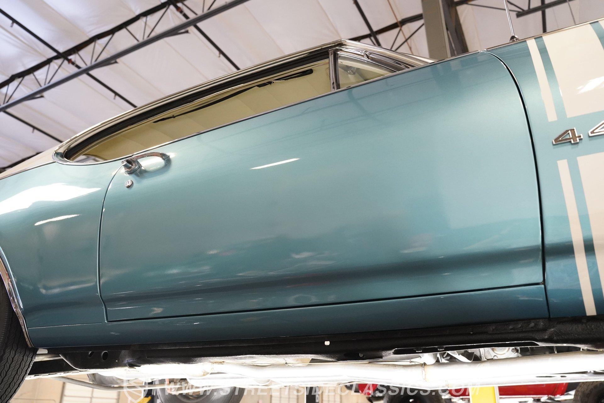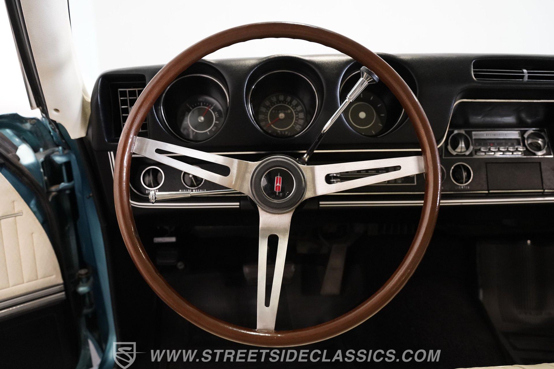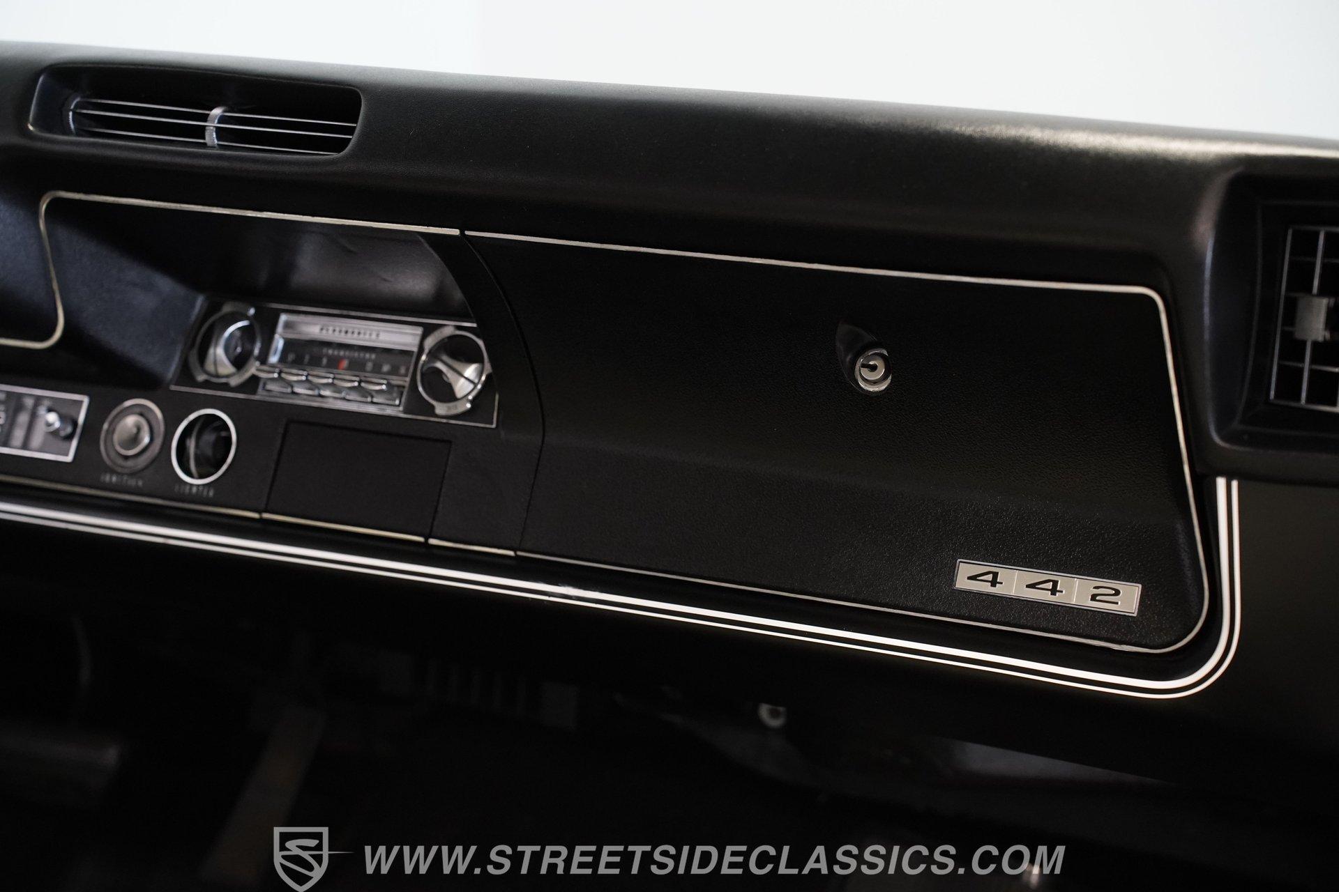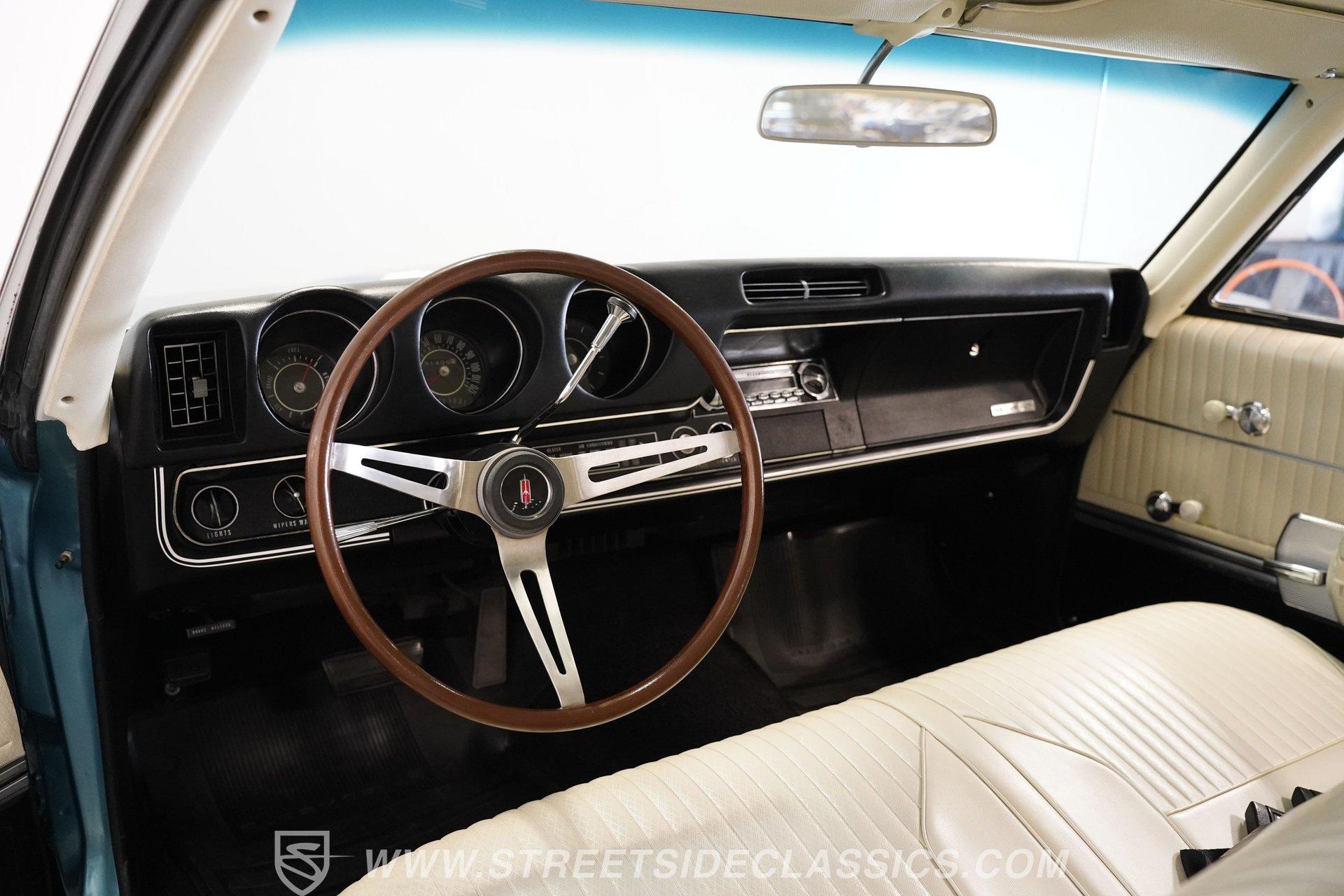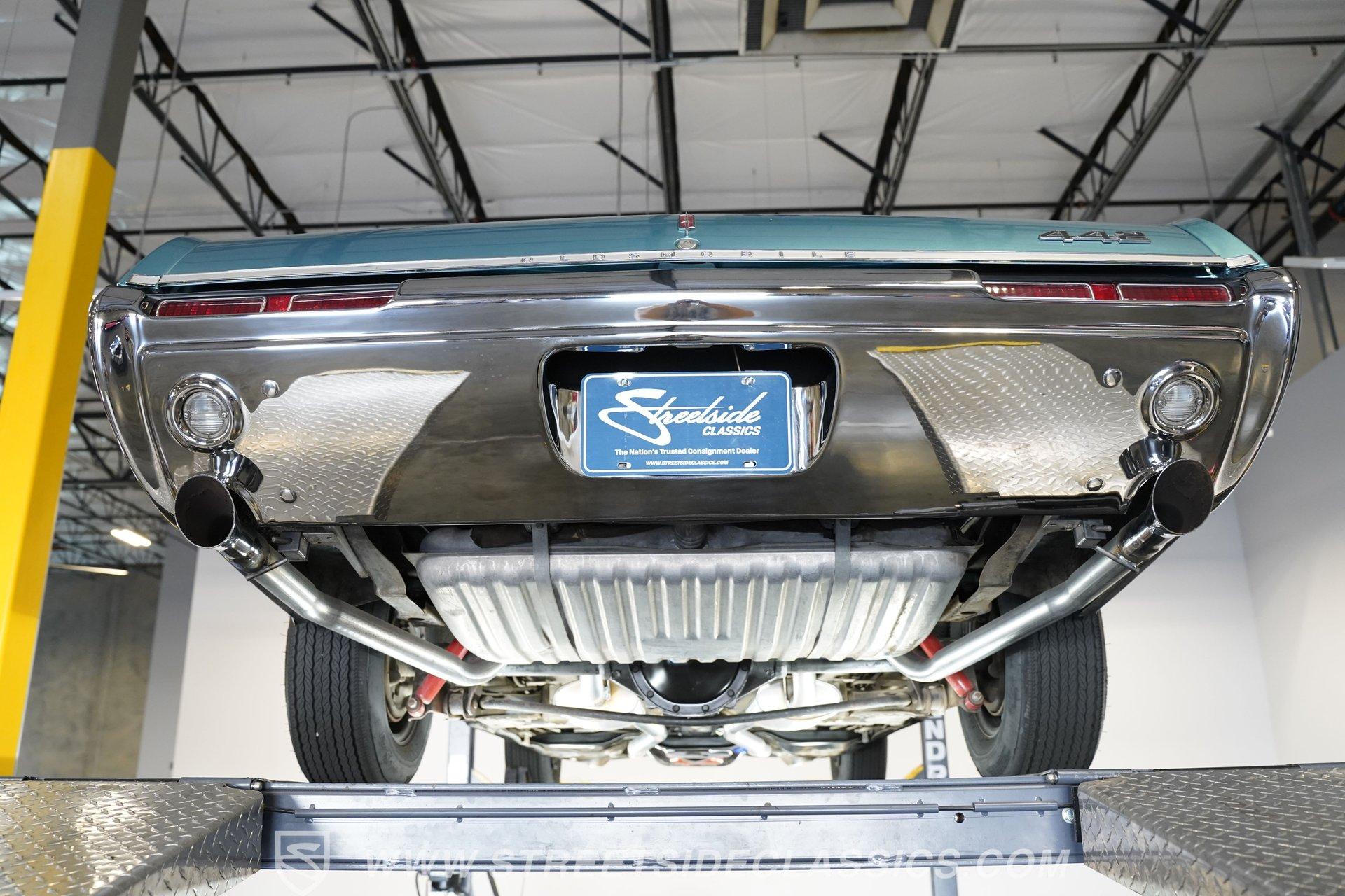 This 1968 Oldsmobile 442 hardtop has one of the most dominating widebody stances ever, and under the hood is its numbers-matching 400 V8 to back up its looks. And with a cool color combo, a great driving attitude, and factory correct restoration, it makes for an irresistible total package. 1968 was the debut of the second generation 442. No longer just an offshoot of the Cutlass, the muscle car celebrated its independence with one of the most intimidating designs of the 60s. Sure, it still carried much of the same overall appearance as its Olds A-body siblings, but the flared fenders, rounded rear, and long pillarless Holiday hardtop silhouette all look so much better in muscle car form. Plus, when you have that dark grille with the bold 442 badging in the middle of the wide dual headlight housings, it just makes for a truly sinister machine. As a true Oldsmobile, this never loses its premium touches. For example, there's a trim line that starts at the headlights and highlights the curves of the profile all the way through the door line. Finished correctly in Ocean Turquoise Metallic, this car has the proper 442 side stripes, but they are painted on and cleared over for a smooth permanence. The stripes work well with the correct Provincial White roof that looks like a vinyl top, but it's really painted for a glossy and easily maintained style. It makes for a full package that's thoughtfully detailed, right down to the shine of the form-hugging bumpers. All the white accents of the exterior get you ready for the full white interior. The clean look of the correct pleated vinyl on the seats and door panels looks great. The interior features factory air conditioning and is all done to factory specifications, right down to the working stock AM radio. An upgraded wood-rimmed sports steering wheel gives you a clear view of the sporty round gauge package. Under the hood is a numbers-matching V8 in this American muscle icon. Part of the fun of owning a '68 is getting to tell the story about how the 400 cubic-inch motor was the maximum GM would allow in its production intermediates at the time. This one looks terrific with the full cooper-colored engine and distinctive 442 air red cleaner, and an overall clean and correct setup that signals this has been given proper care. The mighty V8 inhales deeply with a four-barrel carburetor, and it exhales with a sweet sound out of the rumbling dual exhaust. As a true Oldsmobile, this is built to balance power and comfort. A stout TH400 three-speed automatic transmission, power steering, power brakes, a limited-slip rear, and sway bars front & rear add to the pleasurable driving experience. HIGHLIGHTS: Matching Number 400 Cubic Inch Engine TH400 Automatic Transmission 12-Bolt Limited-Slip Rear End Dual Exhaust Correct 14-Inch Super Stock Wheels F70-14 Firestone Super Sport Redline Tires Restored to a High Standard and to Original Specifications Original Working AM Radio Optional Fender Stripes Correct Ocean Turquoise Metallic Paint with Provincial White Painted Roof Power Brakes Power Steering Air Conditioning This classic 1968 Oldsmobile 442 hardtop has been restored to a high standard of quality and authenticity. If you appreciate these rarely found qualities in a classic muscle car, don't let this one slip away. Call today!
