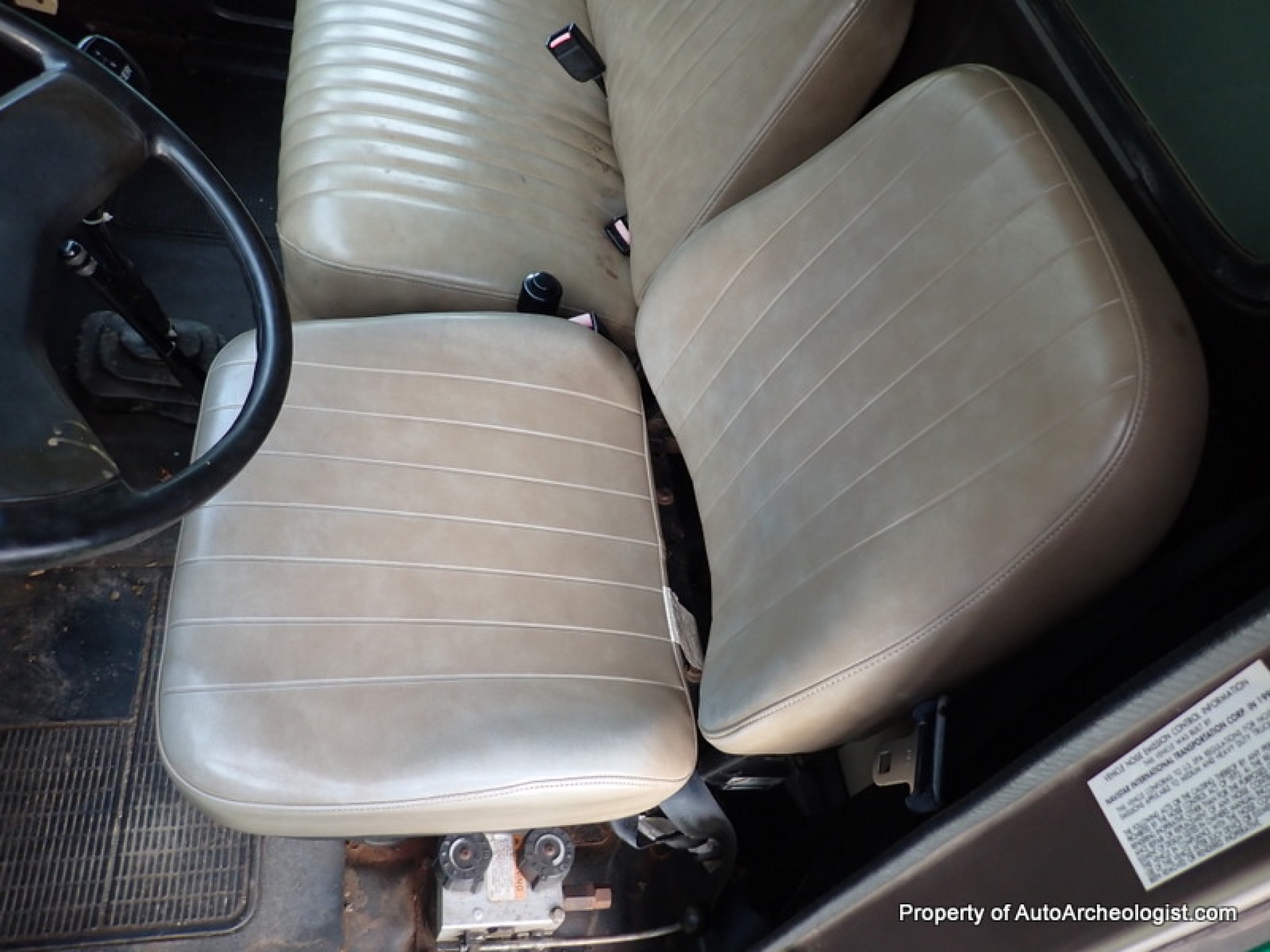 This has the fiberglass tilt front, air ride driver seat, 5 speed Spicer manual transmission with splitter, throttle handle, 2-3 person bench seat, AC (no belts but compressor turns) , tinted glass, 50 gallon fuel tank and cab lights.