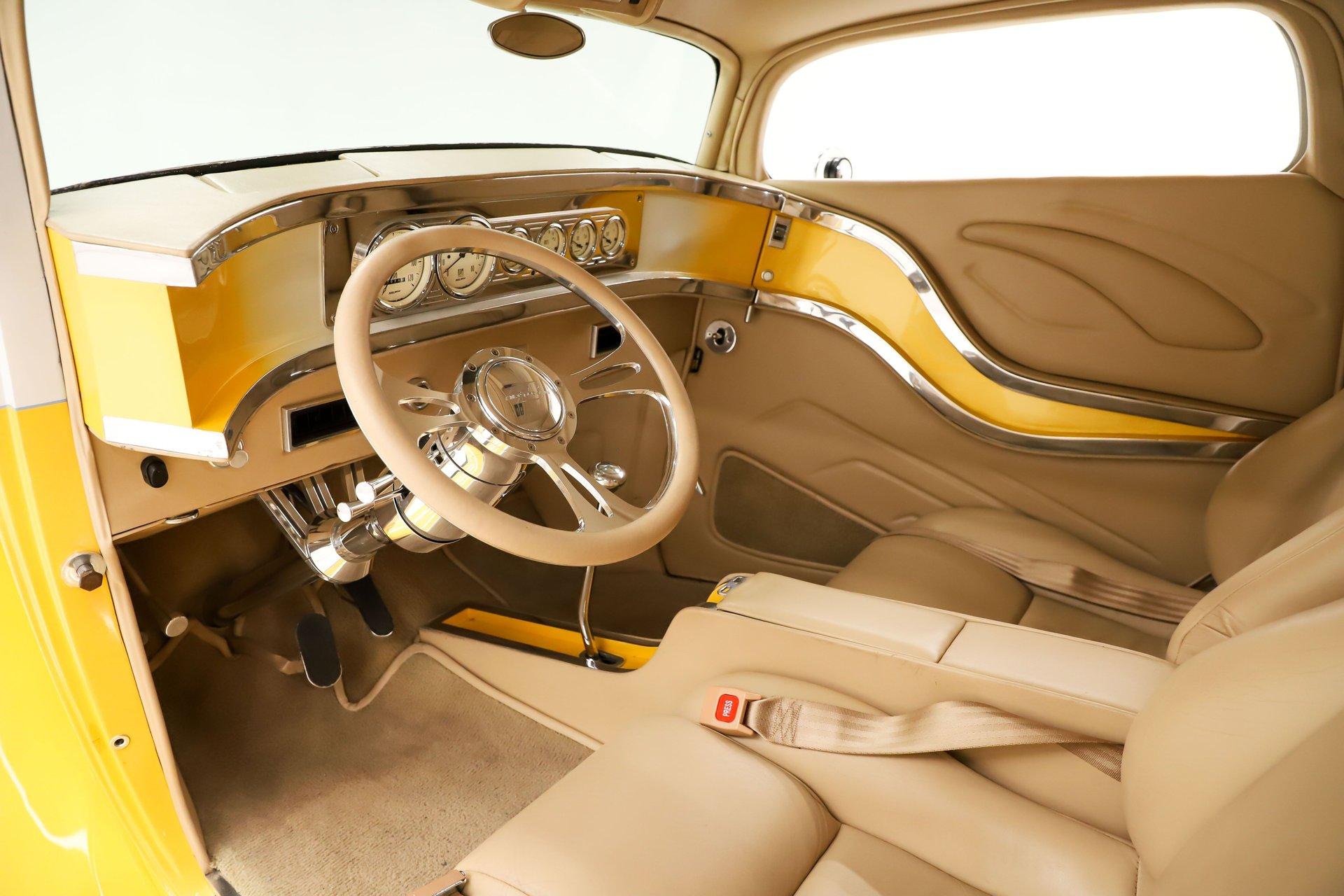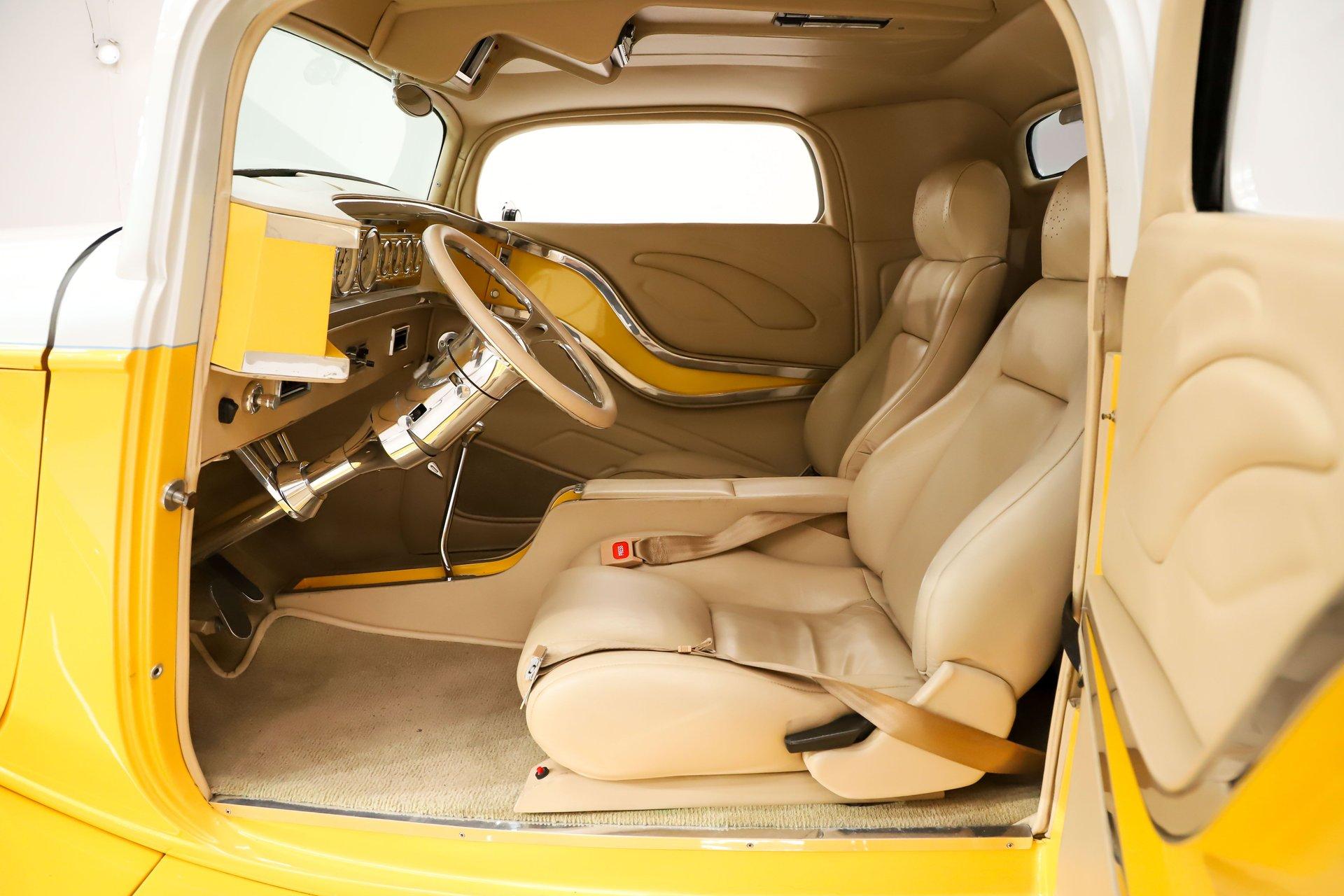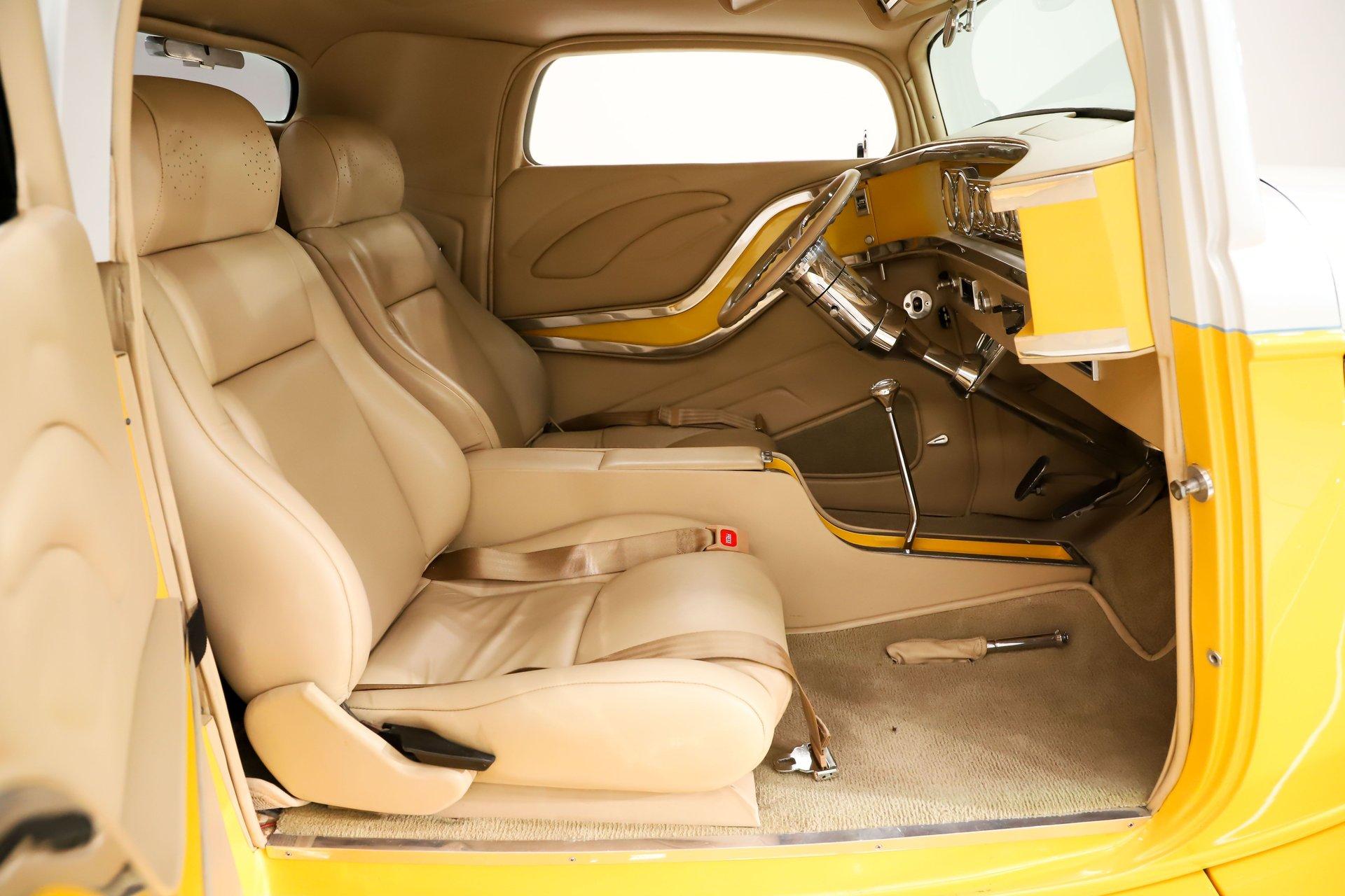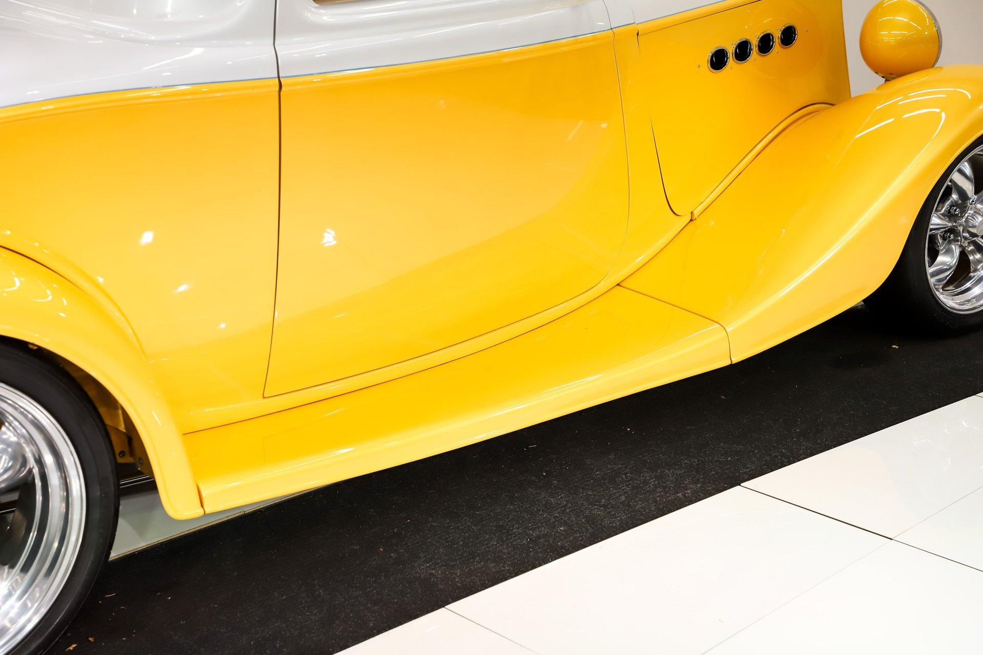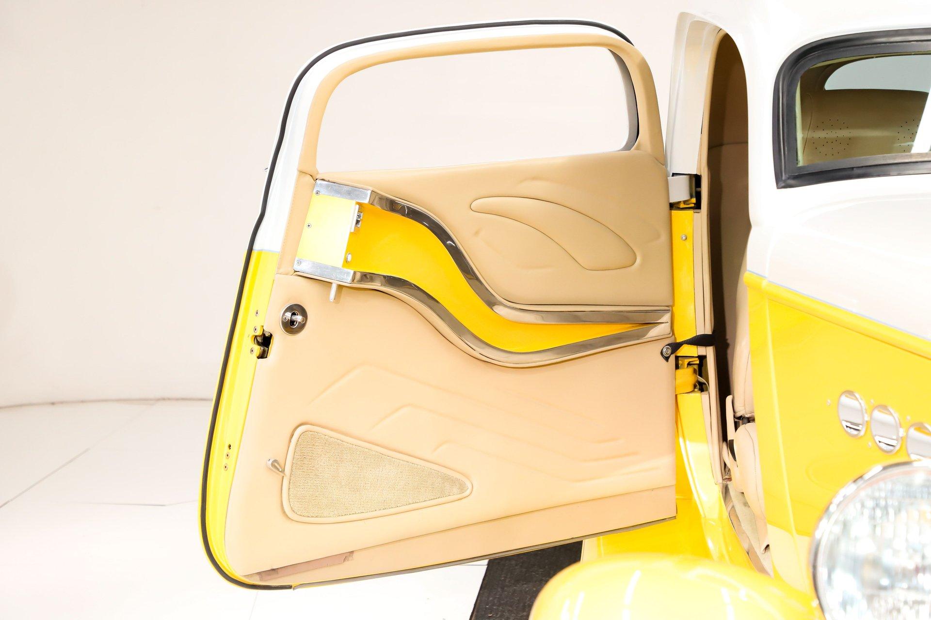 Celebrating our 65 year anniversary! This family owned and operated business was established in 1960, making us the oldest classic car dealership in America. Special thank you to all our customers for entrusting us to park the car of your dreams in your driveway while preserving automotive history for future generations to embrace and enjoy. -Grams family & Volo Museum staff INTRODUCTION: Even more spectacular in person, the pearl colors dance in the sunlight. This was professionally built in Las Vegas and featured as the cover car and center spread in Rods & Rides magazine. EXTERIOR: The timeless hot rod: a chopped 3 window coupe with suicide doors! This one is a full fendered Downs body that's all smooth, straight, solid and fits great. The doors open by a remote key fob. The paint is stunning in person because both colors are pearl. The white pearl and golden yellow pearl is broken up with a thin blue pinstripe. The paint is a beautiful, quality job that was laid out properly and polished smoothly. It has picked up just a few nicks/chips while being enjoyed. It has full size headlights with Ford script lenses and in back it has LED taillights and a 3rd brake light in the window. The glass has a light smoked tint, the windows are power. The rear splash pan has a recessed license plate and a flush mount fuel door. It's rolling on staggered size polished Torque Thrust wheels, 17s in front and 20s in back for that hot rod stance. They are wearing performance tires. INTERIOR: This interior has been taken to the next level with some very stylish custom features. The custom dash flows right onto the door panels and the console is designed to match. Everything that is soft is wrapped in genuine leather. The entire inside of the cab is sculpted and upholstered, the custom sport seats feel great. Down on the floor it has custom cut carpet with leather bound edges, along with seatbelts, a chrome e-brake lever and a polished Lokar shifter. It had a new set of AutoMeter gauges in a polished billet instrument panel. The Vintage Air controls and vents are very clean and simple. The tilt column is polished and has a Billet Specialties steering wheel. Overhead is a console that has interior lights, a stereo and a back up camera screen. ENGINE COMPARTMENT: A potent 383 stroker motor sits under this hood! It has a polished aluminum Edelbrock intake with a dual feed Holley carb, a billet distributor and a set of headers. It's dressed up with a matched set of polished aluminum air cleaner, valve covers and breathers. It runs cool with the big polished aluminum radiator. There's a number of other polished components as well and the engine bay is painted slick. TRUNK COMPARTMENT: It has a power lift trunk lid and once you look inside you'll see all the custom work. It's completely boxed and upholstered including under the trunk lid. The floor is carpeted. UNDERSIDE: This car is sitting on an Outlaw chassis. The frame is boxed and smoothed with tubular supports. Upfront it utilizes a Heidts independent suspension with polished tubular control arms, coilover adjustable gas shocks and rack & pinion steering. In back it has a 4 link system with polished tubular control arms and coilover adjustable gas shocks. The great sound comes from the exhaust with stainless pipes going into Dynamax mufflers and turndown tailpipes. It gets its stopping power from disc brakes at all 4 wheels with polished calipers, there is an e-brake system too. A composite fuel tank stores the petrol. There are remote battery terminals and a disconnect switch. Looking up at the motor it has a chrome high torque starter and flywheel cover. The trans is a 700R4 overdrive automatic with a remote oil cooler. The driveshaft leads back to a 9 inch rear. There is an abundance of glossy yellow paint under this car and it is still very clean. SERVICE: We take pride in our cars and reputation. Therefore, we built a 2 million dollar, 10,000 square ft service center, and hired a team of technicians to service the essentials on every car we sell. CONCLUSION: It was built to a show quality standard then it was shown, driven and enjoyed which is exactly what you should do! For nearly 30 years, I, Jay Grams, have personally written the highlights for almost every car in our collection. What I provide is my professional opinion based on my experience with these vehicles. However, opinions can vary, and I strongly recommend a personal inspection to form your own view. Our sales team is always available to answer any questions you may have. One great option is to request a personalized walk-around video, where we can showcase the car and share our team’s insights. **Our cars are displayed within a museum setting. If you are interested in a specific vehicle, please schedule an appointment with a salesperson to view it. Without an appointment, there is an admission fee to enter the showroom. If you decide to purchase a car, your admission will be refunded, and you'll receive a one-year museum membership. ☎️ 815 385 3644 9-5 central ? Sales@volocars.com Answered ASAP Air conditioning 4 wheel disc brakes Leather upholstery Power windows Stereo Tilt wheel Console Back up camera Remote doors Power lift trunk Torque Thrust wheels