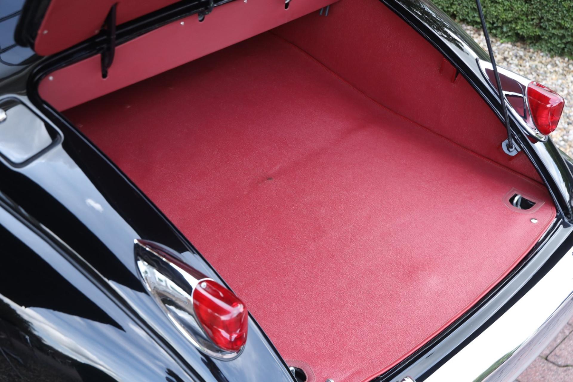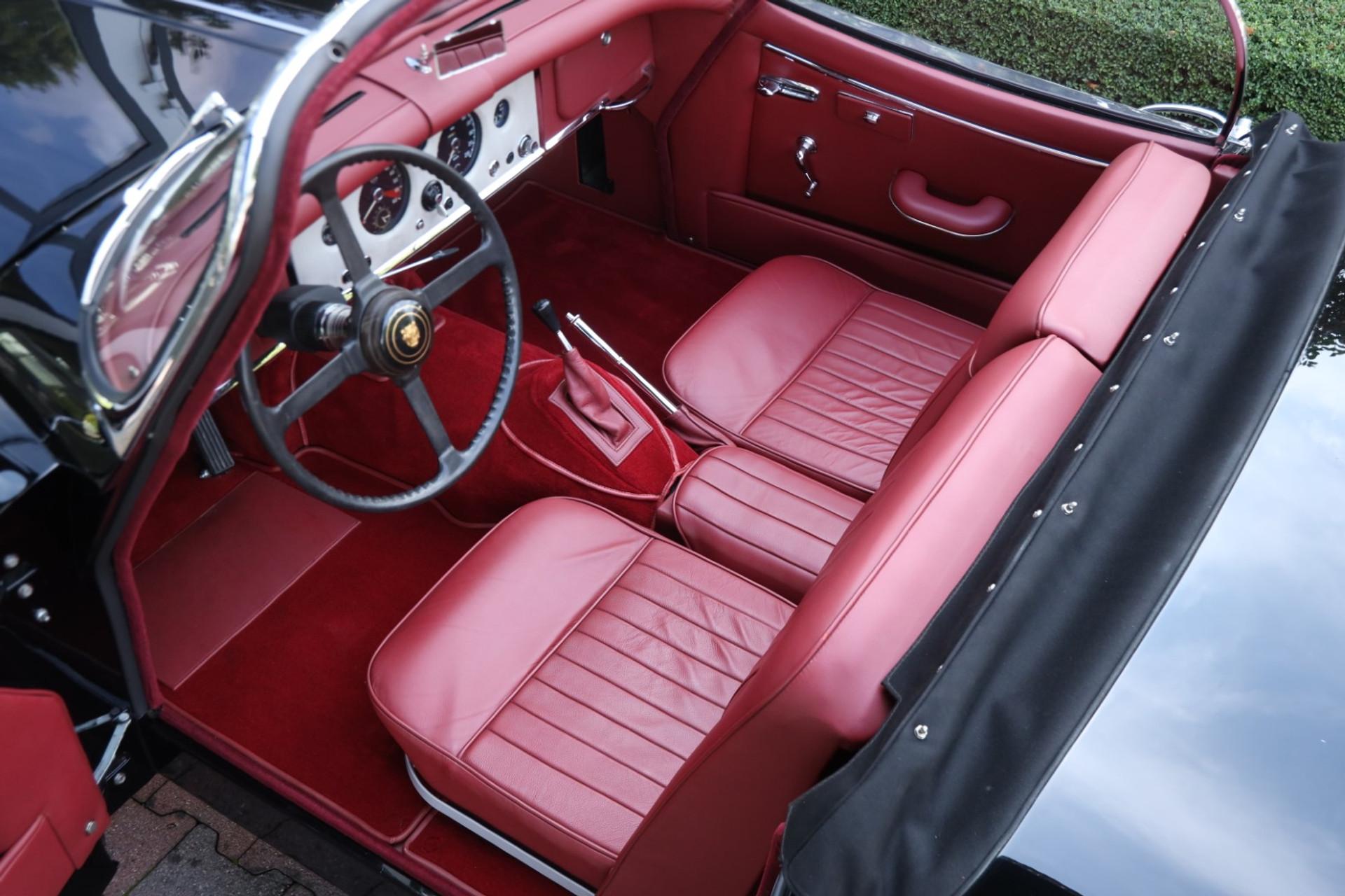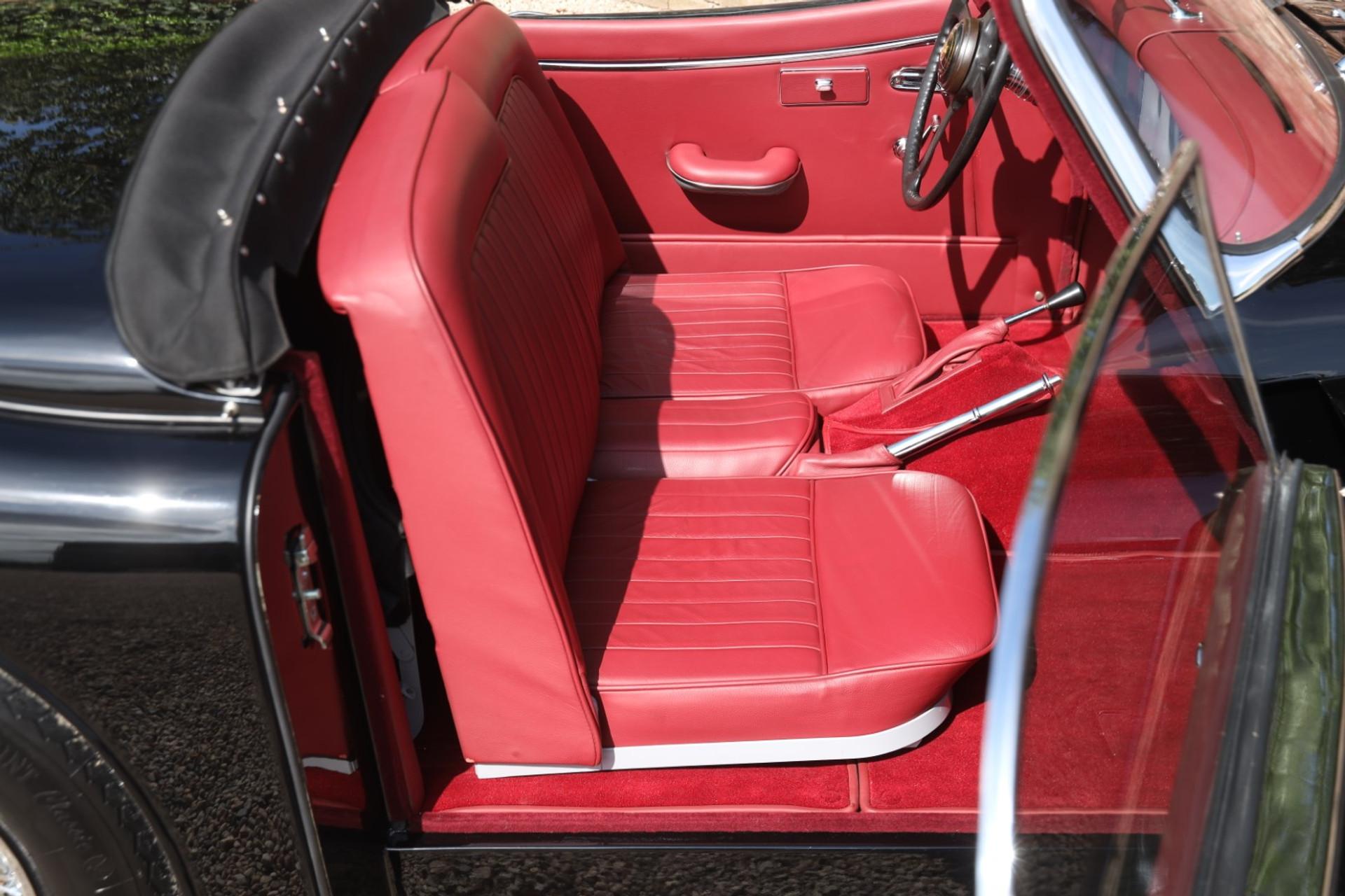 The restoration is carefully documented with photos and invoices, offering transparency on the work carried out. Its specification is timeless and elegant: a deep black exterior paired with a rich red leather interior, giving the roadster a distinctive character.