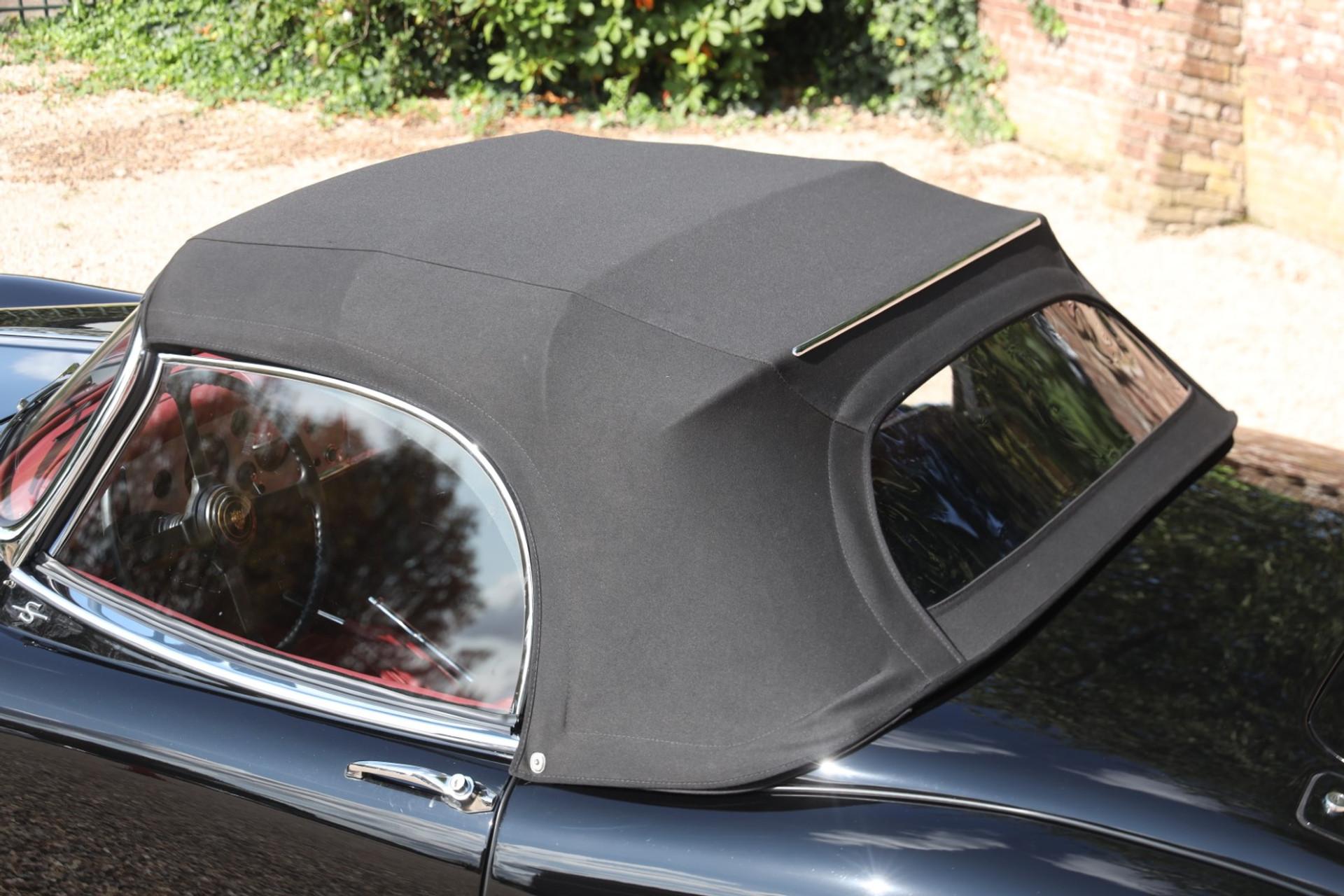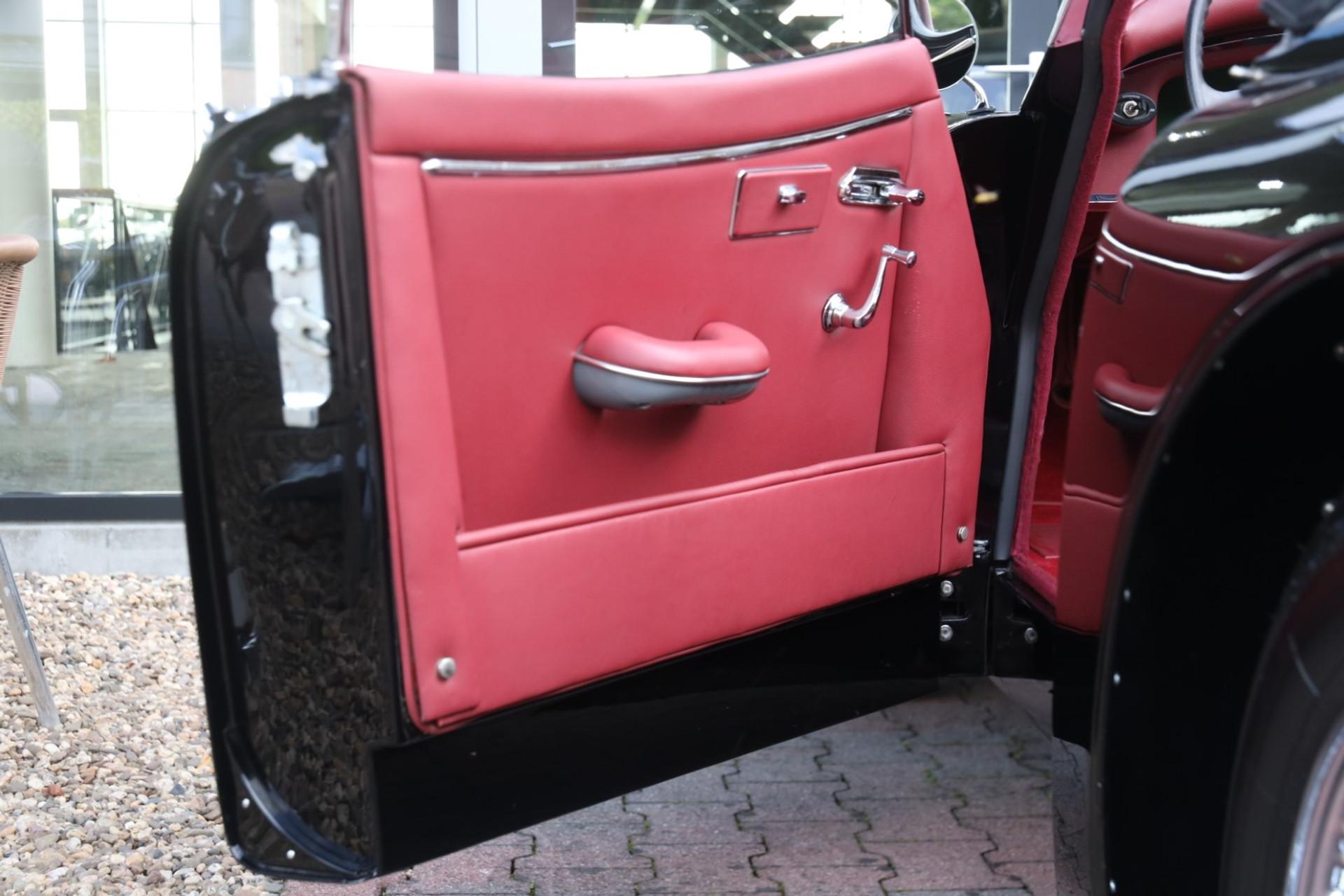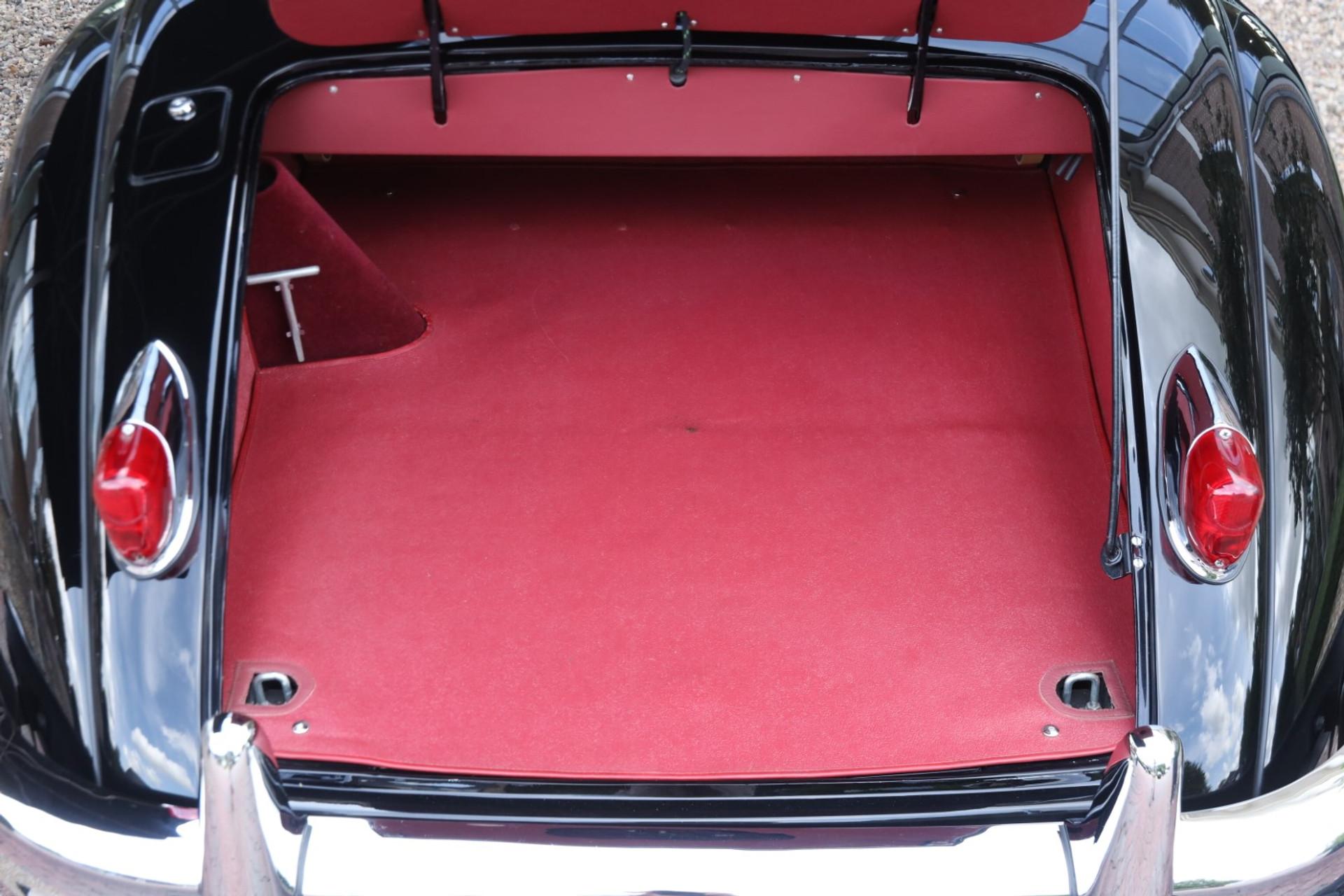 The restoration is carefully documented with photos and invoices, offering transparency on the work carried out. Its specification is timeless and elegant: a deep black exterior paired with a rich red leather interior, giving the roadster a distinctive character.