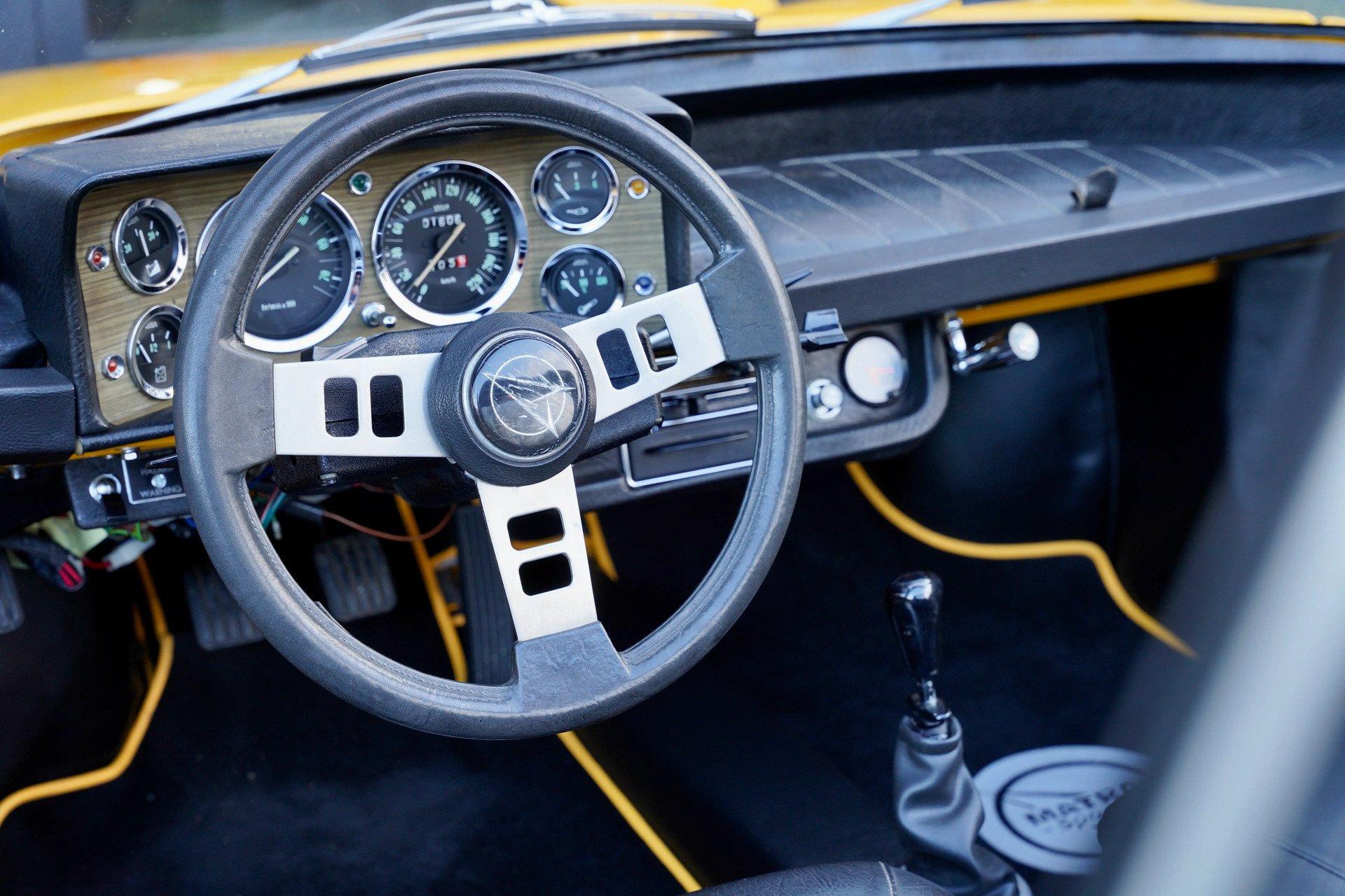 Slip into the interior, and you'll find a low, sporty seating position on well-kept seats. The carpeting is neat looking, the steering wheel is handsome, and the dashboard remains in good shape. Turn the key, and you're greeted by the unmistakable Ford exhaust note, though it's certainly different from what you might be used to—after all, with a mid-mounted engine, the driving experience feels entirely distinct. This playful design and the low seating position, combined with the mid-engine layout, are sure to put a big smile on your face. Thanks to the overhaul work, this Matra drives splendidly: the clutch pedal is easily manageable, and the shifting is precise. Ultimately, it's about the experience—its charming design and mid-engine setup make for pure fun.
