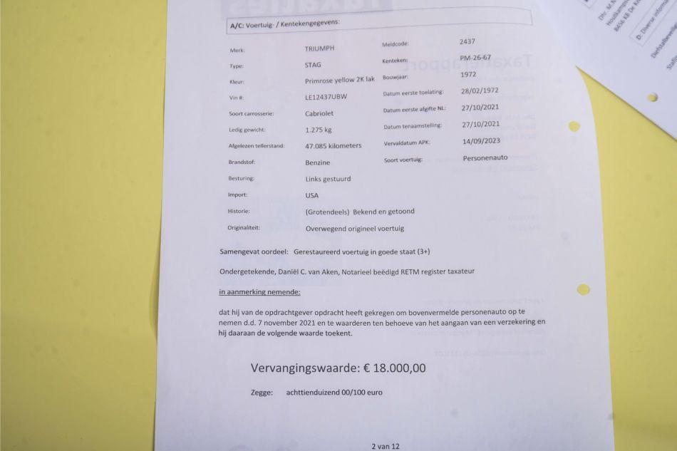 USA import in 1999, rust-free car, only put into service in the Netherlands in 2021. Underside has been completely treated and painted. Equipped with new Polyset bushings in front and rear suspension. Equipped with a new convertible roof, copper brake lines etc. With lots of history and notes. The Triumph Stag is a British convertible with V8 engine produced by Triumph Motor Company between 1970 and 1978. Designed as a luxury sports car with an elegant design and a powerful engine, the Stag was intended to compete with models such as the Mercedes-Benz SL. The Stag was equipped with an in-house developed 3.0-litre V8 engine. The engine was a 90-degree V8, with a single overhead camshaft (SOHC) per cylinder bank. The V8 originally produced about 145 hp at 5500 rpm. The Stag came with a four-speed manual transmission with optional overdrive, and an automatic transmission was also available for more comfortable driving experiences. The car featured an independent suspension all round, with coil springs for a reasonably comfortable ride. The suspension was tuned for a stable yet sporty driving experience. The Stag offered a luxurious interior for its time, with comfortable seats and attention to detail. The car featured wooden accents on the dashboard, which gave it a classic and warm feel. Instrument panel: A comprehensive instrument panel provides the driver with all the necessary information, including speedometer, tachometer, fuel gauge, and oil temperature gauge. Equipped with comfortable, leather or cloth seats with good side support, ideal for long journeys. The Stag offered surprisingly ample leg and headroom, even for taller drivers, and was praised for its seating comfort. The rear seats were small, but could be useful for short trips or extra luggage space. The Triumph Stag has achieved cult status among classic British car enthusiasts and is loved for its stylish design and unique features. The Stag has become a popular collector's item, mainly because of its unique V8 sound and its combination of a sporty convertible and practical luxury car. There are many Triumph Stag clubs and communities worldwide, sharing parts and knowledge about maintenance and restoration.