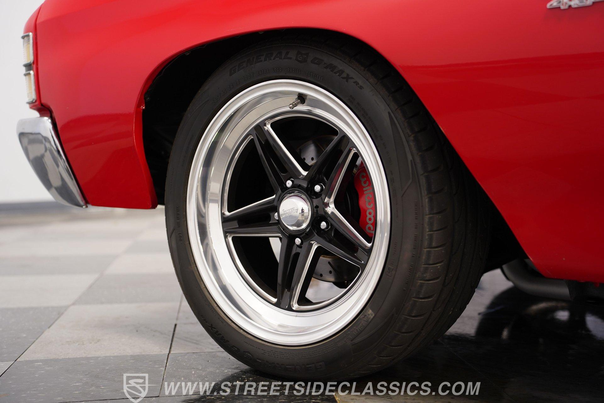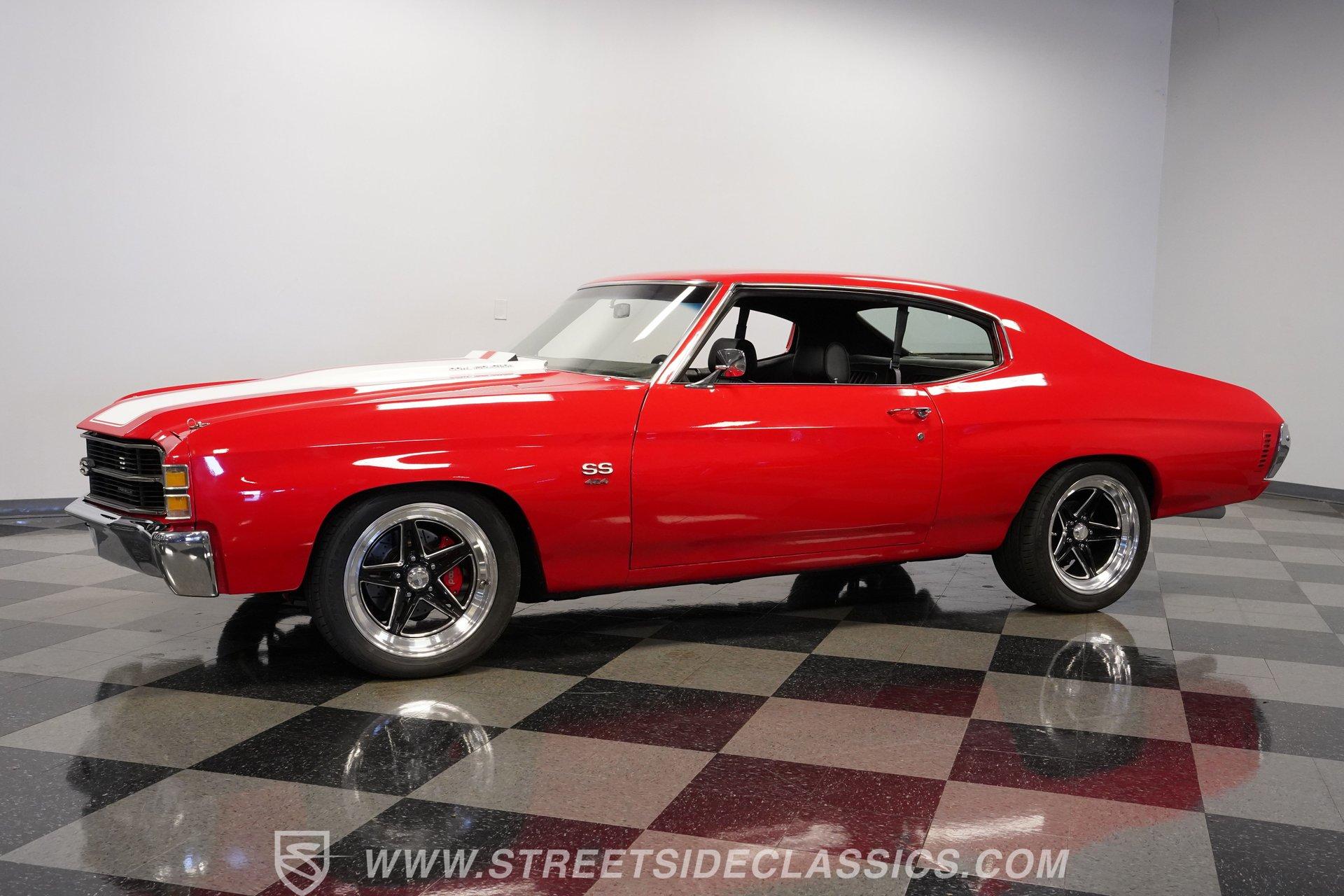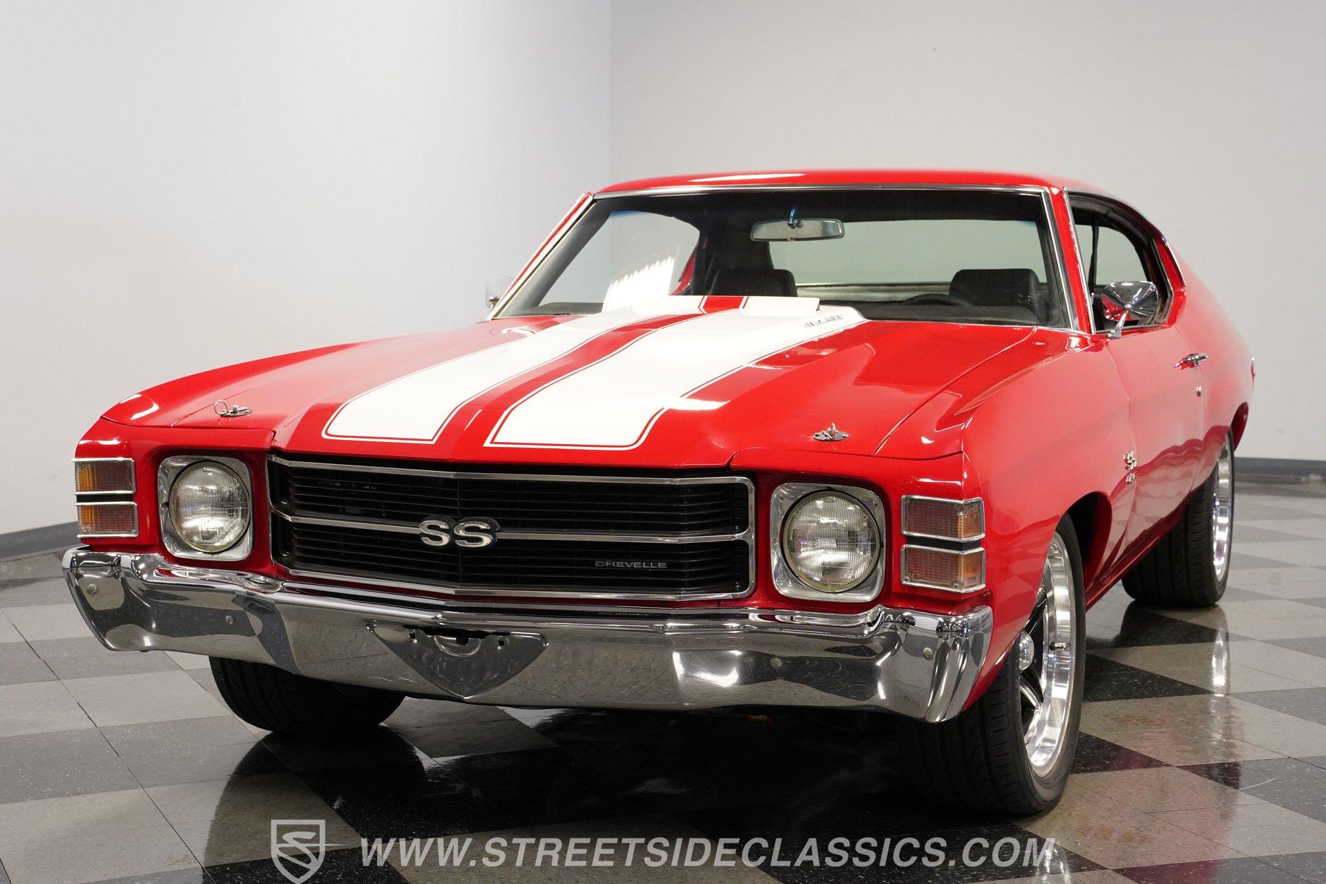 Few muscle cars command as much recognition and notoriety as the Chevelle. One look at this 1971 Chevrolet Chevelle SS 454 Tribute Restomod, and it's easy to see why this car has left an indelible mark on enthusiasts worldwide, despite being out of production since 1977. Fully repainted in a head-turning bright red complemented by a set of full-length white painted SS stripes to go along with its pinned cowl-induction hood, this Tribute shows off the aggressive lines of the Chevelle from any angle. Inside, we find a clean, redone black vinyl interior. A custom center console complete with dual cupholders separates a pair of supportive Procar bucket seats. A small power-assisted, three-spoke steering wheel sits just ahead of a six-pod Equus gauge cluster mounted on a custom 3D-printed dashboard, featuring an 8,000-rpm tachometer and a 120-mph speedometer. Gone is the old-school AM radio, and in its place is a modern Pioneer AM/FM touchscreen that offers SiriusXM, Apple CarPlay, Android Auto, and Bluetooth. At the same time, a chrome cueball shifter with the easy-to-see shift pattern really provides all the entertainment necessary for any long drive. Under the hood, we find a clean engine bay with a massive 468 cubic-inch V-8 engine on display. This bored-over big block sports lightweight AFR aluminum heads, Edelbrock Performer RPM intake, a Lunati cam, Holley Sniper EFI, Hedman long tube headers, and high-flow FlowMaster catalytic converters to help this juiced-up rat motor pump out 600 horsepower. That massive power is routed through a Tremec TKO600 five-speed manual transmission before being sent to a 3.55-geared Posi rear end, which translates those ponies to the pavement via a set of 18-inch American Racing wheels. HIGHLIGHTS: Full Bright Red Repaint White Racing Stripes Cowl Hood Hood Pins New Front End New Quarters 468 CID V8 600 HP AFR Aluminum Heads Edelbrock Performer RPM Intake Sniper EFI Long Tube Headers High Flow Cats Tremec TKO600 Five Speed Manual 3.55 Posi Power Steering BMR Control Arms BMR Sway Bar QA1 Coilovers American Racing Wheels Power Brakes Front Wilwood Disc Brakes Redone Black Vinyl Interior Procar Bucket Seats New Headliner Pioneer Touchscreen Apple CarPlay Android Auto Satellite Ready Bluetooth Custom Center Console Custom 3D Printed Dash Equus Gauges Air Conditioning Power Locks Keyless Entry This 1971 Chevrolet Chevelle SS 454 Tribute Restomod rides on a custom suspension that includes a BMR sway bar, along with matching BMR upper and lower control arms and QA1 coilovers. Power brakes featuring Wilwood front discs are ready to rein in those ponies whenever called upon. If you have been looking for a great example of one of the baddest big-block monsters from the Golden Age of muscle cars, then look no further because this is the car for you. Don't wait, call today!