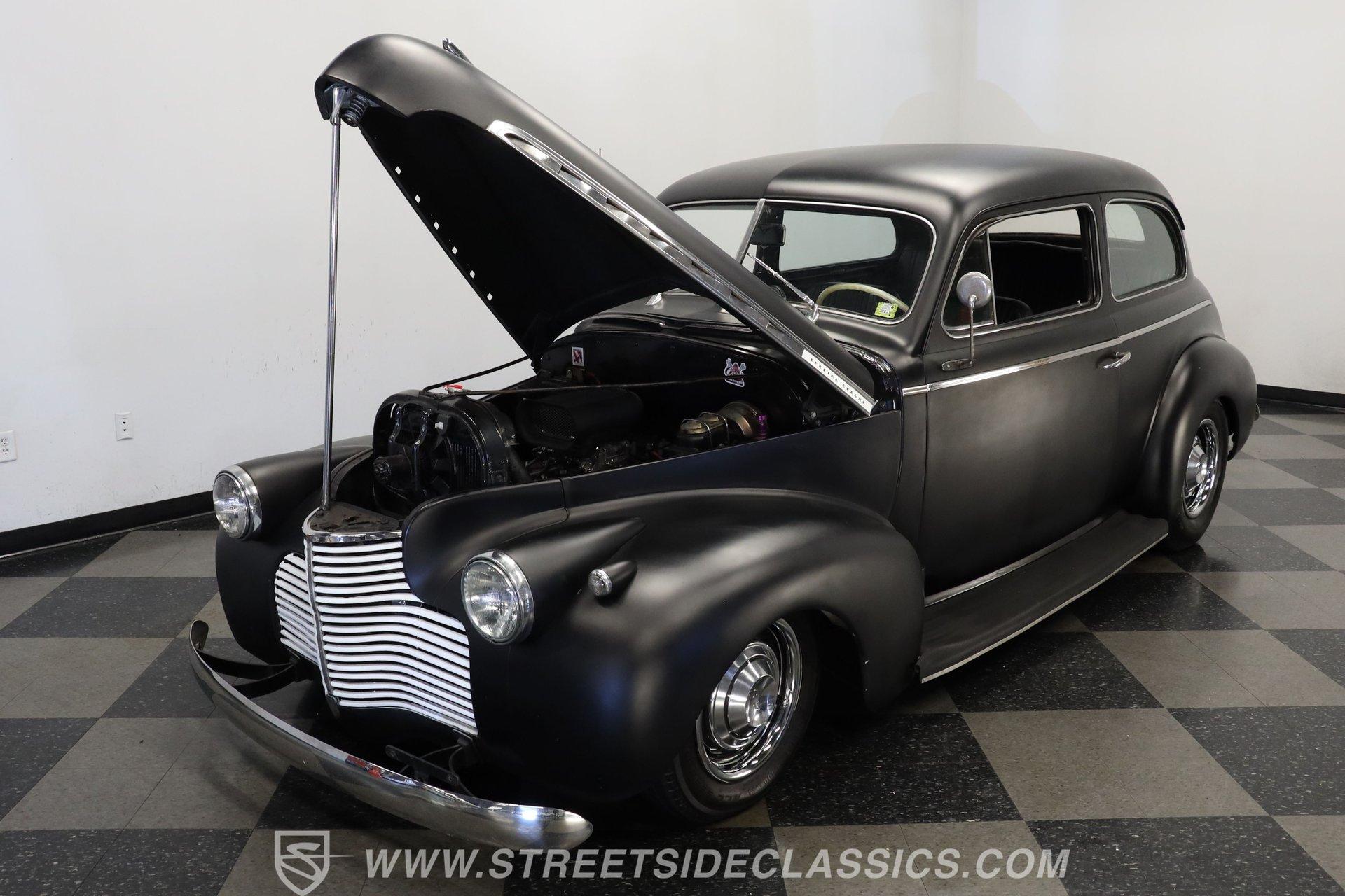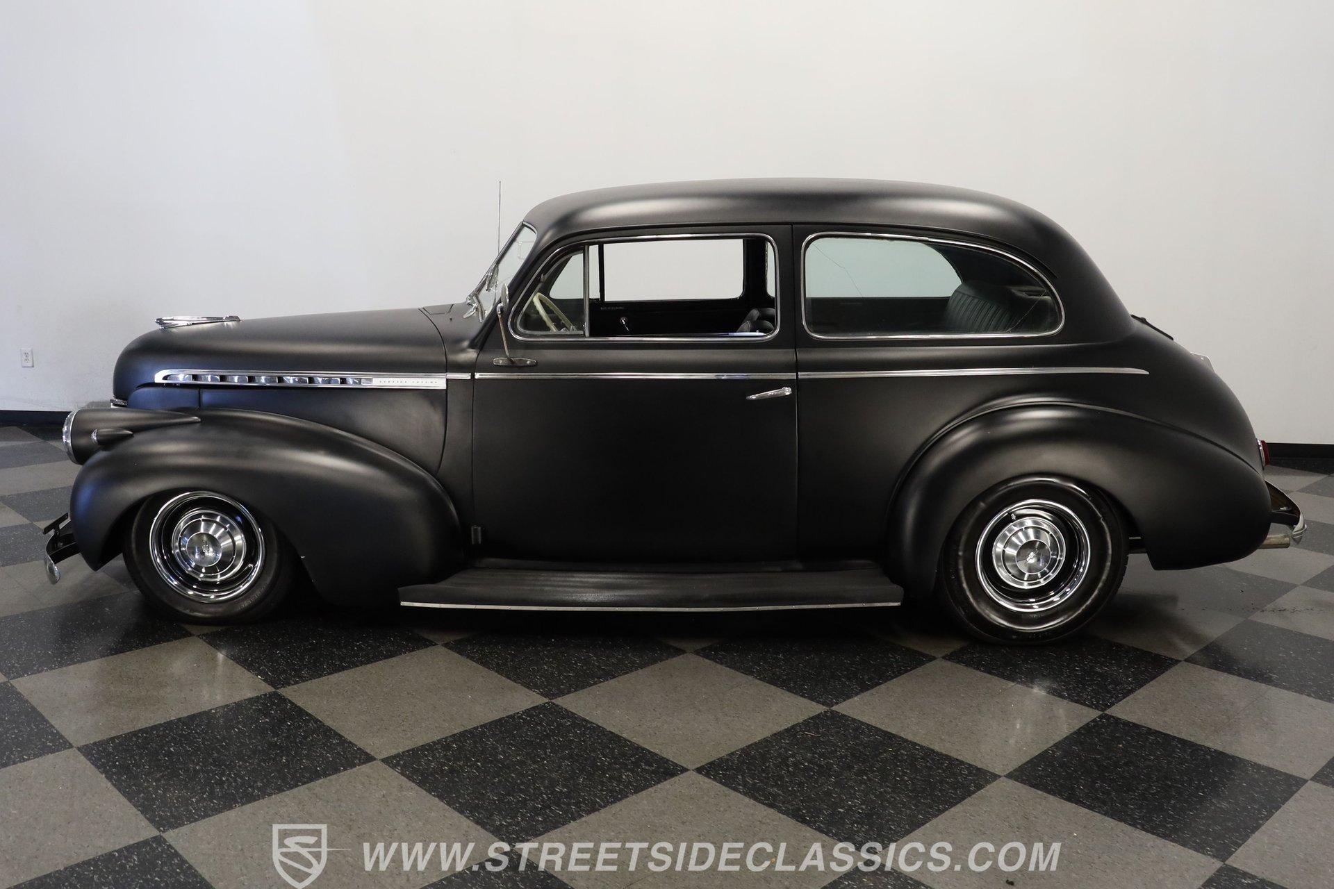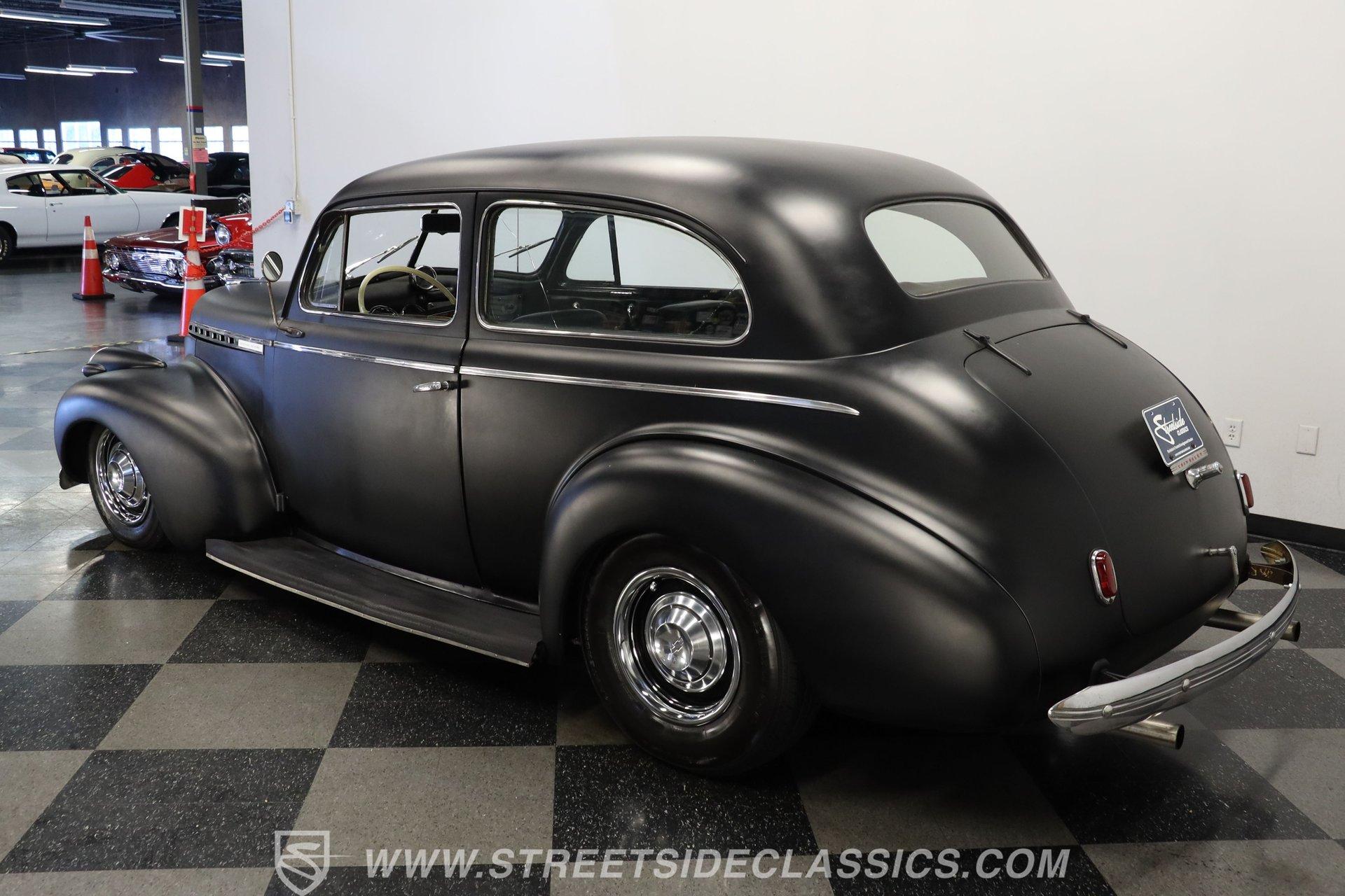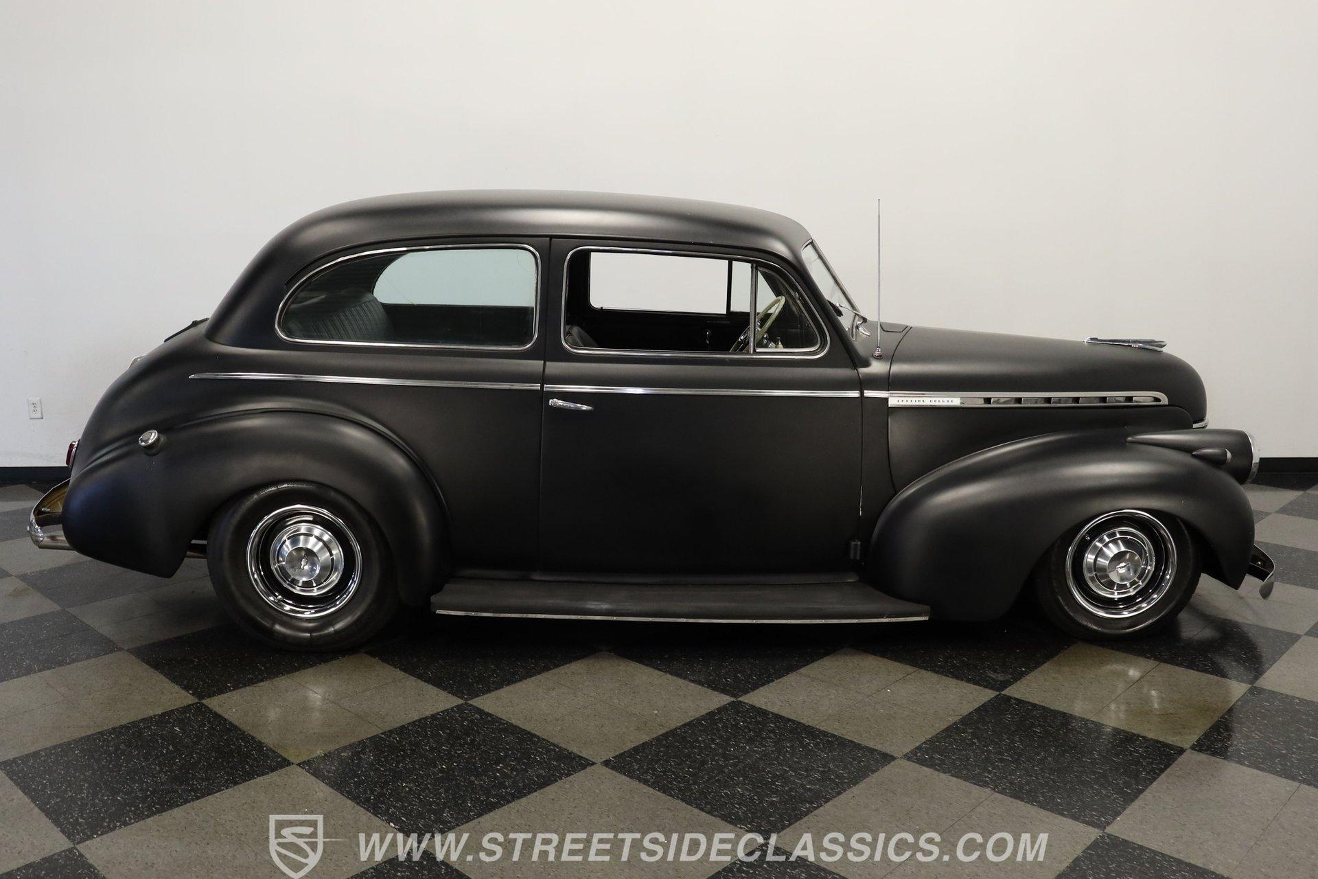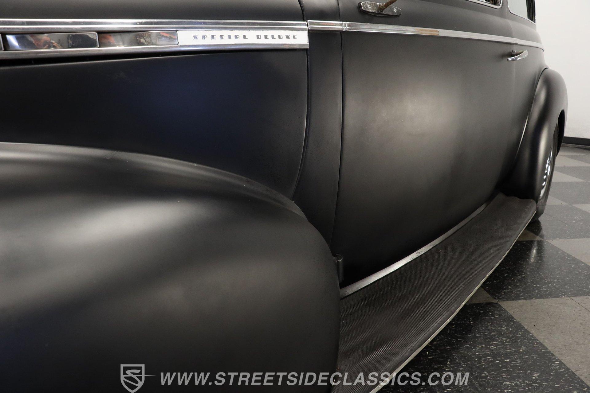 Draped in matte black paint, with its steel body still in largely original configuration and its substantial collection of chrome body trim shining brightly, this 1940 Chevrolet Special Deluxe is a great-looking pre-war classic. As you circle the car, you may spot a few areas that will require a bit of attention to bring them back to top form, but none of them represent major undertakings, and beneath this seldom-seen Chevy's well-aligned exterior sits an array of modern mechanical components that combine to afford a modern experience behind the wheel. The black vinyl interior features a pair of modern bucket seats at its center to make for a comfortable driving experience and, as you look around, you'll likely notice how all the components inside these doors still retain their deep pigmentation. The distinctive ivory-colored steering wheel perched on its column offers a good bit of contrast to its surroundings, and just beyond it, there's an array of modern gauges seamlessly recessed into the padded dash area. A high stick floor shifter puts control of the automatic transmission within easy reach. Raise the long, tapered hood, and you'll see an engine compartment that presents nicely, at the center of which lurks a 350-cubic-inch BluePrint V8 that's been outfitted with an Edelbrock 4-barrel carburetor and an Offenhauser aluminum intake to optimize its performance. Having logged only 2600 miles since its installation, the engine is just now emerging from its break-in phase and exhales into long tube headers leading out to a pair of Turbo mufflers that create a smooth, yet suitably aggressive exhaust note. An added small electric fan mounted on the radiator combines with the belt-driven fan already in place to keep operating conditions in check under more demanding motoring conditions. Power rack-and-pinion steering makes this vintage Chevy easy to navigate, while power brakes - which include slotted and drilled rotors up front - add fade-resistant stopping ability. HIGHLIGHTS BLUEPRINT 350-CUBIC-INCH V8 EDELBROCK 4-BARREL CARBURETOR OFFENHAUSER ALUMINUM INTAKE MANIFOLD 3-SPEED AUTOMATIC TH350 TRANSMISSION POWER RACK AND PINION STEERING POWER BRAKES, WITH DISCS UP FRONT LONG TUBE HEADERS DUAL EXHAUST WITH TURBO MUFFLERS TUBULAR A-ARM FRONT SUSPENSION STRIKING MATTE BLACK PAINT BLACK VINYL INTERIOR BUCKET SEATS FLOOR SHIFTER 15" PAINTED WHEELS WITH CHROME CENTERS An excellent example of pre-war automotive style mixed with some well-chosen aftermarket upgrades designed to improve drivability, this 1940 Chevrolet Special Deluxe cruises on a set of 15" painted wheels with chrome, bow-tie badged centers, and would be a great fit for the collector searching for a combination of a vintage appearance and modern drivability. Call today! We can assist you with getting an Extended Vehicle Service Plan from Freedom Warranty, which provides comprehensive coverage that can save thousands of dollars on unexpected repairs. Inquire for more details and pricing!