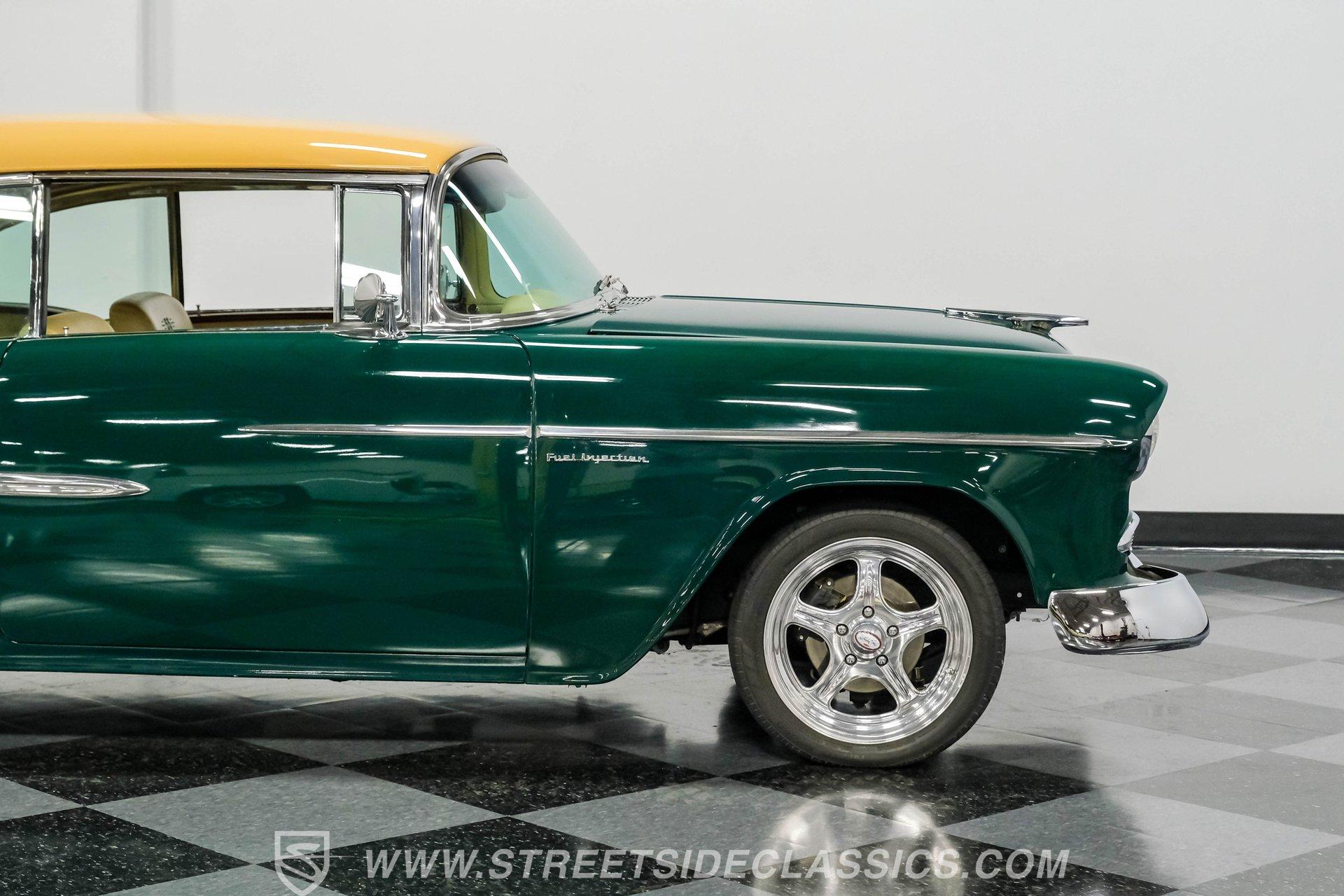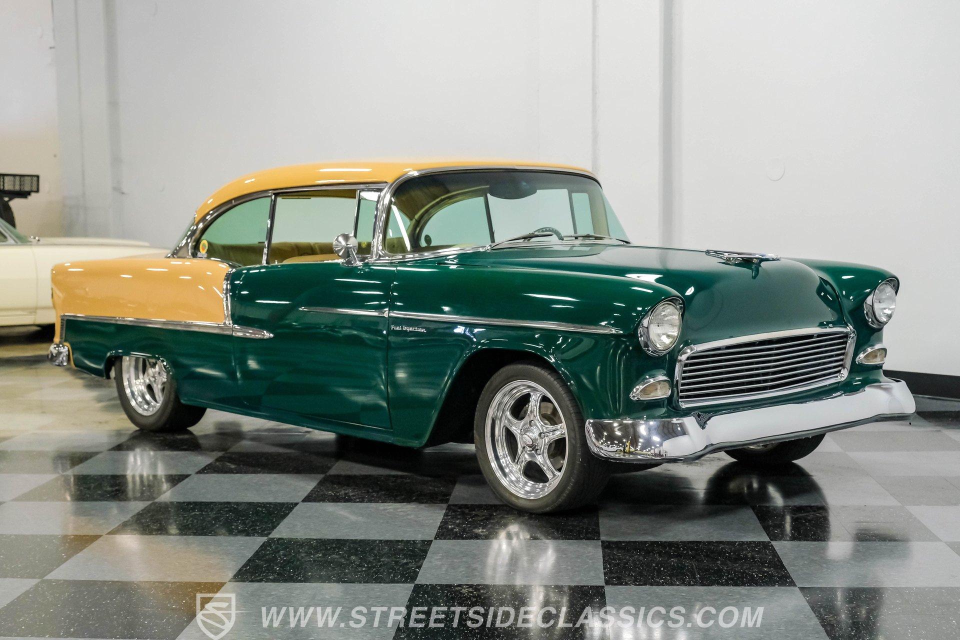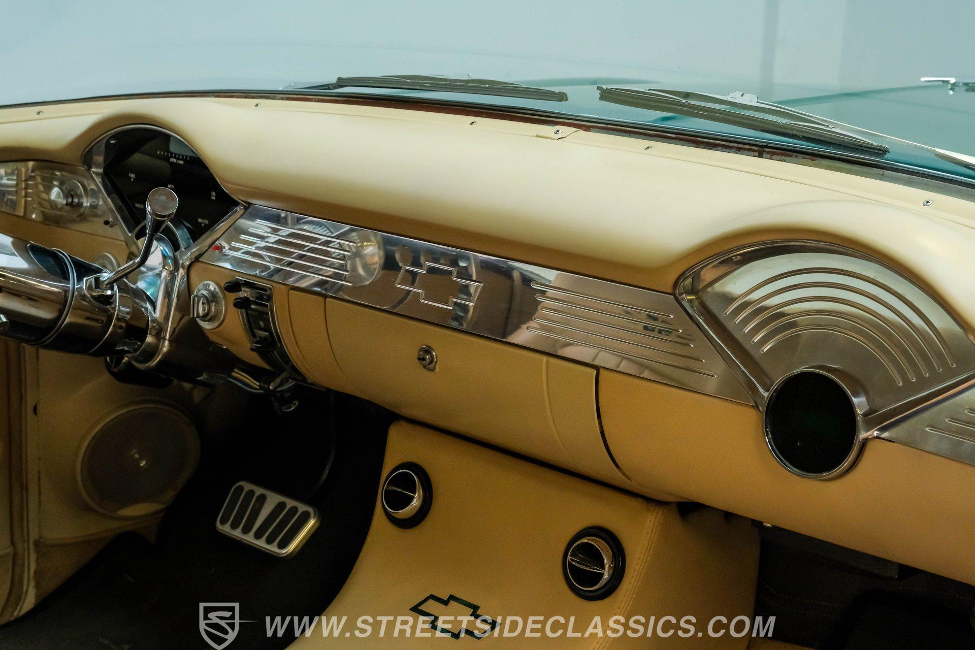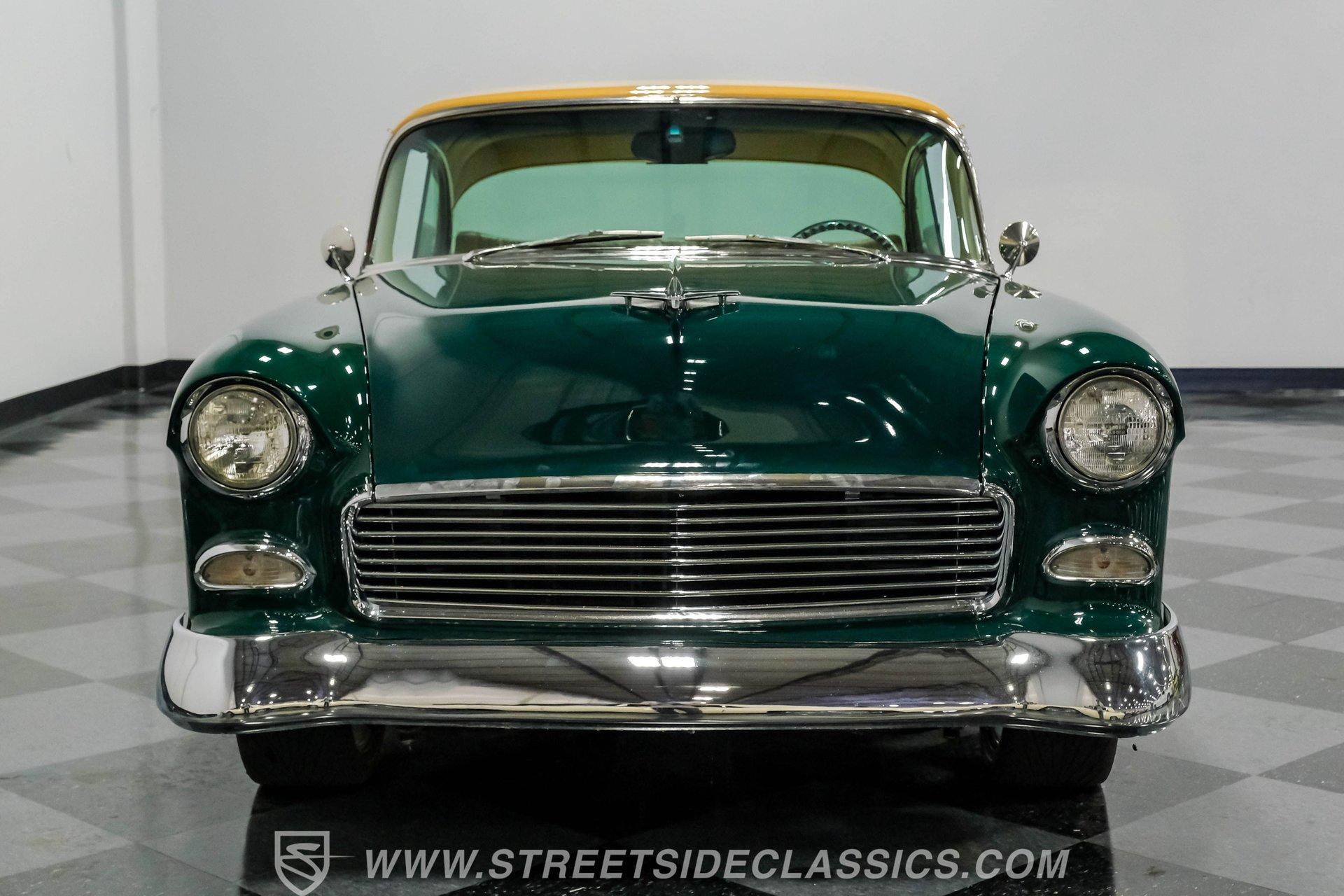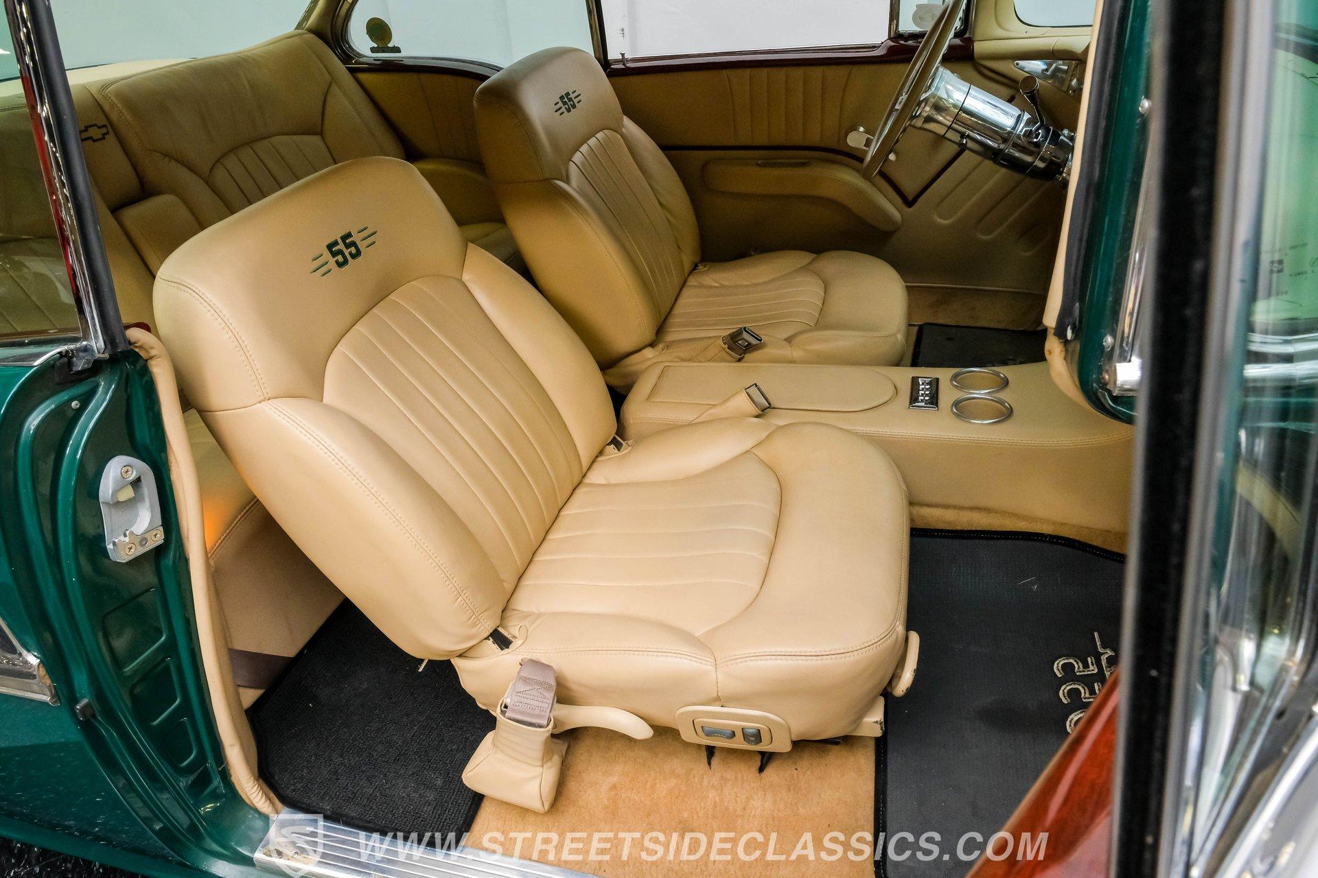 Owning a classic car is about more than just transportation-it's about embracing a piece of history, a symbol of timeless style and craftsmanship. This fully restored 1955 Chevrolet Bel Air Restomod captures the spirit of mid-century America with a modern twist, blending nostalgic charm with contemporary performance and comfort. Covered in a very unique and stylish color combination of Metallic Green and Colorado Beige, it really makes quite the impression with the aid of shaved door handles, smoothed hood and trunk with a recess for the license plate, one piece bumpers and a custom grille. If you've ever dreamed of owning a classic that offers both style and substance, this 1955 Chevrolet Bel Air might just be the perfect fit. Step inside to experience an interior that perfectly balances vintage aesthetics with modern luxury. The custom cream leather upholstery complements the exterior accents, creating a cohesive and elegant look. Equipped with power driver's seat featuring lumbar support and heating, a custom-built center console, and digital Dakota gauges, the cabin offers comfort and convenience. Additional features include a chrome Ididit tilt column with a custom billet steering wheel, power windows, power door poppers, and a power trunk release, all wrapped in a highly detailed space that invites you to enjoy every journey. Under the hood, this Bel Air houses a potent 5.7L V8 engine with tuned port injection paired with a smooth-shifting 700R4 four-speed automatic transmission operated via a column shifter. The engine bay is impressively clean and organized, with all wiring neatly tucked away in a matching color scheme. The tuned port injection enhances performance and reliability, while the 3.47 posi rear end and air ride suspension with airbags at all four corners provide a balanced, comfortable ride. Additional mechanical highlights include power steering, power brakes with front disc and a custom Brass Works radiator with a 16-inch fan, ensuring reliable cooling and spirited driving dynamics. Highlights 5.7L V8 Engine With Tuned Port Injection 700R4 Four-Speed Automatic Transmission Custom Leather Interior Power Driver's Seat With Lumbar Support And Heating Dakota Digital Gauges Air Conditioning Air Ride Suspension With Airbags On Four Corners 3.47 Posi Rear End Power Front Disc Brakes Power Steering Boyd Coddington 17" Chrome Wheels LED Taillights Shaved Doors, Hood, And Trunk With Recess for Plate Documentation Includes Restoration Photos, Receipts And Service Manuals Financing Available Vehicle Protection Plans Available Worldwide Shipping This 1955 Chevrolet Bel Air Restomod is a superb blend of classic style and modern upgrades, making it a standout choice for collectors and enthusiasts alike, ready to enjoy daily or showcase at any event. Don't miss the chance to own a beautifully restored piece of automotive history. Call, email, or come visit our showroom today!