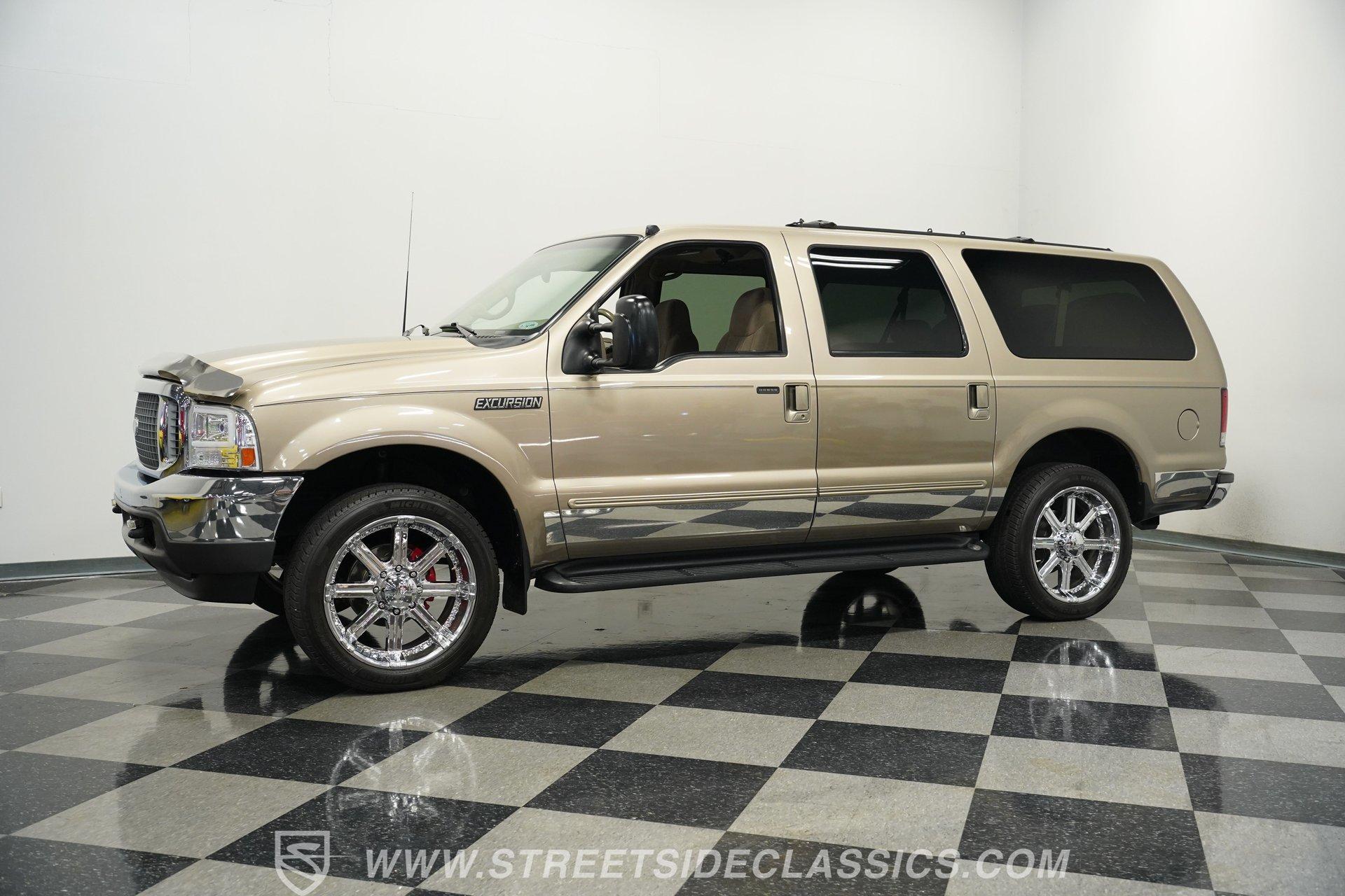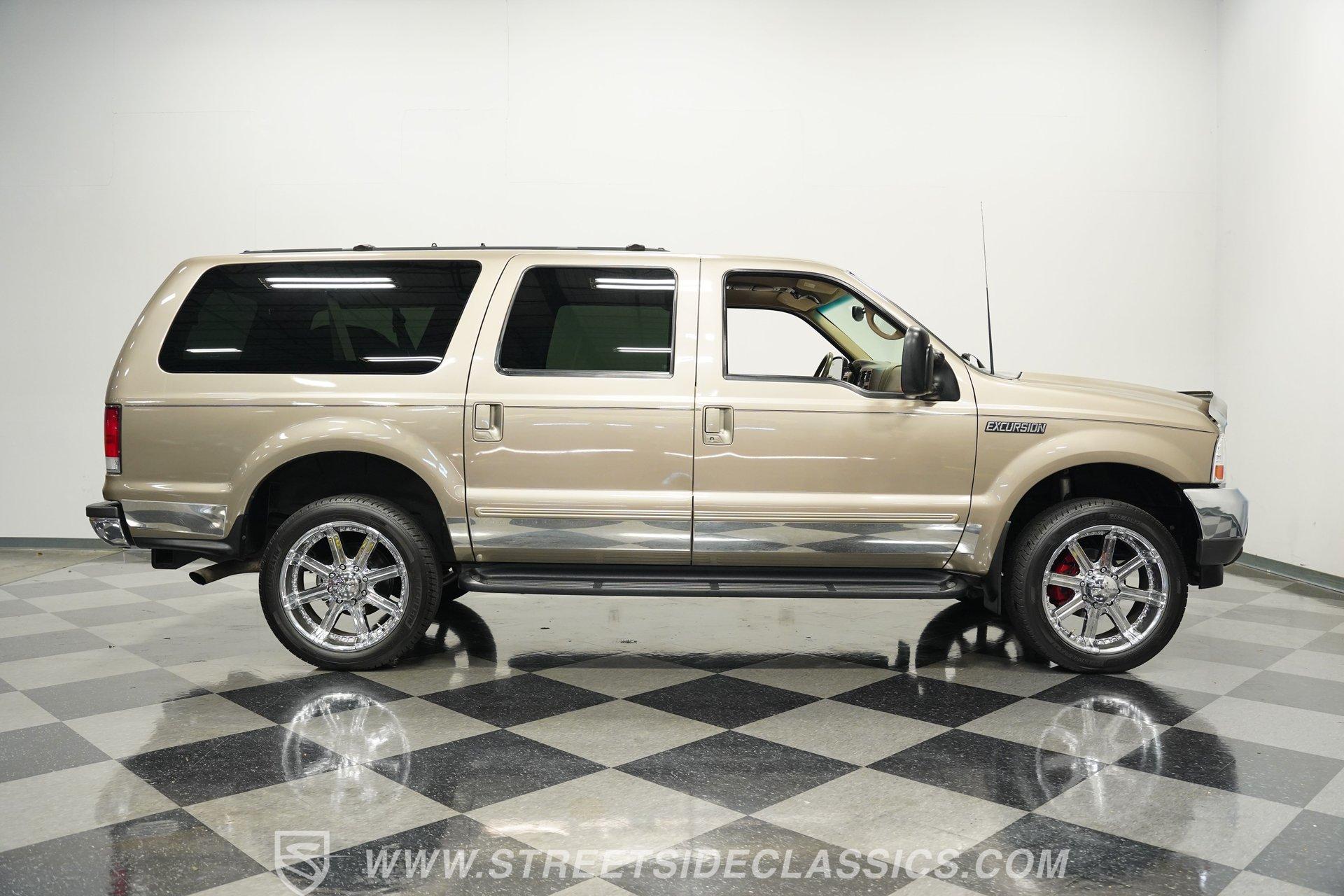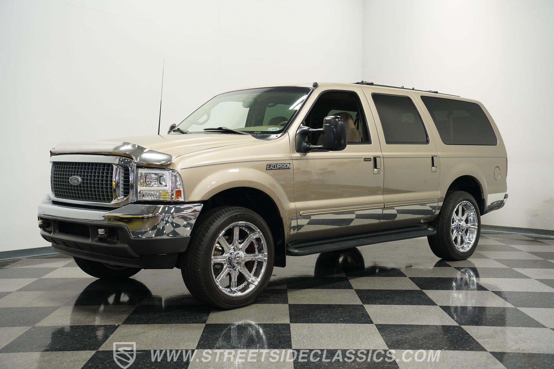 From the time it first rolled out, Ford's mega-sized Excursion was a dominating presence. Bigger and taller than its competitors and built on a truck-style chassis that equipped it with an elite towing and payload capacity, it was a unique vehicle that combined its expansive dimensions with surprisingly easy drivability and four-wheel drive surefootedness. Flash forward a quarter century to the present, and this 2000 Ford Excursion XLT 4x4 is an outstanding representative of that one-of-a-kind model. Its Arizona Beige Metallic paint has a nice, deep shine, and even under close scrutiny, you'd be hard-pressed to find any dents or blemishes to detract from its impact. Consistently fresh brightwork from front to back enhances this unusually clean Ford's vibrant curb appeal. The cloth Parchment interior is in flat-out great shape, and as you peer inside, its sheer volume becomes evident. This jumbo-sized SUV can effortlessly accommodate eight passengers in comfort with its three broad rows of seating. The condition of the seats themselves is especially impressive. Ford's cloth upholstery has a reputation for durability but not only do the front buckets and two rows of bench seating still show only the slightest of wear, but there are also no glaring stains or discolorations to be found. Walk around to the rear and open the full-size doors that combine with a drop-down tailgate, and you can also see just how much storage space will be at your disposal, especially with the third-row bench seat folded down. Up front, the dash area is another high point, with its contrasting dark panel encircling clear factory gauges and control knobs that look pretty much as they did from the start. Needless to say, a sizable SUV built for action requires a potent engine, and this Excursion has one. Its electronically fuel-injected 6.8-liter V10 represented Ford's most powerful gas option for the model at the time of its release, offering well over 400 lb.-ft. of torque and equipping it with a towing capacity of up to 10,000 lbs. Like everything else on this Ford, it's in top-notch working order and pairs with a 4-speed automatic transmission to make for a versatile yet refined driving experience. And when a sense of adventure grabs you, its four-wheel drive agility is unleashed via an easily reachable electronic push-button on the dash. HIGHLIGHTS 6.8-LITER V10 ENGINE ELECTRONIC FUEL INJECTION 4-SPEED AUTOMATIC TRANSMISSION ELECTRONIC SHIFT ON THE FLY 4-WHEEL DRIVE POWER STEERING 4-WHEEL POWER DISC BRAKES UPGRADED HEADLIGHTS ARIZONA BEIGE METALLIC PAINT 22" CHROME WHEELS AIR CONDITIONING CLOTH PARCHMENT INTERIOR BUCKET SEATS ADDITIONAL SET OF FACTORY WHEELS WITH OFF-ROAD TIRES INCLUDED An increasingly rare SUV that still commands attention, this 2000 Ford Excursion XLT 4x4 conquers terrain on a set of ultra-sharp 22" chrome wheels. It's a unique blend of ruggedness and refinement that would look great in any garage. Call today!
