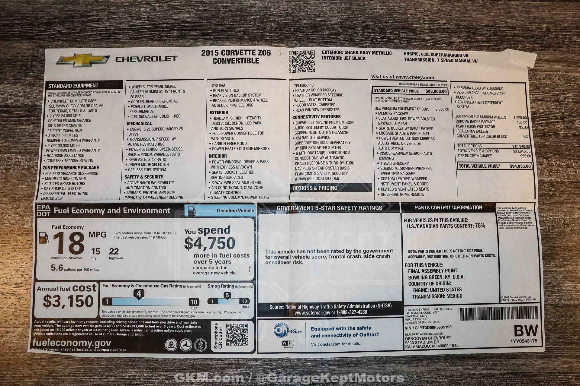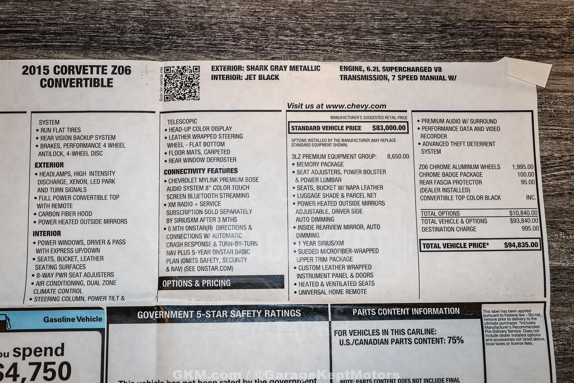 2015 Chevrolet Corvette Z06 Convertible 3LZ- 6.2L Supercharged LT4 V8- 7 Speed Manual Transmission- 2 Owners- 28,626 Miles- Shark Grey Exterior- Jet Black Interior- Ally Transferable Warranty- Window Sticker And Build Sheet- 2 KeysThe 2015 Chevrolet Corvette Z06 Convertible 3LZ is one of the most advanced and high-performance Corvettes ever built, blending supercar power with open-air excitement and premium luxury. Under the hood sits the formidable 6.2L supercharged LT4 V8, delivering 650 horsepower and paired here with the enthusiast-preferred 7-speed manual transmission. With only 28,626 miles and just two owners since new, this Z06 has been exceptionally cared for and remains in outstanding condition throughout.Finished in striking Shark Grey, the exterior pairs perfectly with its Jet Black interior, giving this convertible a stealthy yet aggressive presence. The 3LZ trim level elevates the interior with top-tier materials, upgraded technology, and a driver-focused cockpit designed for high-performance motoring. As a convertible, it provides the best of both worldstrack-ready capability with the ability to drop the top and enjoy the sound of the LT4?s supercharger whine in the open air.Adding to its appeal, the car comes with desirable documentation including the original window sticker and build sheet, along with two keys. It also includes an Ally transferable warranty, offering future peace of mindan uncommon and valuable bonus for a high-performance sports car of this caliber.For collectors and drivers alike, this Z06 Convertible represents an ideal mix of performance, refinement, and exclusivity. With its powerful drivetrain, manual transmission, premium 3LZ equipment group, and outstanding ownership history, this 2015 Z06 is ready to deliver world-class performance to its next enthusiast.
