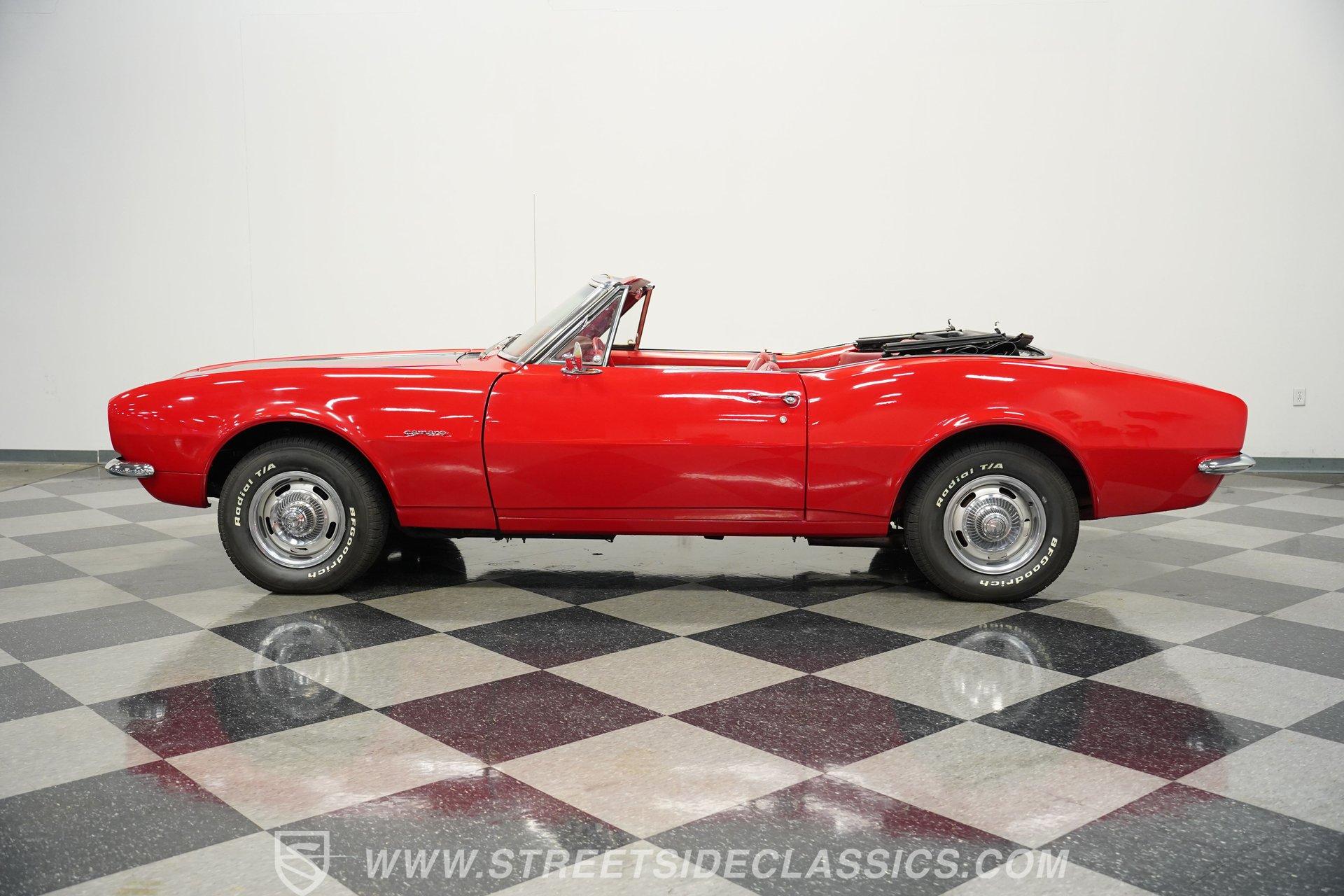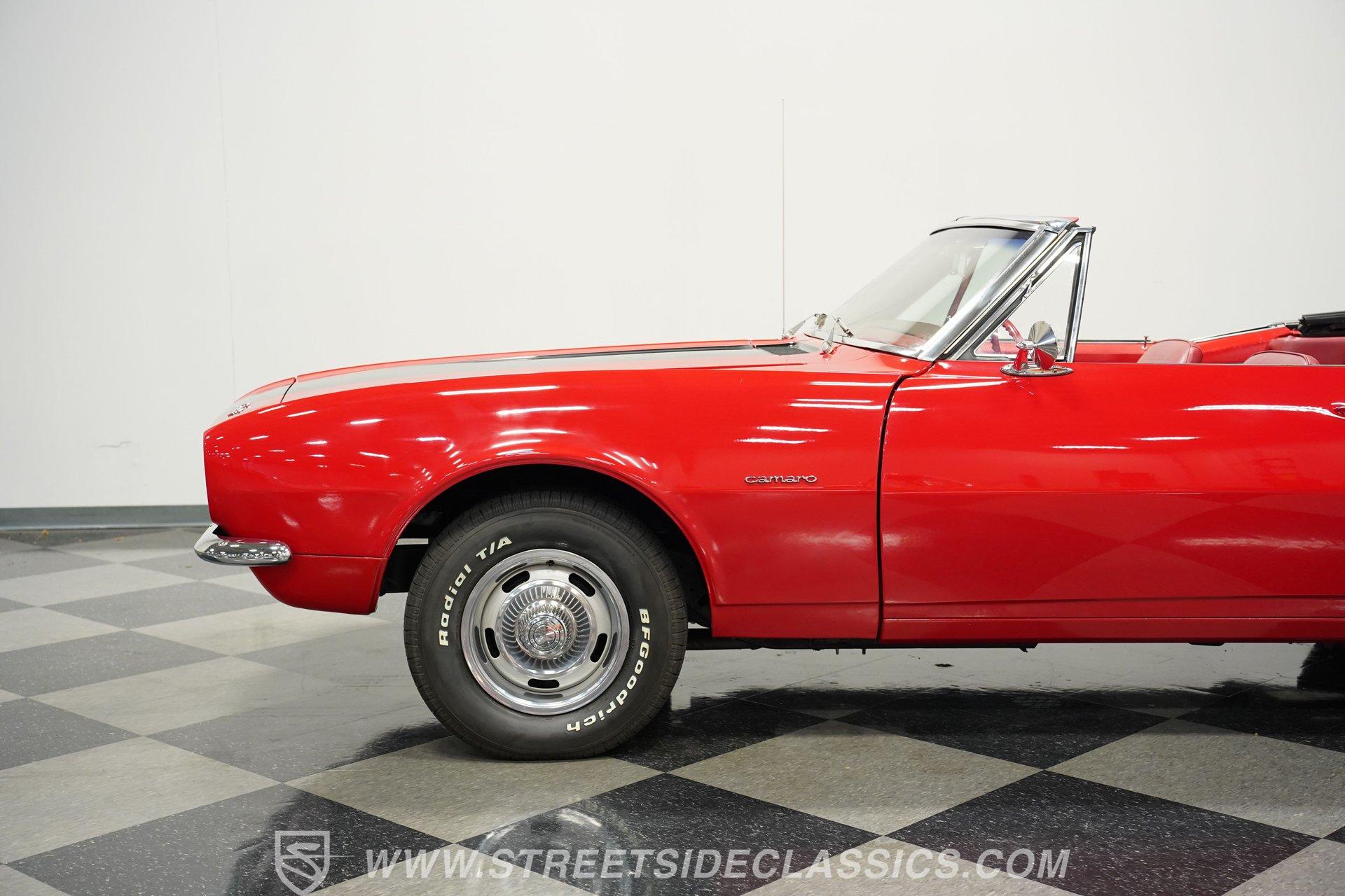 Step back in time and embrace the spirit of American muscle with a car that's as iconic as it is thrilling. This 1967 Chevrolet Camaro Convertible captures the essence of the 1960s, where freedom met performance on open roads. Its bold Bolero Red paint and classic black stripes make a statement that turns heads wherever it goes. Whether it's a weekend cruiser or a showstopper at your local car meet, this Camaro offers the perfect blend of nostalgia and raw power. Don't just drive a car-own a legend that embodies the thrill of the open road. Slide into the nicely restored red vinyl interior, featuring comfortable bucket seats and a crack-free dash that speaks to its careful upkeep. The clean carpet and gauges with great clarity add to the stylish yet functional cabin. The dashboard is beautifully painted, complementing the classic look while maintaining a driver-focused environment that invites you to enjoy every mile. Under the hood, you'll find a 327 cubic inch V8 engine delivering a lively 275 horsepower. This powerhouse is paired with a smooth-shifting 2-speed Powerglide automatic transmission, promising an engaging and reliable driving experience. The engine bay is clean and well-maintained, showcasing aluminum heads, chrome valve covers, a breather, and long tube headers. While the car retains its manual drum brakes and lacks power steering or air conditioning, it drives nicely with refreshed front suspension components that enhance handling and ride quality. Highlights 1967 Chevrolet Camaro Convertible 13,603 Actual Or Since Built Miles 327 Cubic Inch V8 Engine 275 Horsepower Output 2-Speed Powerglide Automatic Transmission Aluminum Cylinder Heads Chrome Valve Covers And Breather Long Tube Headers Installed Manual Drum Brakes Power Convertible Top Bolero Red Factory Repaint 14" Stock Style Rally Wheels Nice Red Vinyl Interior Clean And Clear Gauges Financing Available Vehicle Protection Plans Available Worldwide Shipping This 1967 Chevrolet Camaro Convertible is a fantastic opportunity to own a classic piece of automotive history that delivers style, performance, and a true convertible experience. Its combination of fresh mechanicals and timeless design makes it a great buy for enthusiasts and collectors alike. Call, email, or come visit our showroom today!
