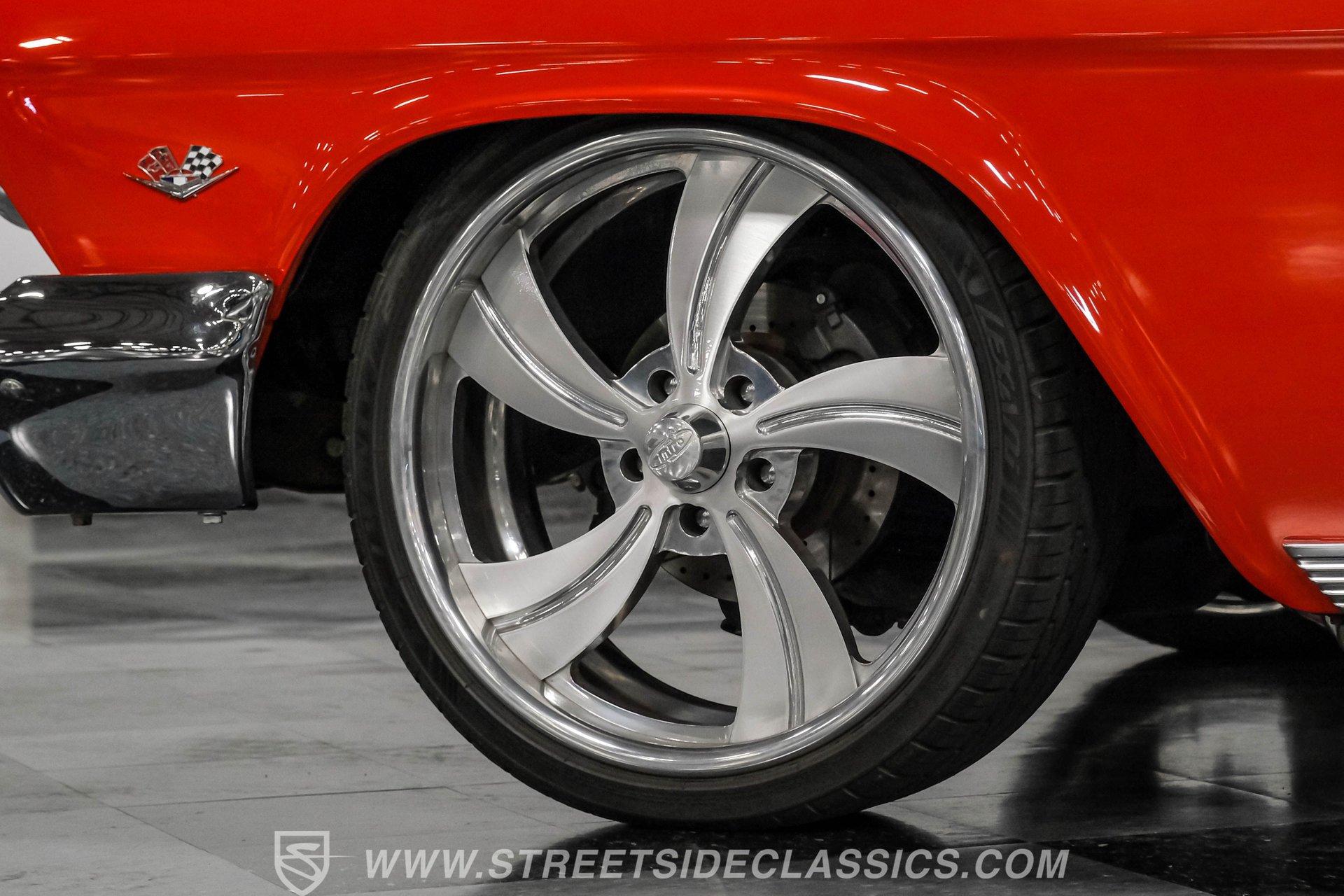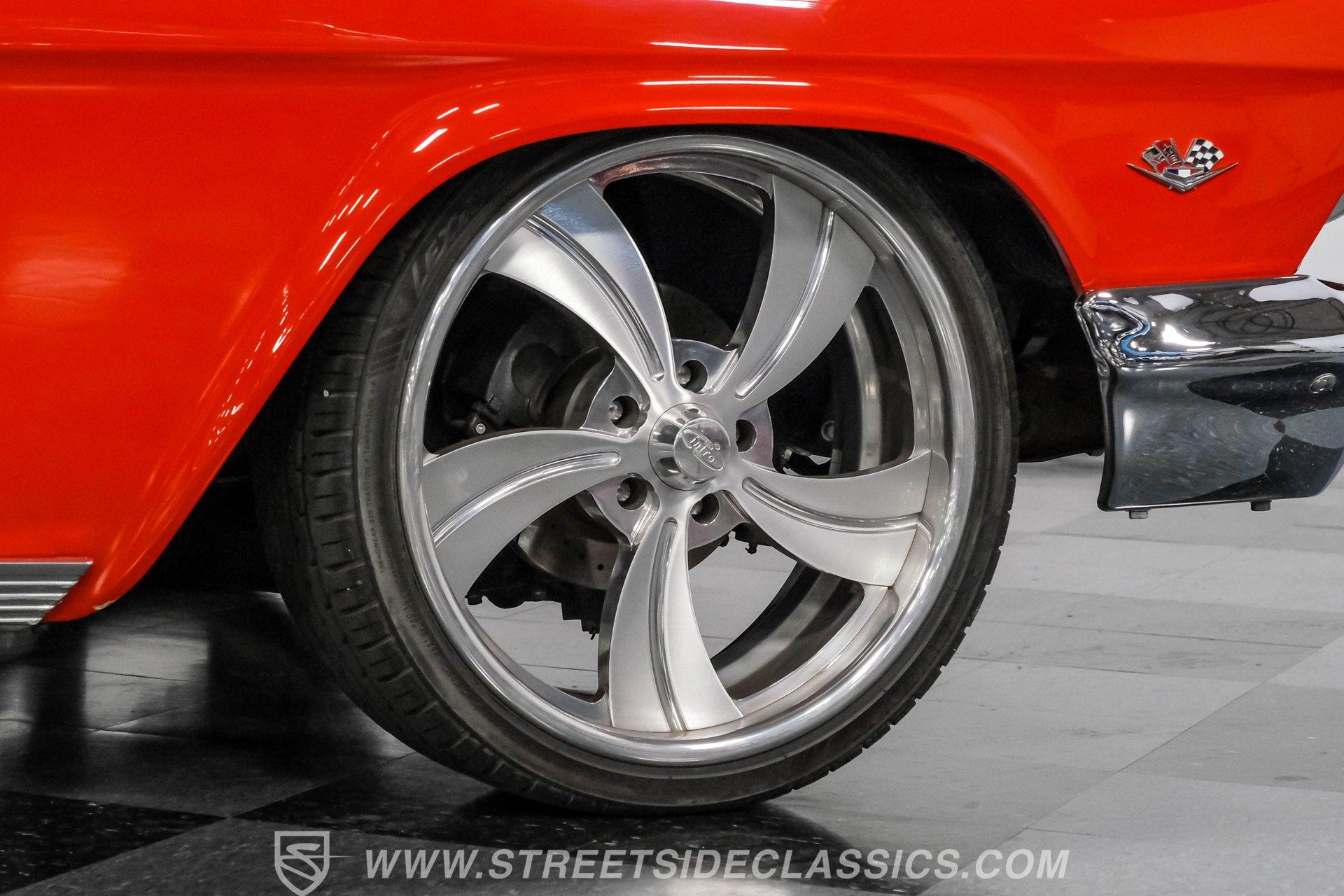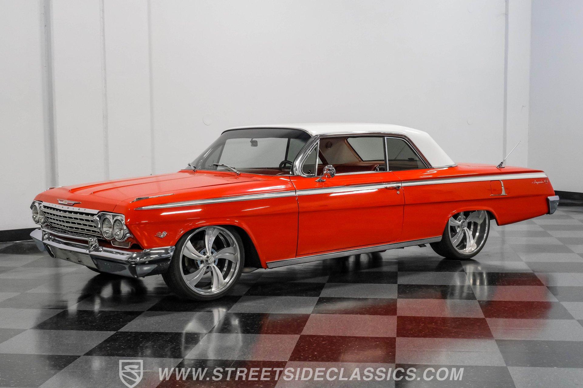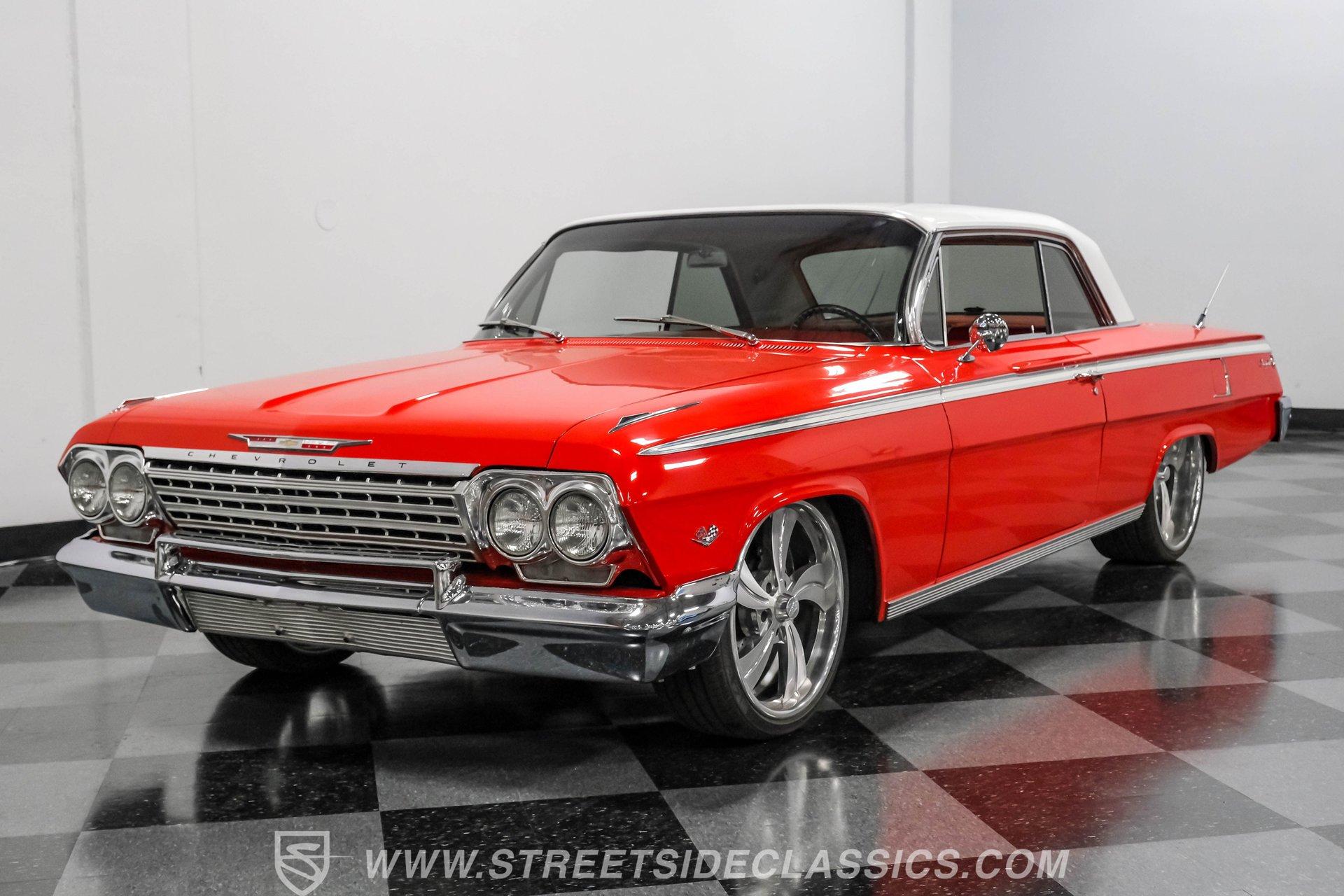 Looking to make an impact behind the wheel of one of the most coveted classics ever to hit the boulevard? Then you'll definitely want to check out this 1962 Chevrolet Impala Restomod. This founding member of cruising royalty is decked out with aggressively sized, staggered 20"/22" wheels and a tastefully striking paint job that can't help but attract attention. Yet, it also boasts a downright impressive level of factory-correctness both inside and out. Yep, that Roman Red exterior mirrors the same shade it rolled off the assembly line with, and it's ornamented by chrome trim that's in top form. But this standout ride isn't just about aesthetics. It also features an assembly of quality mechanical components that combine to create an outstanding driving experience. The ultra-clean state of the interior is a good indication that it received a thorough refurbishment not long ago, and its consistently factory-correct configuration shows plenty of attention to detail. The combination of the fresh vinyl and cloth bench seating accompanied by matching door panels and carpeting creates quite an impression, and the well-fitted white headliner above adds just the right amount of contrast. The aftermarket custom billet steering wheel is perched on a Flaming River tilt column that puts it in just the right position, and the painted dash beyond it features a collection of Dakota Digital gauges to monitor motoring functions. A vintage-look AM/FM stereo with an auxiliary port has been seamlessly recessed into the center of the dash, and with the added climate control system functioning flawlessly, you and your passengers will ride in comfort throughout the year. Beneath the hood, a 350-cubic-inch crate V8 engine stands by in a very clean compartment, ready for action and outfitted with a Weiand intake manifold and Fi-Tech fuel injection to maximize its output, adjustability, and all-weather dependability. It pairs with a four-speed automatic 700R4 transmission with an overdrive gear to keep engine revs nice and low during highway driving. Up front, a sizable aluminum radiator teams with a pair of electric fans for outstanding engine temperature control. And with a well-chosen assembly of Ridetech suspension components in place at both ends, this Chevy's handling ability and ride quality are sure to put a smile on your face. HIGHLIGHTS: 350-CUBIC-INCH CRATE V8 FI-TECH FUEL INJECTION WEIAND INTAKE MANIFOLD 4-SPEED AUTOMATIC 700R4 TRANSMISSION ALUMINUM RADIATOR WITH DUAL ELECTRIC FANS SERPENTINE BELT SYSTEM POWER STEERING 4-WHEEL POWER DISC BRAKES RIDETECH COIL SPRINGS, SHOCKS, AND SWAY BAR IN FRONT RIDETECH TUBULAR ARMS, COIL SPRINGS, AND SHOCKS IN REAR FACTORY CORRECT ROMAN RED PAINT FACTORY-CORRECT RED CLOTH AND VINYL INTERIOR BENCH SEATING AIR CONDITIONING BUILD RECEIPTS INCLUDED A fine example of factory correctness, with some great aftermarket add-ons to enhance both visual impact and drivability, this 1962 Chevrolet Impala Restomod would be a perfect match for the Chevy enthusiast who appreciates the model's storied lineage and places a high premium on the behind-the-wheel experience. Call today!