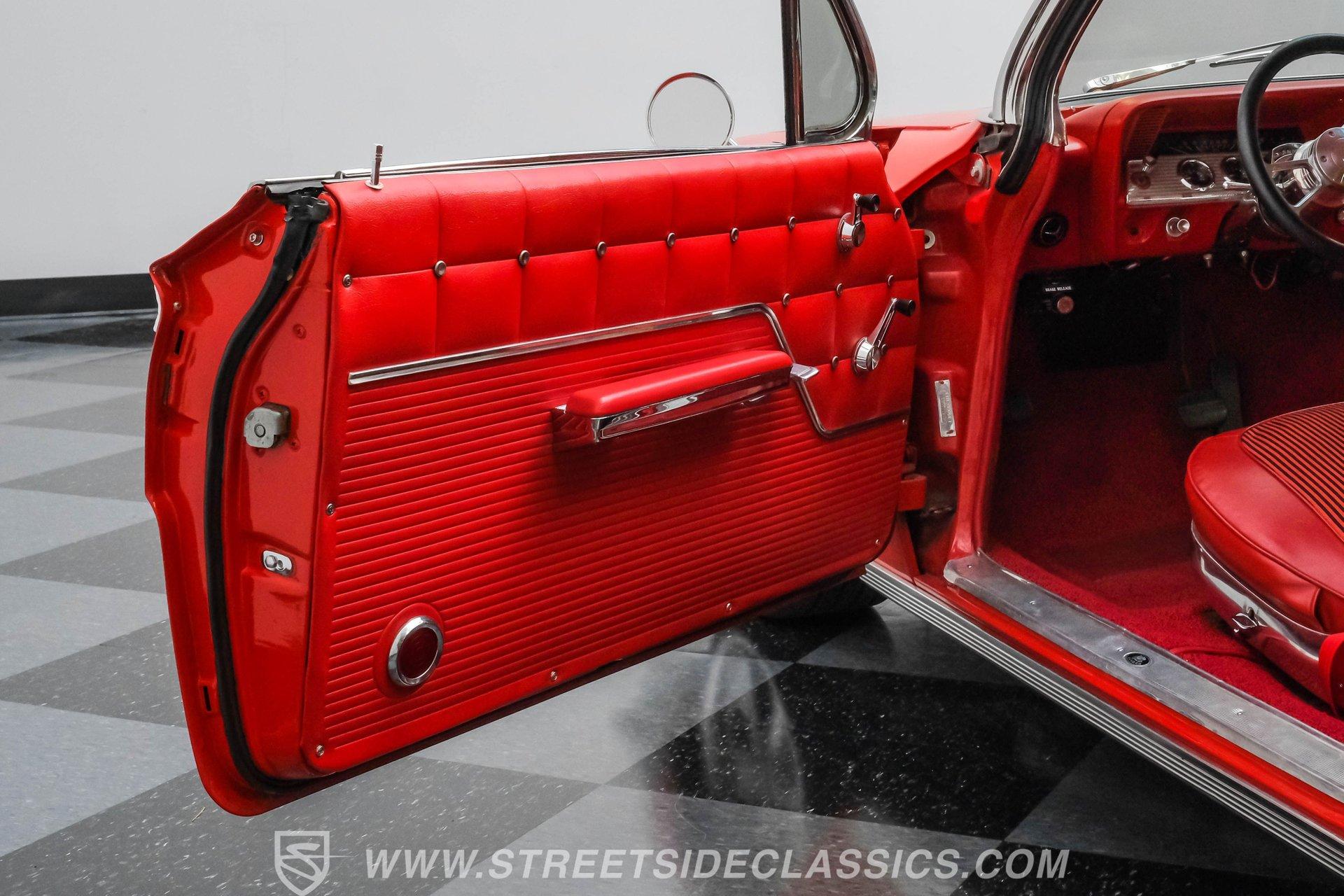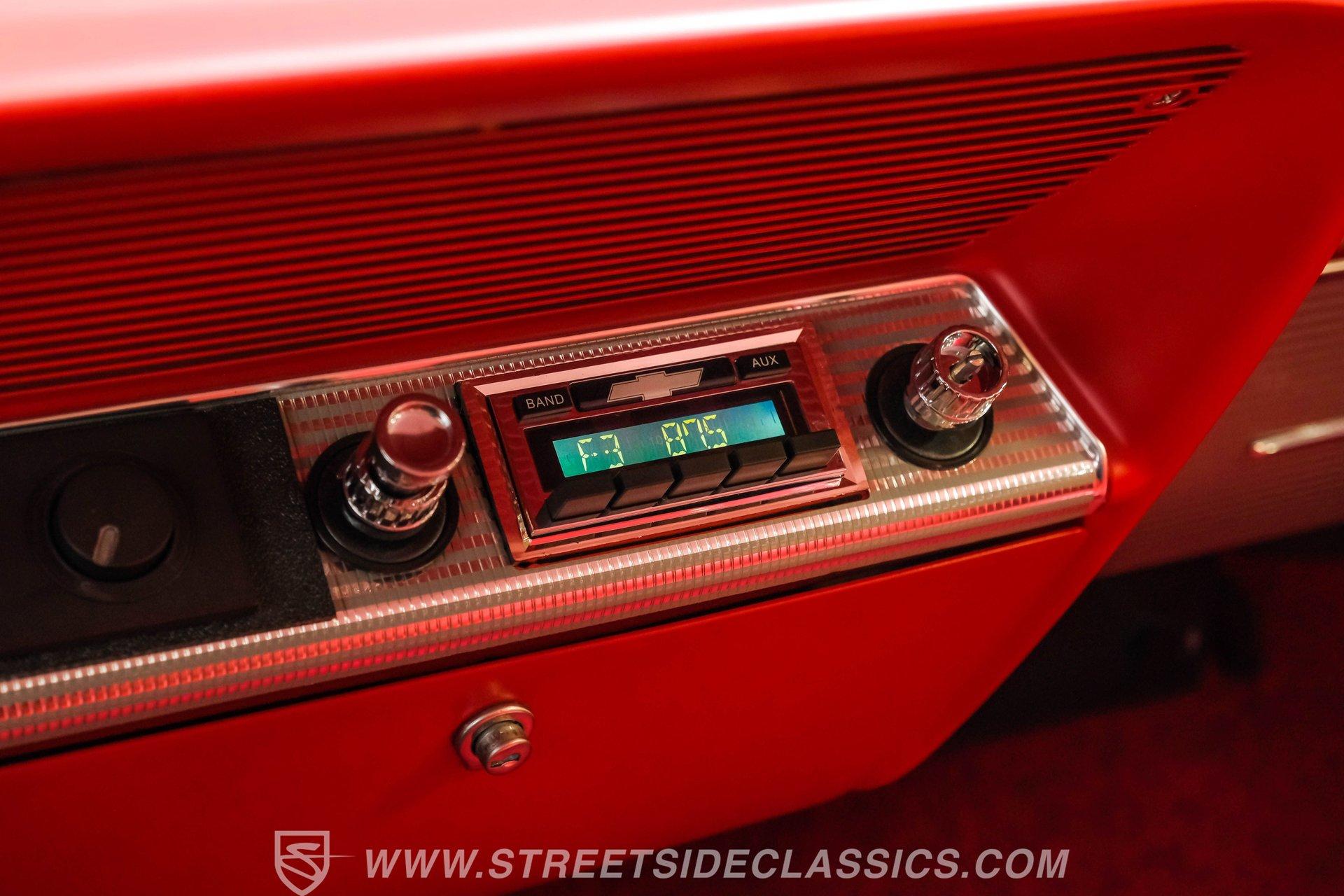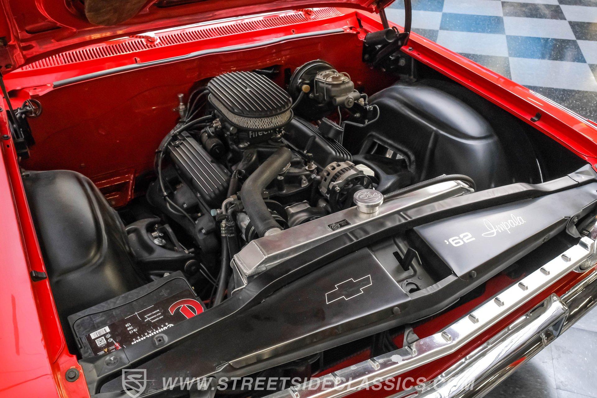 Looking to make an impact behind the wheel of one of the most coveted classics ever to hit the boulevard? Then you'll definitely want to check out this 1962 Chevrolet Impala Restomod. This founding member of cruising royalty is decked out with aggressively sized, staggered 20"/22" wheels and a tastefully striking paint job that can't help but attract attention. Yet, it also boasts a downright impressive level of factory-correctness both inside and out. Yep, that Roman Red exterior mirrors the same shade it rolled off the assembly line with, and it's ornamented by chrome trim that's in top form. But this standout ride isn't just about aesthetics. It also features an assembly of quality mechanical components that combine to create an outstanding driving experience. The ultra-clean state of the interior is a good indication that it received a thorough refurbishment not long ago, and its consistently factory-correct configuration shows plenty of attention to detail. The combination of the fresh vinyl and cloth bench seating accompanied by matching door panels and carpeting creates quite an impression, and the well-fitted white headliner above adds just the right amount of contrast. The aftermarket custom billet steering wheel is perched on a Flaming River tilt column that puts it in just the right position, and the painted dash beyond it features a collection of Dakota Digital gauges to monitor motoring functions. A vintage-look AM/FM stereo with an auxiliary port has been seamlessly recessed into the center of the dash, and with the added climate control system functioning flawlessly, you and your passengers will ride in comfort throughout the year. Beneath the hood, a 350-cubic-inch crate V8 engine stands by in a very clean compartment, ready for action and outfitted with a Weiand intake manifold and Fi-Tech fuel injection to maximize its output, adjustability, and all-weather dependability. It pairs with a four-speed automatic 700R4 transmission with an overdrive gear to keep engine revs nice and low during highway driving. Up front, a sizable aluminum radiator teams with a pair of electric fans for outstanding engine temperature control. And with a well-chosen assembly of Ridetech suspension components in place at both ends, this Chevy's handling ability and ride quality are sure to put a smile on your face. HIGHLIGHTS: 350-CUBIC-INCH CRATE V8 FI-TECH FUEL INJECTION WEIAND INTAKE MANIFOLD 4-SPEED AUTOMATIC 700R4 TRANSMISSION ALUMINUM RADIATOR WITH DUAL ELECTRIC FANS SERPENTINE BELT SYSTEM POWER STEERING 4-WHEEL POWER DISC BRAKES RIDETECH COIL SPRINGS, SHOCKS, AND SWAY BAR IN FRONT RIDETECH TUBULAR ARMS, COIL SPRINGS, AND SHOCKS IN REAR FACTORY CORRECT ROMAN RED PAINT FACTORY-CORRECT RED CLOTH AND VINYL INTERIOR BENCH SEATING AIR CONDITIONING BUILD RECEIPTS INCLUDED A fine example of factory correctness, with some great aftermarket add-ons to enhance both visual impact and drivability, this 1962 Chevrolet Impala Restomod would be a perfect match for the Chevy enthusiast who appreciates the model's storied lineage and places a high premium on the behind-the-wheel experience. Call today!
