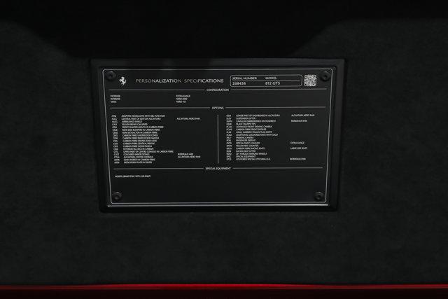 Ferrari 812 GTS- FERRARI CERTIFIED PRE-OWNED - EXTENDED FERRARI WARRANTY TO 8/10/28 -- Rosso Libano over Nero - Pristine Condition - Many Fine Options - Sold as New by Our Dealership - Expertly Maintained by Our Factory Trained Technicians - Extended Ferrari Warranty to 8/10/28 - Complimentary Ferrari Genuine Maintenance Service to 8/10/28 -Factory Options:- Special 3-Layer Paint Color- Airbrushed Scuderia Ferrari Shields- Rear Italian Flag Applique- Carbon Fiber Front Bumper Insert- Carbon Fiber Front Spoiler- Carbon Fiber Rear Bumper Sides- Carbon Fiber Underdoor Covers- Carbon Fiber Rear Diffuser- Carbon Fiber Driver Zone with LED Steering Wheel- Carbon Fiber Dashboard Inserts- Carbon Fiber Central Bridge- Carbon Fiber Upper Tunnel Trim- Carbon Fiber Exterior Sill Kicks- Carbon Fiber Door Panels- Carbon Fiber Inner Door Handles- Carbon Fiber Racing Seats- Racing Seat Lifter- Suspension Lifter- 20-inch Forged Diamond Wheels- Yellow Brake Calipers- Cavallino Stitched to Headrests in Bordeaux- Special Stitching in Bordeaux- Colored Inner Details in Bordeaux- Alcantara Lower Dashboard in Nero- Alcantara Central Tunnel in Nero- Alcantara Seats Inner Trim in Nero- Adaptive Front Lights- Black Ceramic Exhaust Pipes- Parking Camera- Advanced Front Driving Camera- Dedication Plate in Silver- Passenger Display- Yellow Rev Counter- Embroidered Mats with Logo- Vehicle Personalization PlateIf you are in the market for a Ferrari 812 GTS, please call or email us today.
