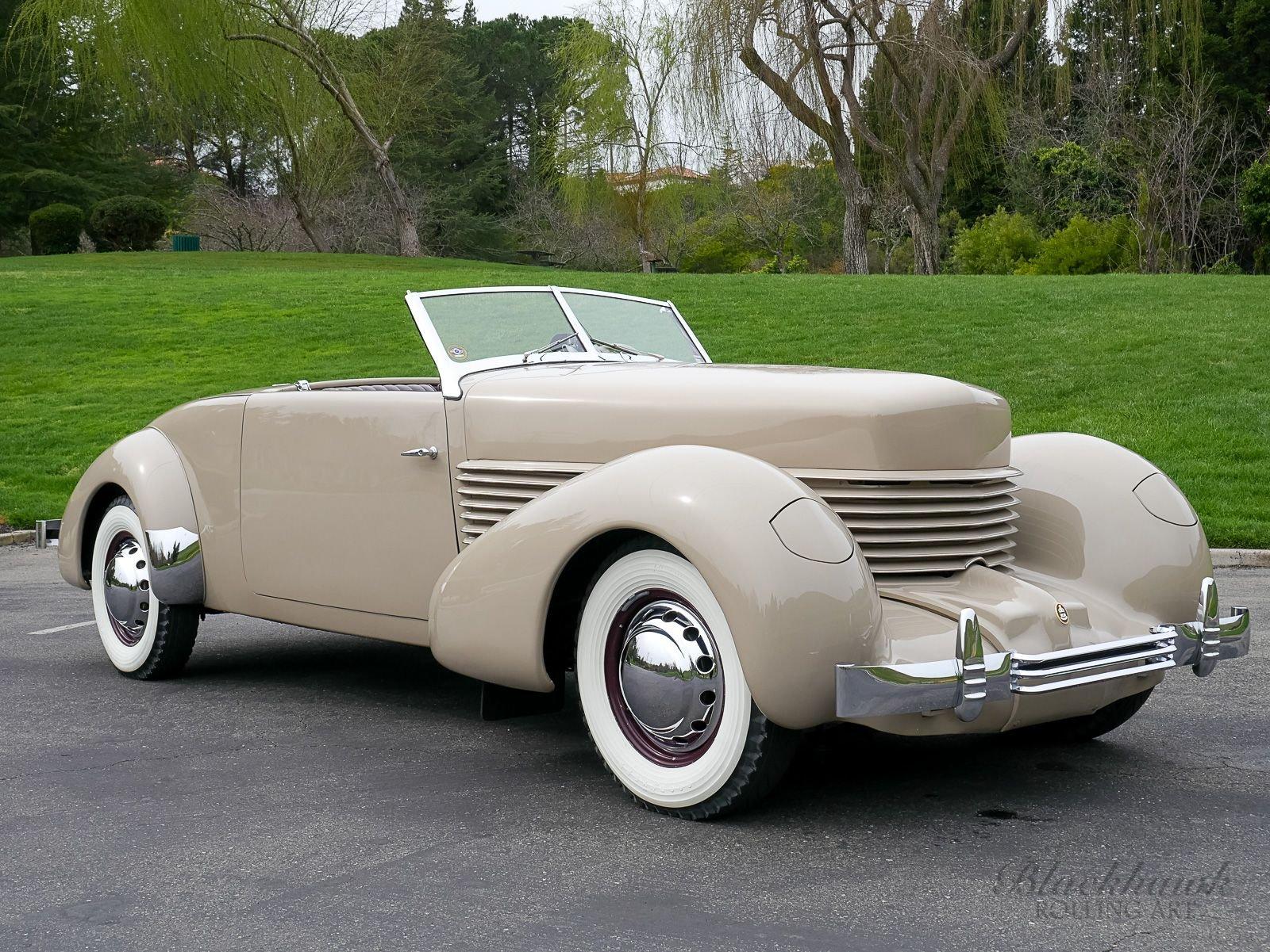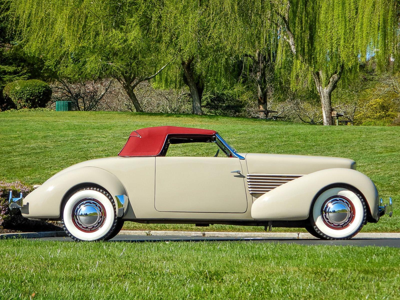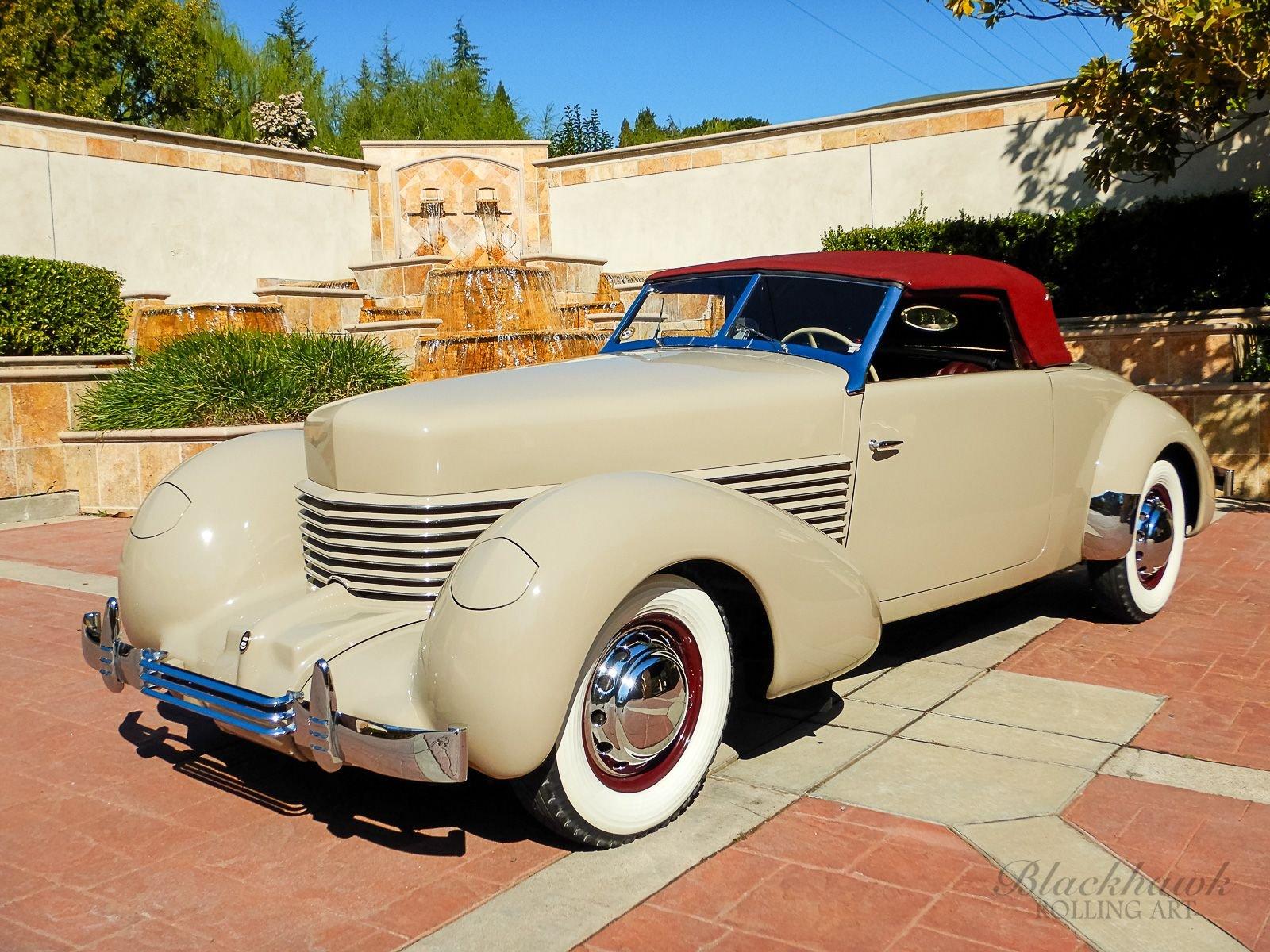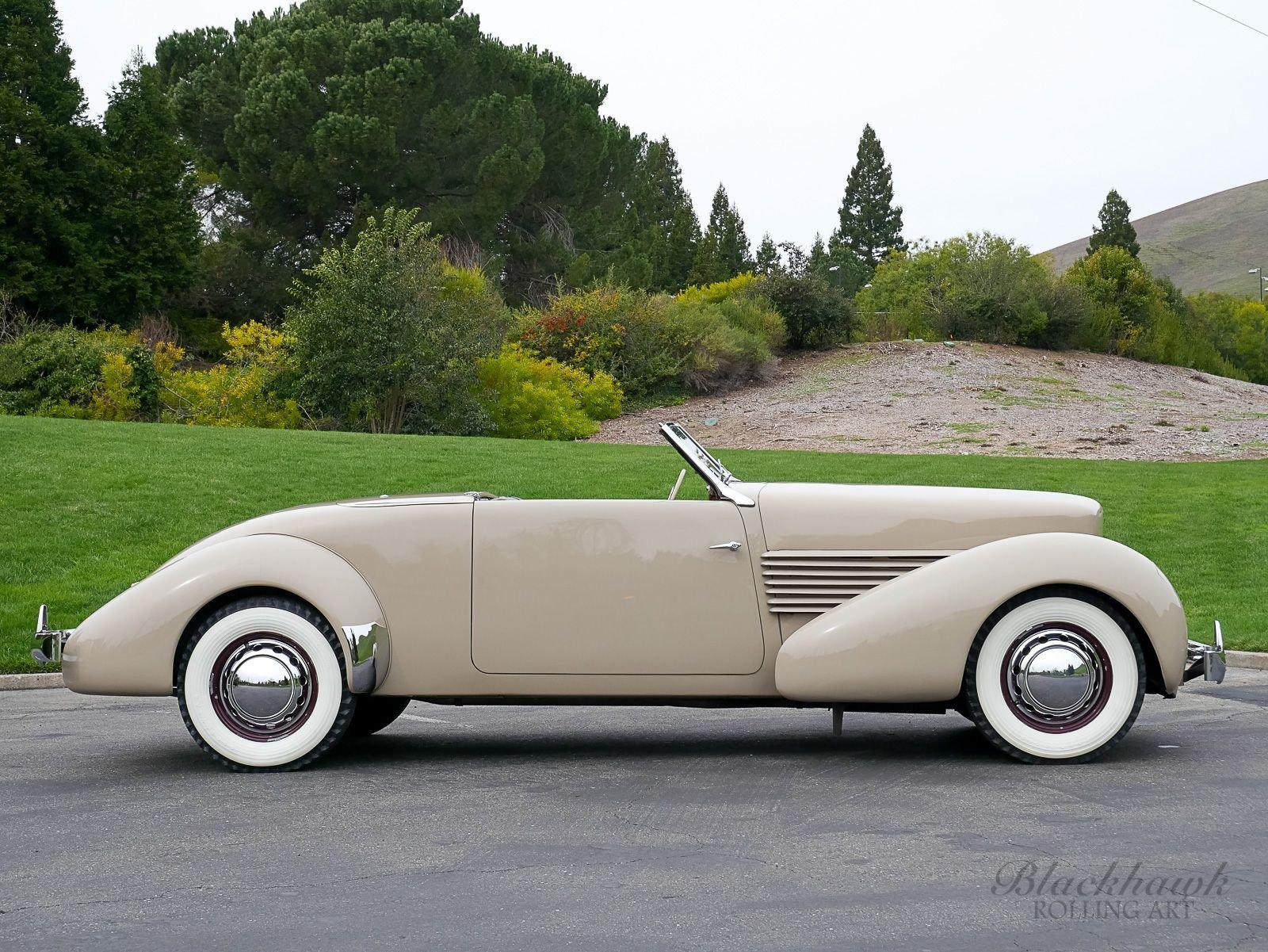 This is a 1937 Model 812 Cord Cabriolet “Sportsman”. A beautifully restored example by noted Auburn Cord Duesenberg marque expert and restorer Harry Van Iderstine (a highly respected authority in the Auburn-Cord-Duesenberg community). This Immaculate, rust-free, damage-free, laser straight Cord Cabriolet would be one of the pinnacles of any credible classic automobile collection. This Cabriolet is distinguished within the Cord line as one of only 200 two-seater convertibles, the rarest of the variants offered by the Cord Automobile Company of Auburn, Indiana in 1936 and 1937. Restoration included a complete bare metal paint and chrome to factory specs, but also the stunning full leather upholstery by Auburn Cord Duesenberg expert Rick Huelett. A complete driveline refurbishment was performed as well as the numerous details of steering and suspension were diligently attended to. Finished in factory Palm Beach Tan over factory Rich Maroon hides, the complete restoration was done in keeping with the restoration guidelines of the Auburn Cord Duesenberg Club and shows incredibly well today after temperature-controlled storage since completion. This two-seater classic has been meticulously maintained and includes the coveted upgrade of the front wheel drive to include Richardson joints. A part of a prestigious Northern California collection since Mr. Van Iderstine’s passing, this fully sorted Cord is ready to show at the concours level or drive simply for your enjoyment.