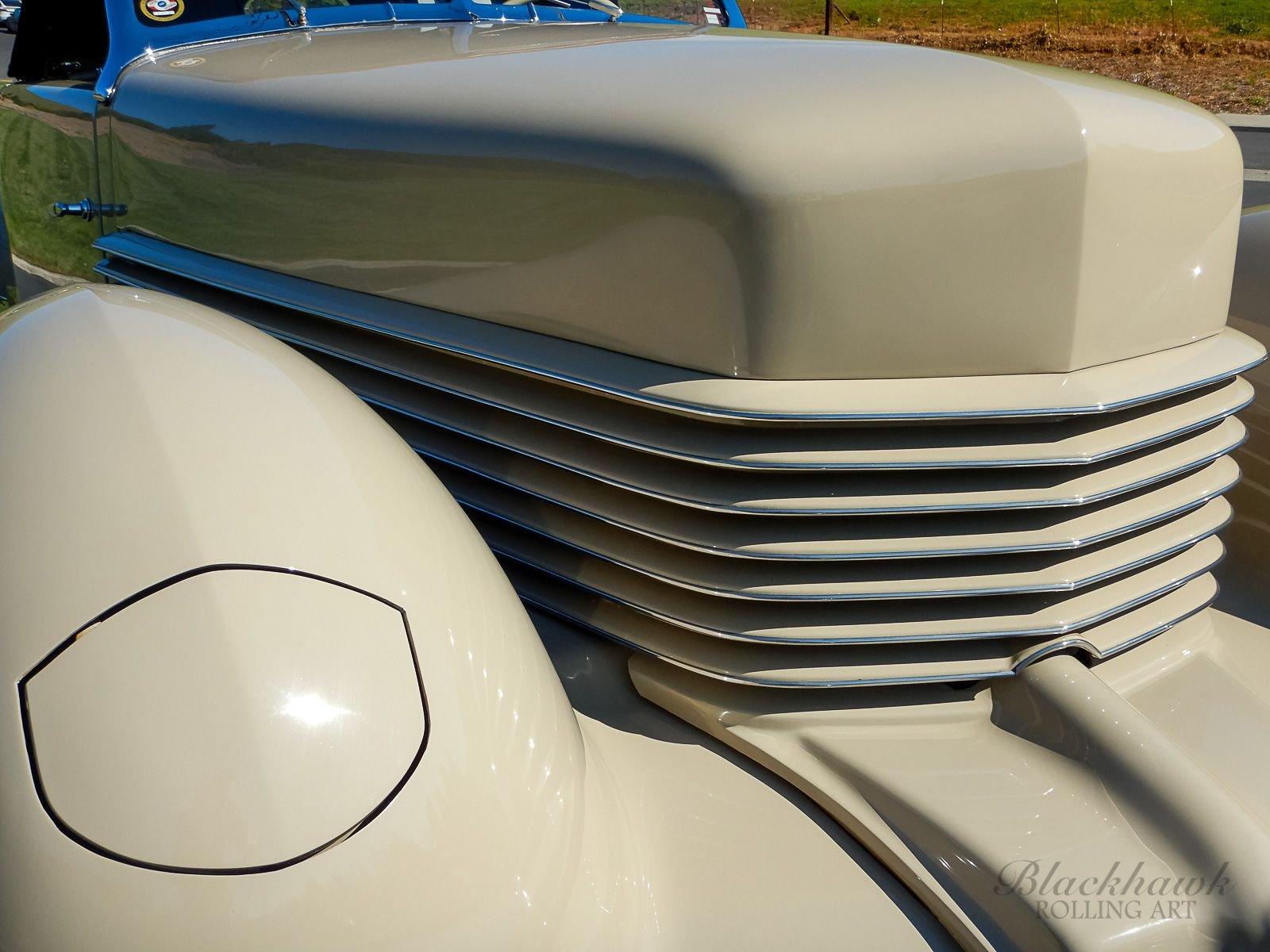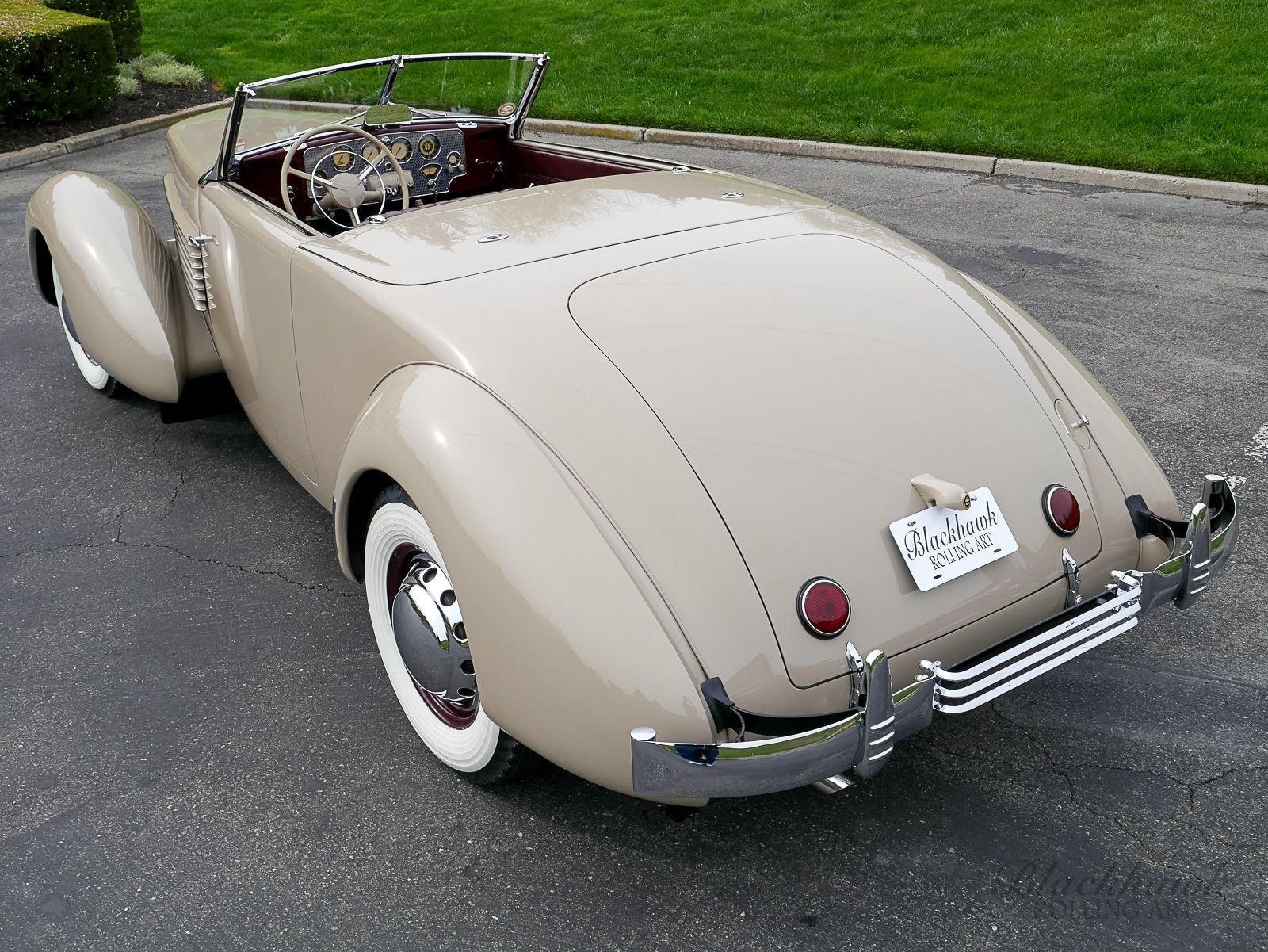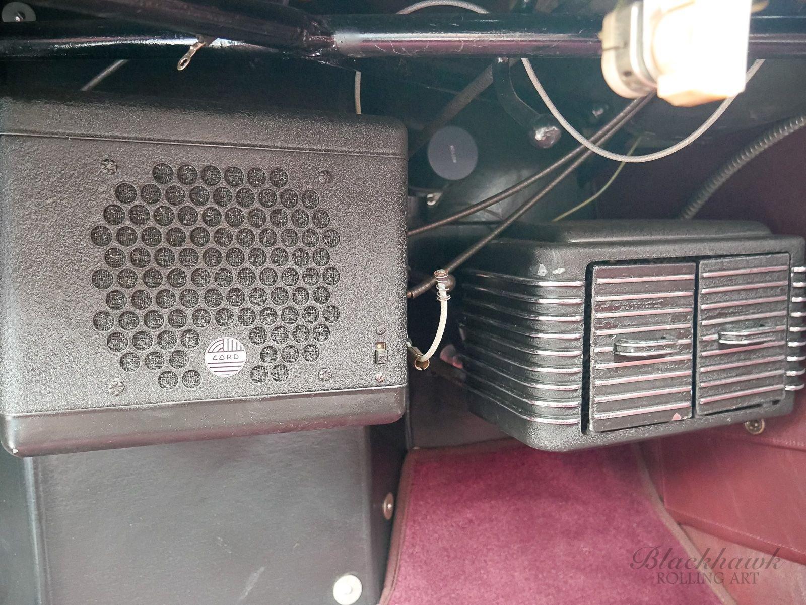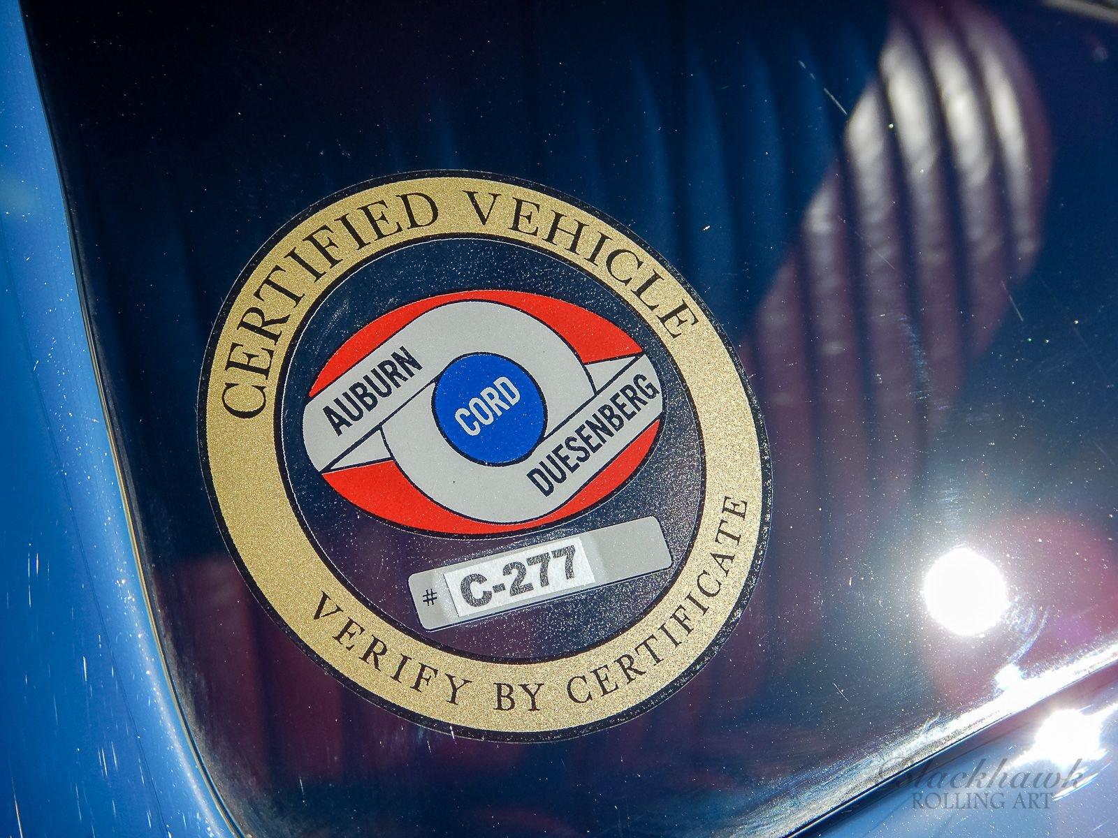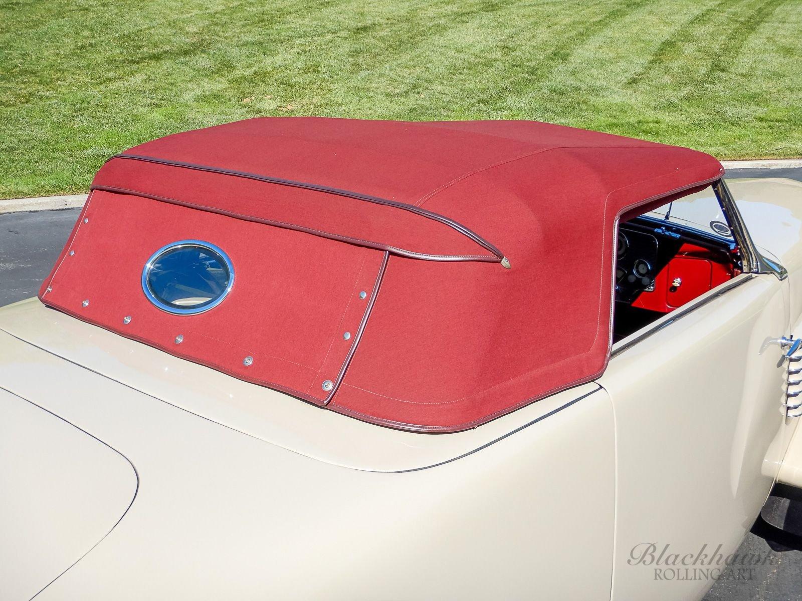 This is a 1937 Model 812 Cord Cabriolet “Sportsman”. A beautifully restored example by noted Auburn Cord Duesenberg marque expert and restorer Harry Van Iderstine (a highly respected authority in the Auburn-Cord-Duesenberg community). This Immaculate, rust-free, damage-free, laser straight Cord Cabriolet would be one of the pinnacles of any credible classic automobile collection. This Cabriolet is distinguished within the Cord line as one of only 200 two-seater convertibles, the rarest of the variants offered by the Cord Automobile Company of Auburn, Indiana in 1936 and 1937. Restoration included a complete bare metal paint and chrome to factory specs, but also the stunning full leather upholstery by Auburn Cord Duesenberg expert Rick Huelett. A complete driveline refurbishment was performed as well as the numerous details of steering and suspension were diligently attended to. Finished in factory Palm Beach Tan over factory Rich Maroon hides, the complete restoration was done in keeping with the restoration guidelines of the Auburn Cord Duesenberg Club and shows incredibly well today after temperature-controlled storage since completion. This two-seater classic has been meticulously maintained and includes the coveted upgrade of the front wheel drive to include Richardson joints. A part of a prestigious Northern California collection since Mr. Van Iderstine’s passing, this fully sorted Cord is ready to show at the concours level or drive simply for your enjoyment.