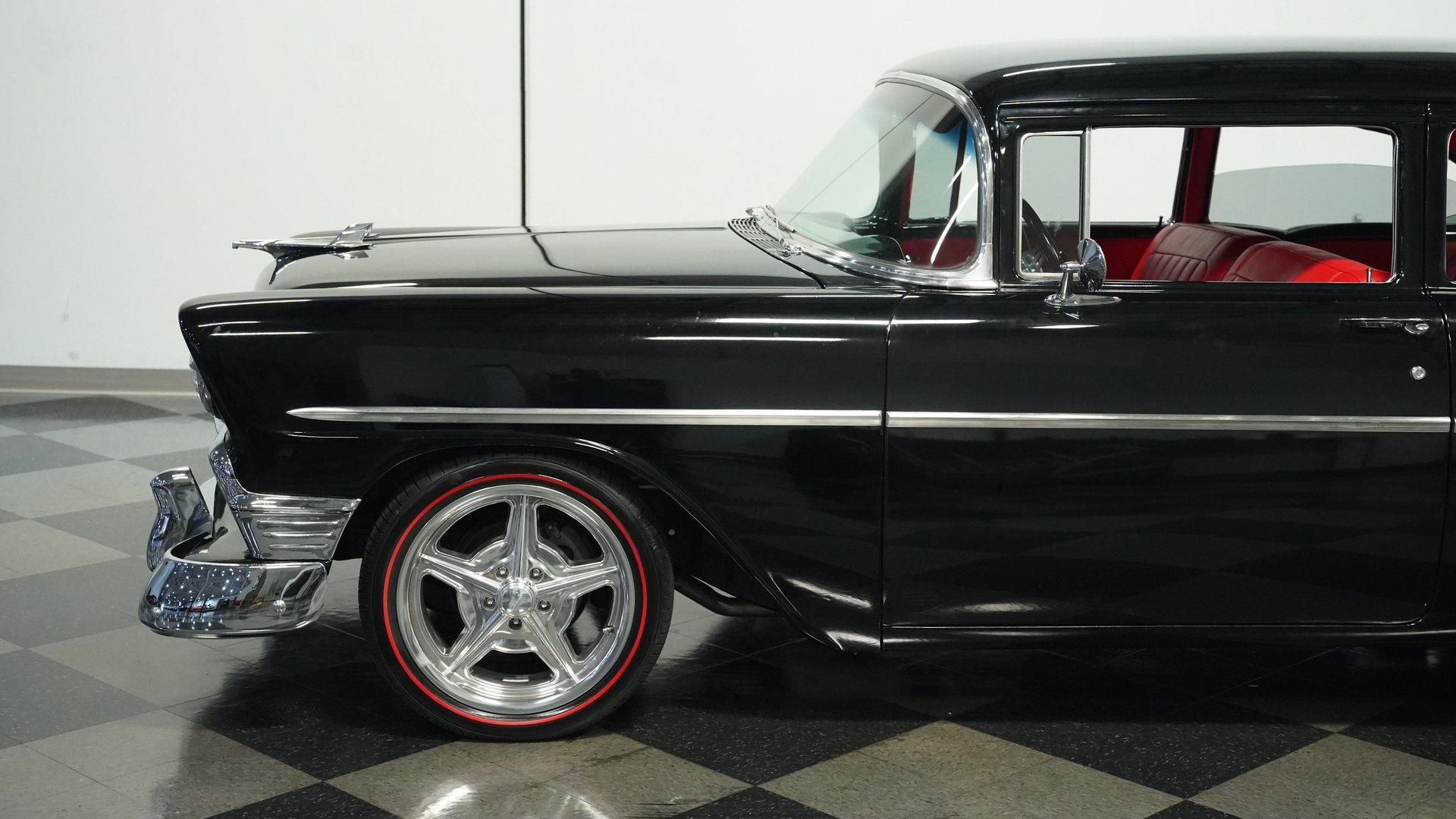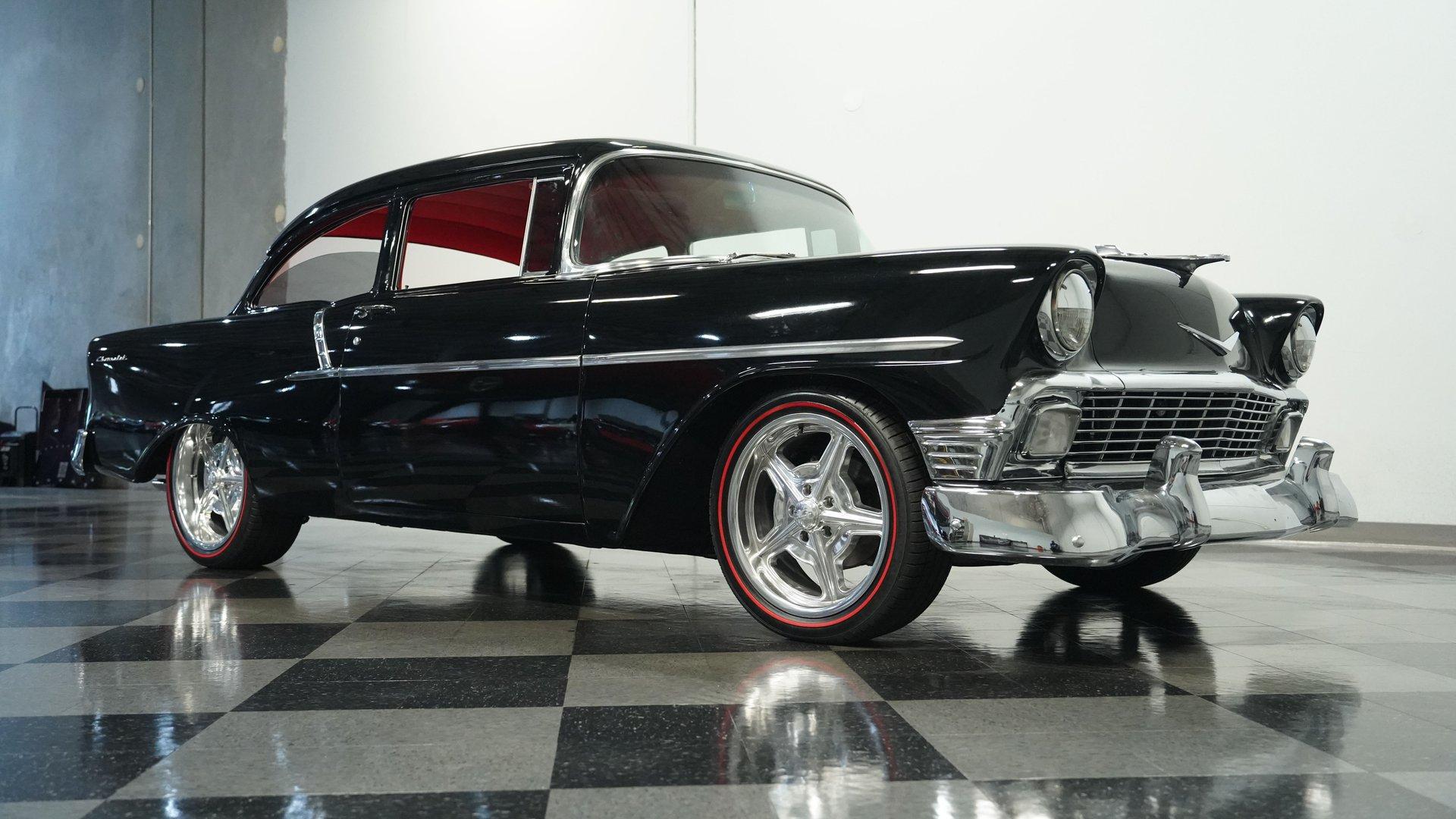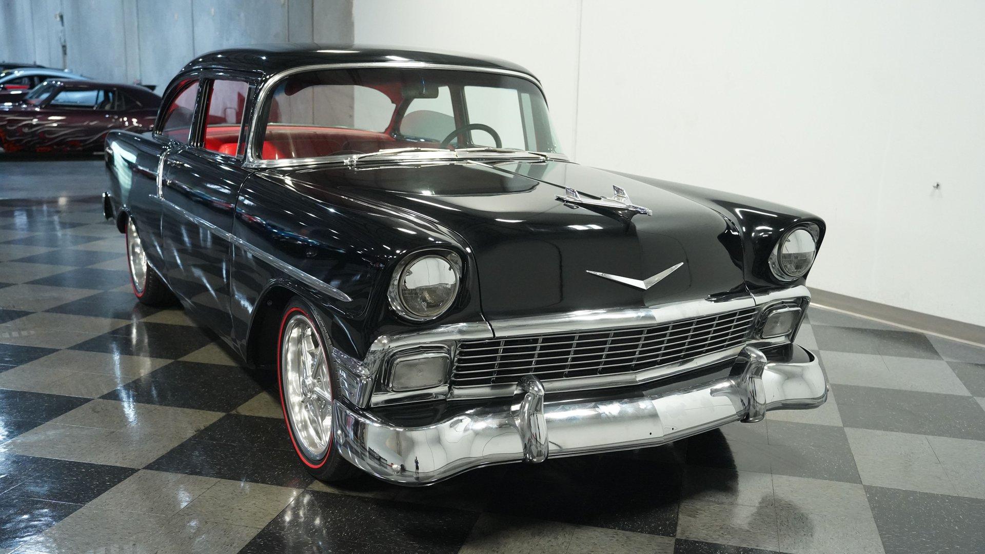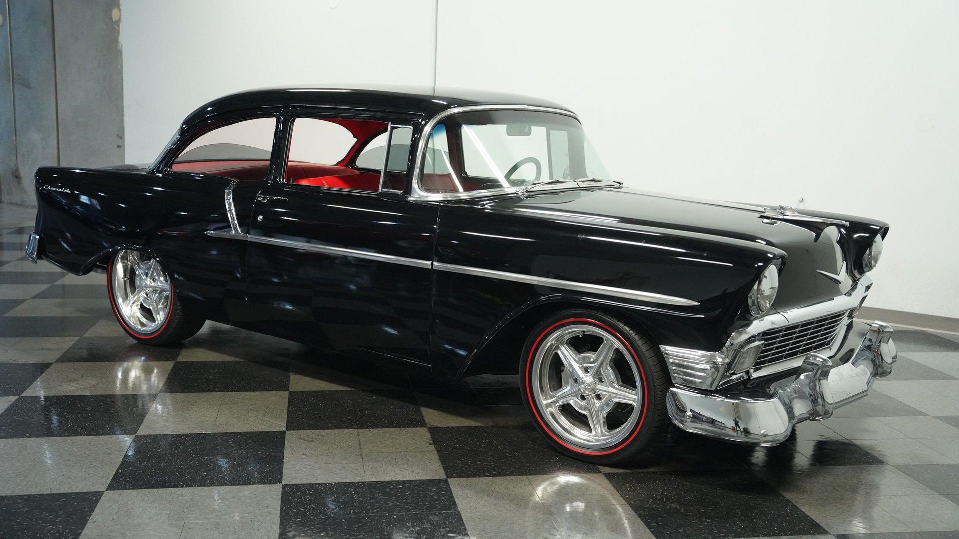 The Tri-Five Chevy is one of the most popular collector cars of all time. One look at this exceptional 1956 Chevrolet 150 Two-Door Sedan and it is easy to understand the attraction. The base model 150 is the cleanest design of all the 1956 Chevrolets, devoid of any excess (and heavy) exterior trim. Its beauty is in its simplicity, especially when finished in a mirror-gloss Black like this beauty. The chrome bumpers and polished brightwork are in excellent condition and really pop against the deep Black paint. A light tint has been added to the side glass as well. Its clean look is enhanced with a set of polished Billet Specialties wheels wrapped with low-profile red stripe tires staggered 18-inches front and 20-inches rear to create just the right stance. Inside, the red interior contrasts nicely with the Black paint and ties in with the red stripe tires. The interior features front seat belts, a custom four-spoke steering wheel, Vintage Air conditioning, under-dash Bosch temperature, volt and oil pressure gauges and a floor shifter. 350 V8 engine 700R4 4-speed automatic transmission Power steering Power front disc brakes Edelbrock intake and carburetor Vintage Air conditioning Billet Specialties wheels Red stripe tires Under the hood is a fresh, smooth-running small-block 350 matched with a 700R4 4-speed automatic transmission. The detailed engine compartment features an Edelbrock aluminum intake and Edelbrock carburetor, chrome alternator, black matte finish Chevrolet logo open element air cleaner and valve covers, power steering, aluminum radiator and power front disc brakes. The dual exhaust system with twin Xlerator Turbo mufflers allow the engine to breathe and sound great. This handsome 1956 Chevrolet 150 does everything well. Perfect for car events, joy rides on Sundays or comfortable long-distance touring in style. Call today!