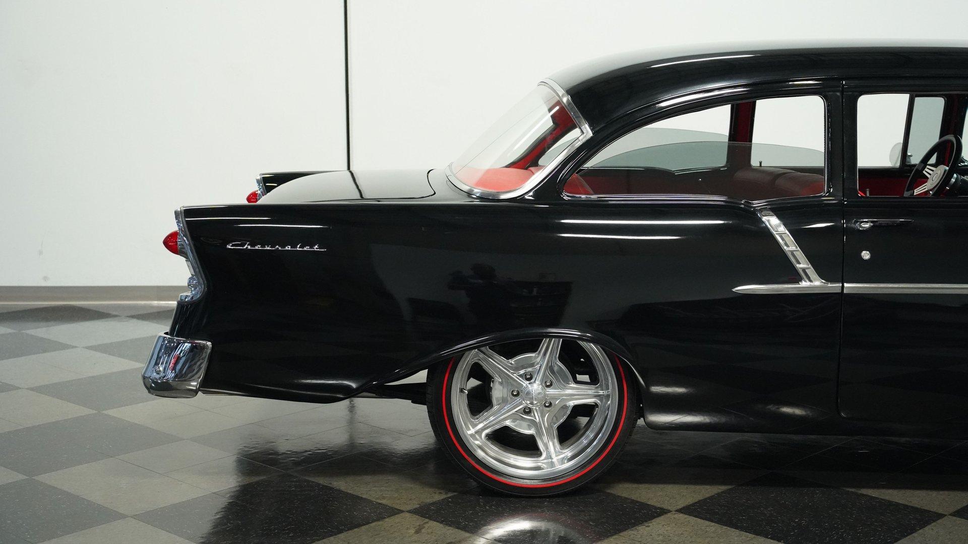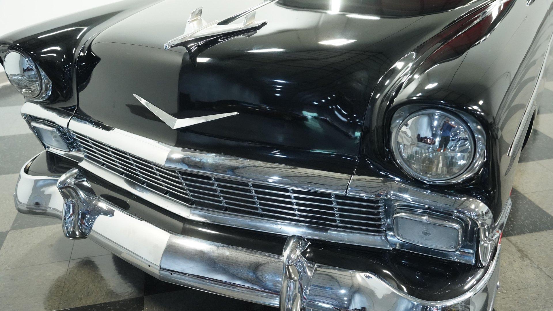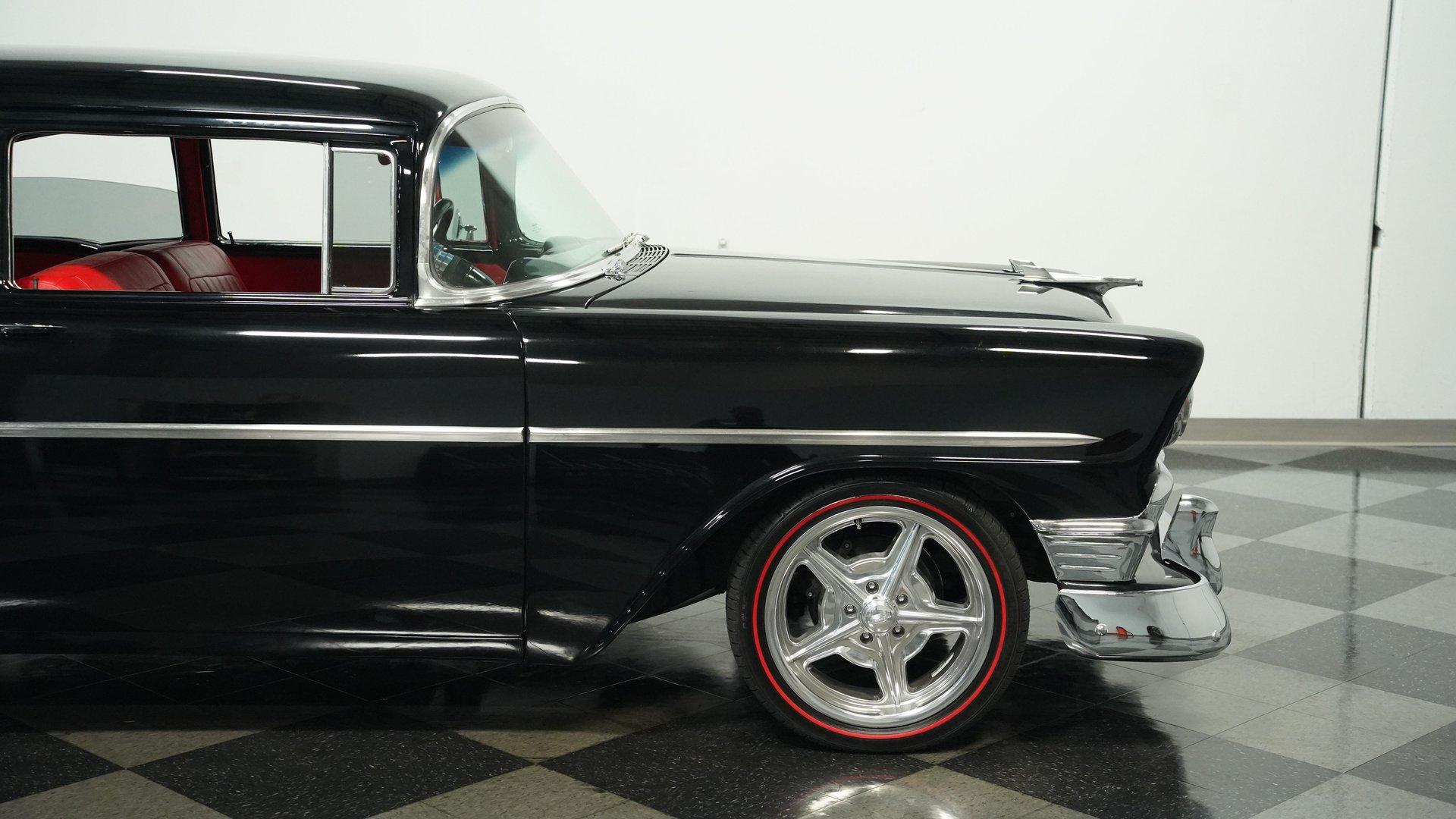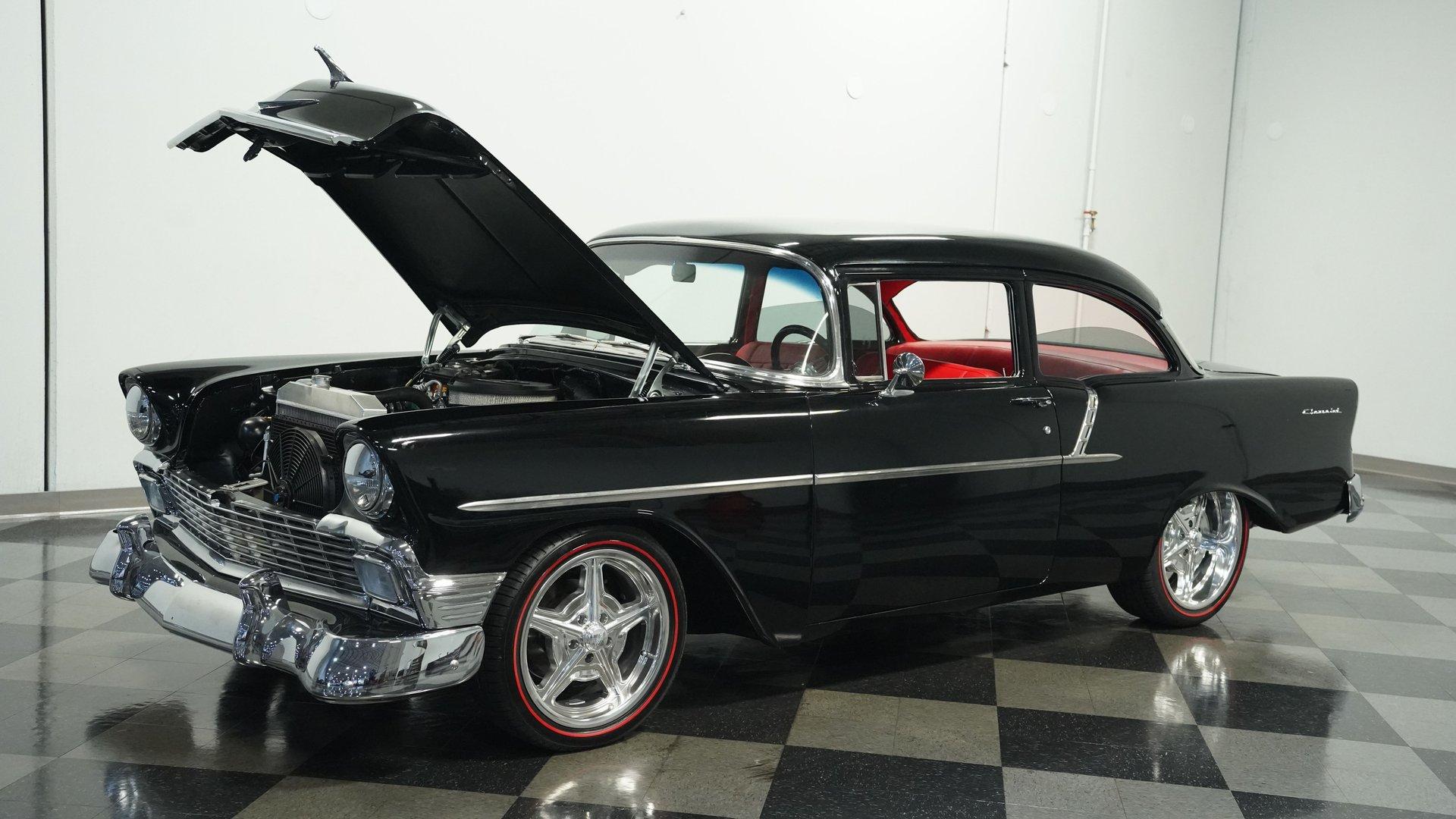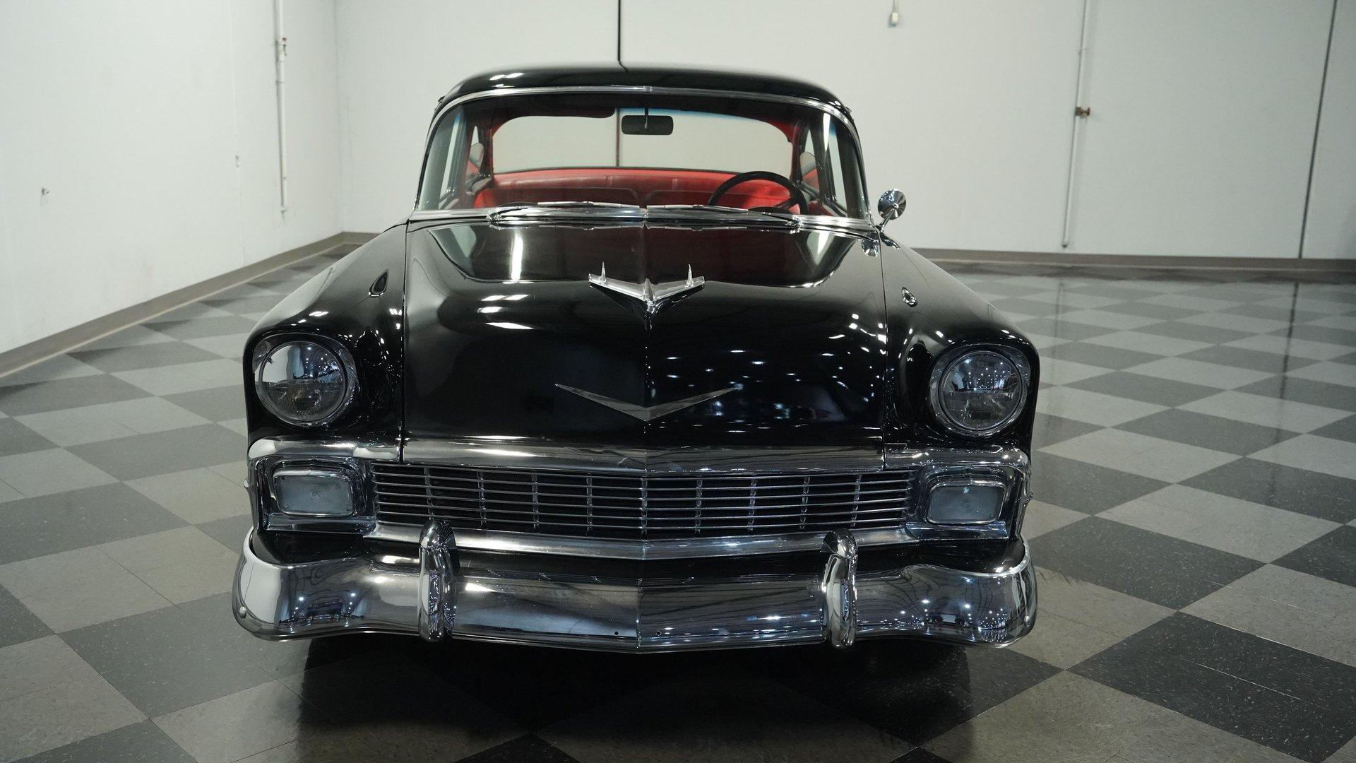The Tri-Five Chevy is one of the most popular collector cars of all time. One look at this exceptional 1956 Chevrolet 150 Two-Door Sedan and it is easy to understand the attraction. The base model 150 is the cleanest design of all the 1956 Chevrolets, devoid of any excess (and heavy) exterior trim. Its beauty is in its simplicity, especially when finished in a mirror-gloss Black like this beauty. The chrome bumpers and polished brightwork are in excellent condition and really pop against the deep Black paint. A light tint has been added to the side glass as well. Its clean look is enhanced with a set of polished Billet Specialties wheels wrapped with low-profile red stripe tires staggered 18-inches front and 20-inches rear to create just the right stance. Inside, the red interior contrasts nicely with the Black paint and ties in with the red stripe tires. The interior features front seat belts, a custom four-spoke steering wheel, Vintage Air conditioning, under-dash Bosch temperature, volt and oil pressure gauges and a floor shifter. 350 V8 engine 700R4 4-speed automatic transmission Power steering Power front disc brakes Edelbrock intake and carburetor Vintage Air conditioning Billet Specialties wheels Red stripe tires Under the hood is a fresh, smooth-running small-block 350 matched with a 700R4 4-speed automatic transmission. The detailed engine compartment features an Edelbrock aluminum intake and Edelbrock carburetor, chrome alternator, black matte finish Chevrolet logo open element air cleaner and valve covers, power steering, aluminum radiator and power front disc brakes. The dual exhaust system with twin Xlerator Turbo mufflers allow the engine to breathe and sound great. This handsome 1956 Chevrolet 150 does everything well. Perfect for car events, joy rides on Sundays or comfortable long-distance touring in style. Call today!