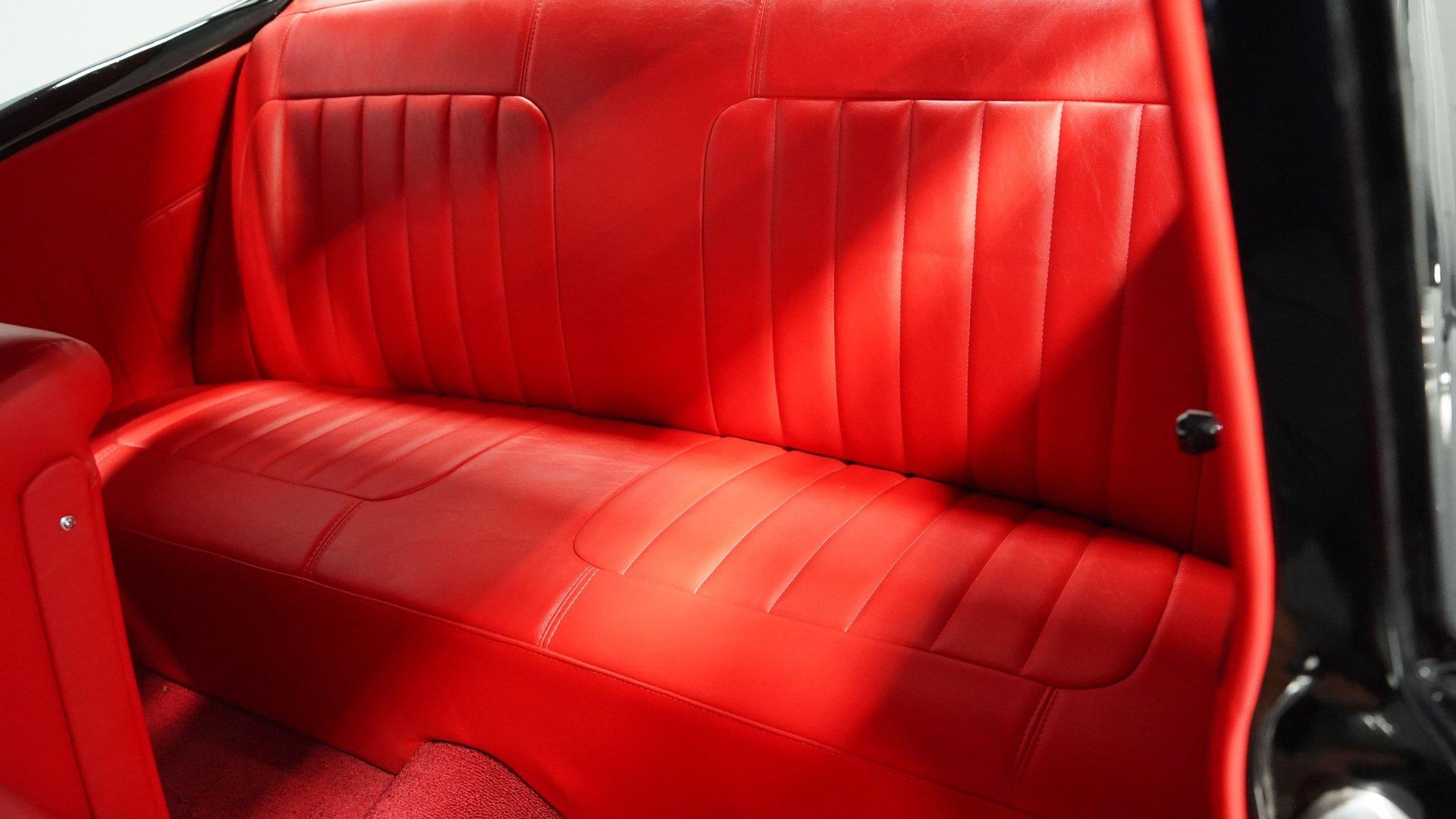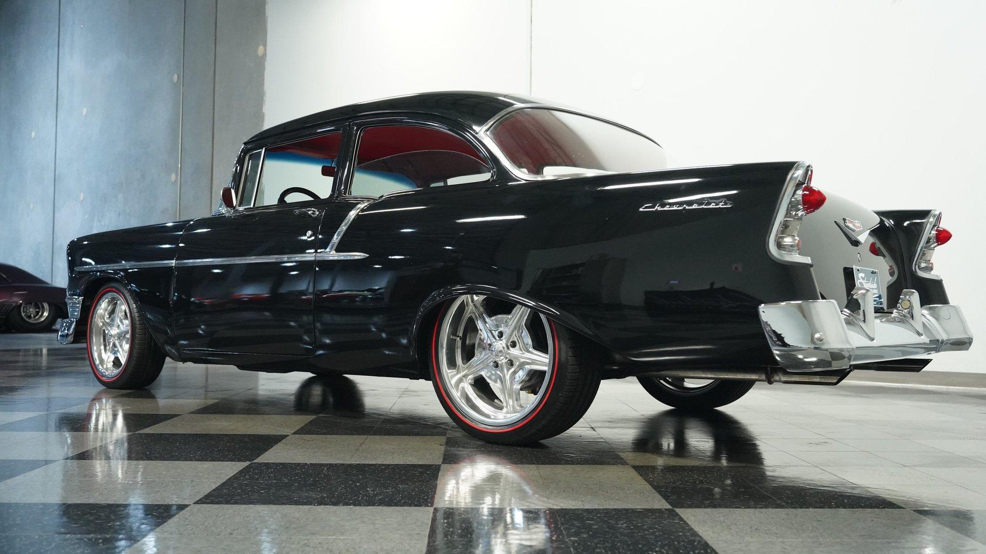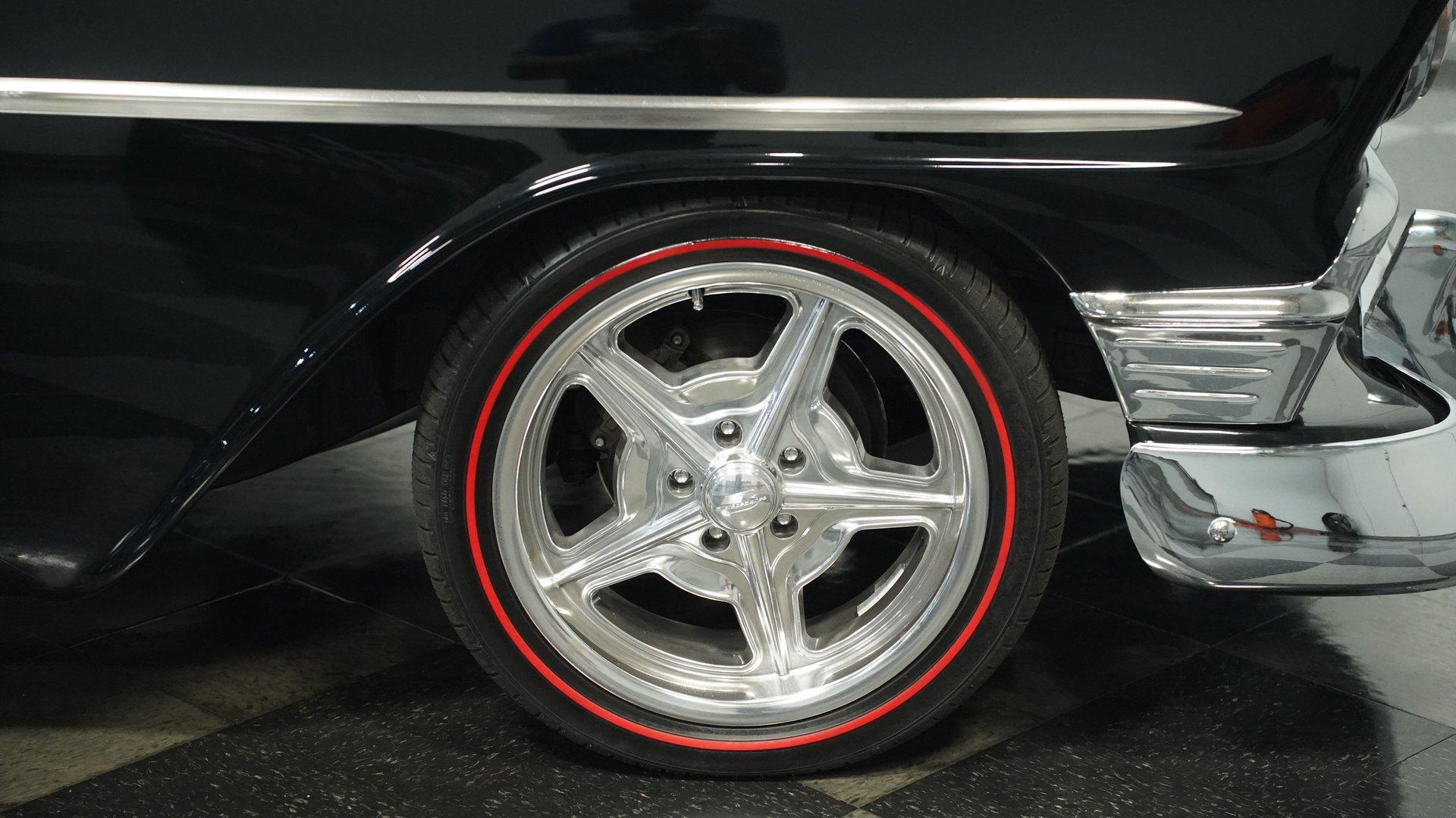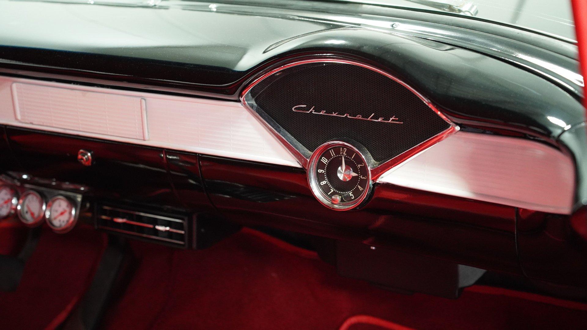 The Tri-Five Chevy is one of the most popular collector cars of all time. One look at this exceptional 1956 Chevrolet 150 Two-Door Sedan and it is easy to understand the attraction. The base model 150 is the cleanest design of all the 1956 Chevrolets, devoid of any excess (and heavy) exterior trim. Its beauty is in its simplicity, especially when finished in a mirror-gloss Black like this beauty. The chrome bumpers and polished brightwork are in excellent condition and really pop against the deep Black paint. A light tint has been added to the side glass as well. Its clean look is enhanced with a set of polished Billet Specialties wheels wrapped with low-profile red stripe tires staggered 18-inches front and 20-inches rear to create just the right stance. Inside, the red interior contrasts nicely with the Black paint and ties in with the red stripe tires. The interior features front seat belts, a custom four-spoke steering wheel, Vintage Air conditioning, under-dash Bosch temperature, volt and oil pressure gauges and a floor shifter. 350 V8 engine 700R4 4-speed automatic transmission Power steering Power front disc brakes Edelbrock intake and carburetor Vintage Air conditioning Billet Specialties wheels Red stripe tires Under the hood is a fresh, smooth-running small-block 350 matched with a 700R4 4-speed automatic transmission. The detailed engine compartment features an Edelbrock aluminum intake and Edelbrock carburetor, chrome alternator, black matte finish Chevrolet logo open element air cleaner and valve covers, power steering, aluminum radiator and power front disc brakes. The dual exhaust system with twin Xlerator Turbo mufflers allow the engine to breathe and sound great. This handsome 1956 Chevrolet 150 does everything well. Perfect for car events, joy rides on Sundays or comfortable long-distance touring in style. Call today!