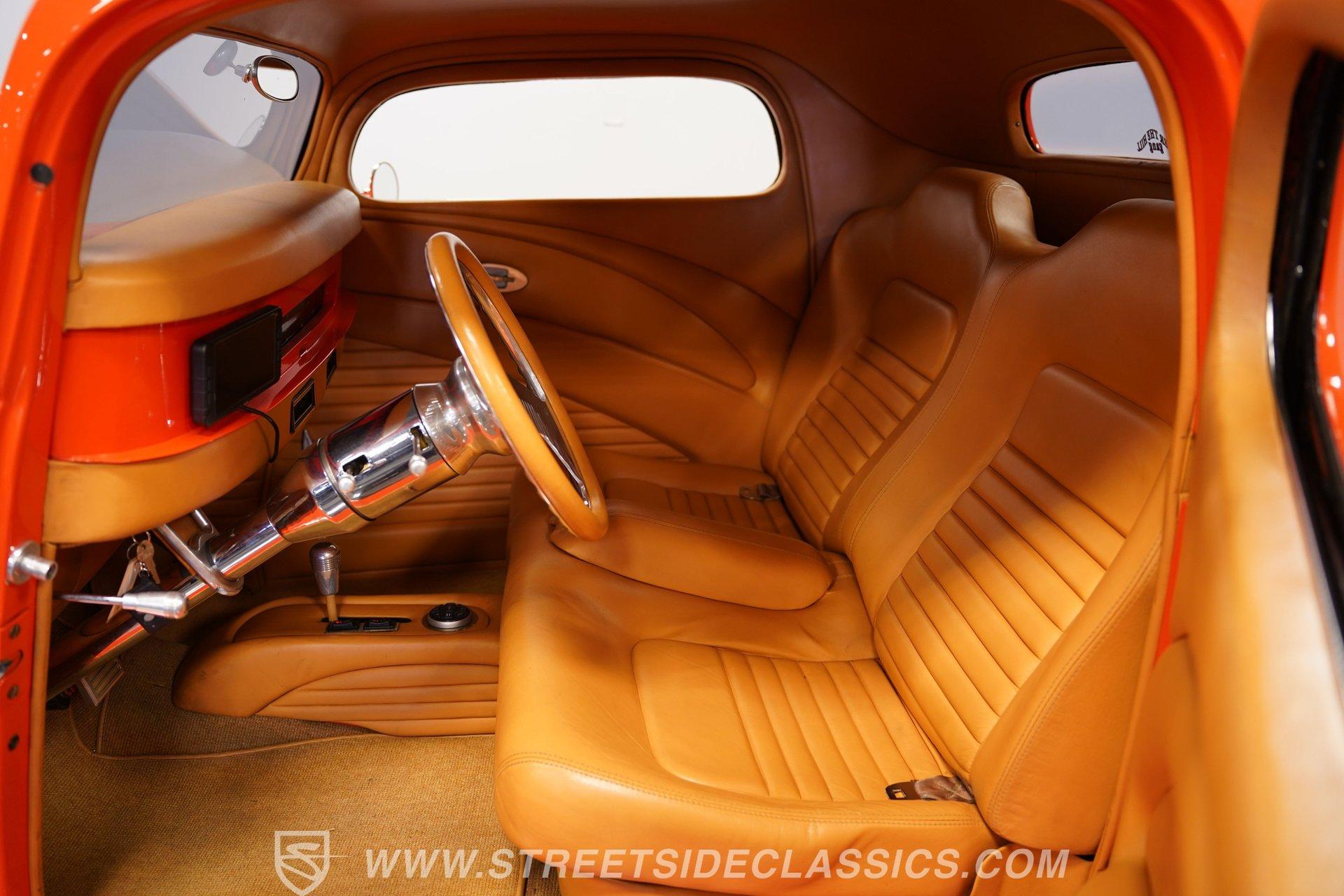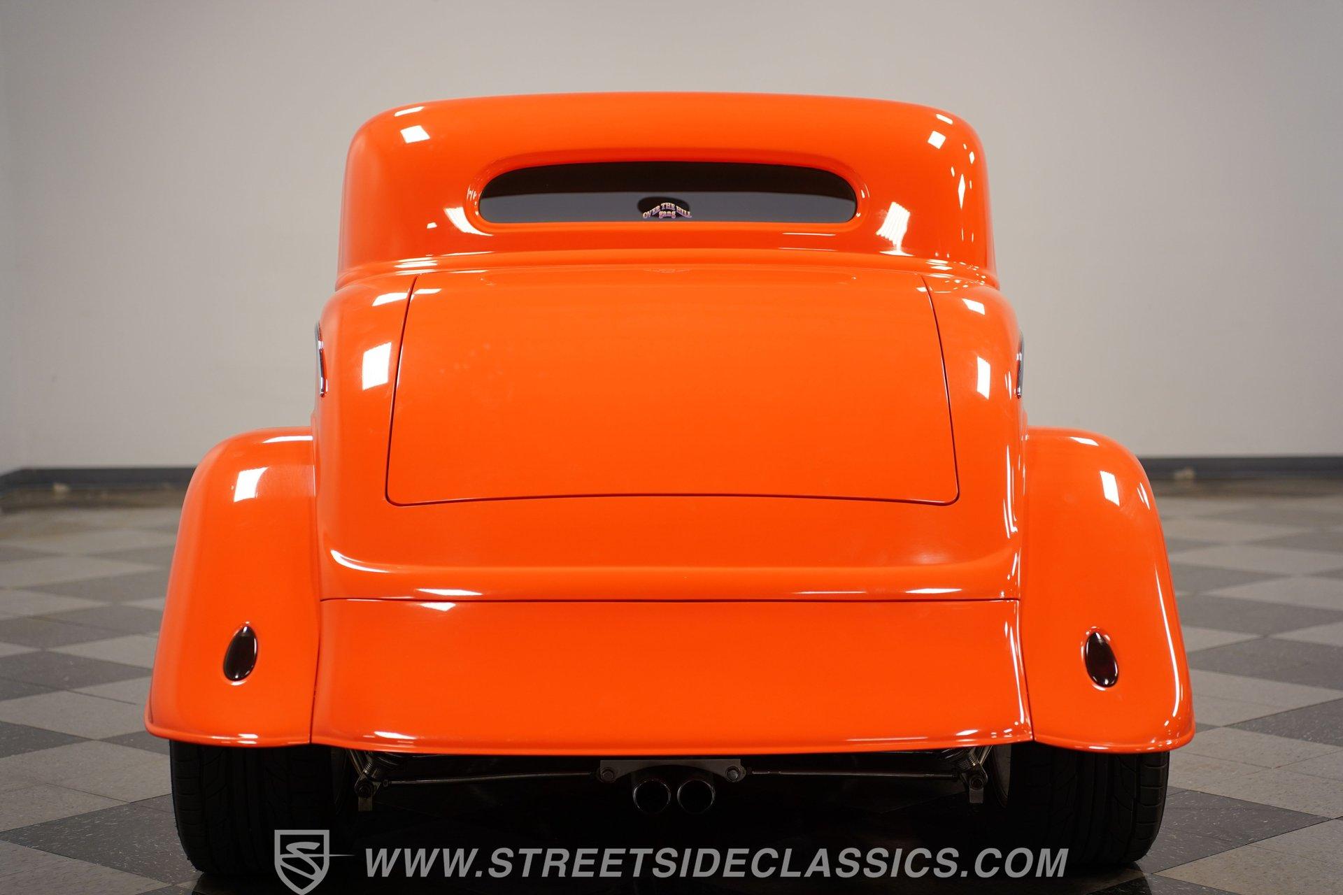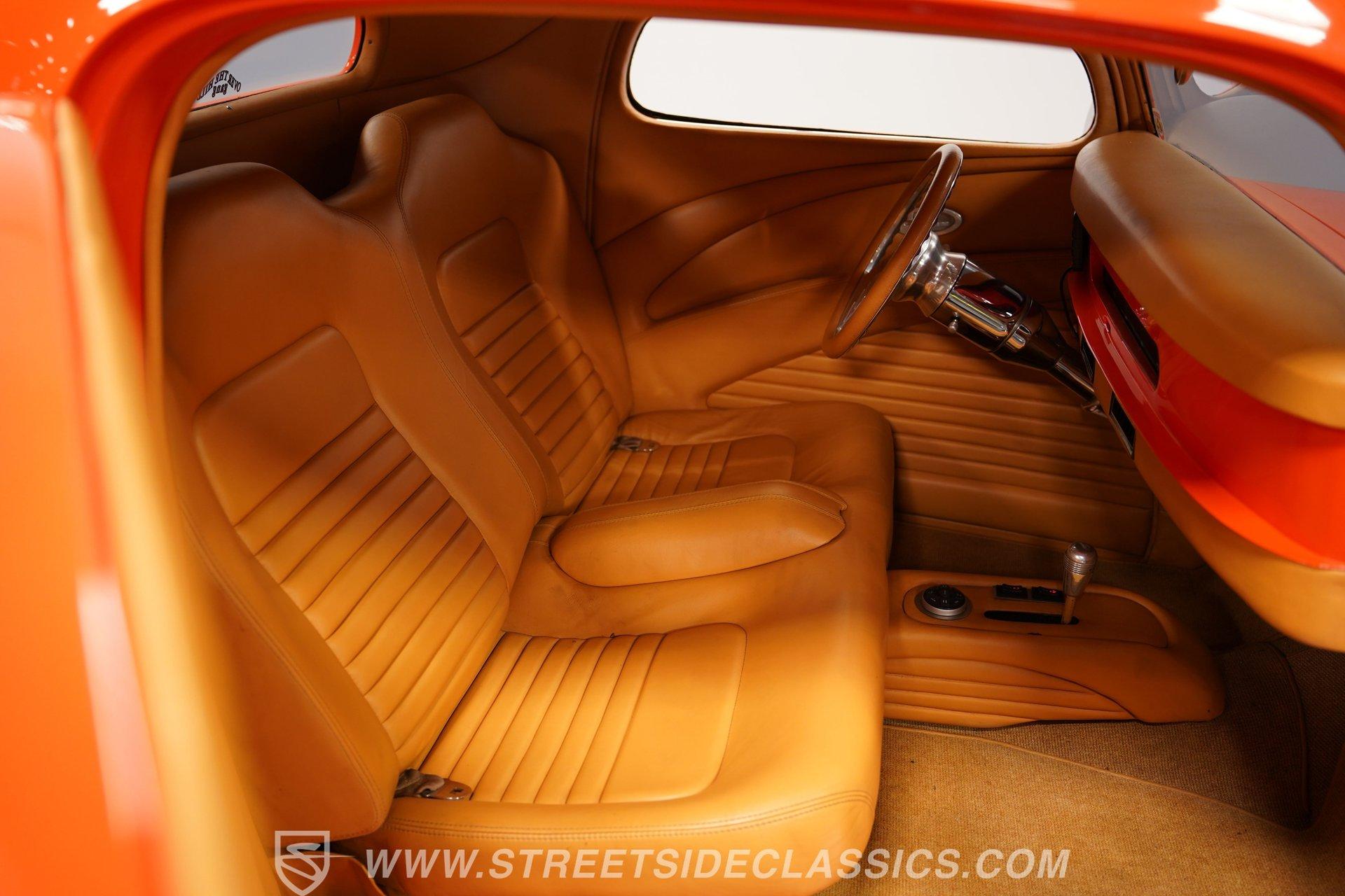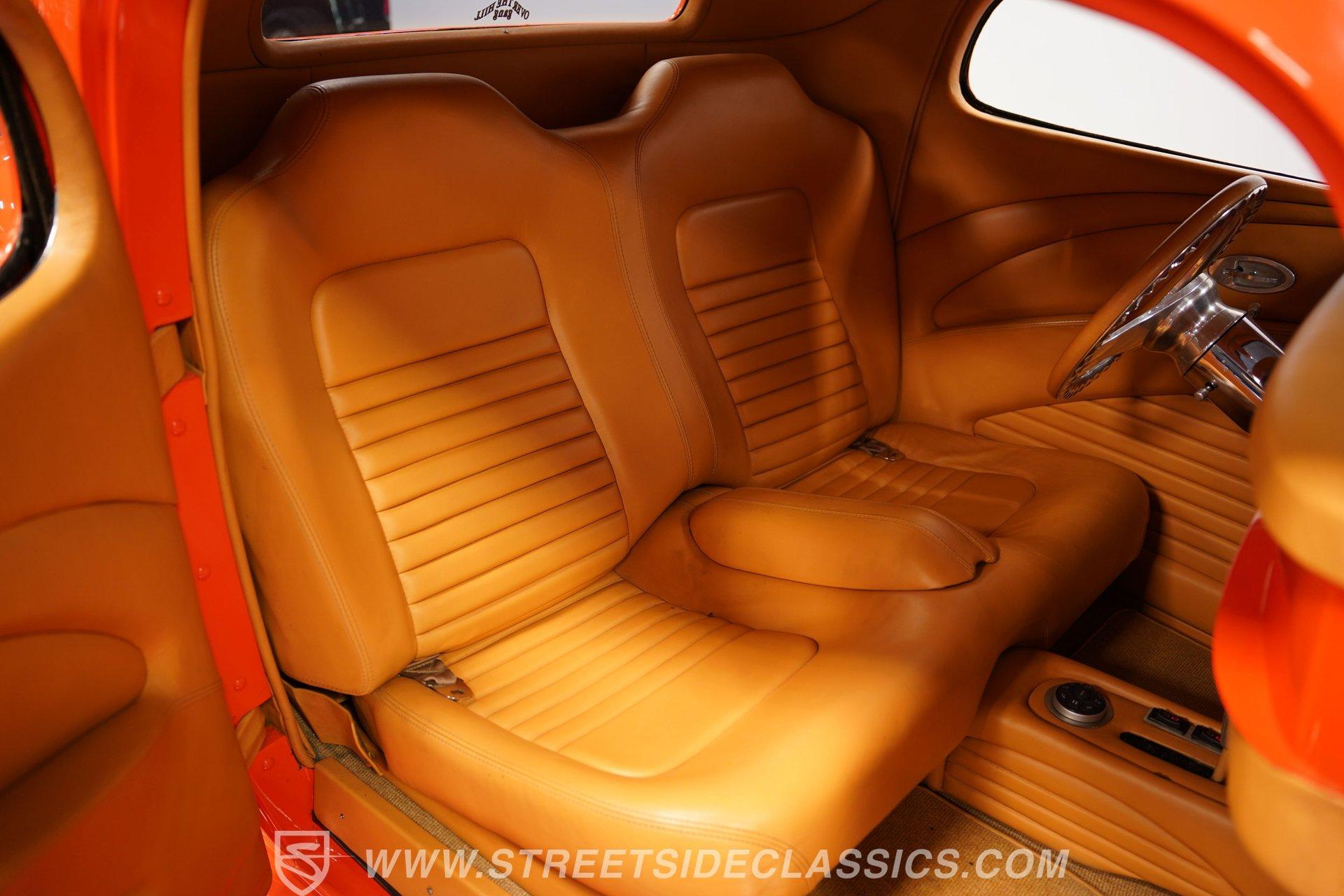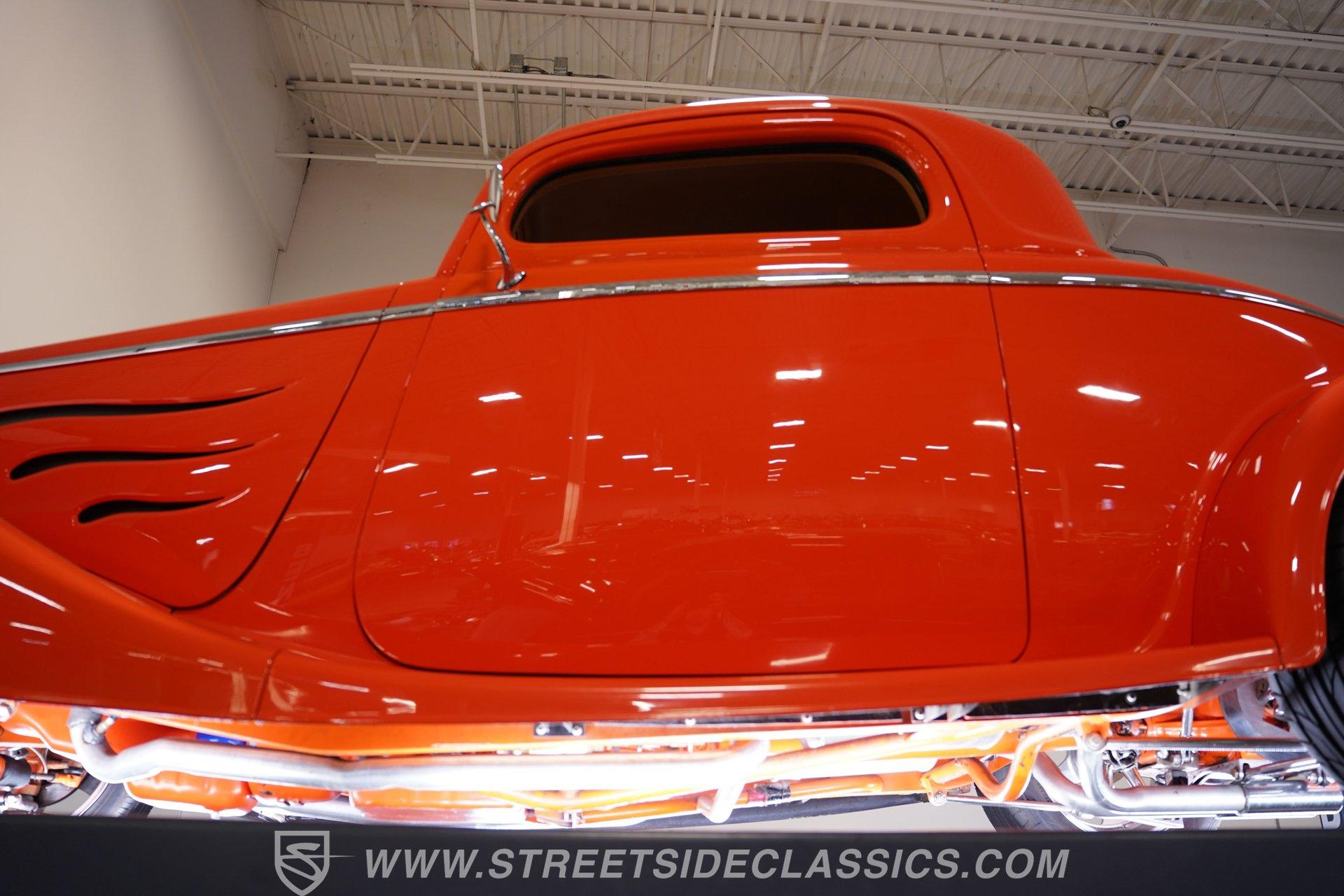 Almost all car enthusiasts have fantasized about owning a beautiful old-school hot rod at some point in their lives. The reason most don't follow through is that the time commitment and the constant trial-and-error are often far too daunting. That's why when a car like this 1933 Ford 3-Window Coupe Street Rod comes along, it's worth taking some time to see how much effort and time have been invested in it for you, no work required. With its full Orange Flame repaint, upgraded tri-bar headlights, unique side flame waves, and classic suicide doors, this vibrant coupe is sure to turn heads wherever it goes. Inside, we find a beautifully appointed and fully custom tan leather interior. A Budnik custom billet steering wheel sits atop a matching tilt column. Just beyond that wheel sits a digital readout for the Wild Card electronic fuel injection system, while in the center-dash, we find a trick Dakota Digital gauge cluster. A custom center console, home to the floor-mounted Lokar shifter, completes the look. What you don't see right away are the window buttons, nor the hidden AM/FM/CD sound system, nor the fully finished trunk and included briefcase. Finally, the addition of air conditioning puts a bow on this custom cozy cabin, making it a dream to drive near or far. Prop open that steel hood, and you're treated to a clean and full engine bay featuring a 350 cubic-inch Ram Jet V-8 engine that utilizes the aforementioned EFI on the intake side, while a set of shorty headers eliminates spent gases via a dual exhaust capped off with Xcelerator mufflers. That power is routed through a 700R4 three-speed automatic transmission before being sent out to the nine-inch rear end which transfers those ponies to the pavement via a set of staggered chrome five-spoke rims measuring 16 inches up front and 17 inches in the rear. HIGHLIGHTS: Full Orange Repaint Custom Side Flame Waves Upgraded Tri-Bar Headlights Ram Jet 350 CID V8 Wild Card EFI Shorty Headers Dual Exhaust Xcelerator Mufflers 700R4 Three Speed Auto Lowered suspension Tubular Front A-Arms Multi-Link Jaguar Style IRS Coilovers Four Wheel Power Discs Inboard Rear Brakes Four Piston Calipers Custom Leather Interior Bucket Seats Power Windows Custom Wheel Tilt Column AC AM/FM/CD This 1933 Ford 3-Window Coupe Street Rod rides on a custom lowered suspension consisting of a tubular A-arm front, Jaguar-style multi-link independent rear, and coilovers all around. Four-piston power disc brakes at both the front and inboard rear units make it easy to rein in speed whenever necessary, and instill a sense of confidence that this car is ready to go, no matter what the road ahead looks like. So, if you've always wanted a true old-school hot rod, but don't have the time or patience to put one together piece by piece, then this beautifully put-together street rod is exactly what you've been waiting for. Don't wait, call today!